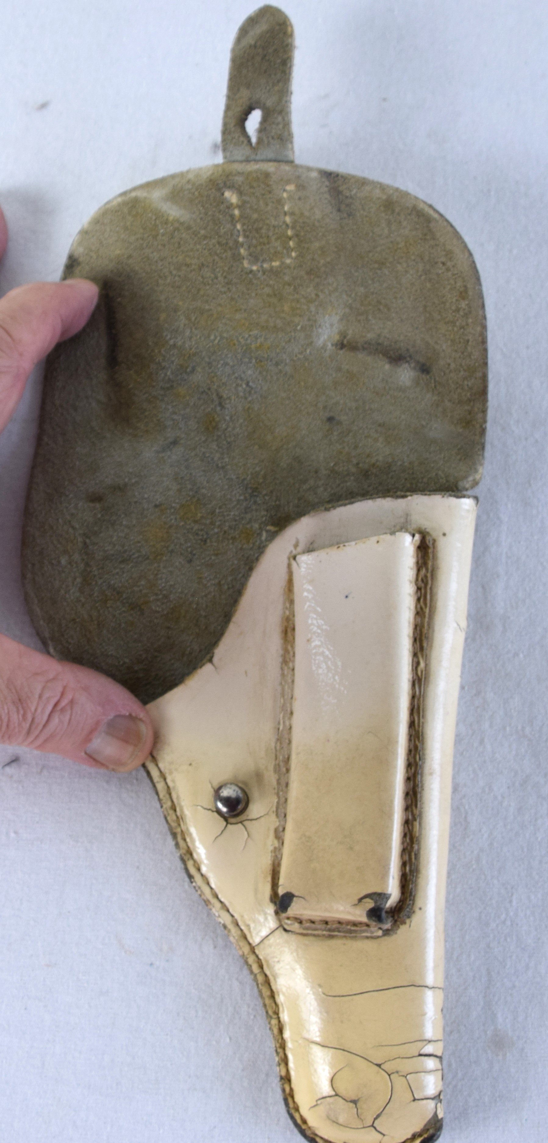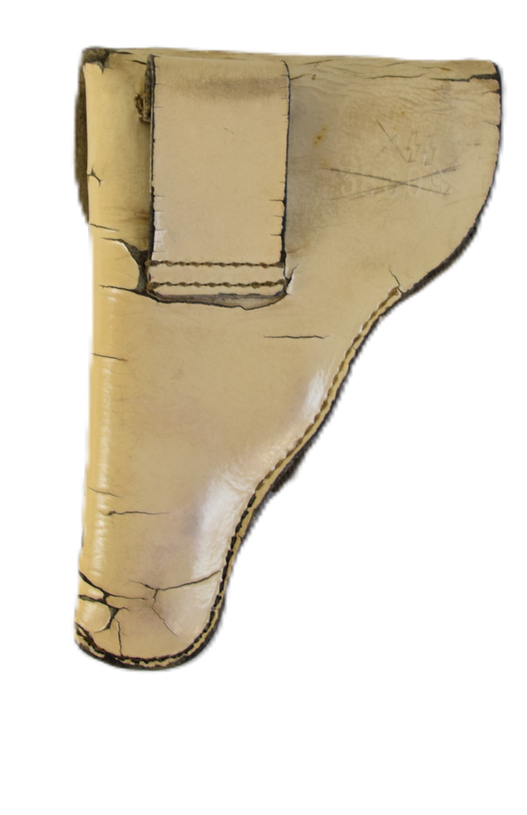Rare dress white holster for the Walther PPK with the 9th Division marks on back with SS and serial number 38609. TheĀ 9th SS Panzer Division “Hohenstaufen”Ā was aĀ Waffen-SSĀ armored division ofĀ Nazi GermanyĀ duringĀ World War II. It participated in battles on both theĀ EasternĀ andĀ Western Fronts. Many of the men of the division were young German conscripts, with a cadre of NCOs and staff from theĀ SS Division Leibstandarte.Ā Dimensions: 7.5″ L