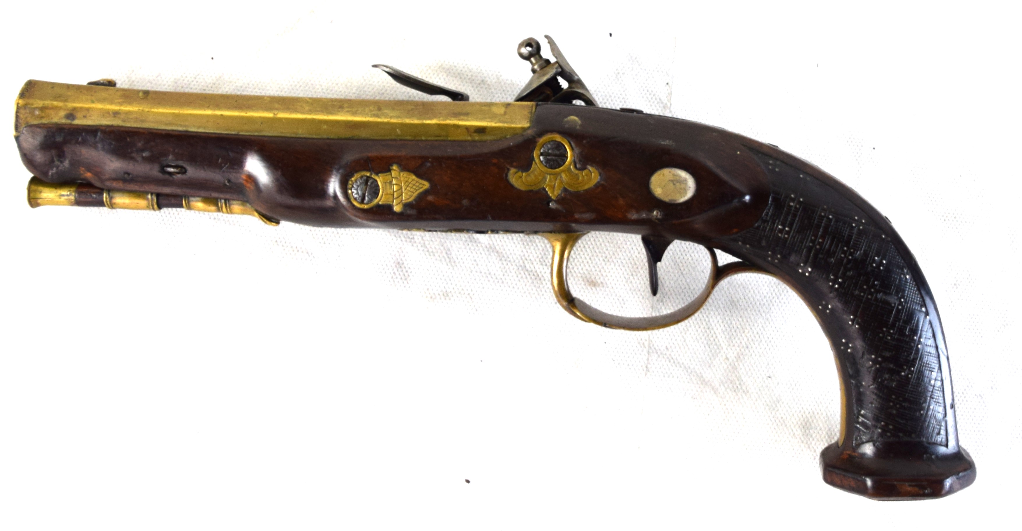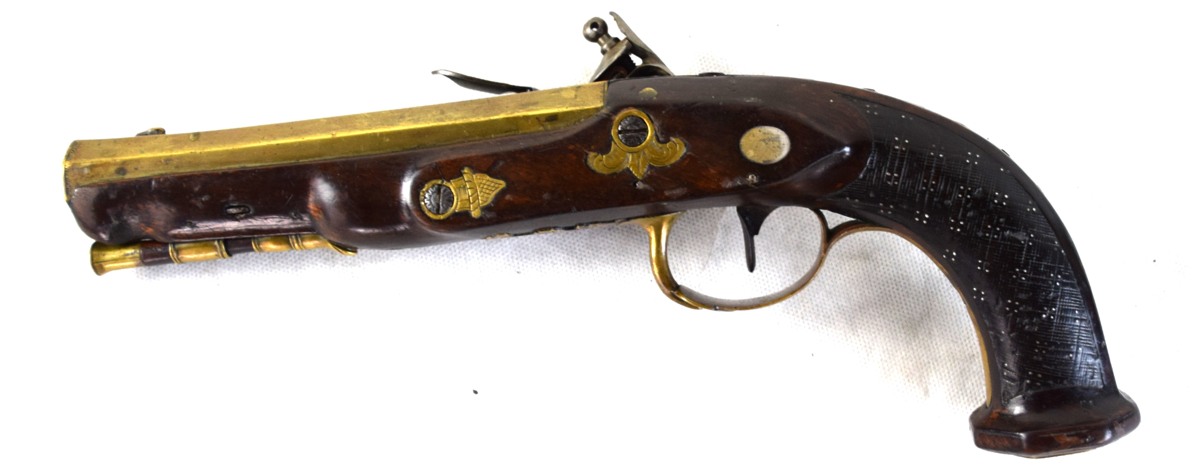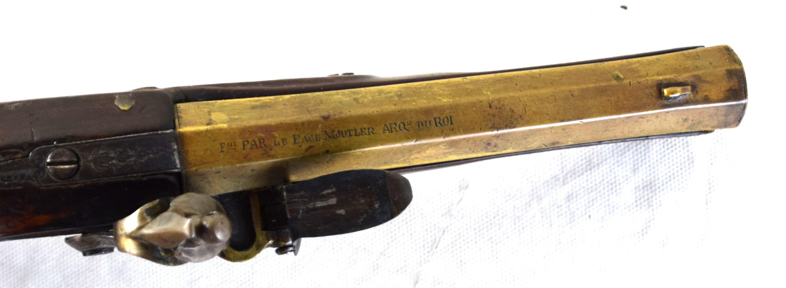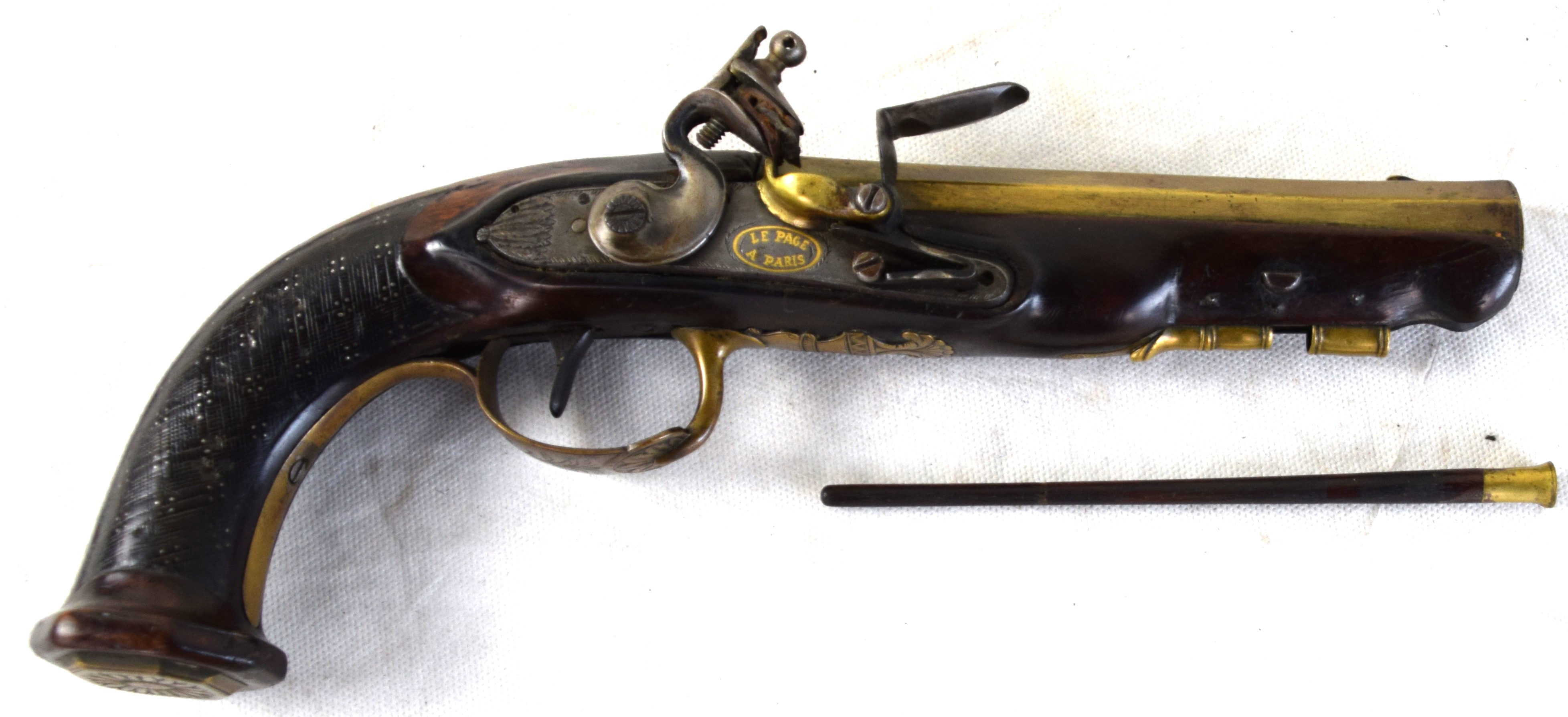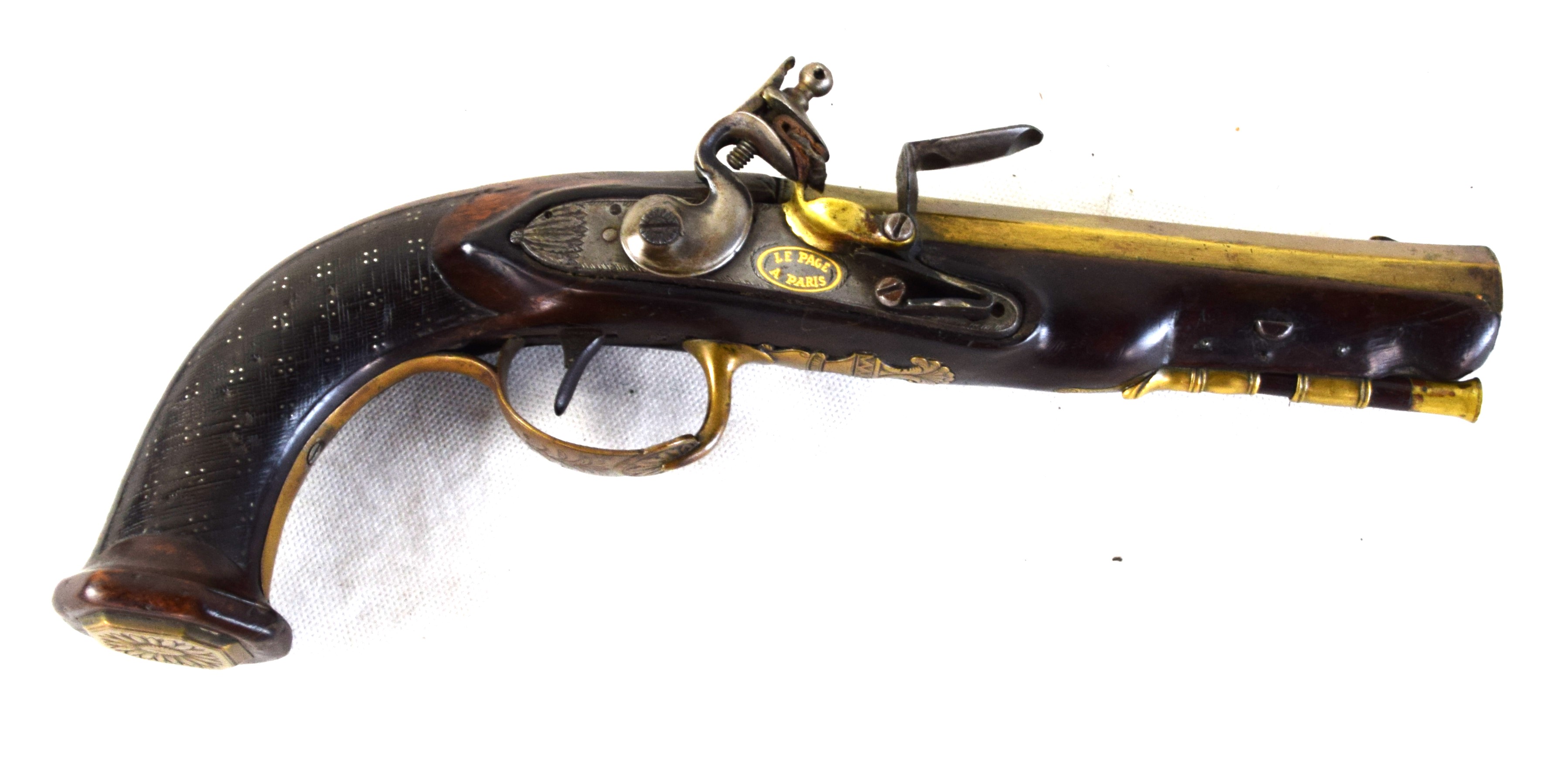 French flintlock brass barrel pistol made by Le Page, Paris and marked on brass barrel “PAR LEPAGE MOUTLER ARQr DU ROI” (Maker for the King). Several brass designs, decorated grip, original ramrod, 6.25″ barrel.