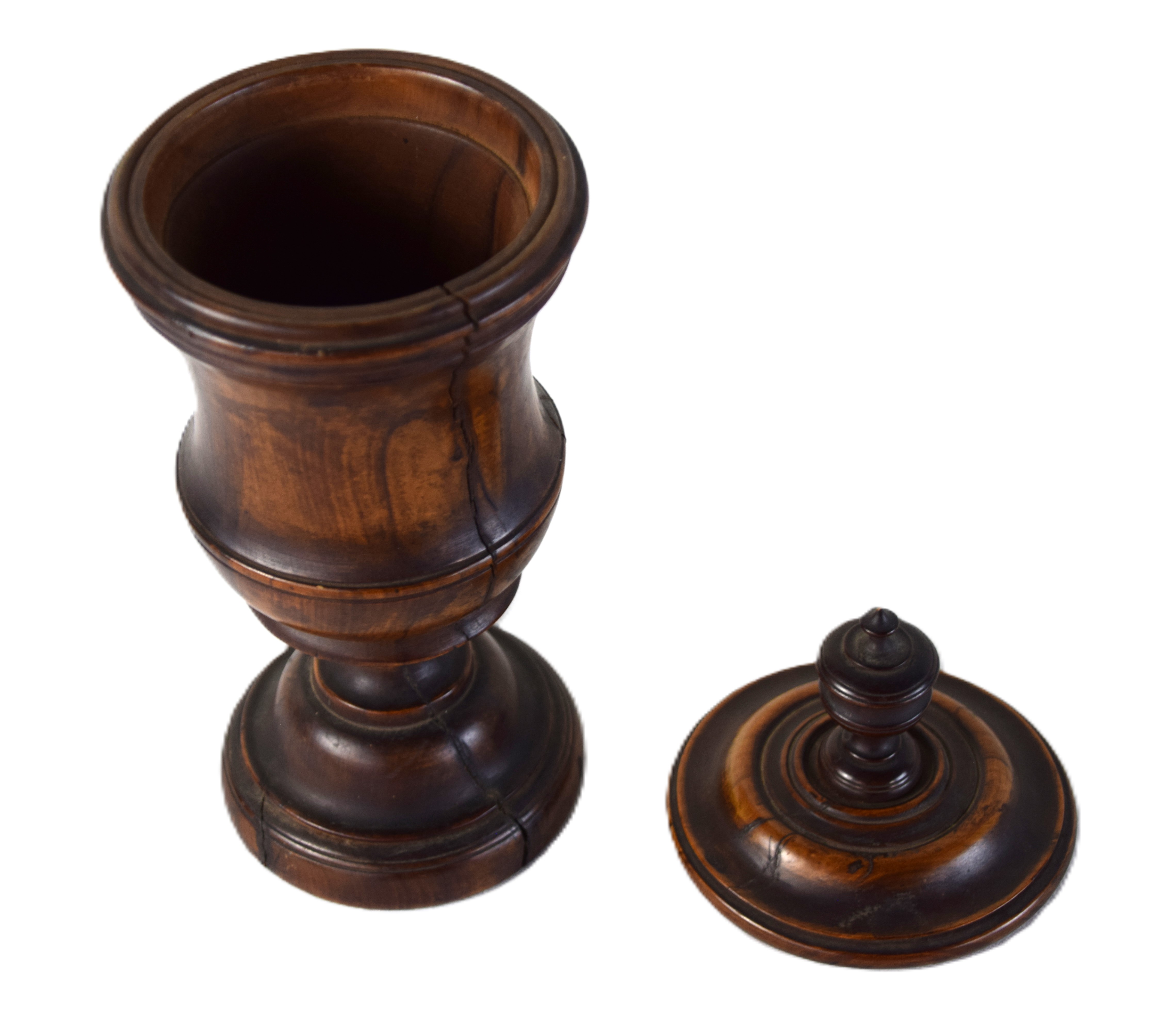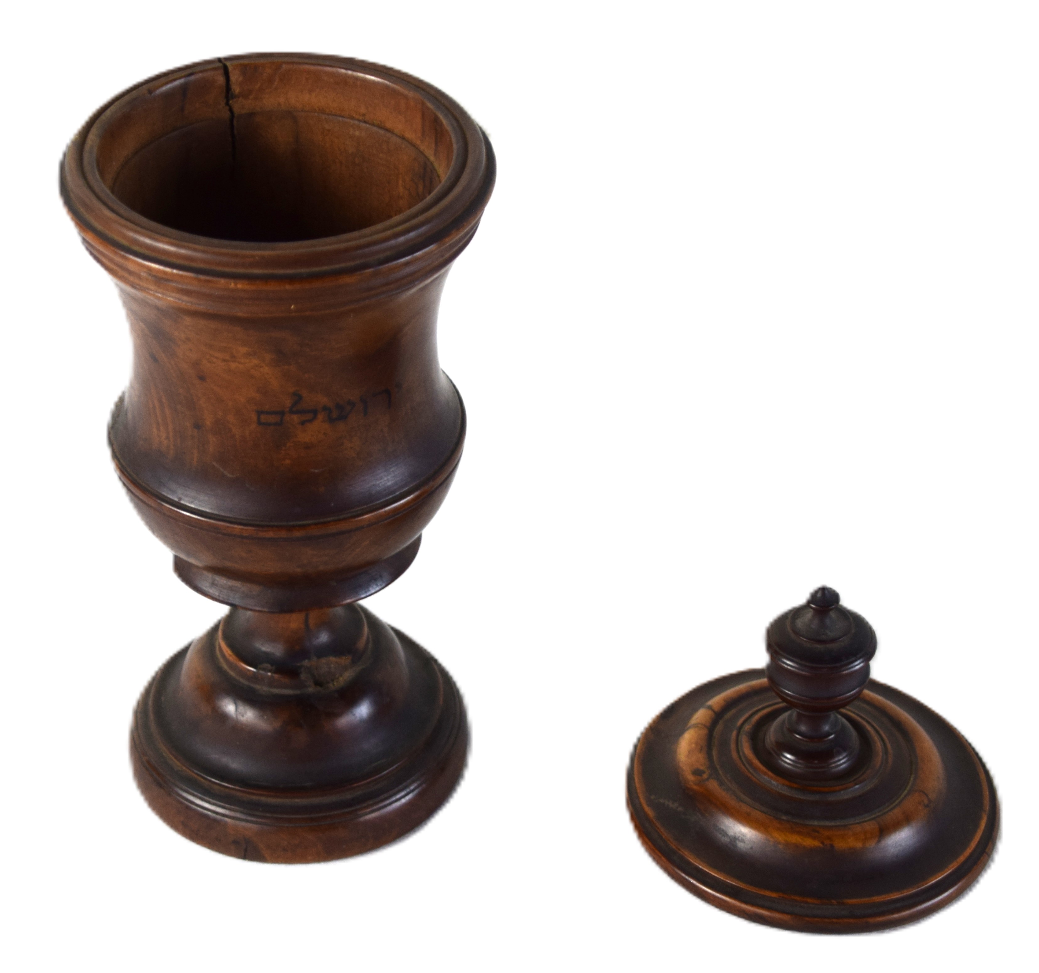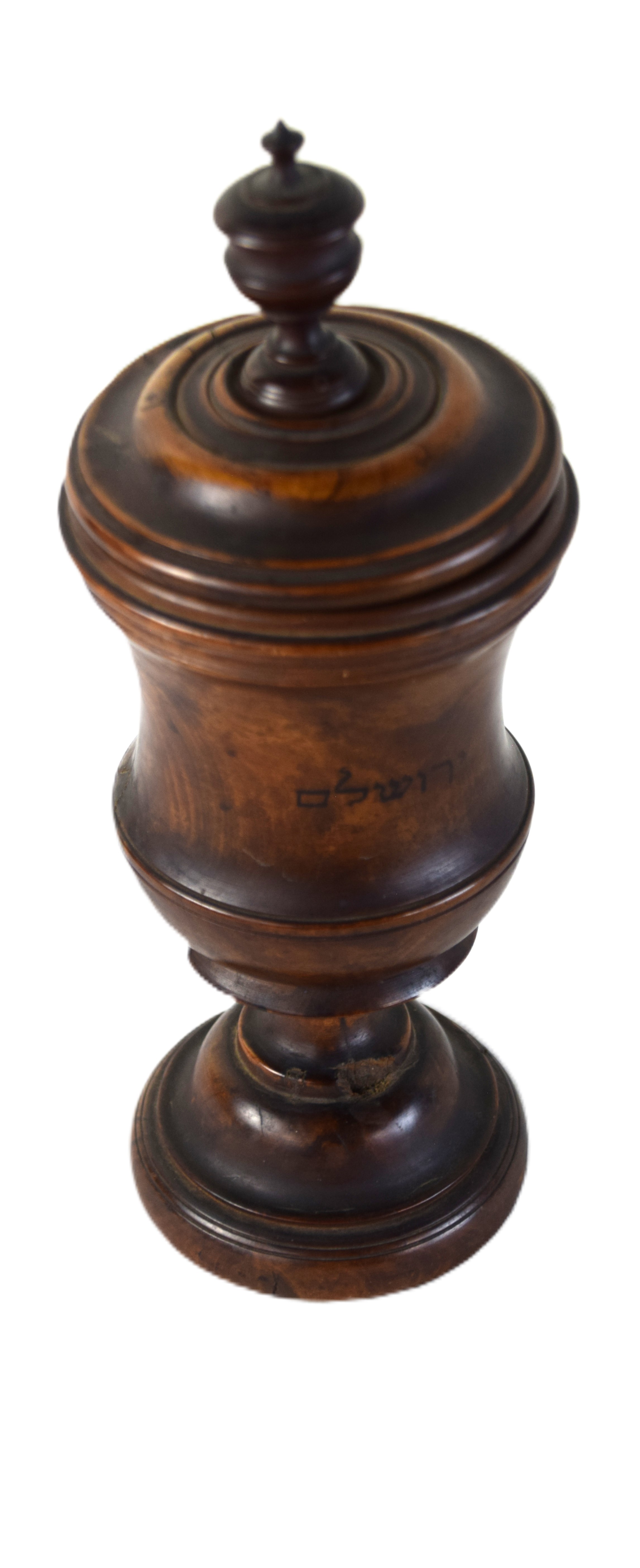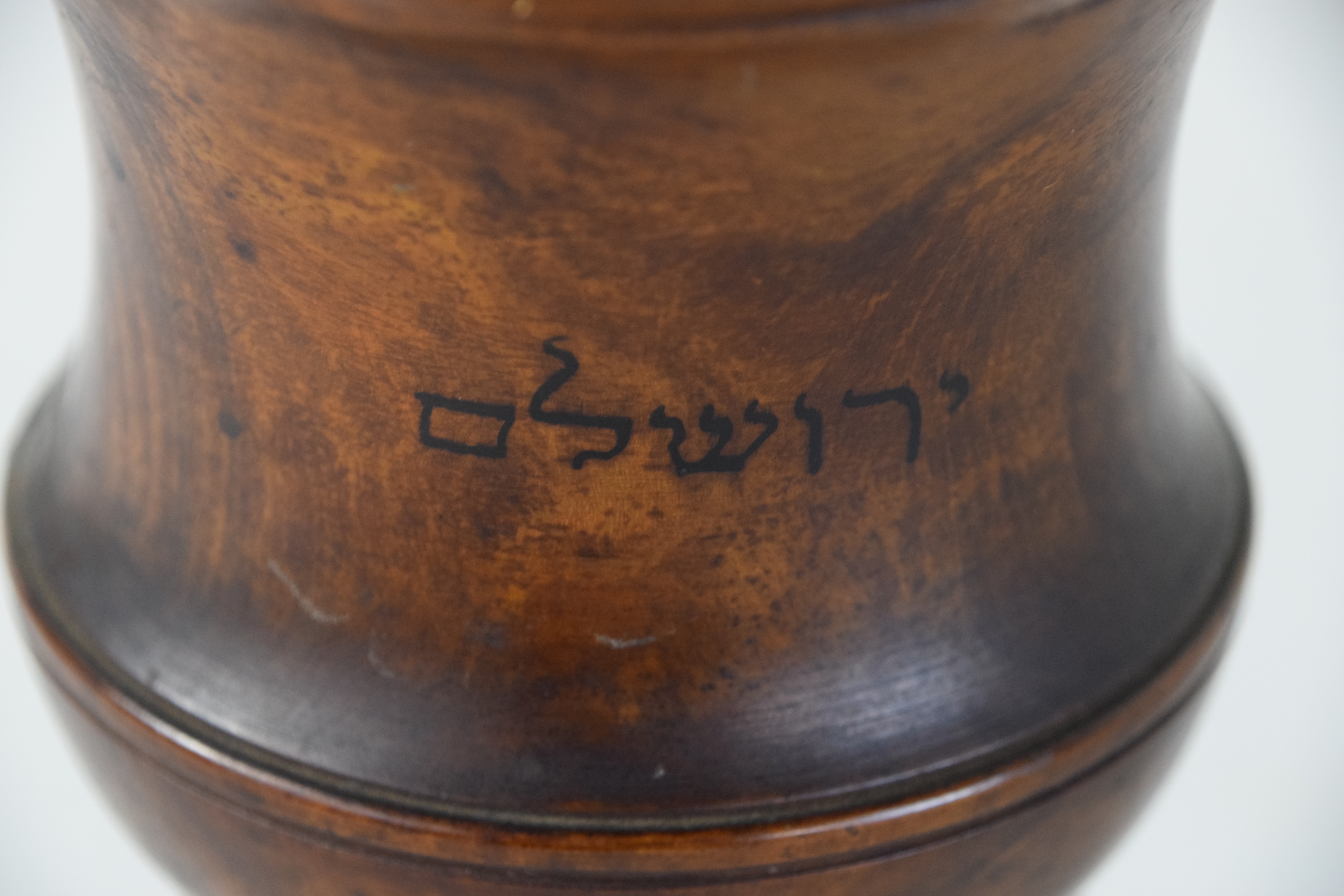 Uncommon Early Grand Tour Palestine Treen/Olive Wood covered vessel with Hebrew writing and finial on top, from The Land of Israel, circa early 20th century. The Grand Tour was the principally 17th- to early 19th-century custom of a traditional trip through Europe and Palestine, undertaken by young aristocrats. Dimensions: 11.5″ H