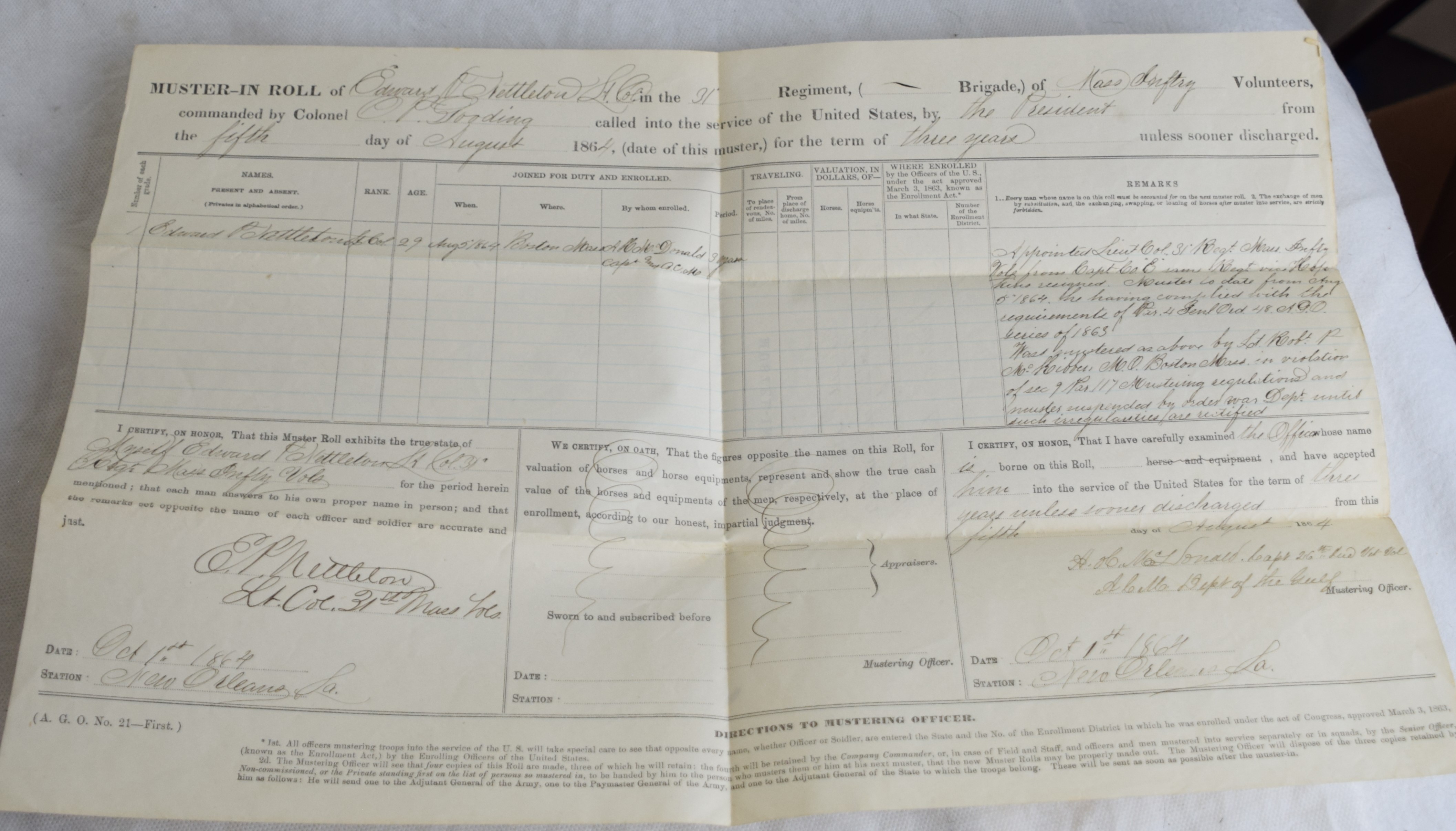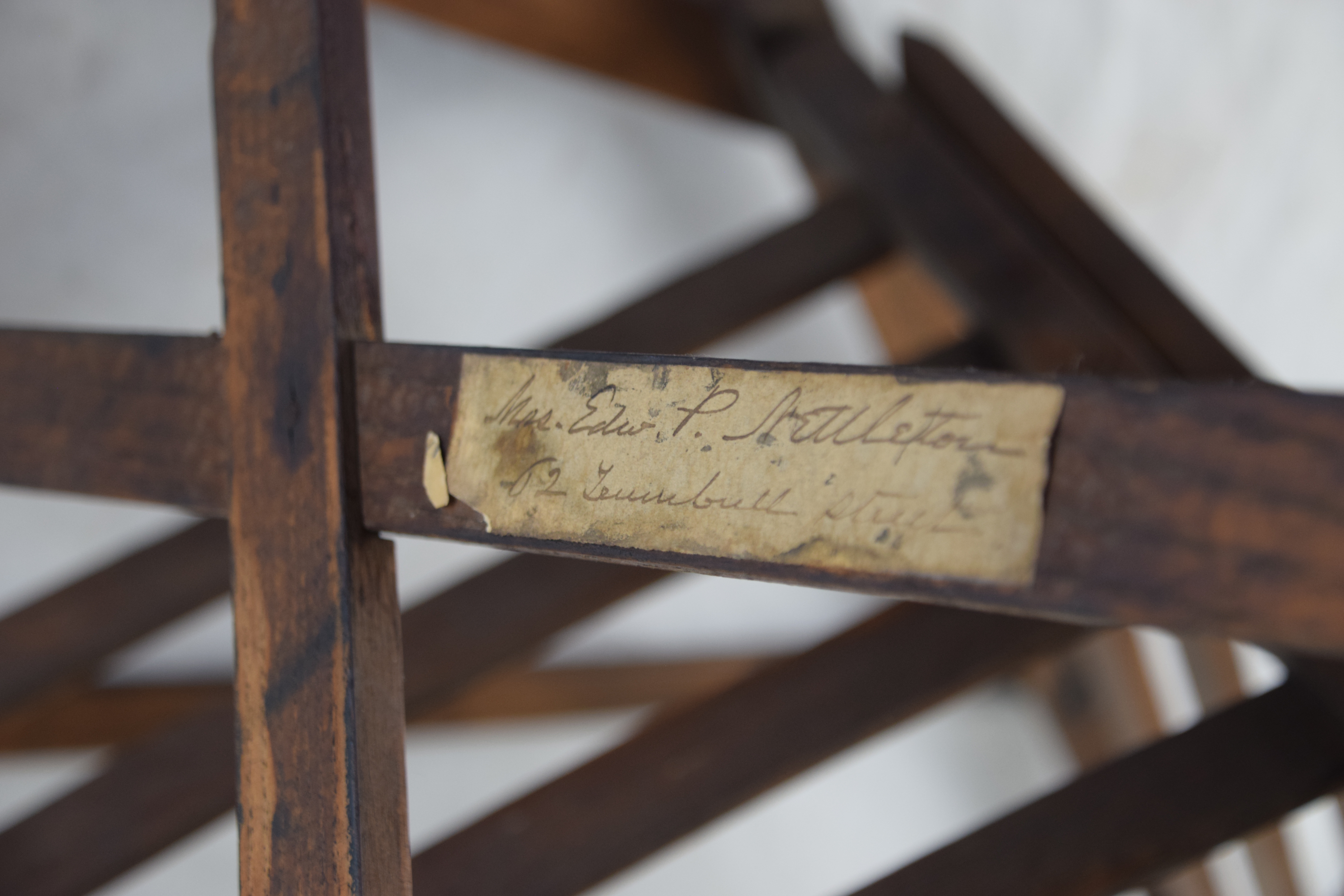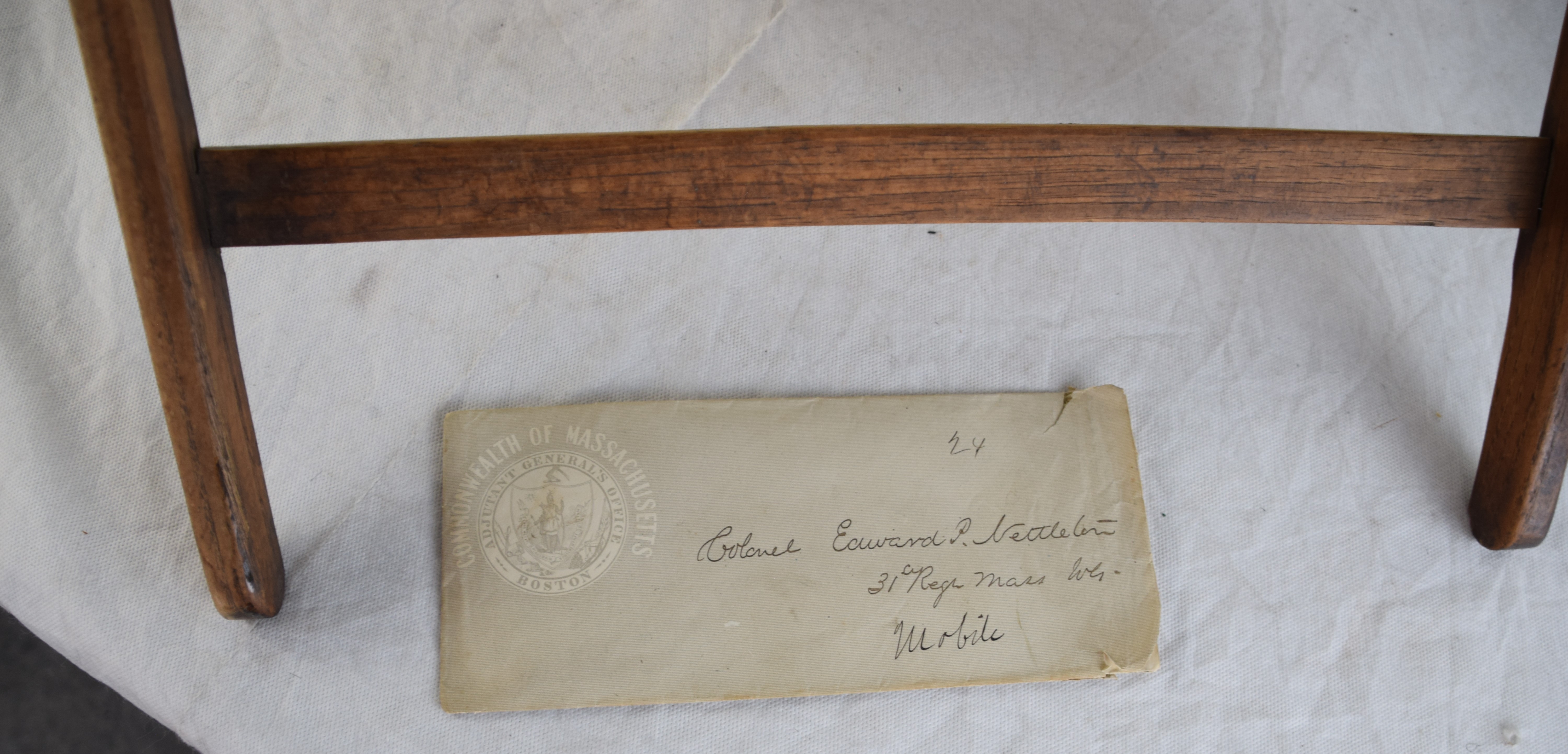 Civil War folding campaign chair used by Colonel Edward P. Nettleton of the 31st Massachusetts Volunteer Regiment. Label on one of the cross pieces. Also included is a muster roll of Colonel Nettleton. Provance: Northeast Auctions. Dimensions: 32″ H, 16″ Seat H