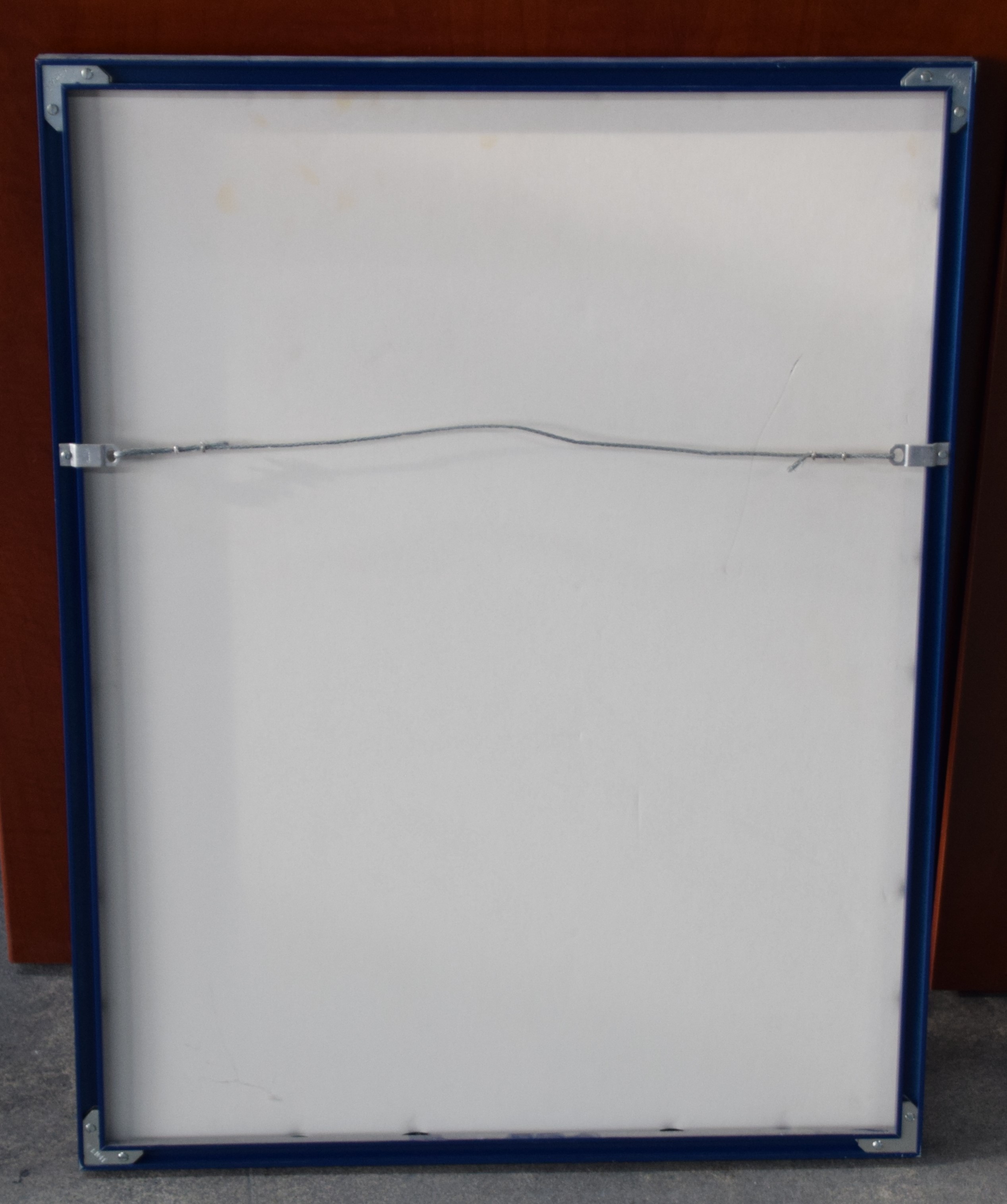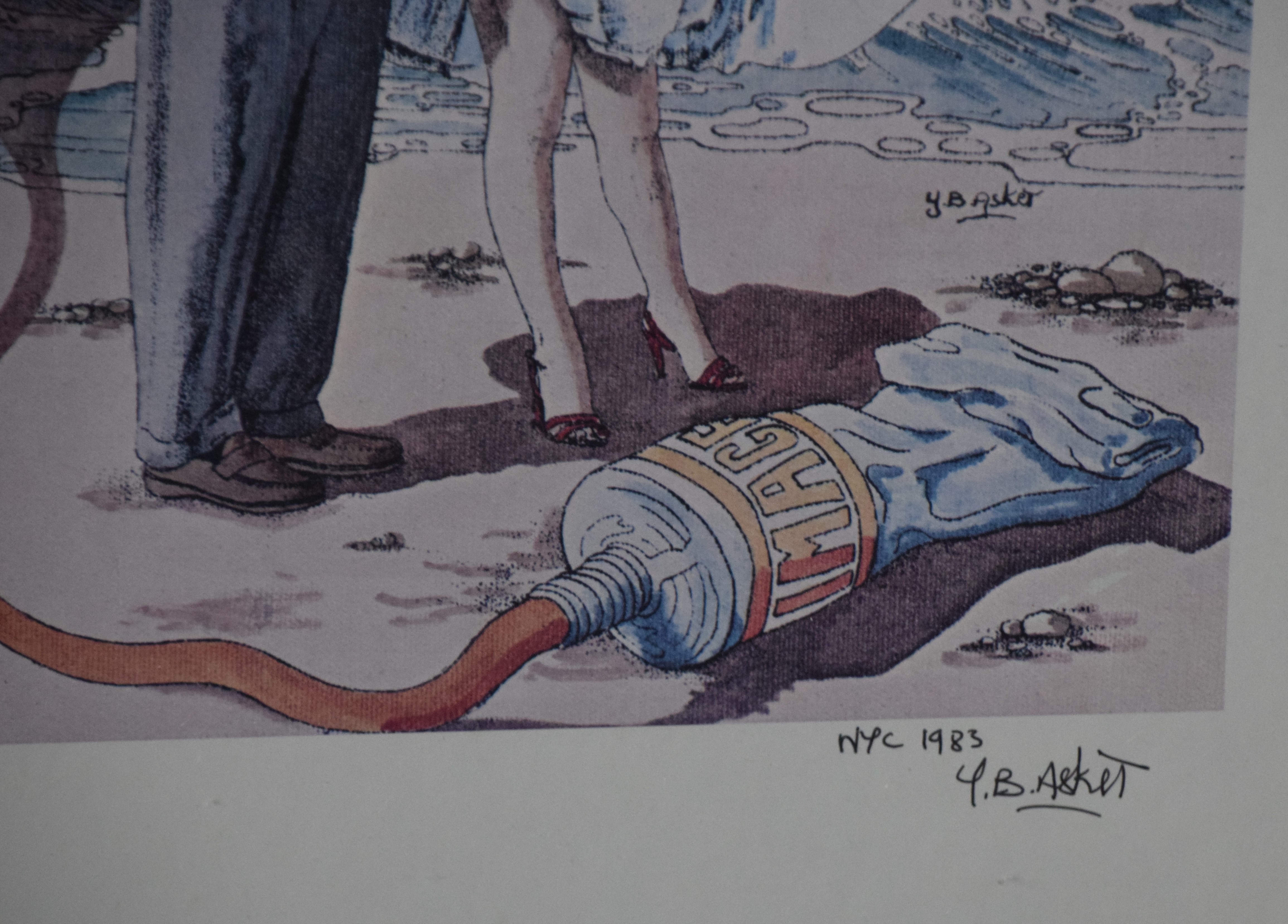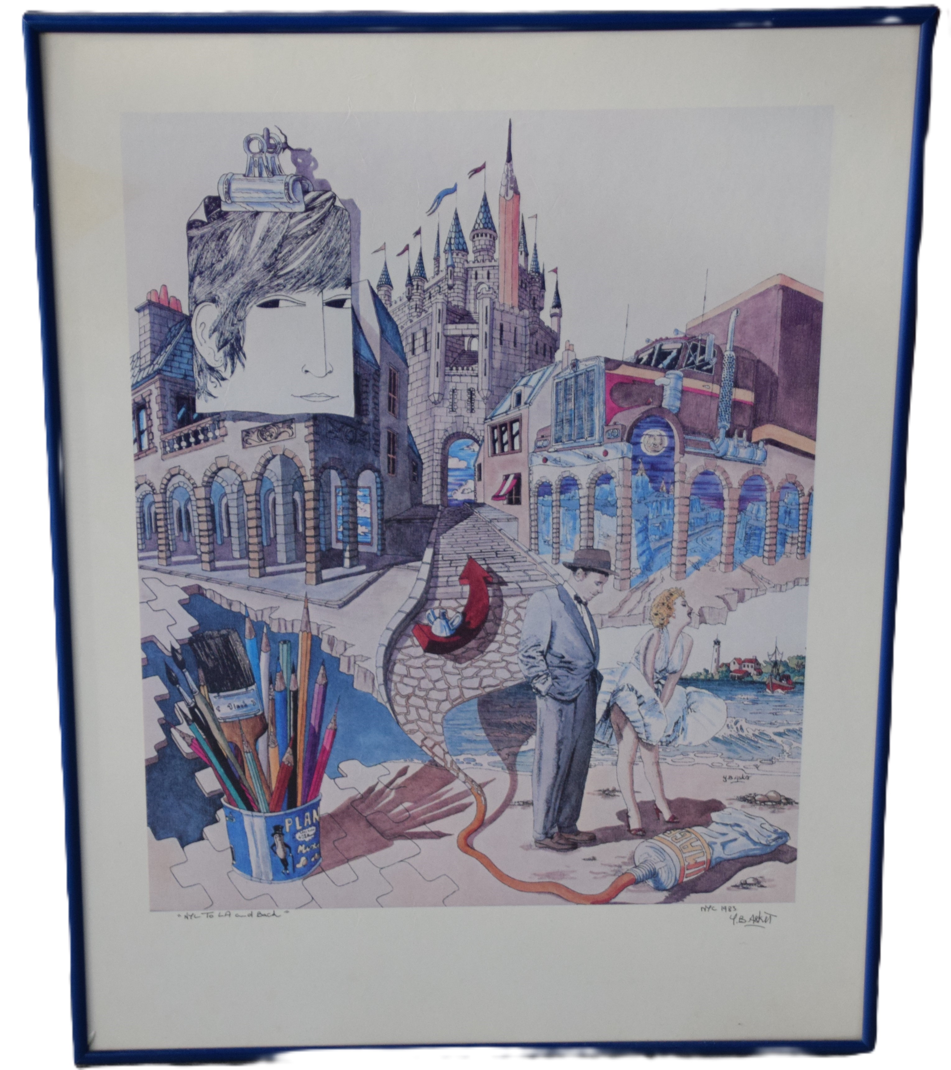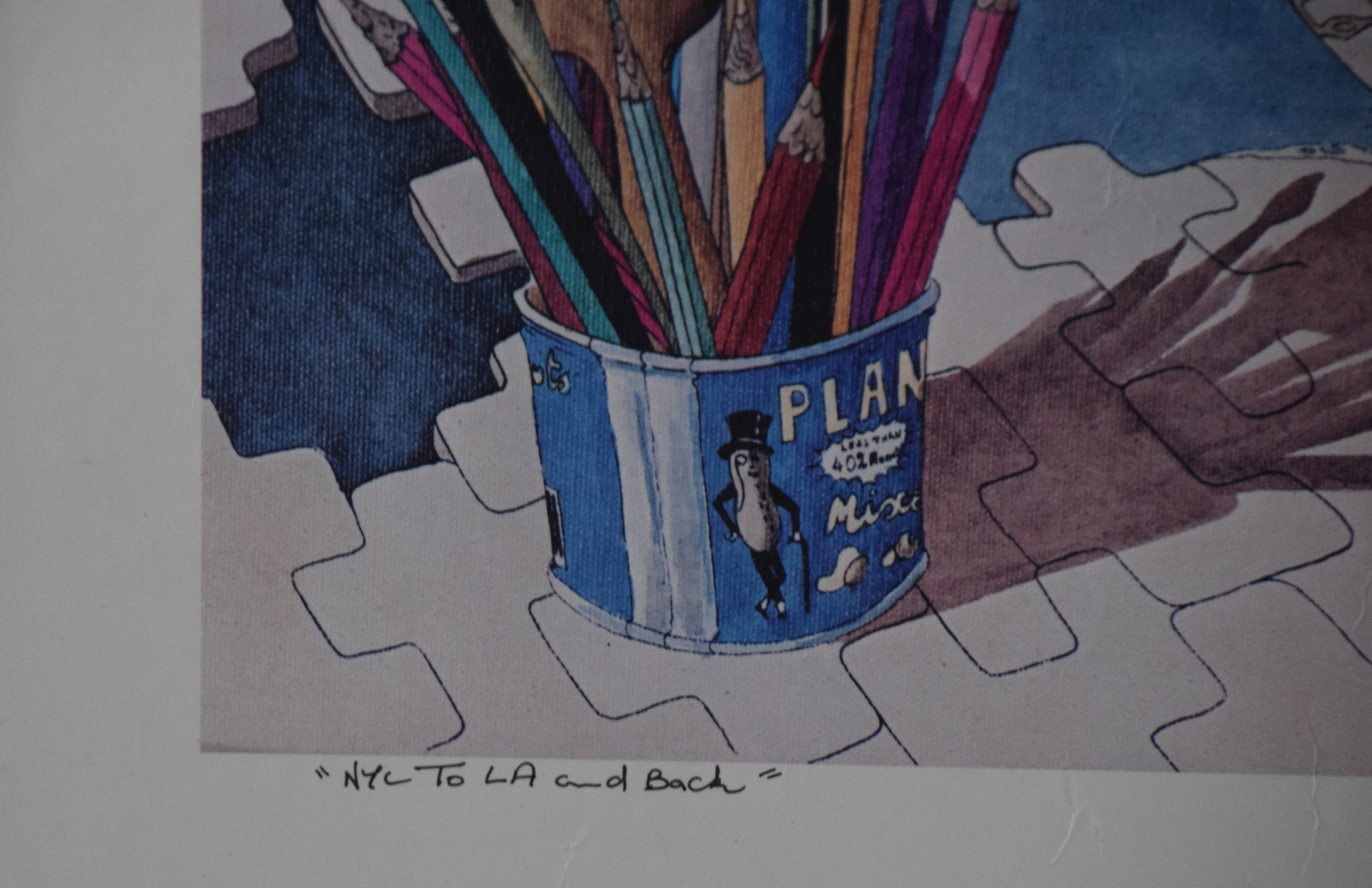 Framed colored lithograph, signed lower right in ink, and titled “NYC To LA And Back”, 1983. Yves B. Asket (20th Century) works in France and is known for village paintings. Dimensions: 26″ X 20″ Overall