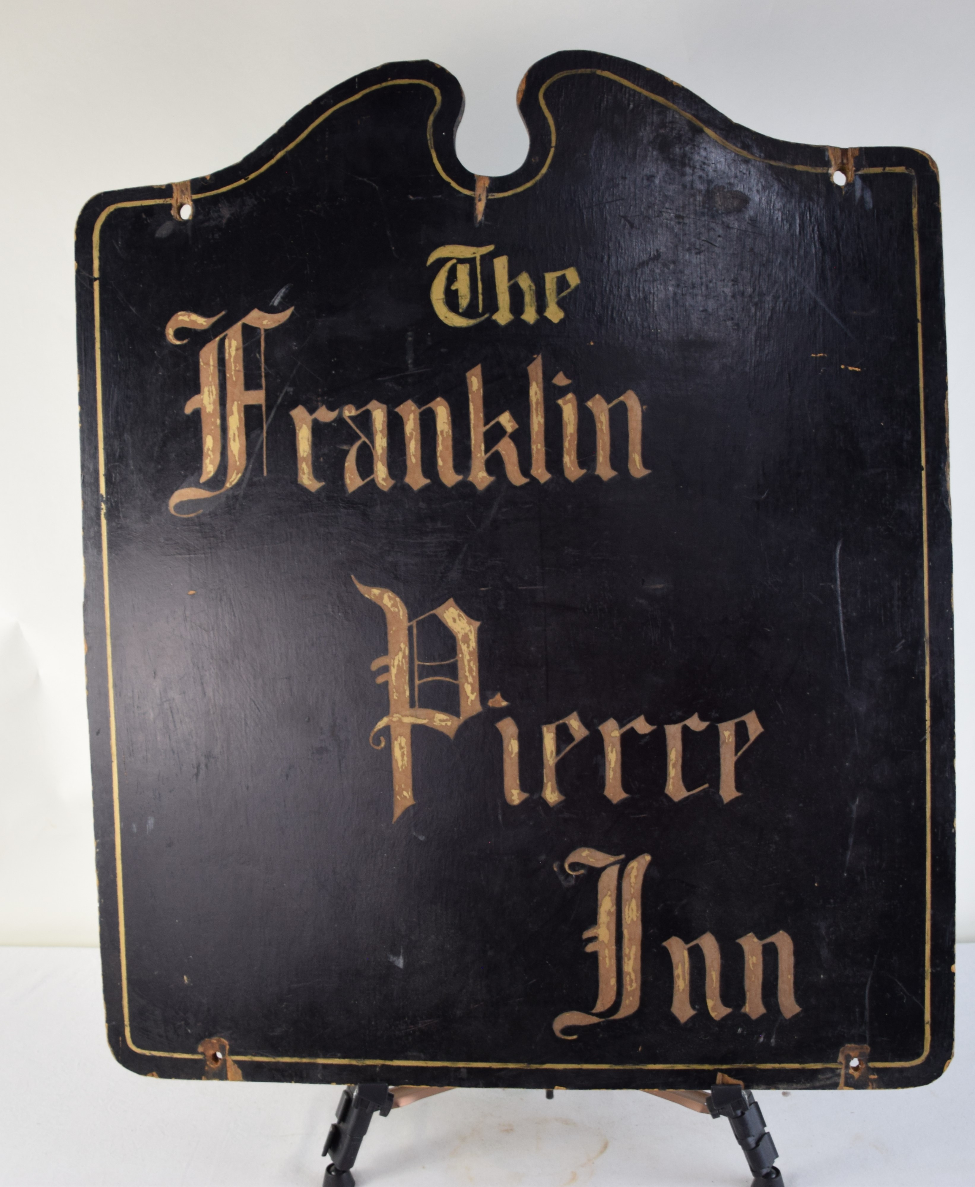 Carved wooden tavern sign “The Franklin Pierce Inn”, double sided. The Franklin Pierce Inn was in Antrim NH. Dimensions: 34″ H x 28″ W