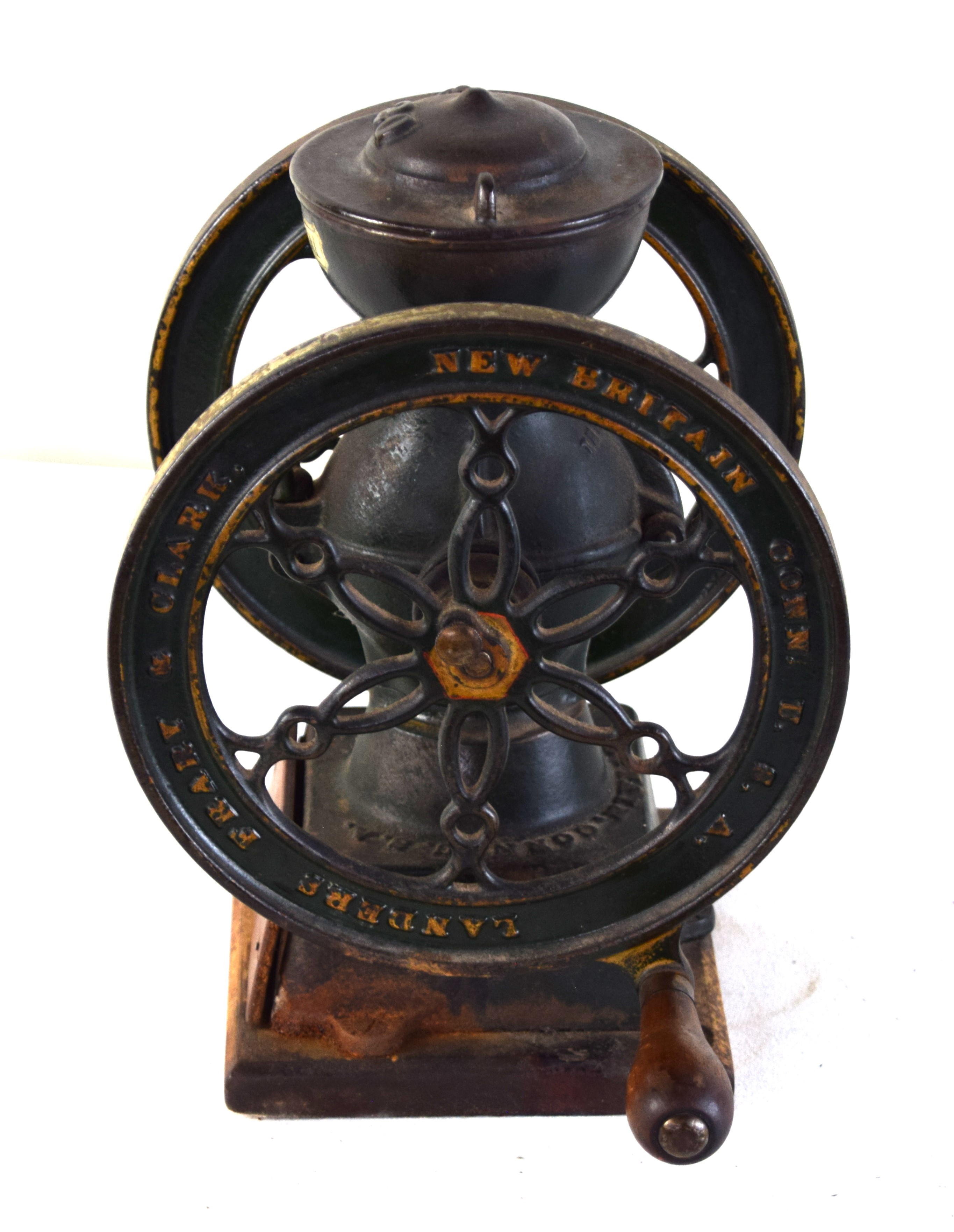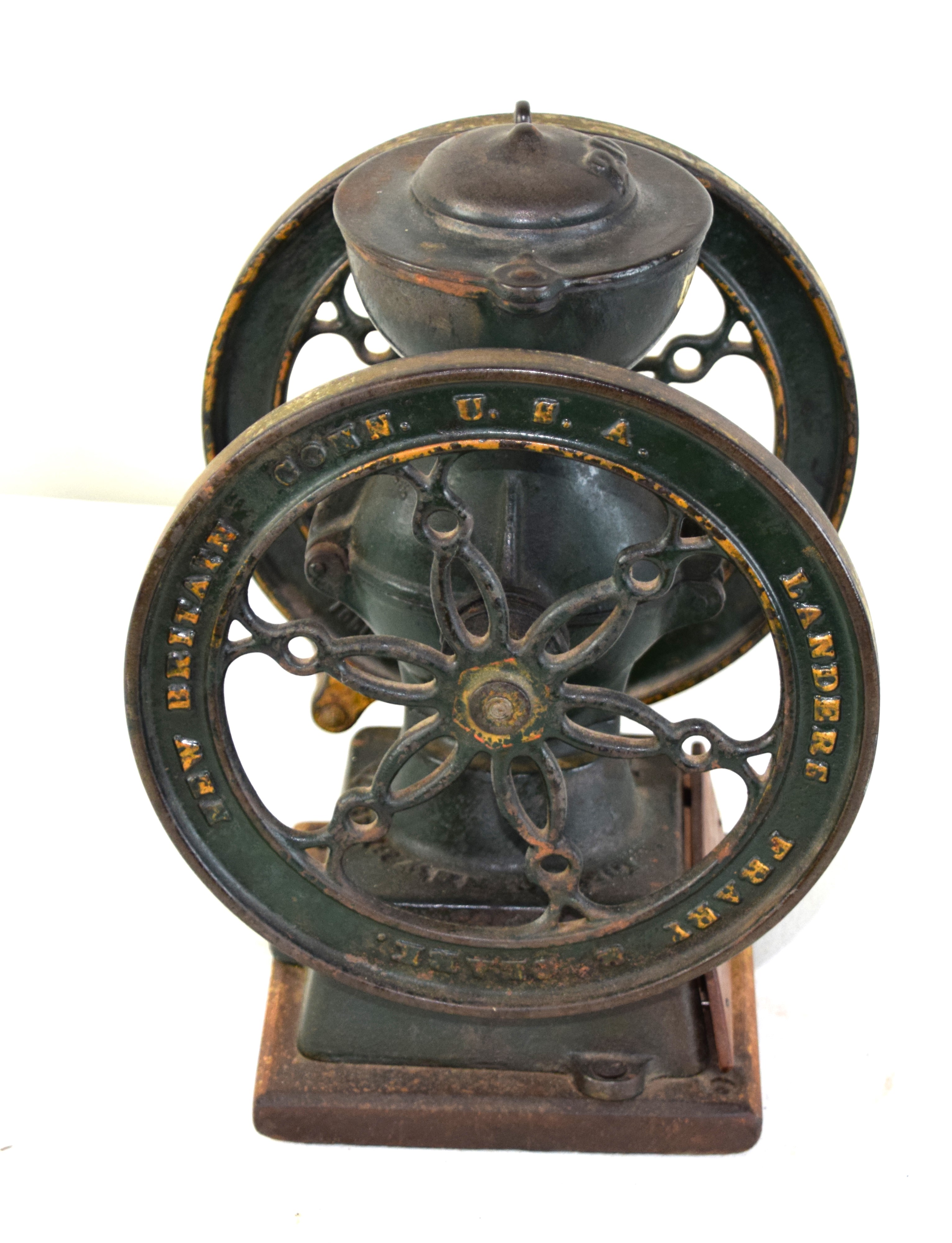 Small size double wheel coffee mill “Landers, Fraly and Clark” with red paint, original condition with lower drawer