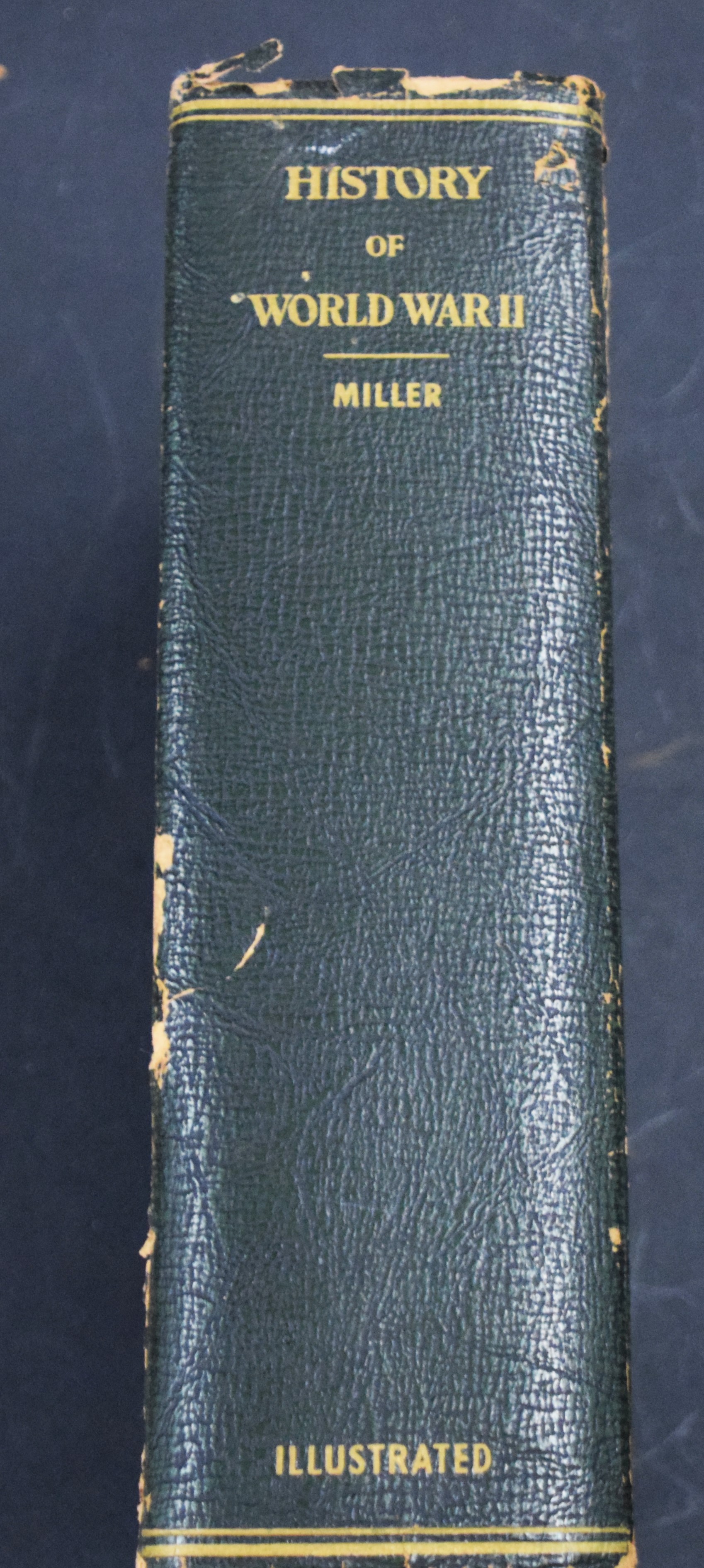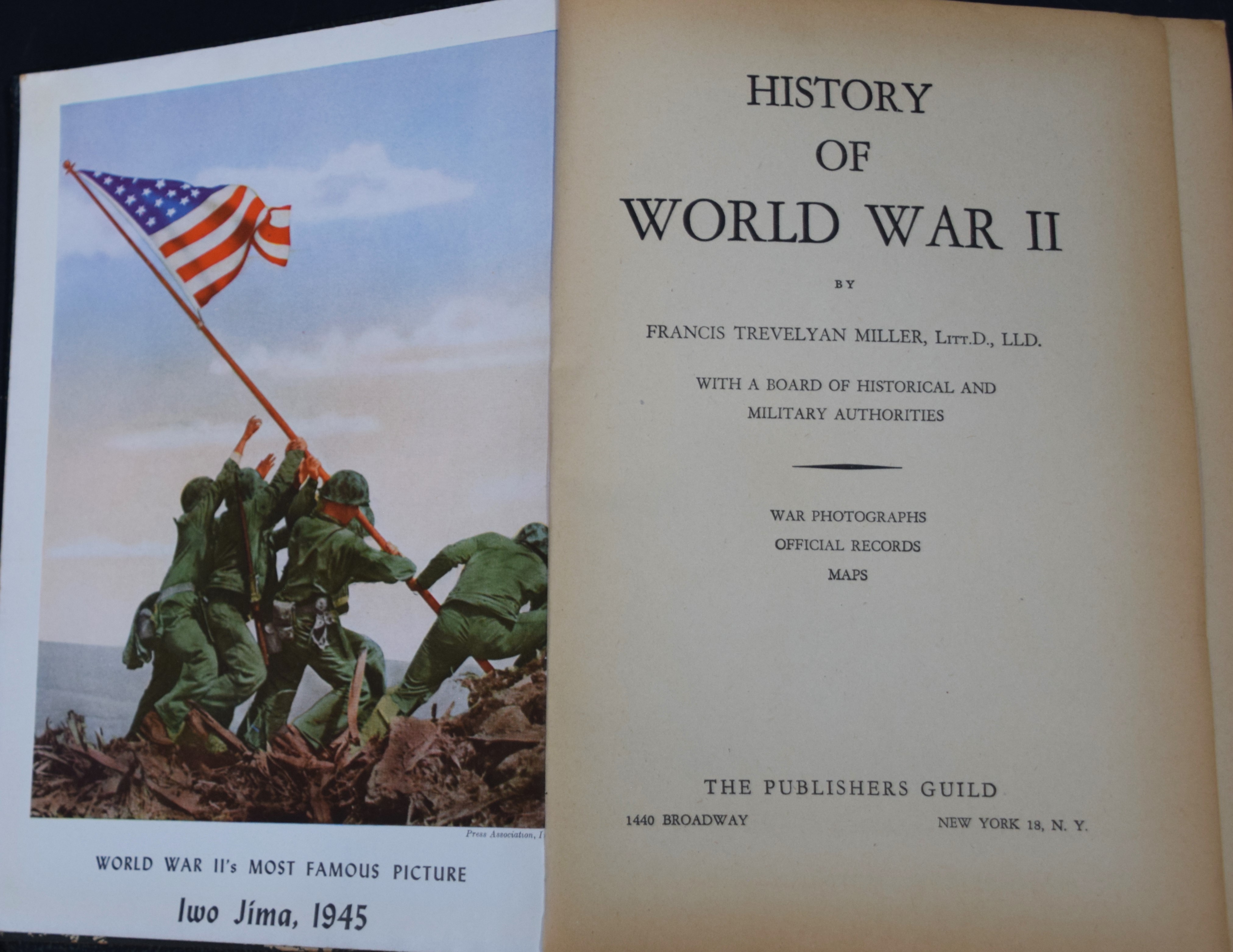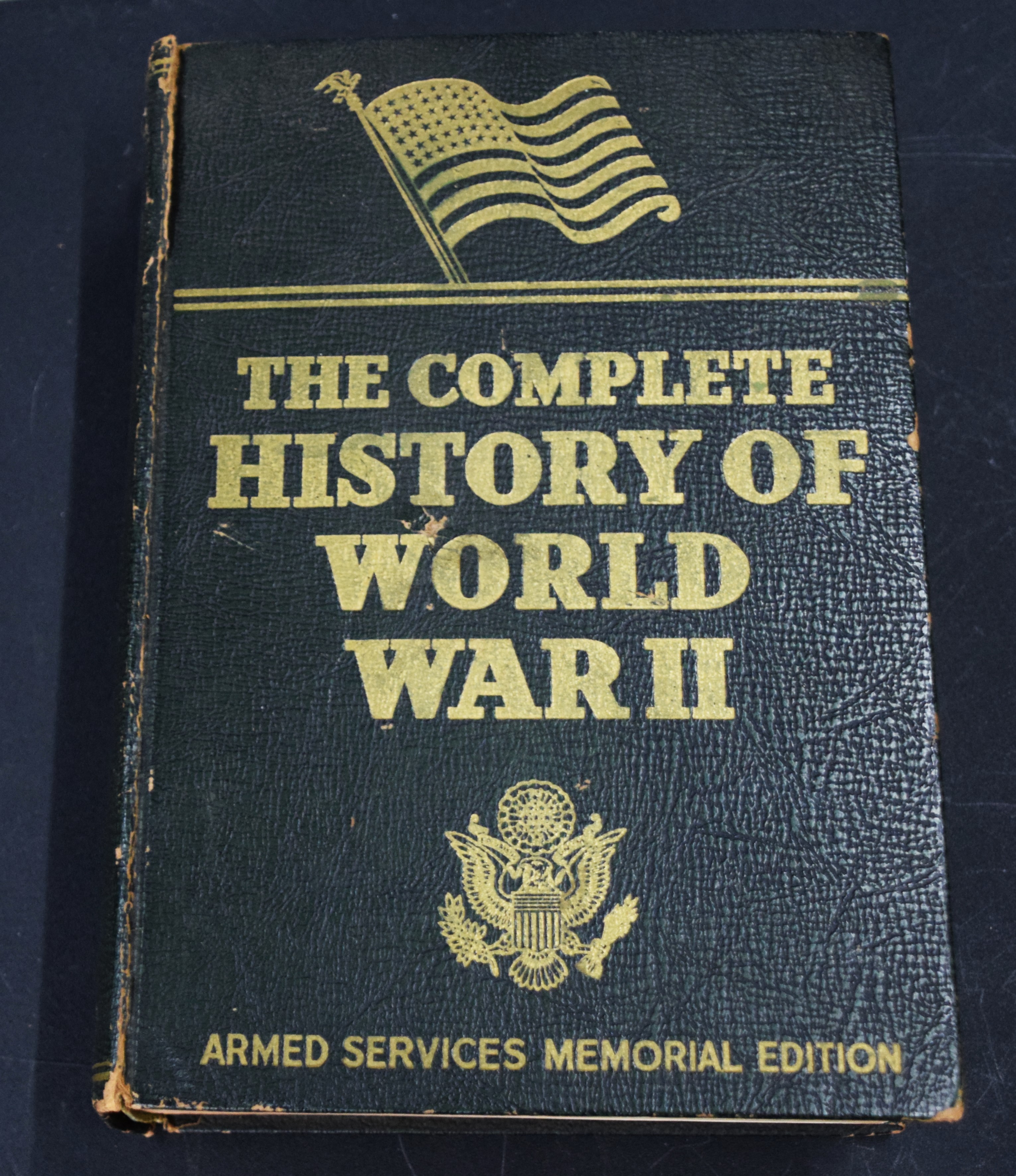 The Complete History of World War II, Armed Services Memorial Edition, 1948 by Francis Trevelyan Miller. Faux dark blue/black leather boards with front cover gold lettering. Includes List of Board of Historical and Military Analysts. Illustrated with sections of black-and-white war photographs, Official Records, and Maps.