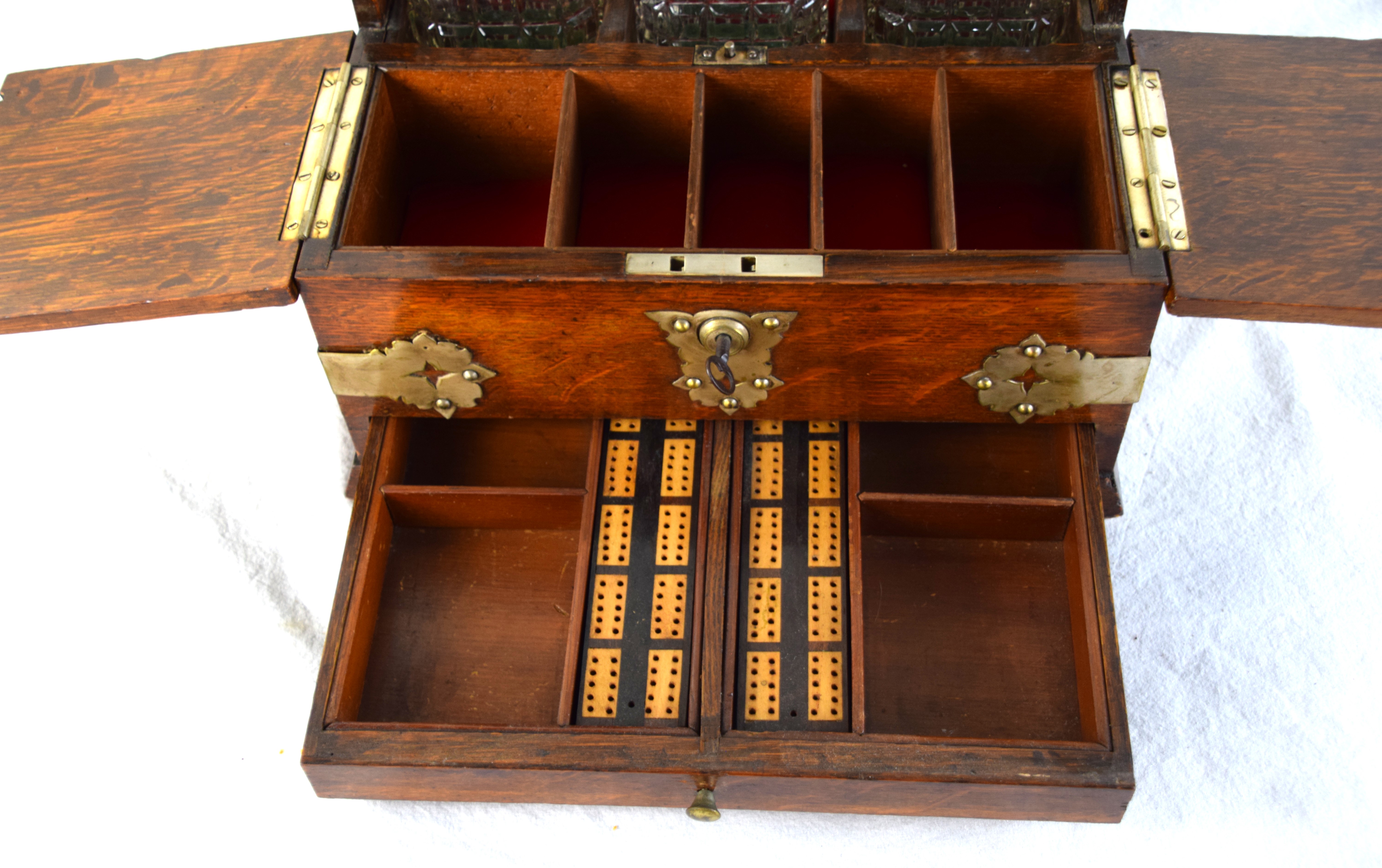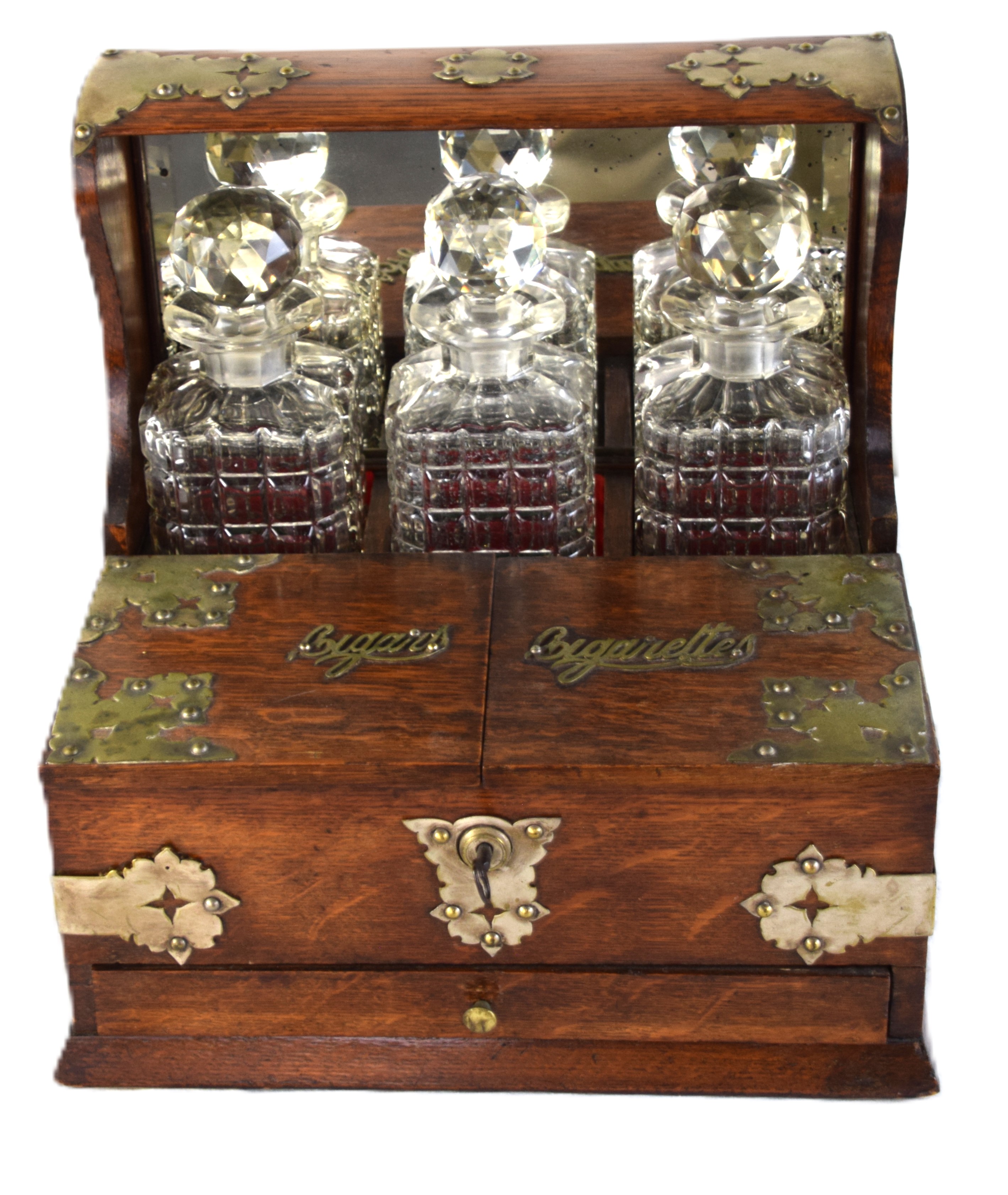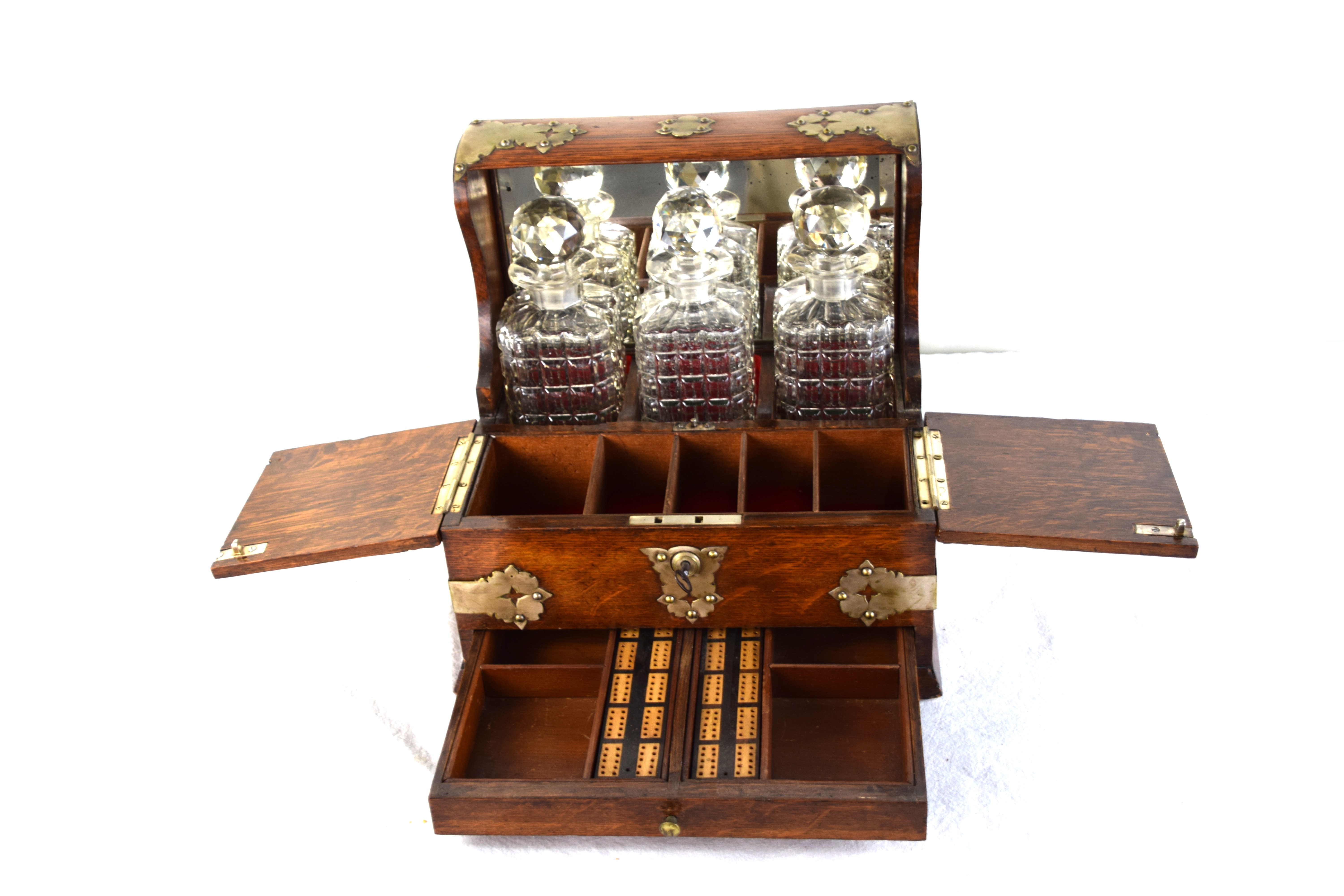 Fine 19th Century tantalus liquor set with three cut crystal decanters with faceted stoppers, diamond pattern case with brass bands with two folding lids with brass lettering-cigars and cigarettes, original key with lower drawer with cribbage board. Case is oak with bail handles. Dimensions: 13″ H x 12.5″ W x 10″ D