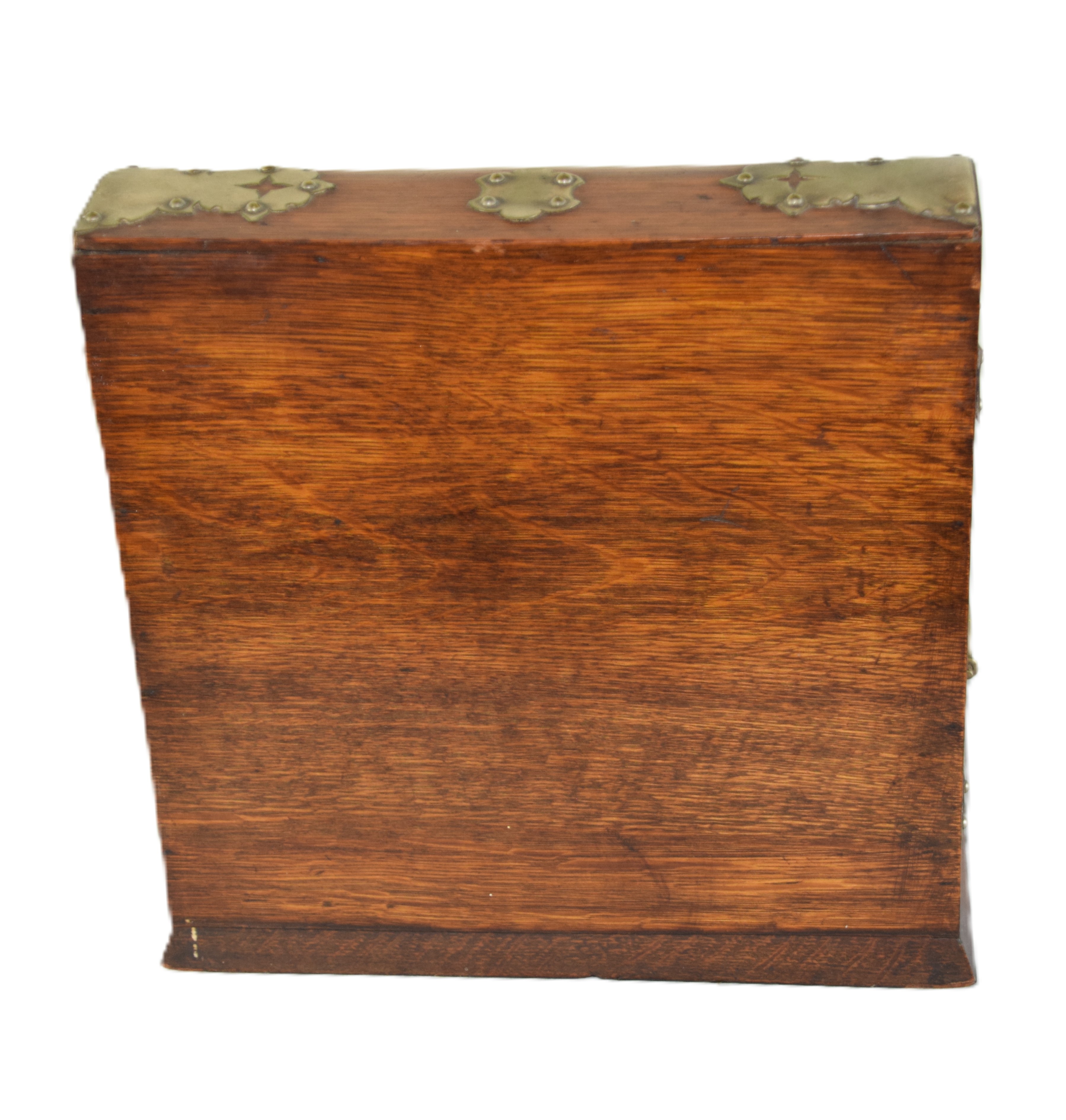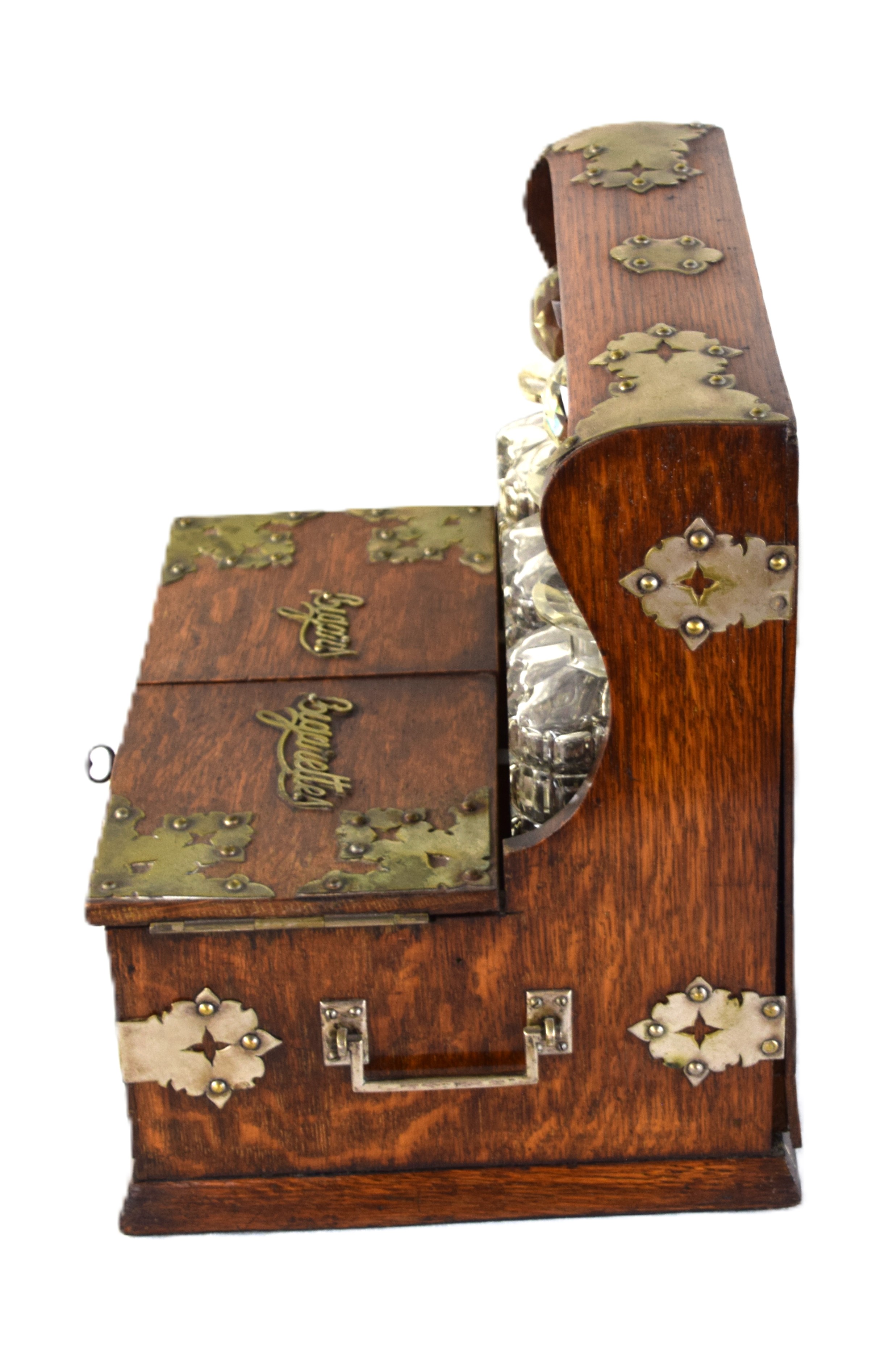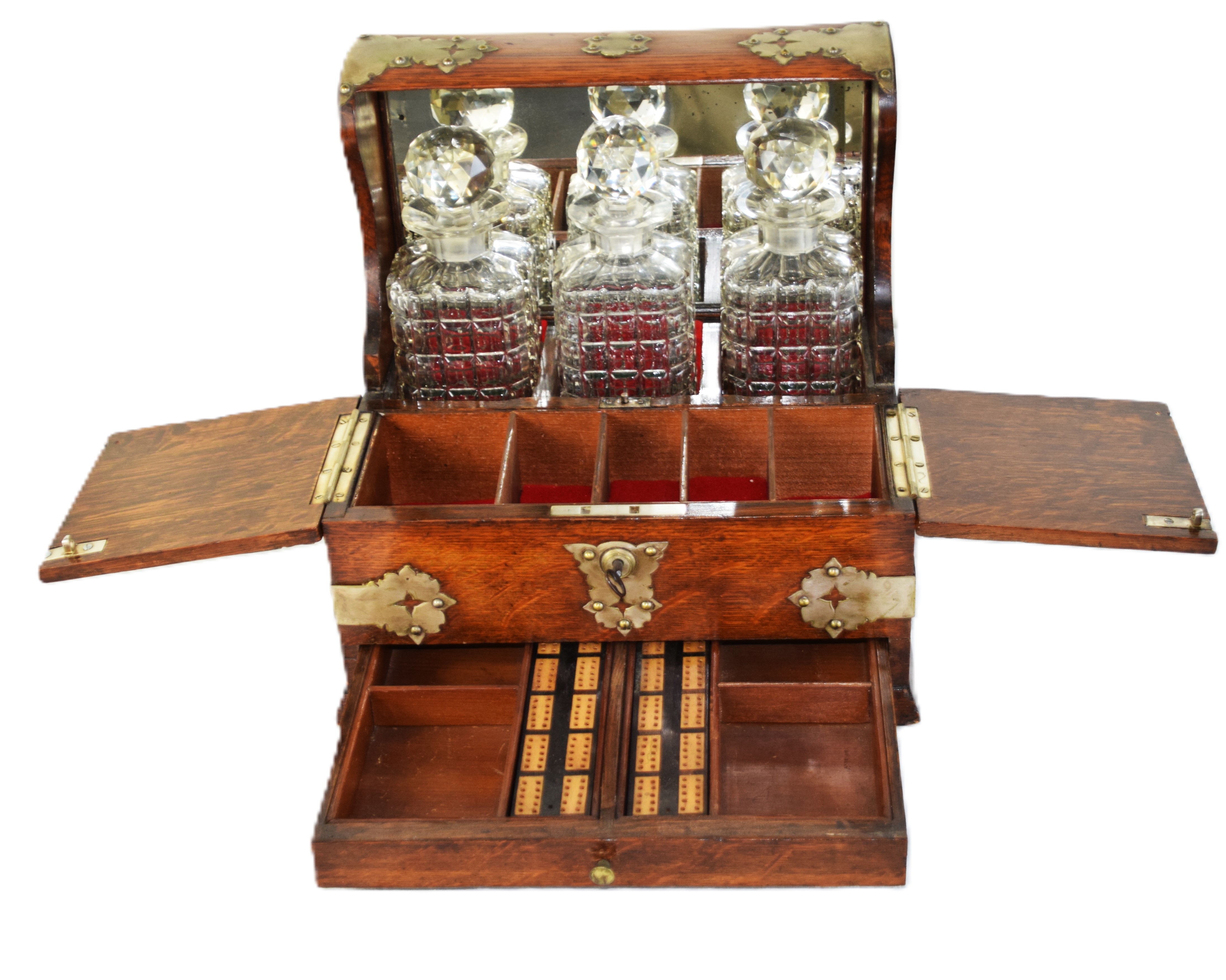 Fine 19th Century tantalus liquor set with three cut crystal decanters with faceted stoppers, diamond pattern case with brass bands with two folding lids with brass lettering-cigars and cigarettes, original key with lower drawer with cribbage board. Case is oak with bail handles. Dimensions: 13″ H x 12.5″ W x 10″ D