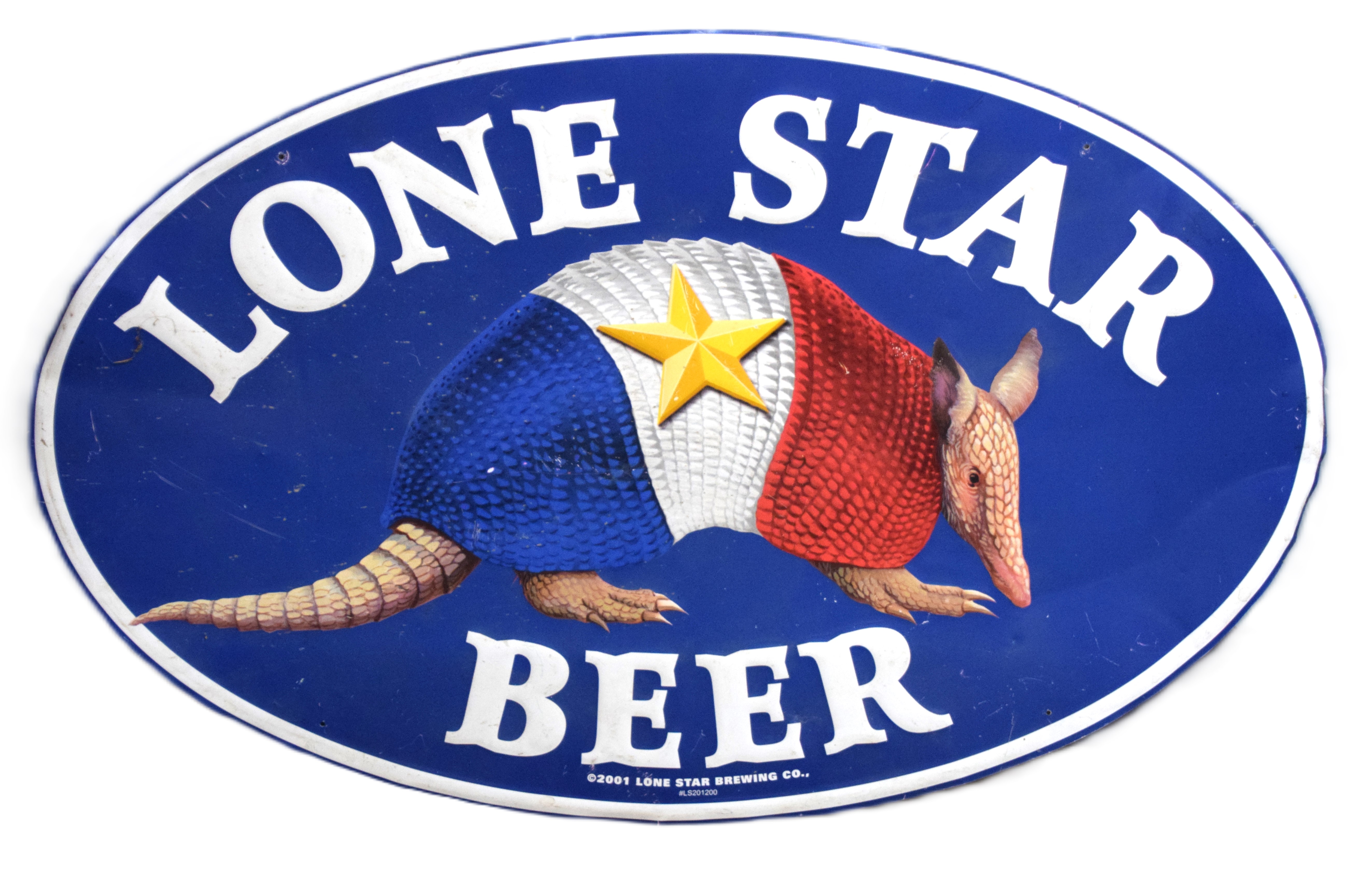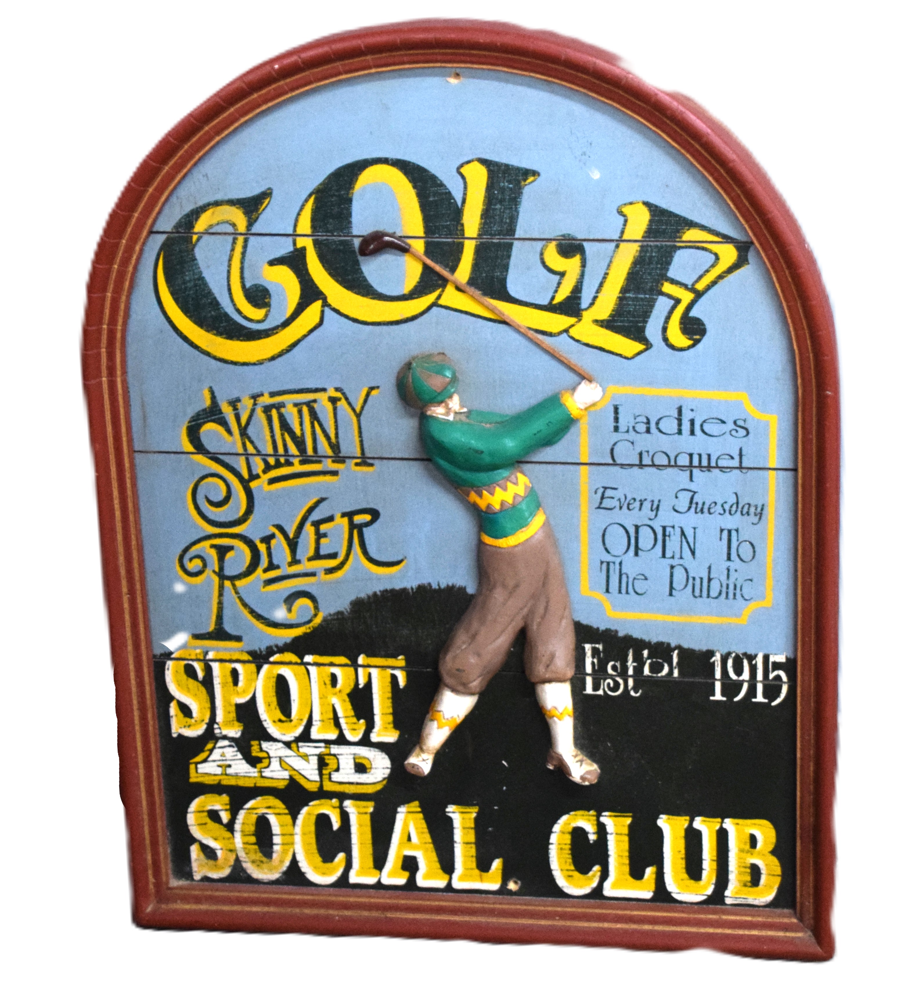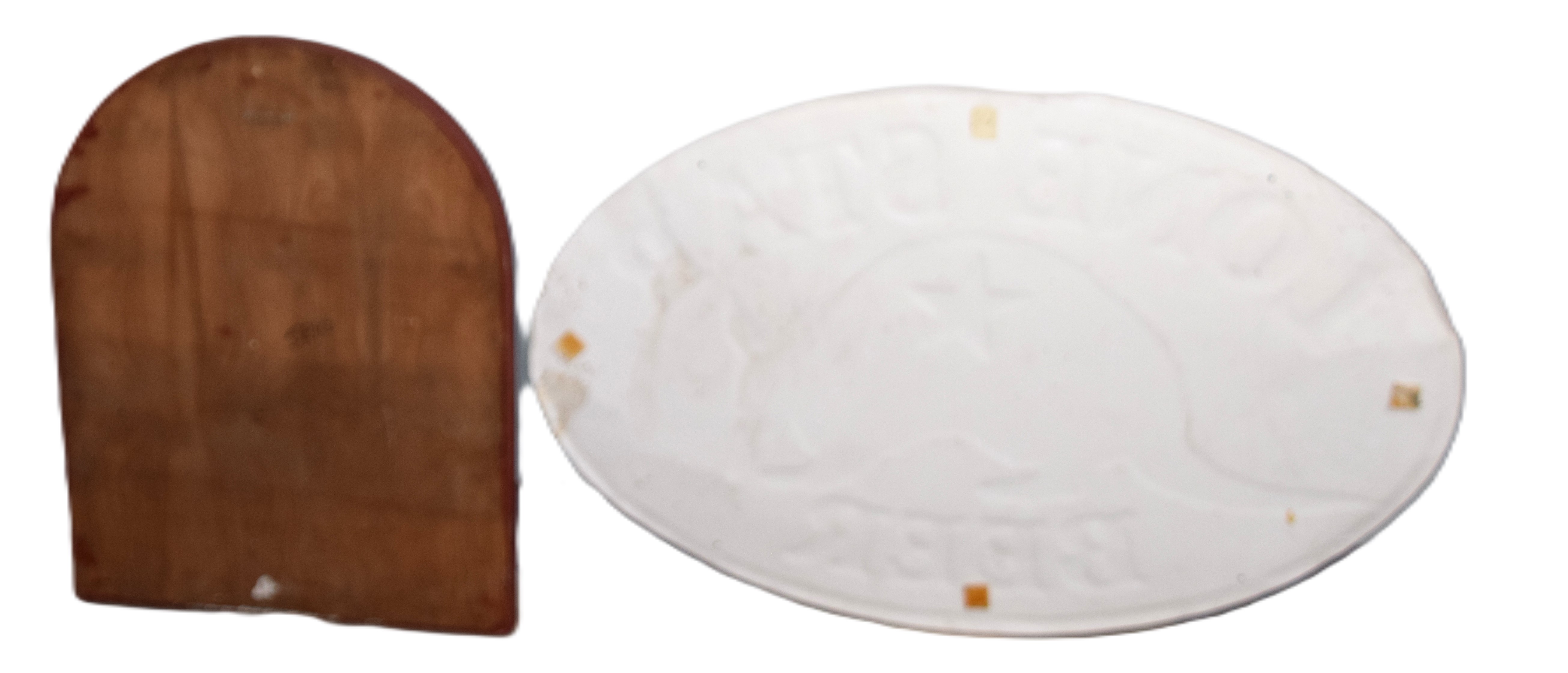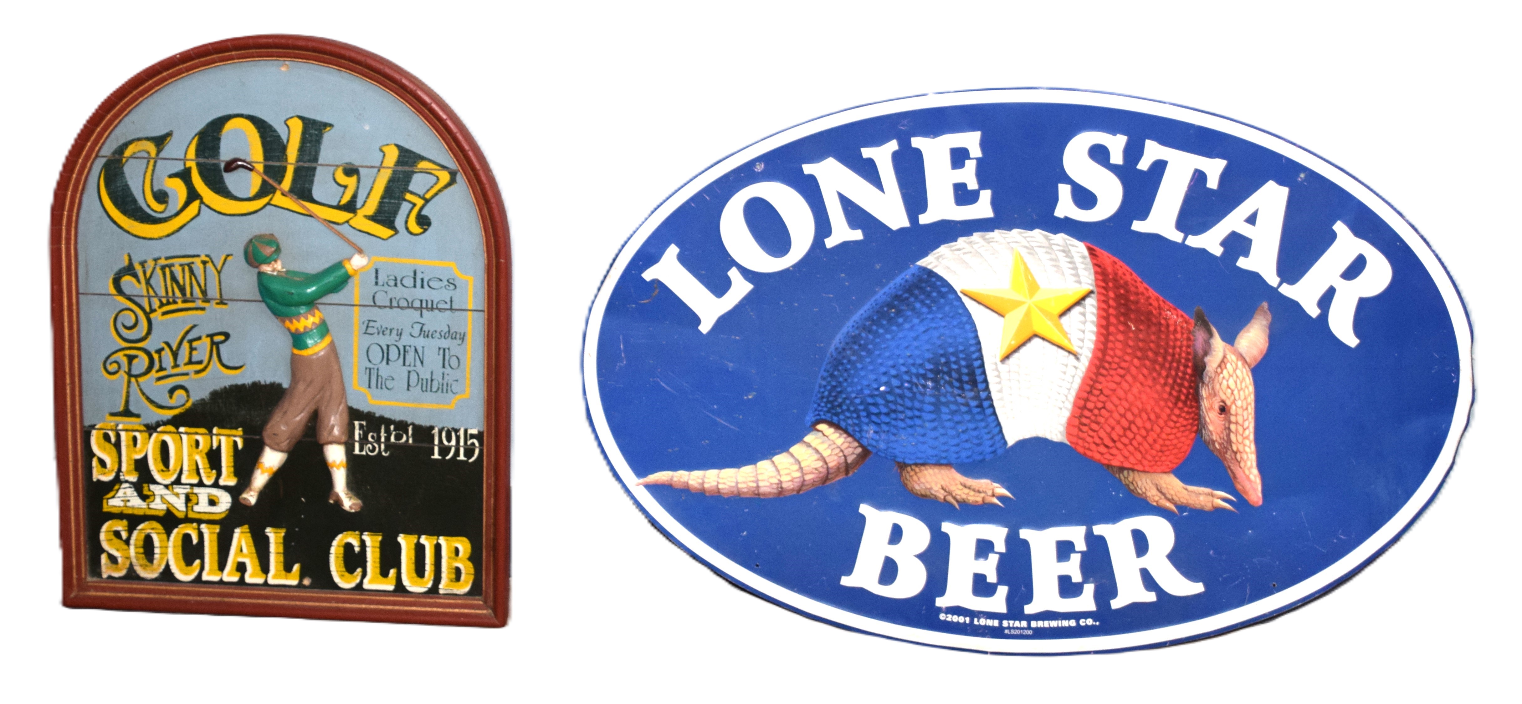 Two advertising signs, one a carved wooden sign labeled “Golf Sport and Social Club” in an arched shape frame of three boards (27H x 18″ W) and the other a tin oval advertising sign of Lone Star Beer (22.5″ H x 33″ W)