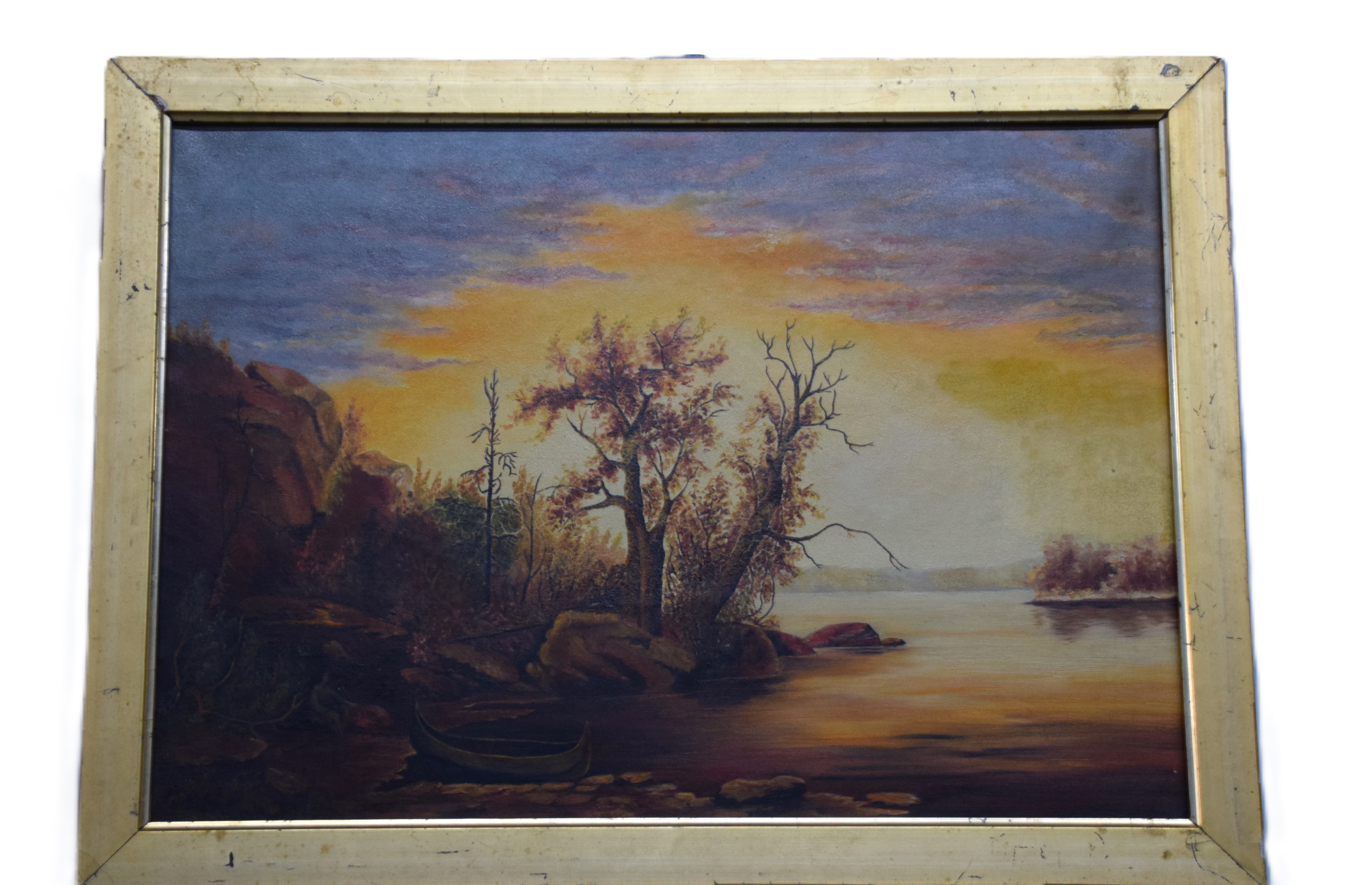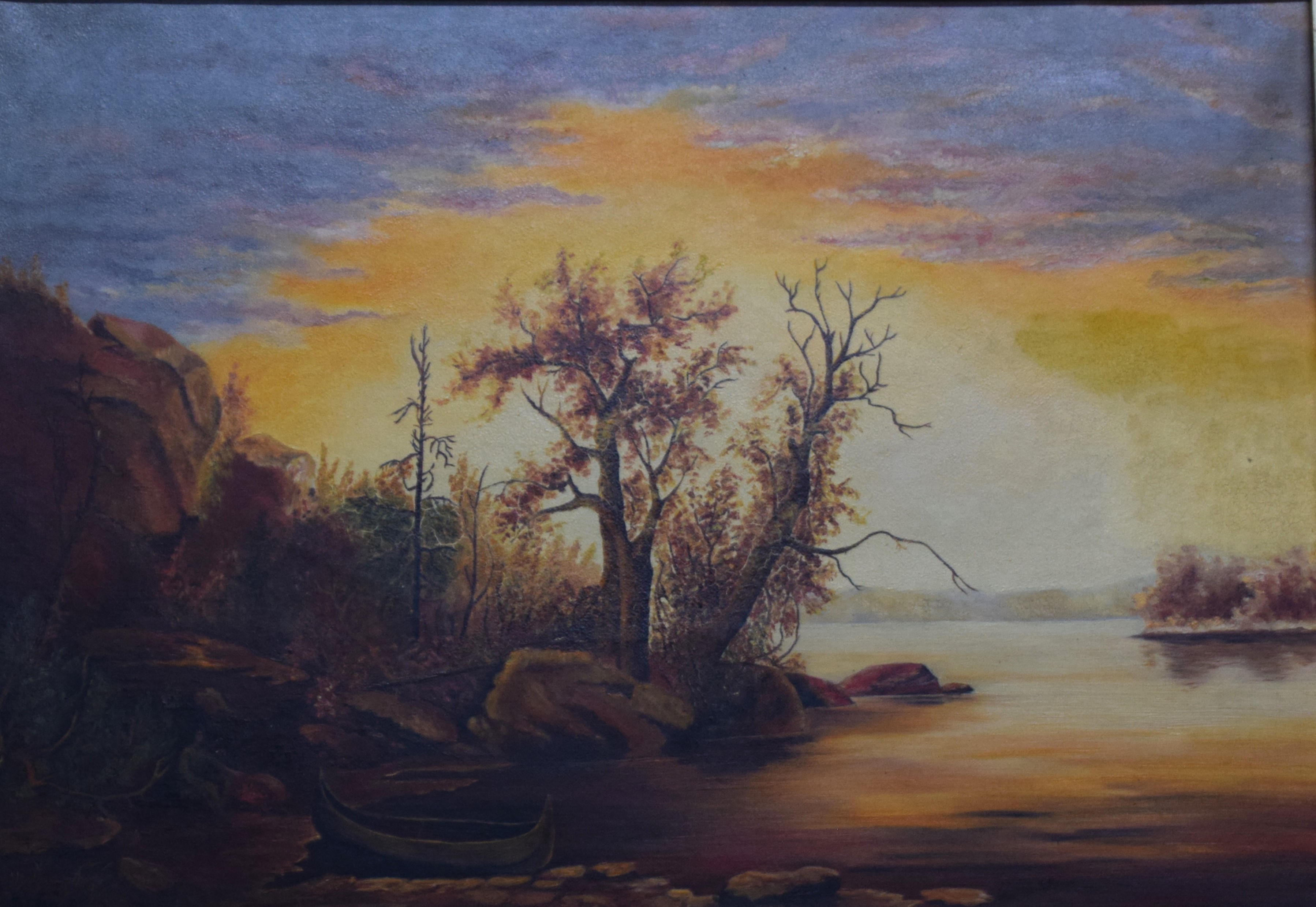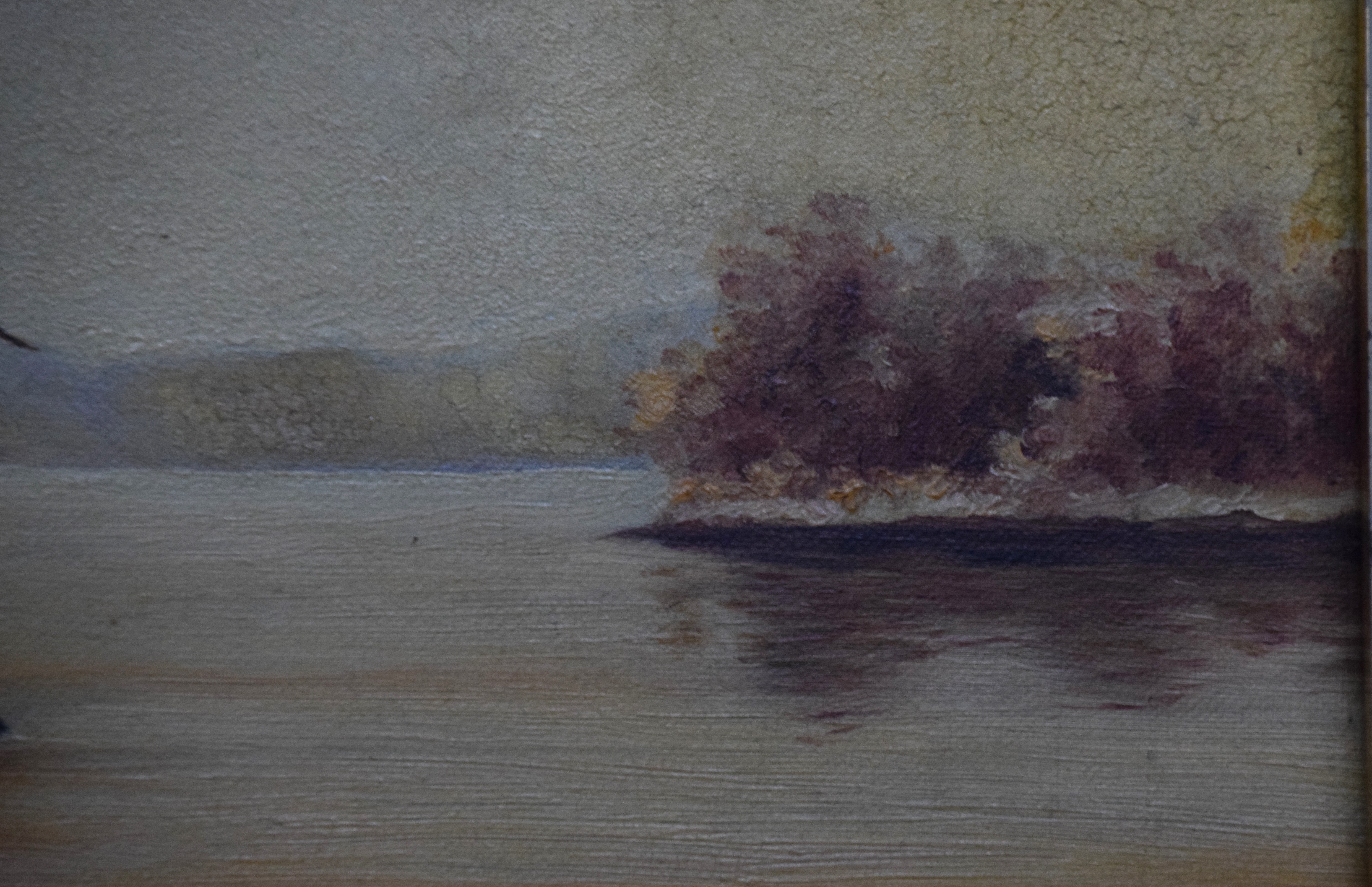 Framed oil on canvas New Hampshire lake scene with cliffs, with trees loosing leaves and a boat in the foreground with an early evening sky. Corner stays marked 1885. Dimensions: 16″ x 22.5″ Image size; 19″ x 25.5″ Overall.