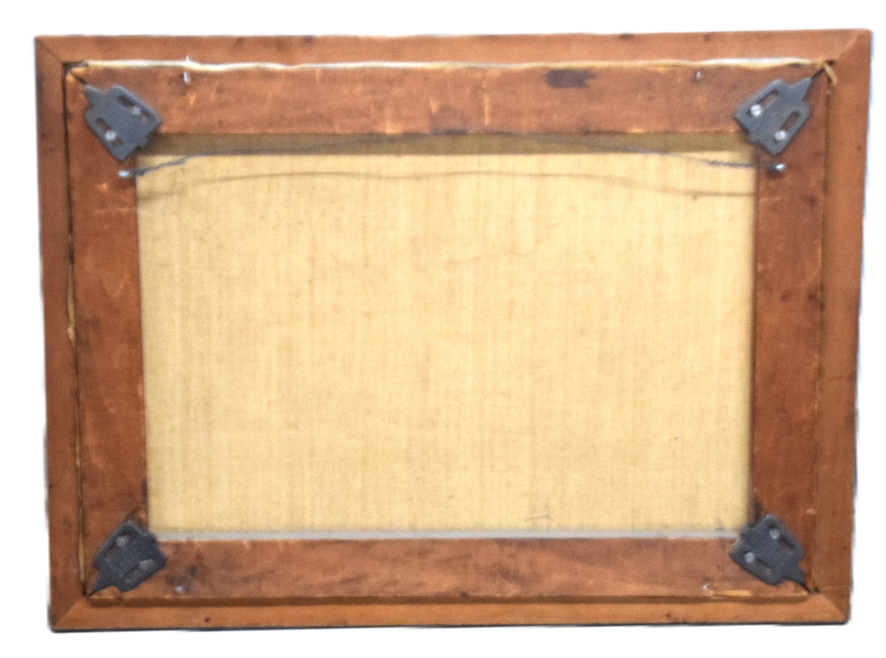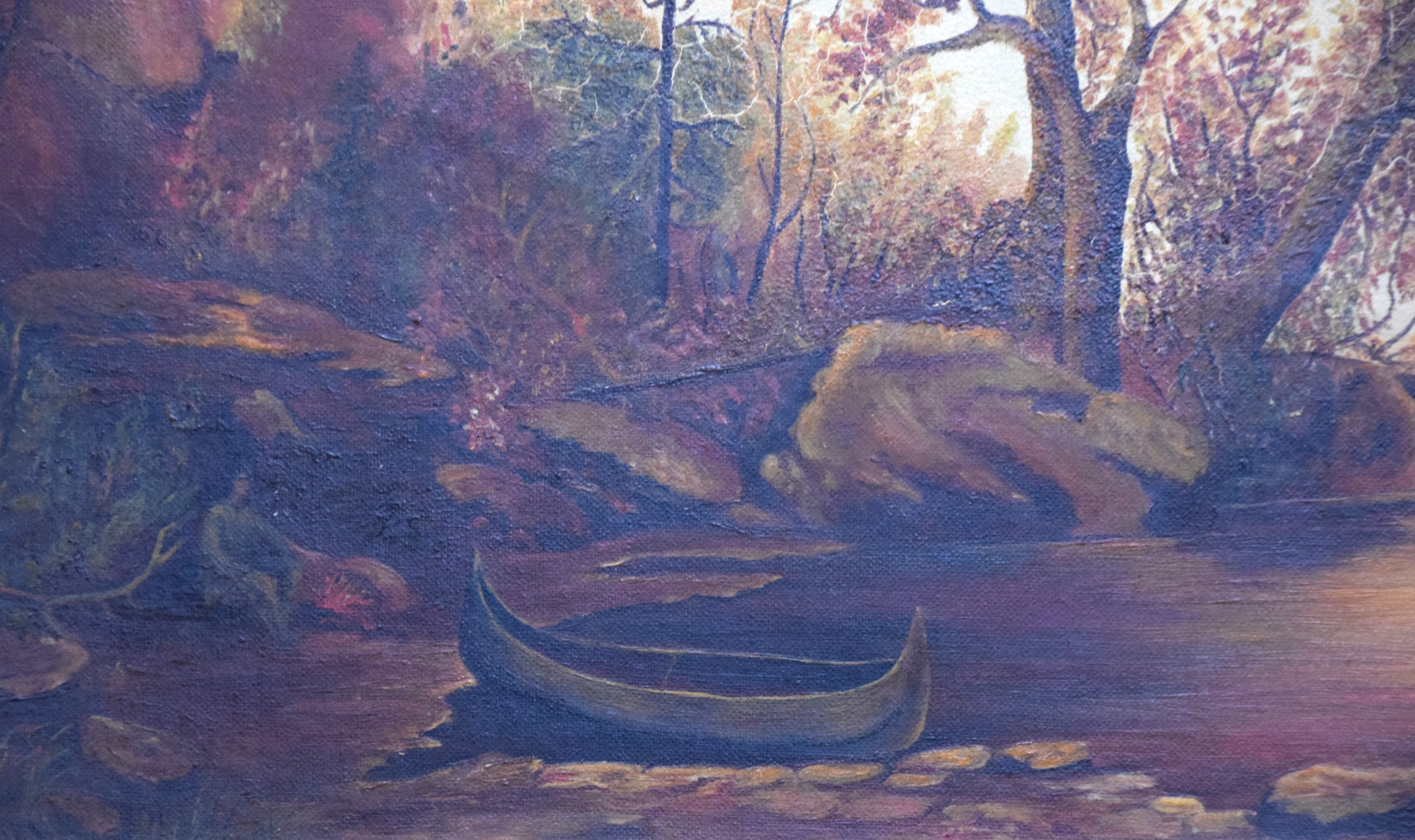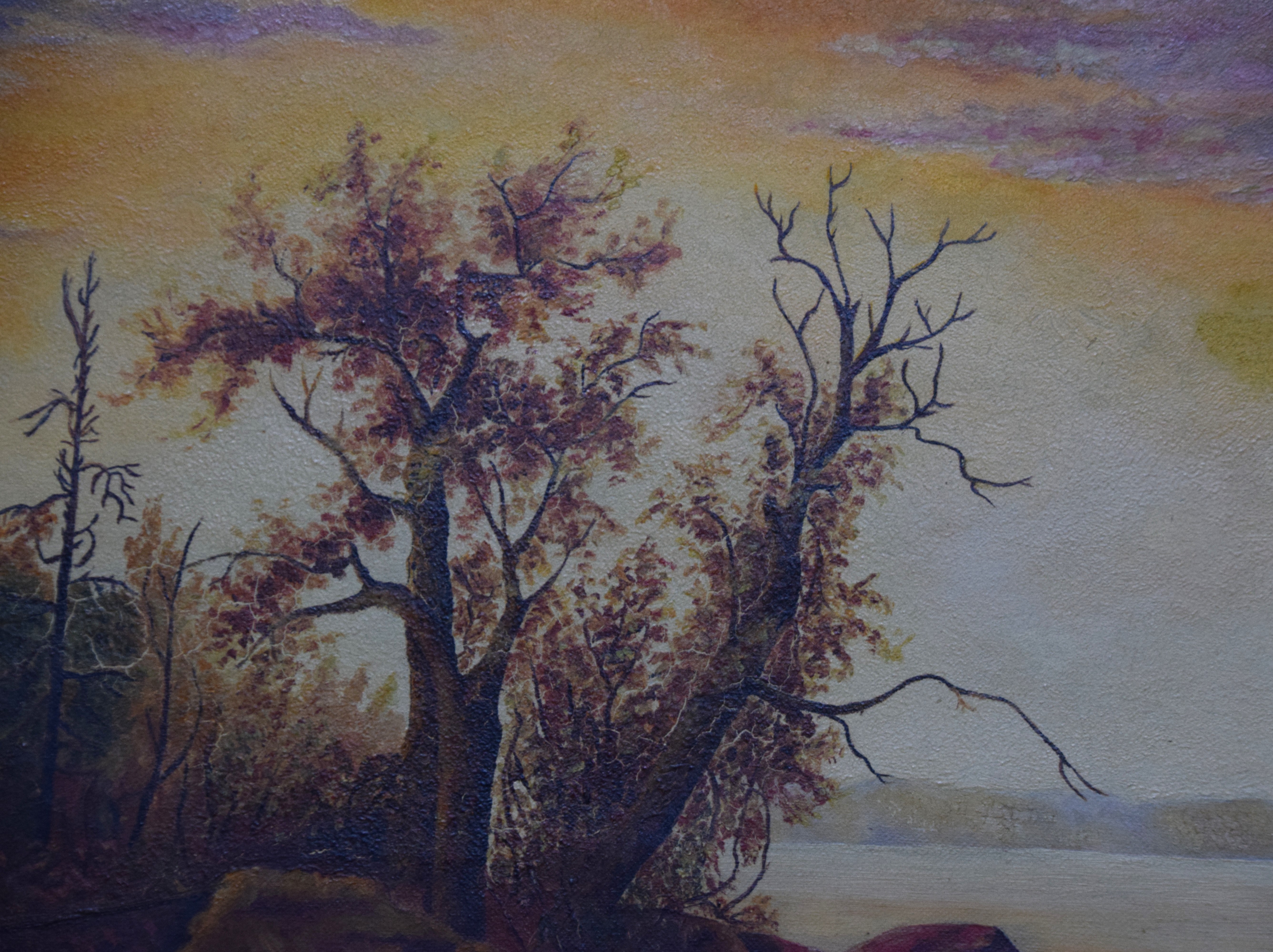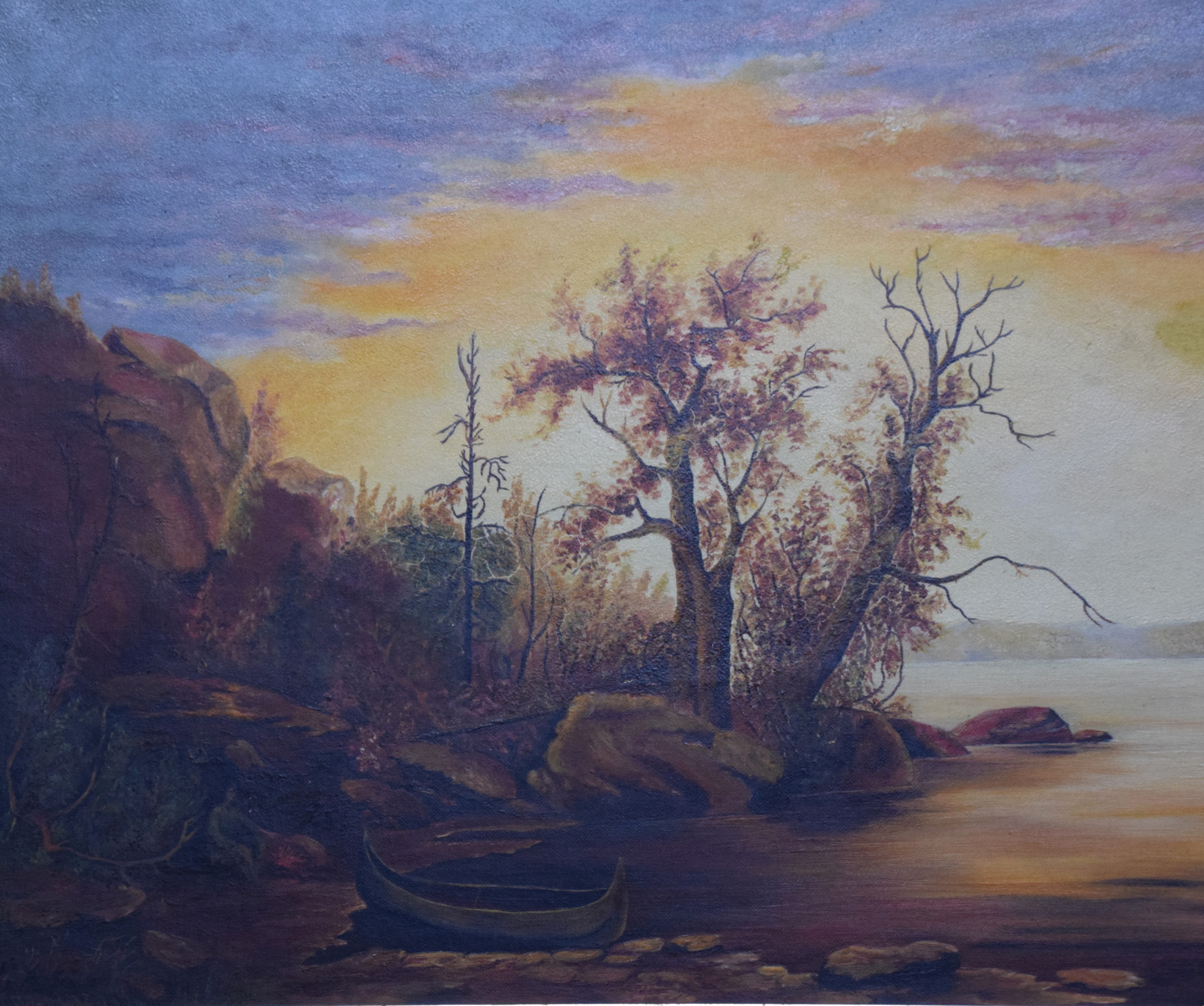 Framed oil on canvas New Hampshire lake scene with cliffs, with trees loosing leaves and a boat in the foreground with an early evening sky. Corner stays marked 1885. Dimensions: 16″ x 22.5″ Image size; 19″ x 25.5″ Overall.