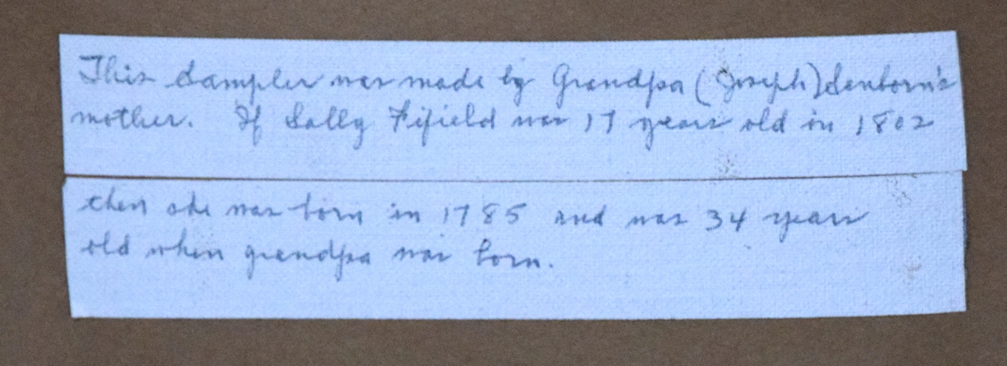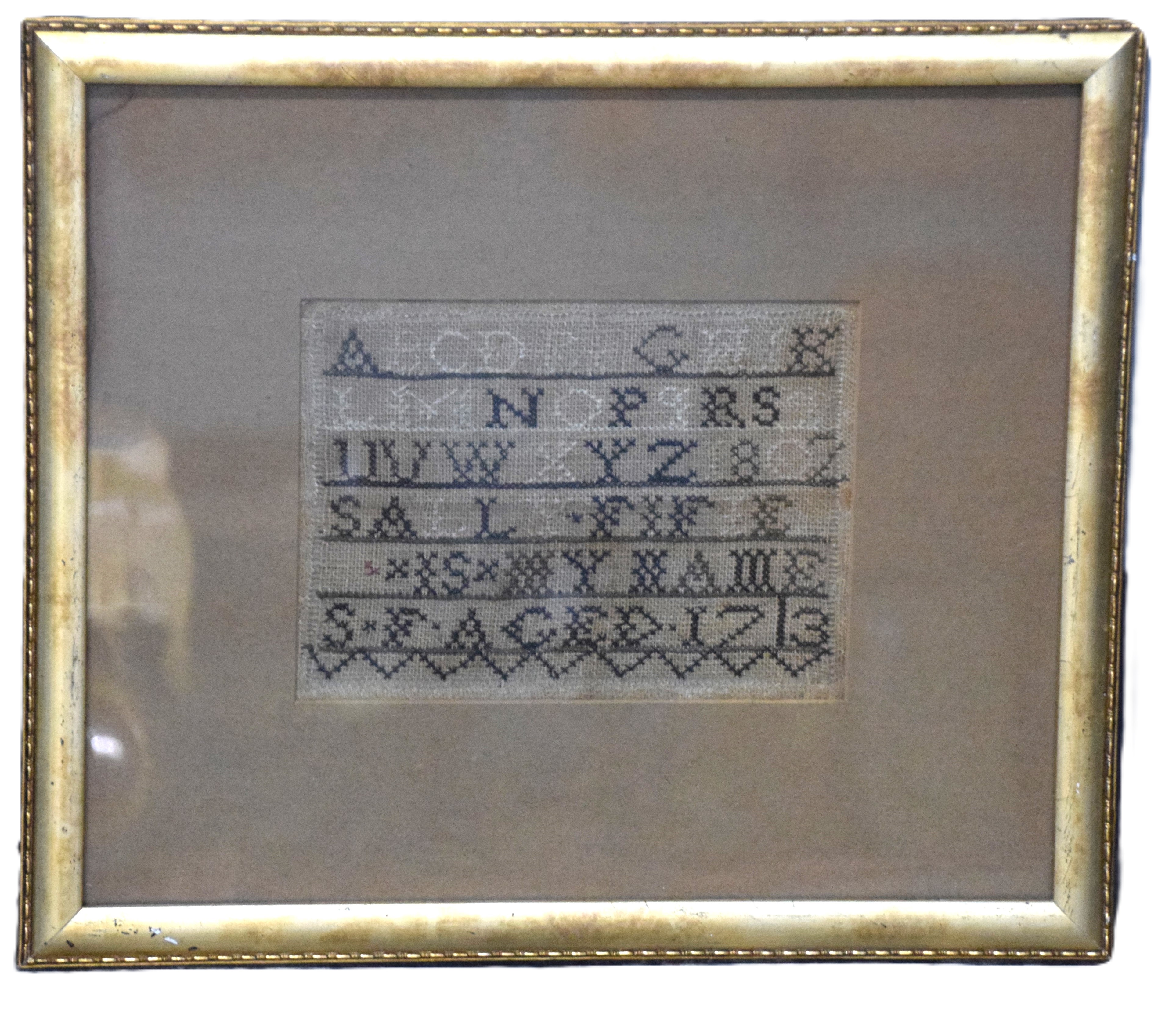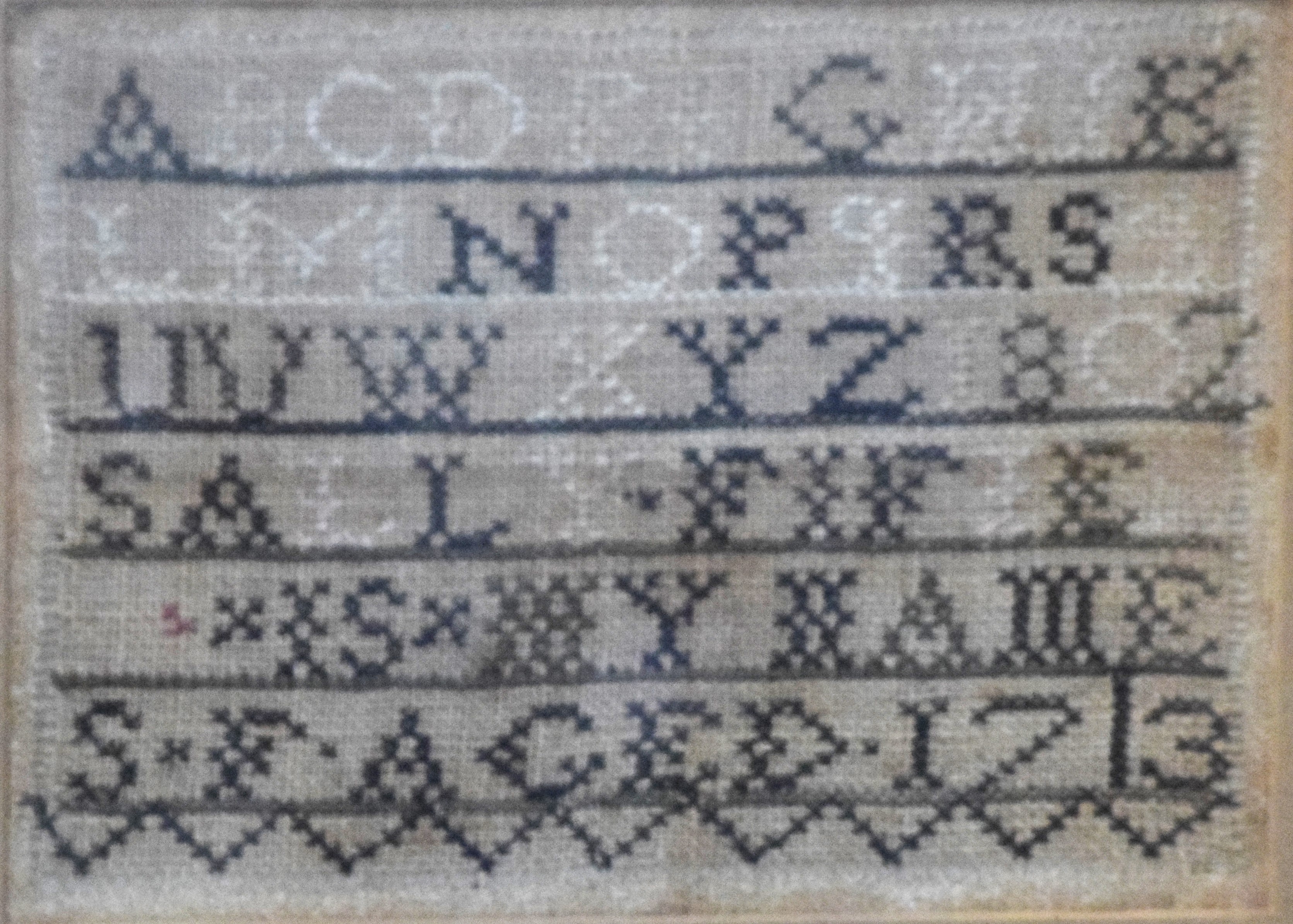 A needlework hand crafted sampler with the ABCs and 123s. History on back, 18th Century. Dimensions: 5.5″ x 7.25″ Image size