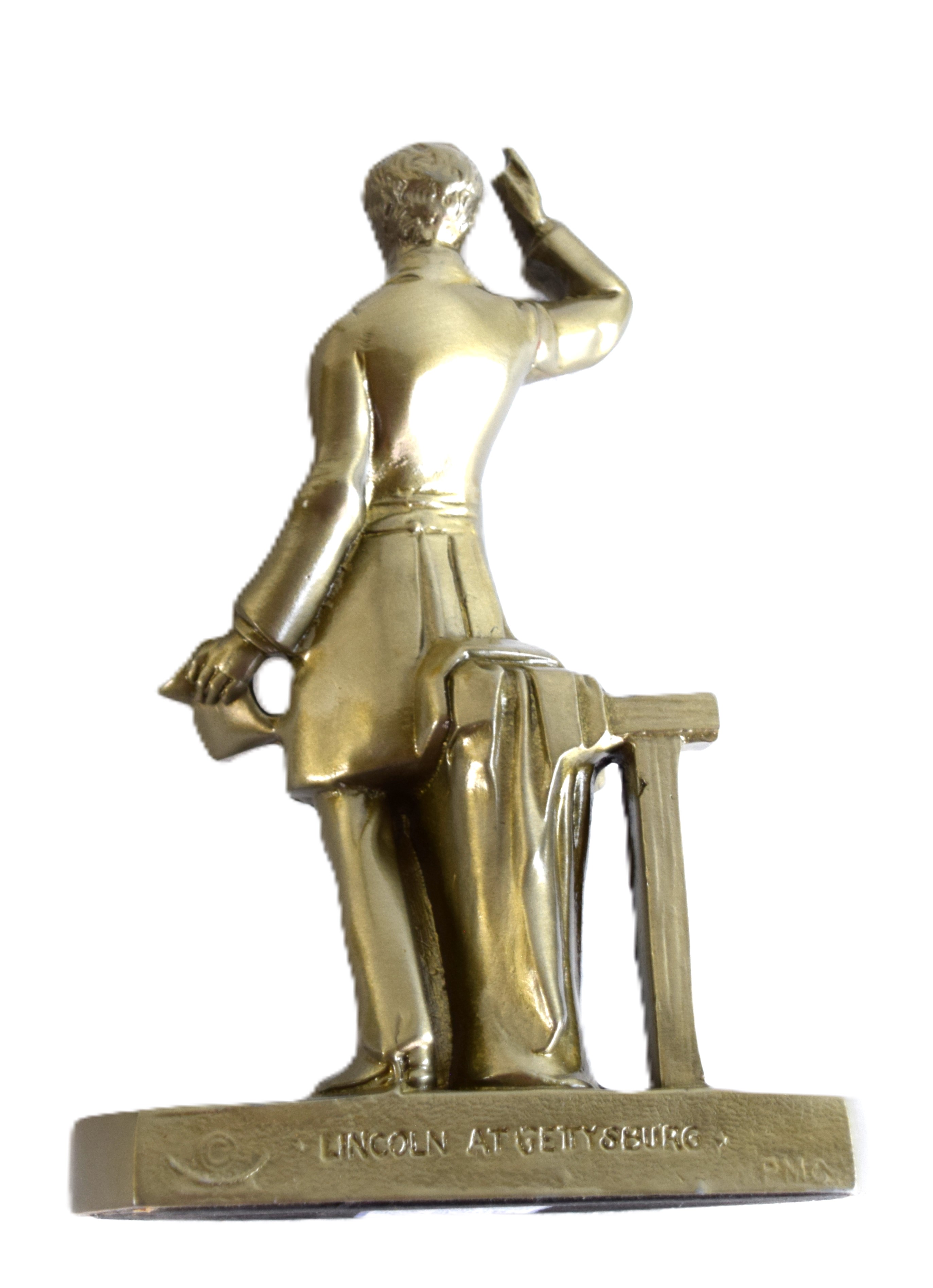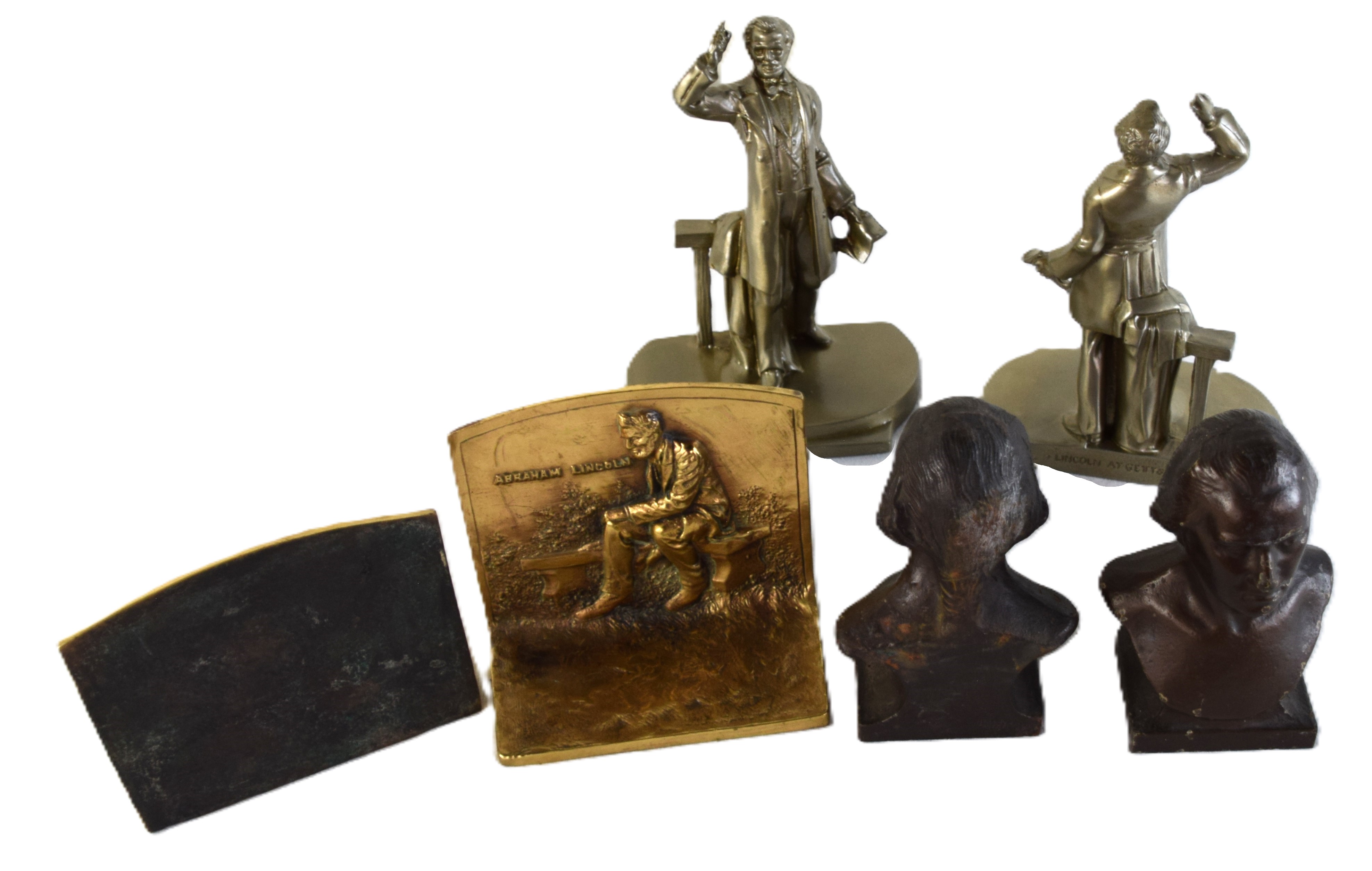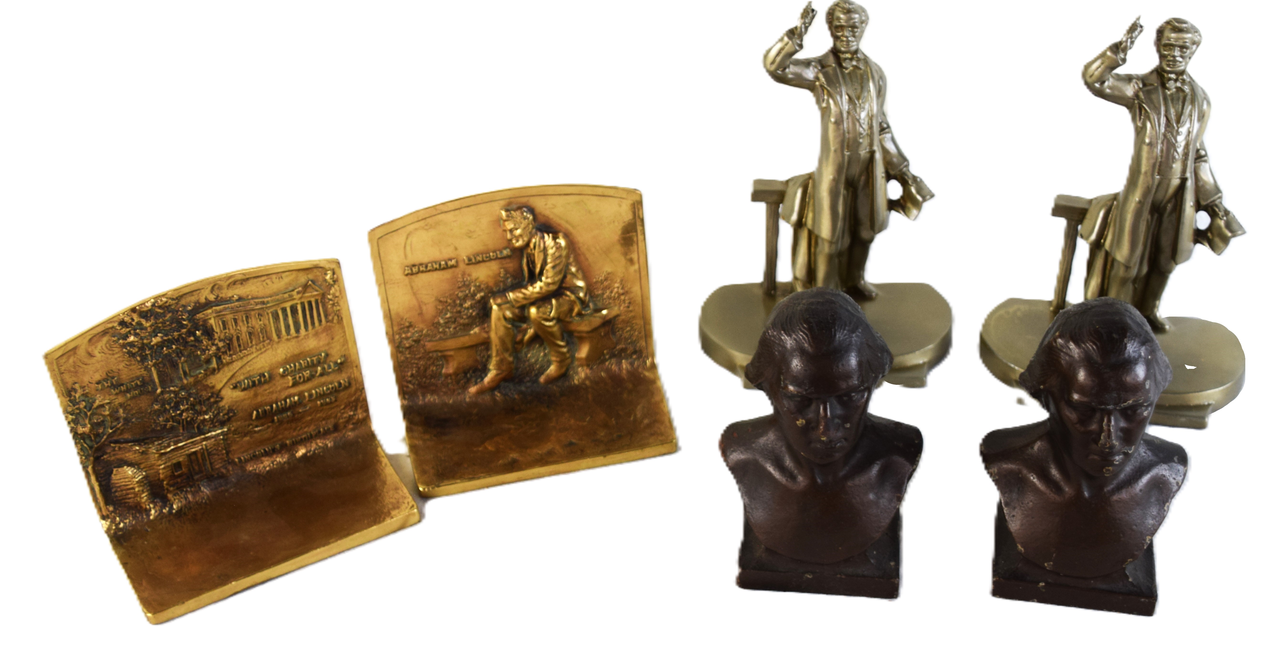 Three pair of Presidential bookends including an iron pair of George Washington (6.5″H); Pair of bronze bookends “Lincoln At Gettysburg” signed on back PMG (8″H); Pair of Lincoln bookends “Abraham Lincoln” “With Charity For All” (8″ H)