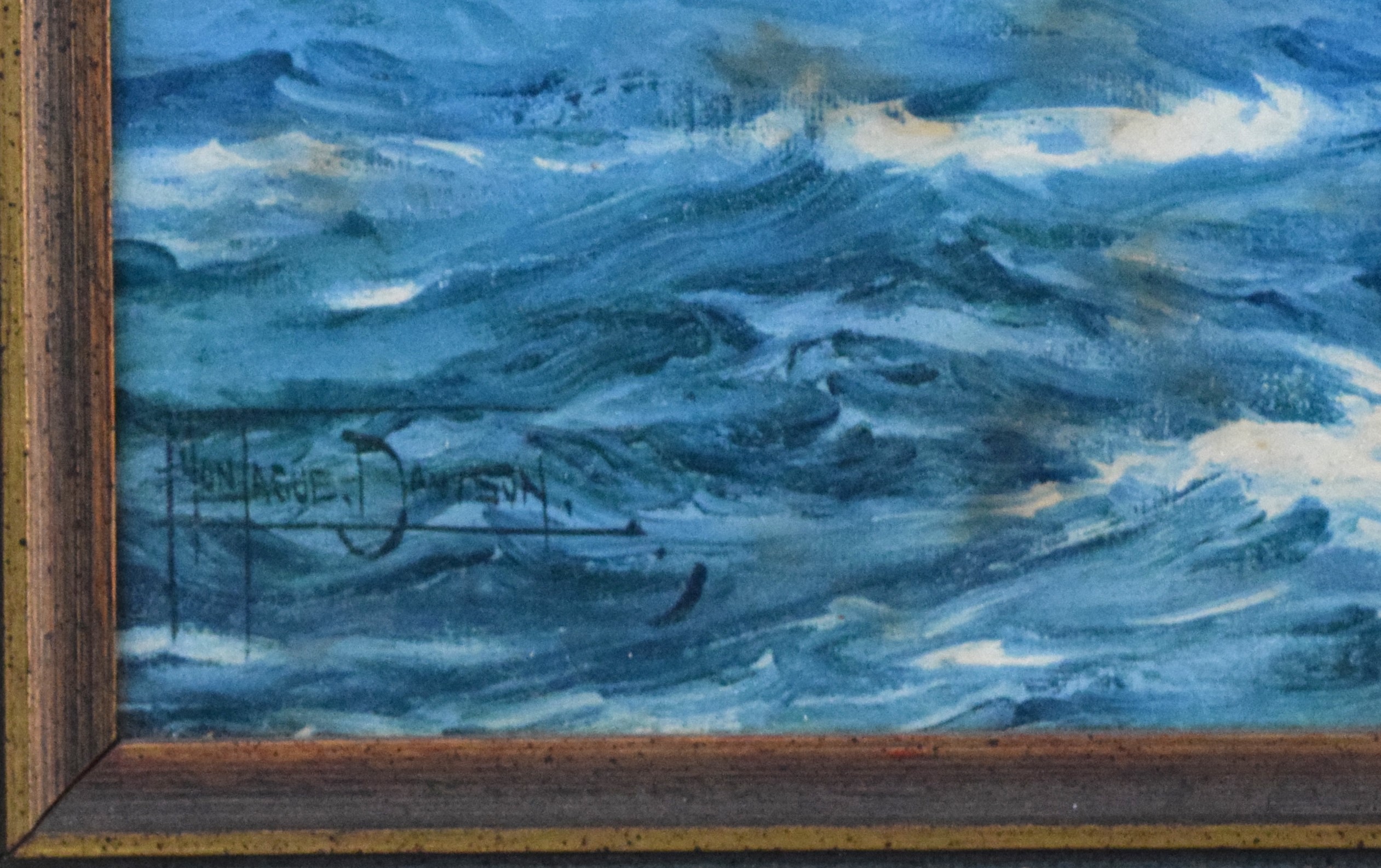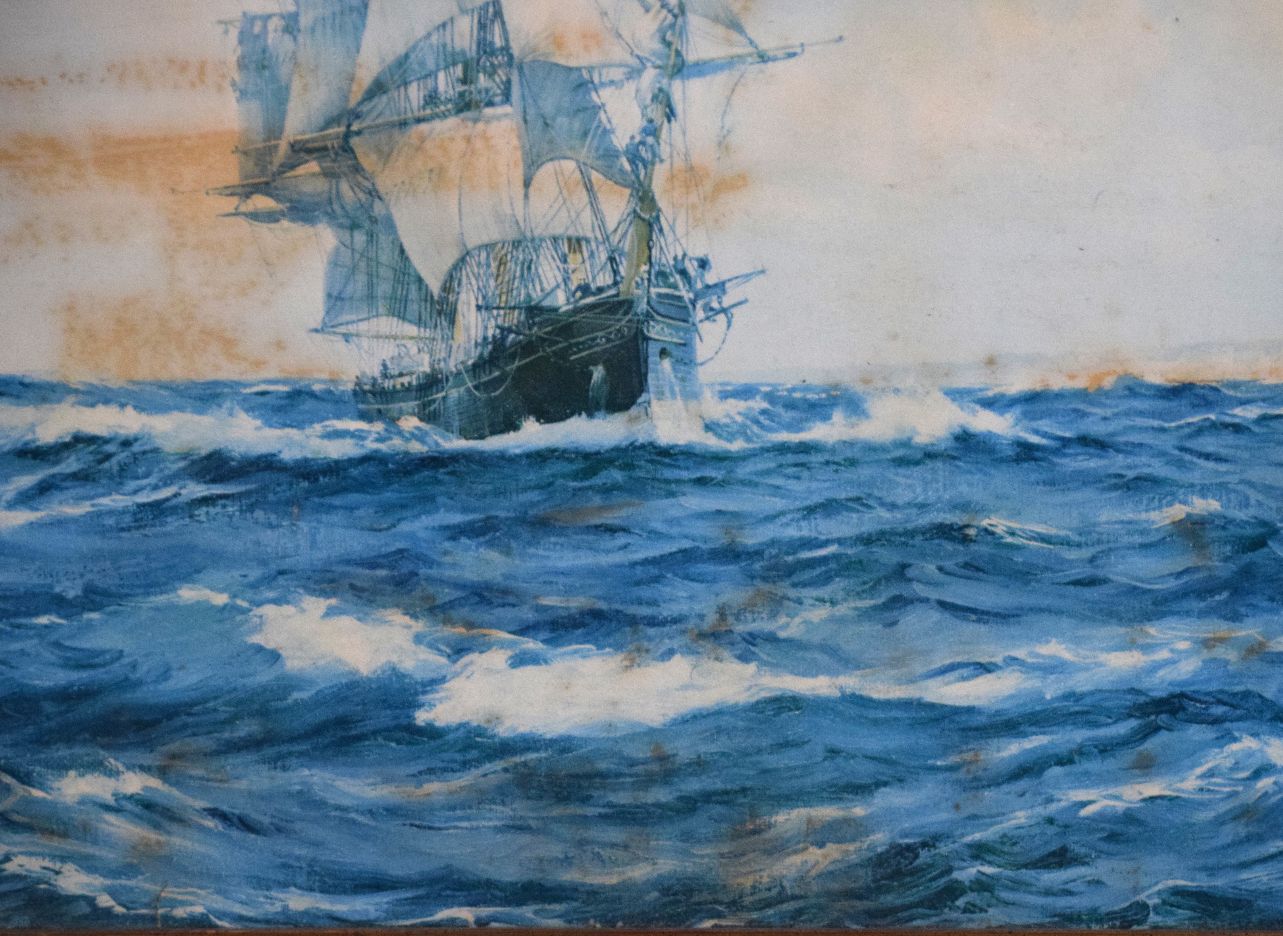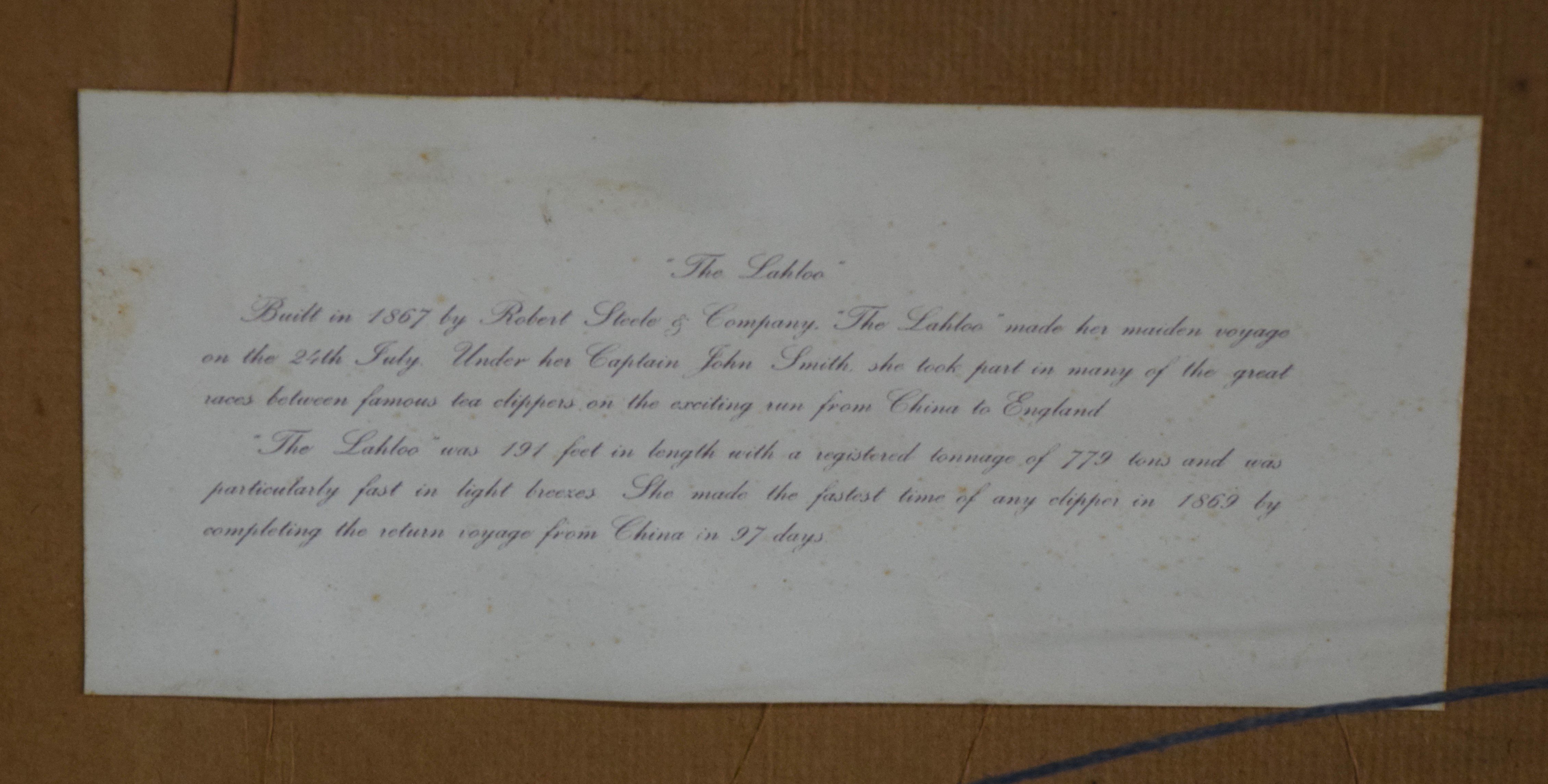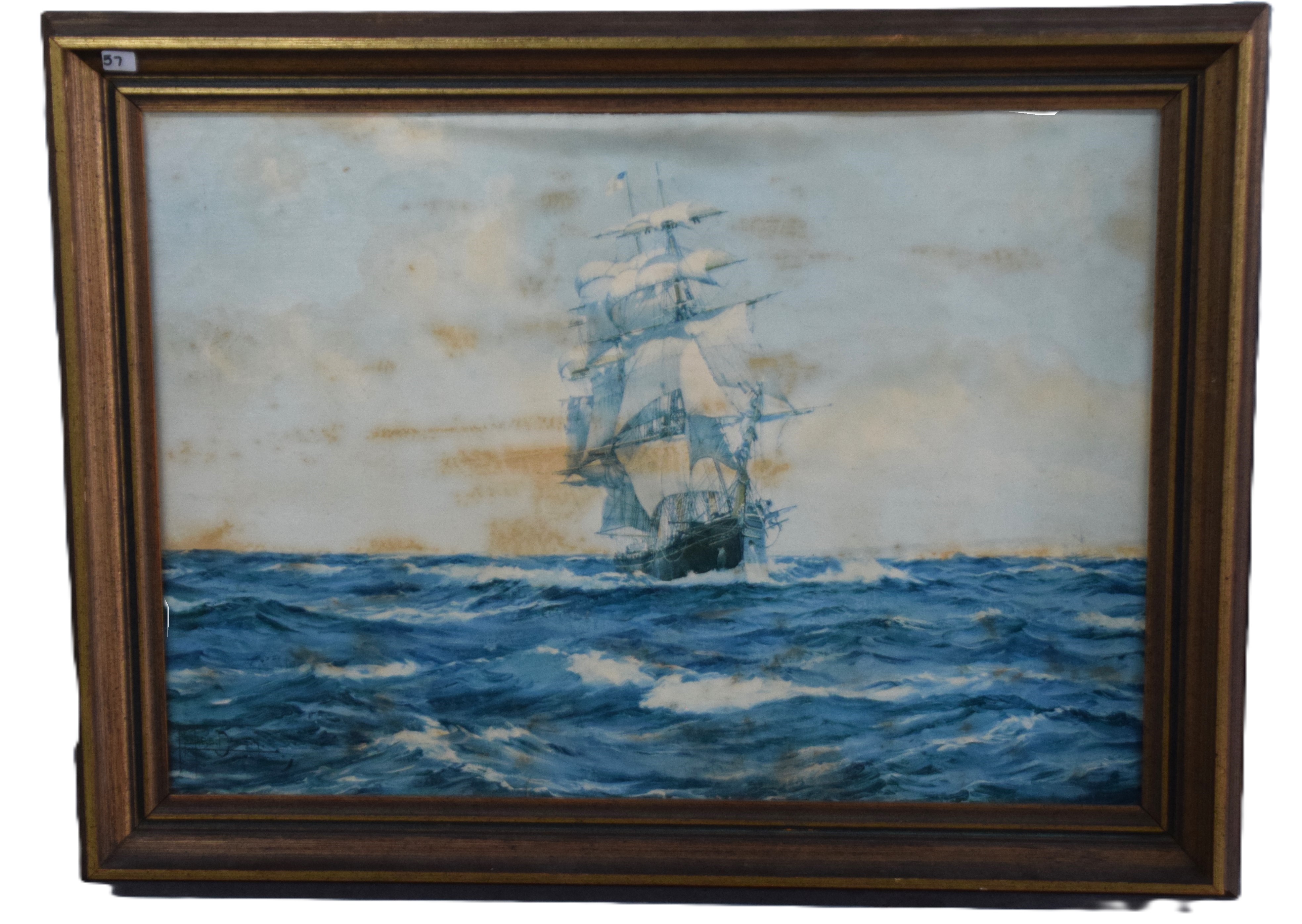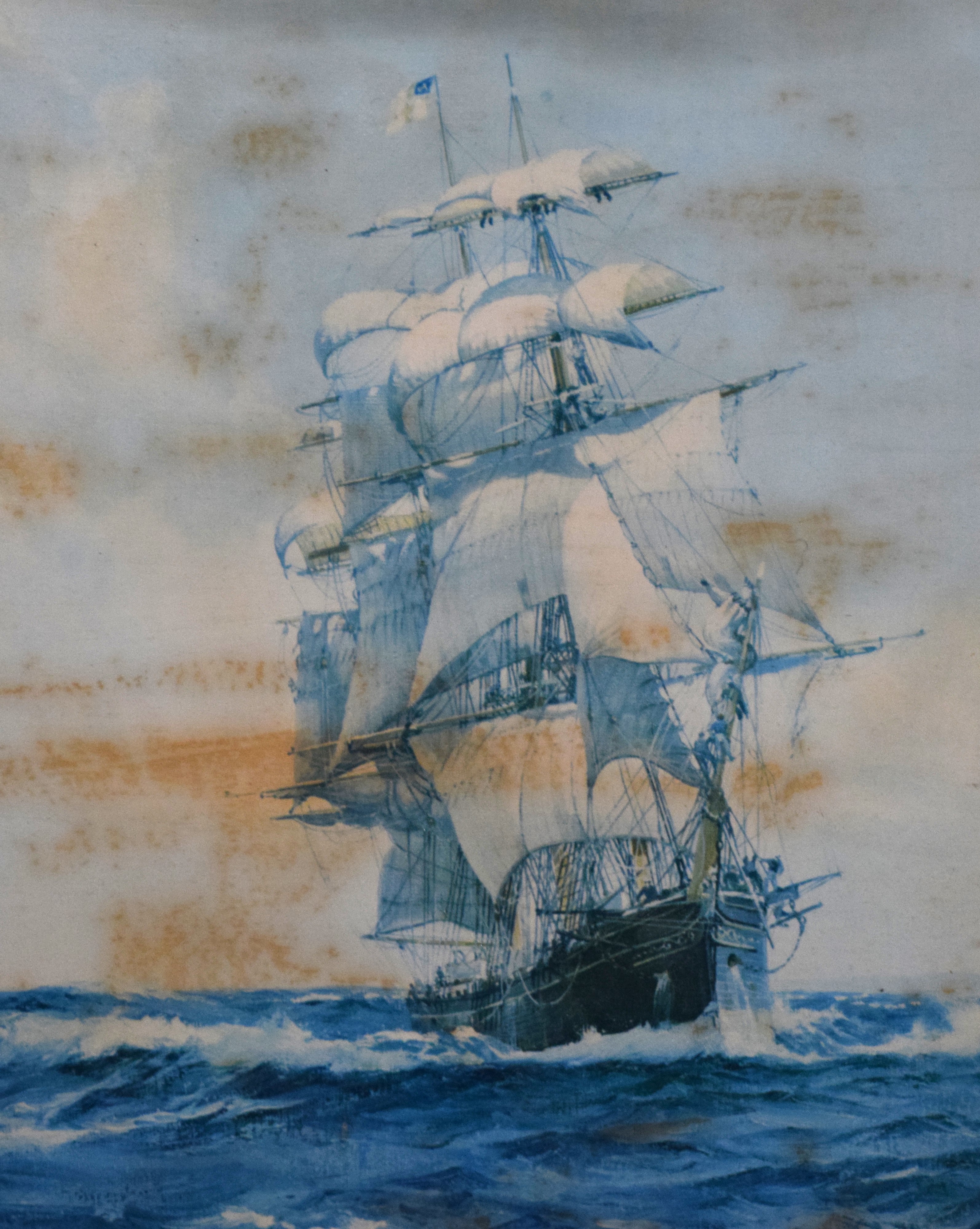 Oil painting on paper laid on board of the clipper ship “The Lahloo”, a ship in 1869 travelled from China to England in a record 97 days. Sea painter, Montague Dawson (1890-1973) was born in Chiswick, England and is known for sailing ships and ocean view painting. He was among the leading marine painters of his day, with Queen Elizabeth along with American Presidents collecting his work. This work has brush marks and varnish stains but there is a possibility of being an oil painting on a paper print. Dimensions: 20″ x 28″ Image size, 25″ x 33″ Overall