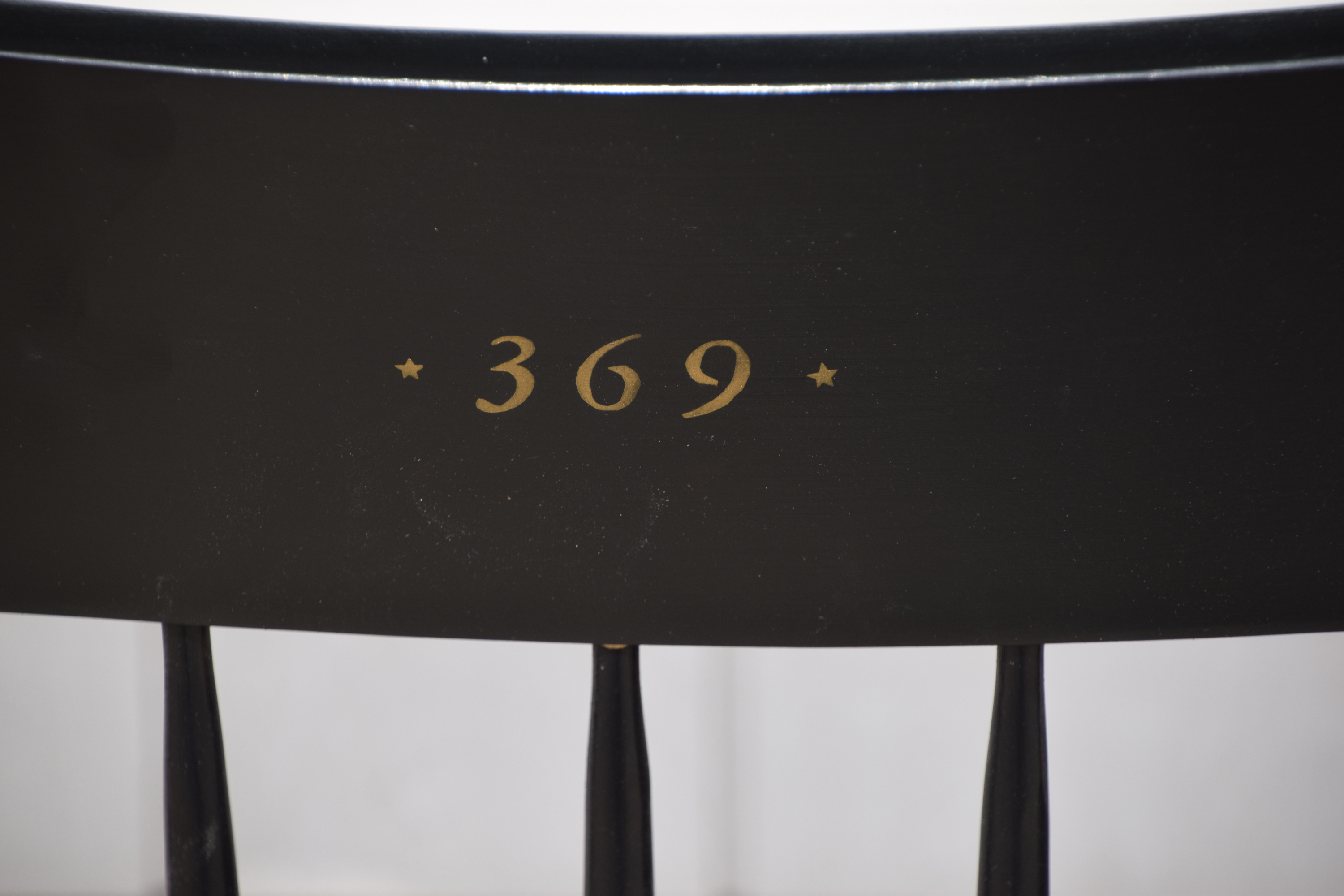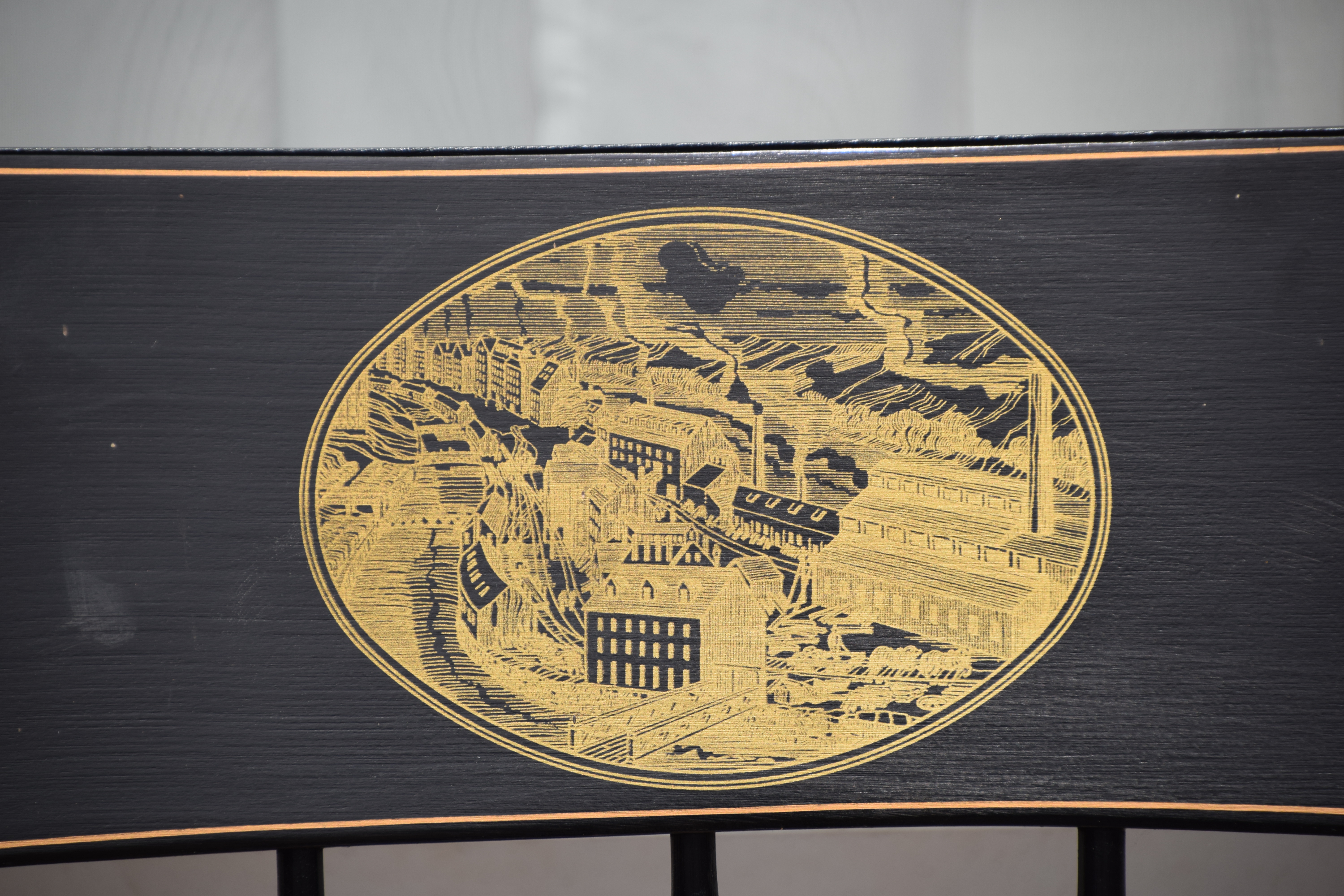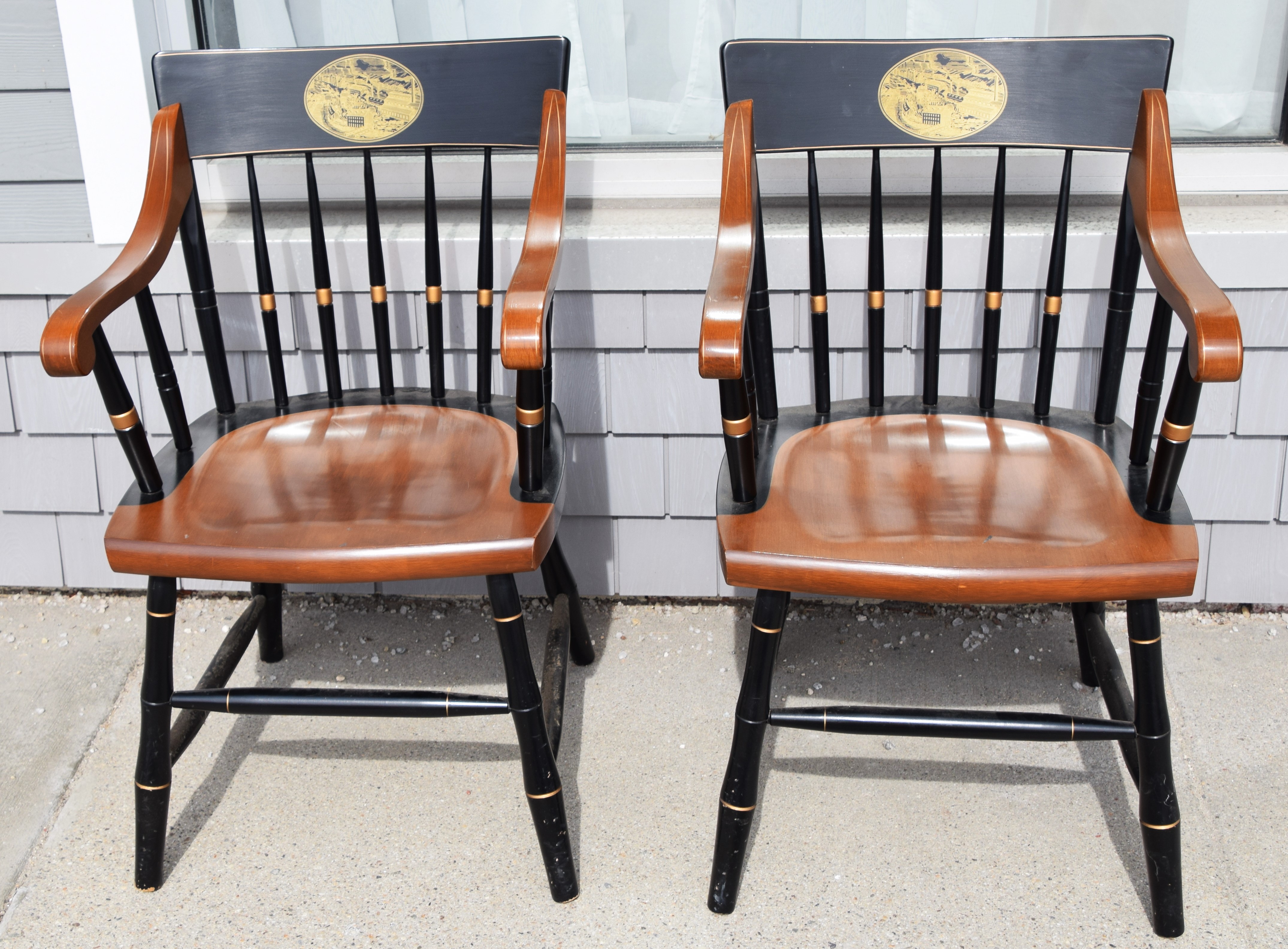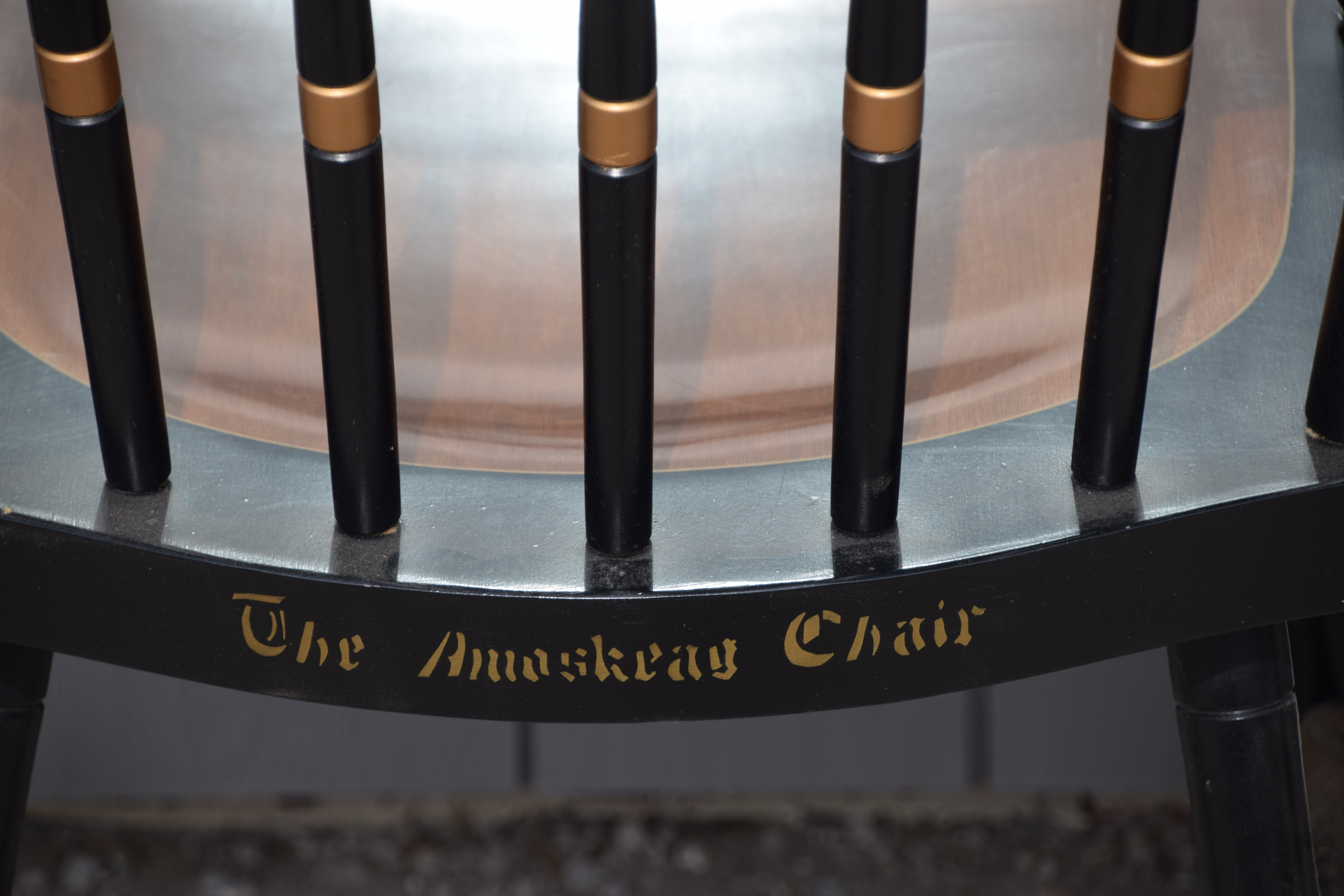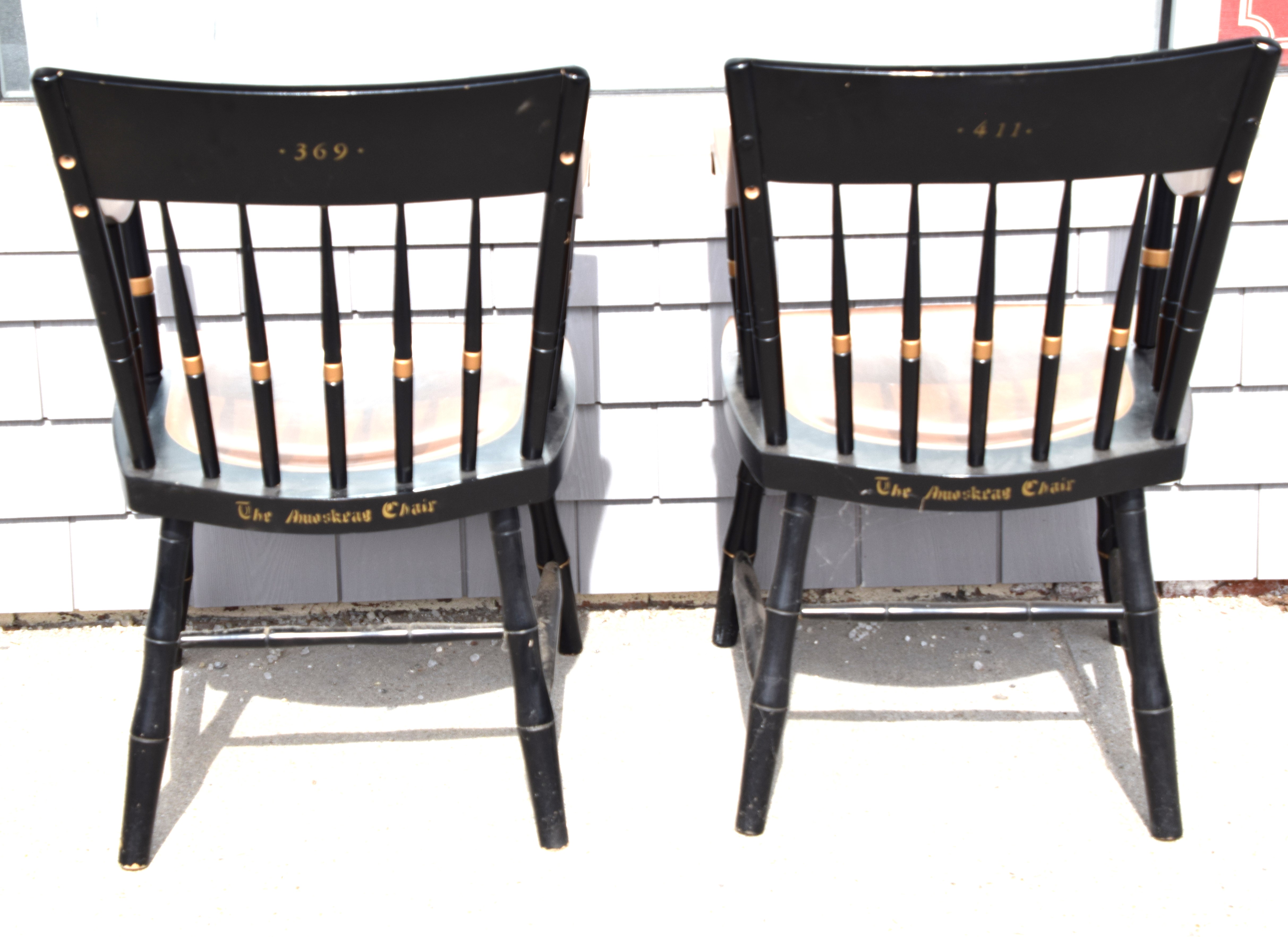 Pair of hardwood armchairs, college style, titled “The Amoskeag Chair” with numbers 369 and 411. Manchester Amoskeag mills pictured in an oval design on the chair’s crest. Dimensions: 18″ Seat H; 34″ Overall