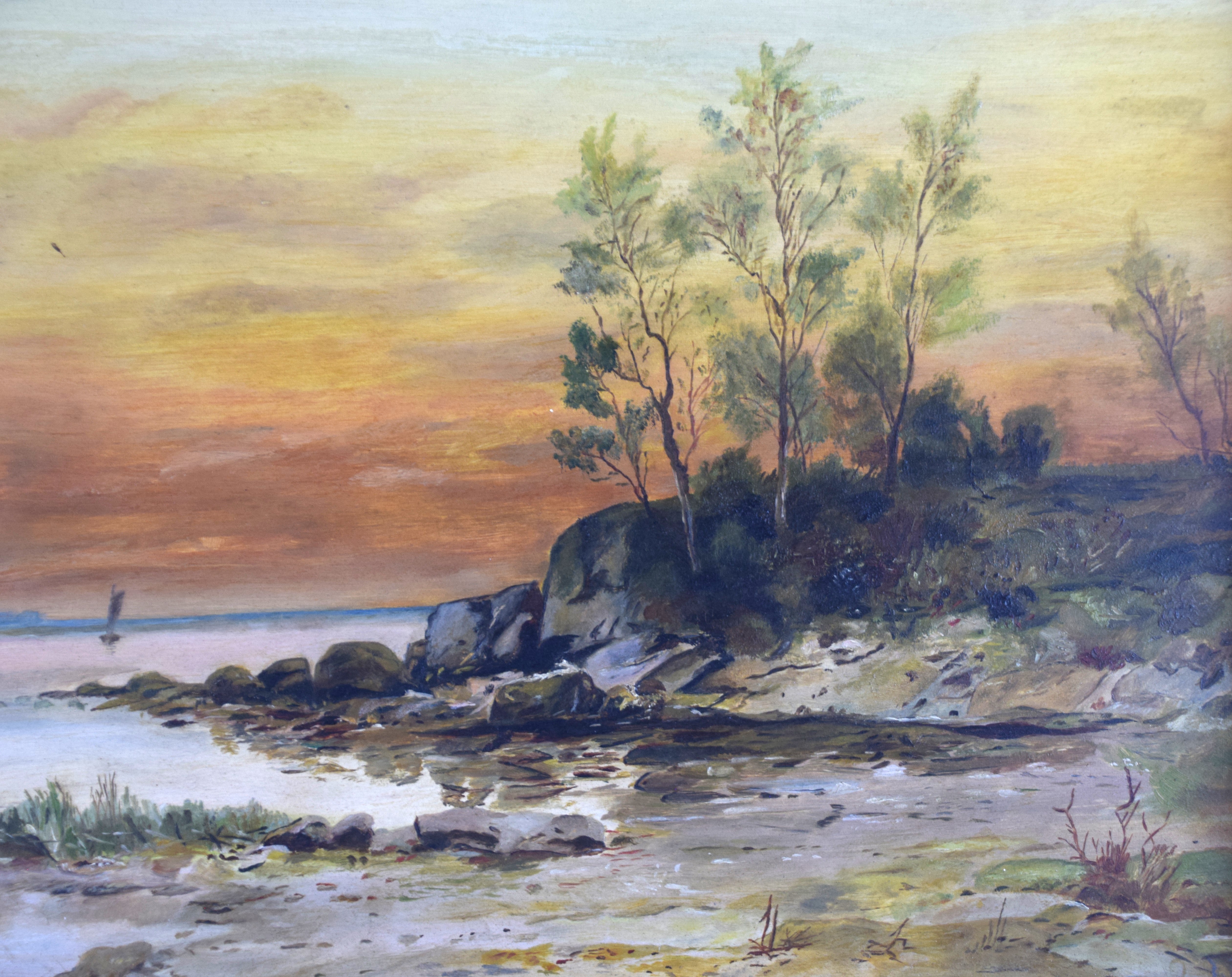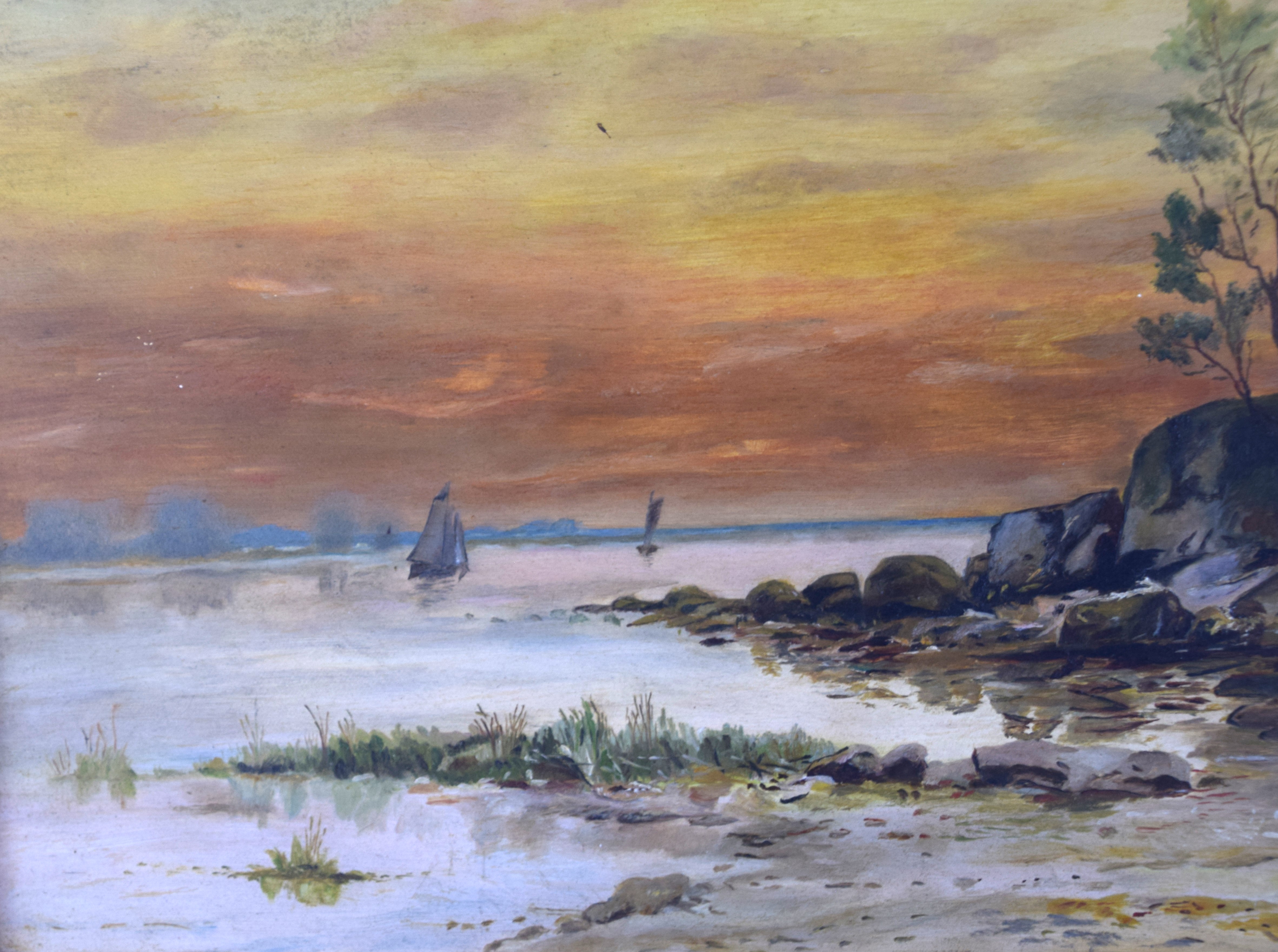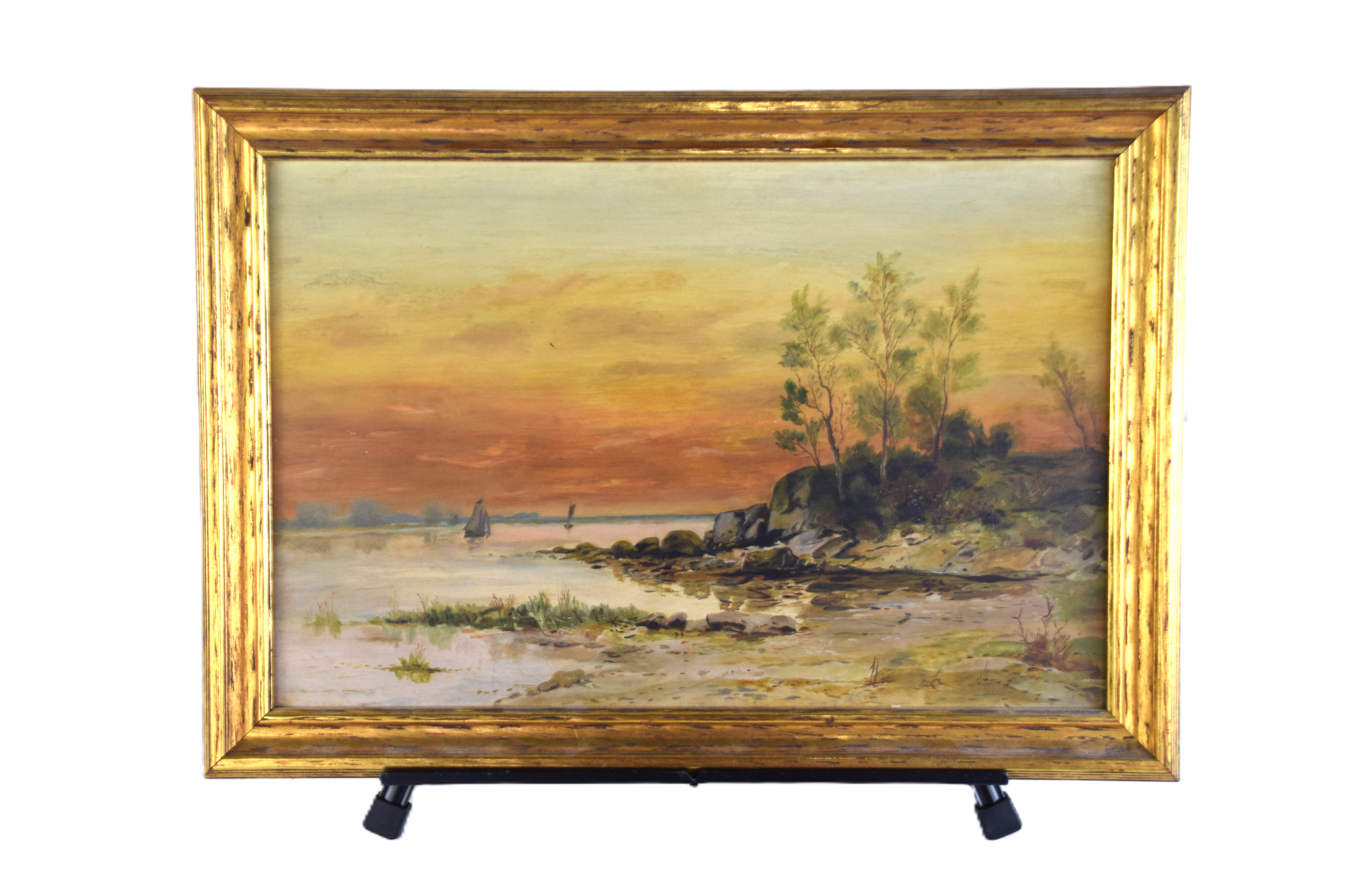 Framed oil painting on board of a seascape with sailboats, rocks along the shore and trees. Labeled on back with the artist name-Laura Sanborn Kempton. Dimensions:12″ x 18″ Image size