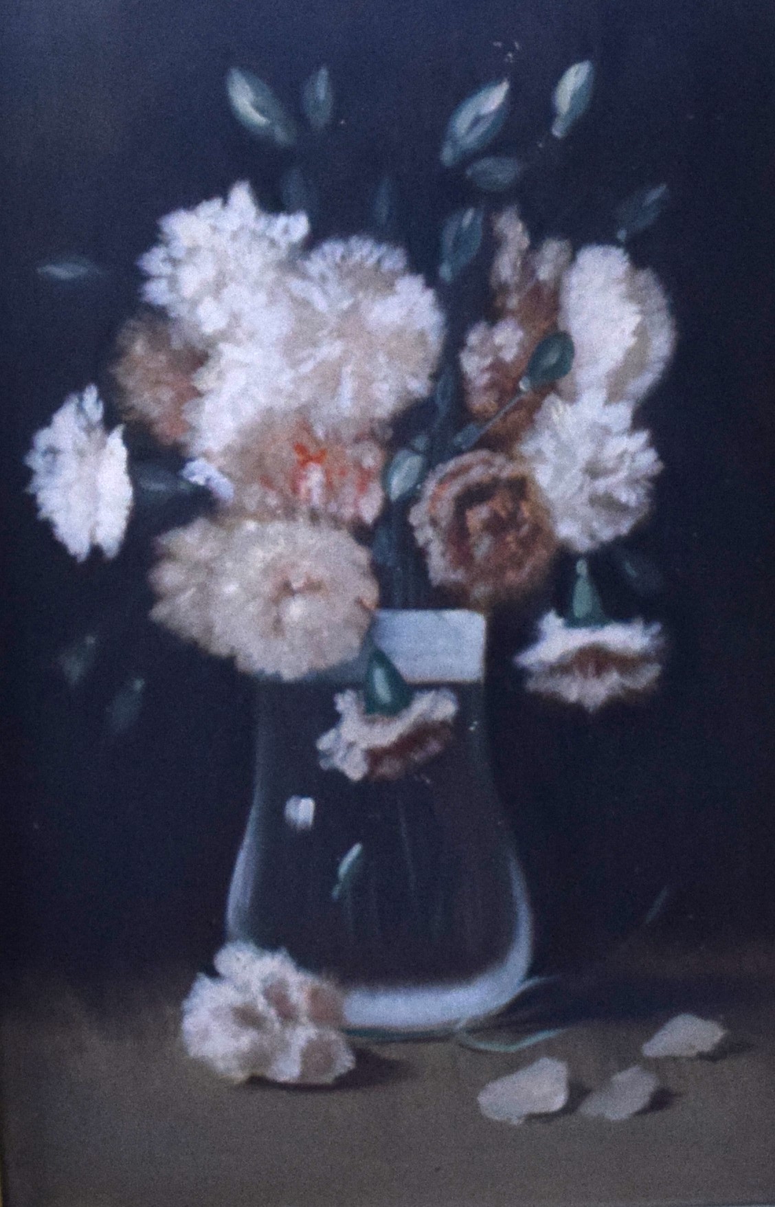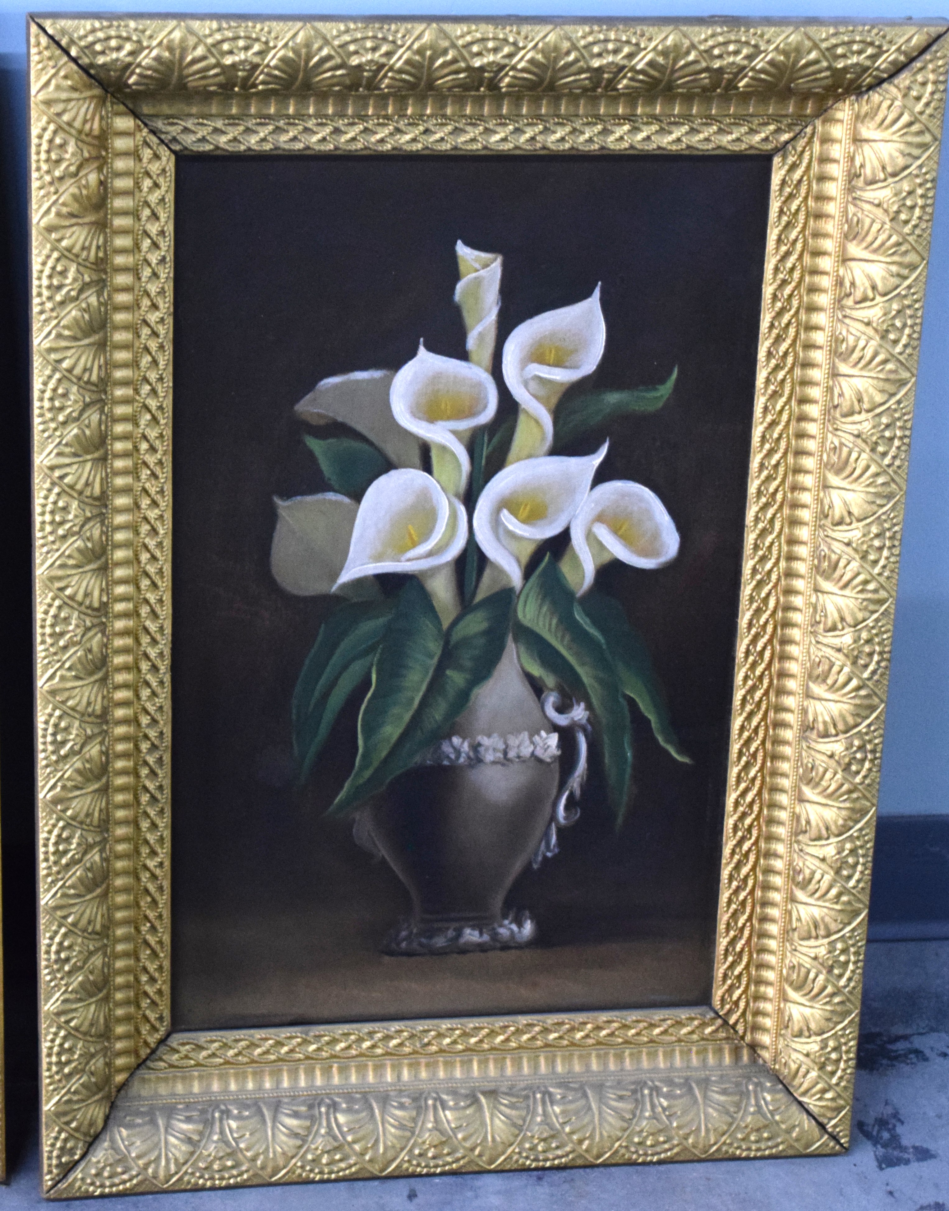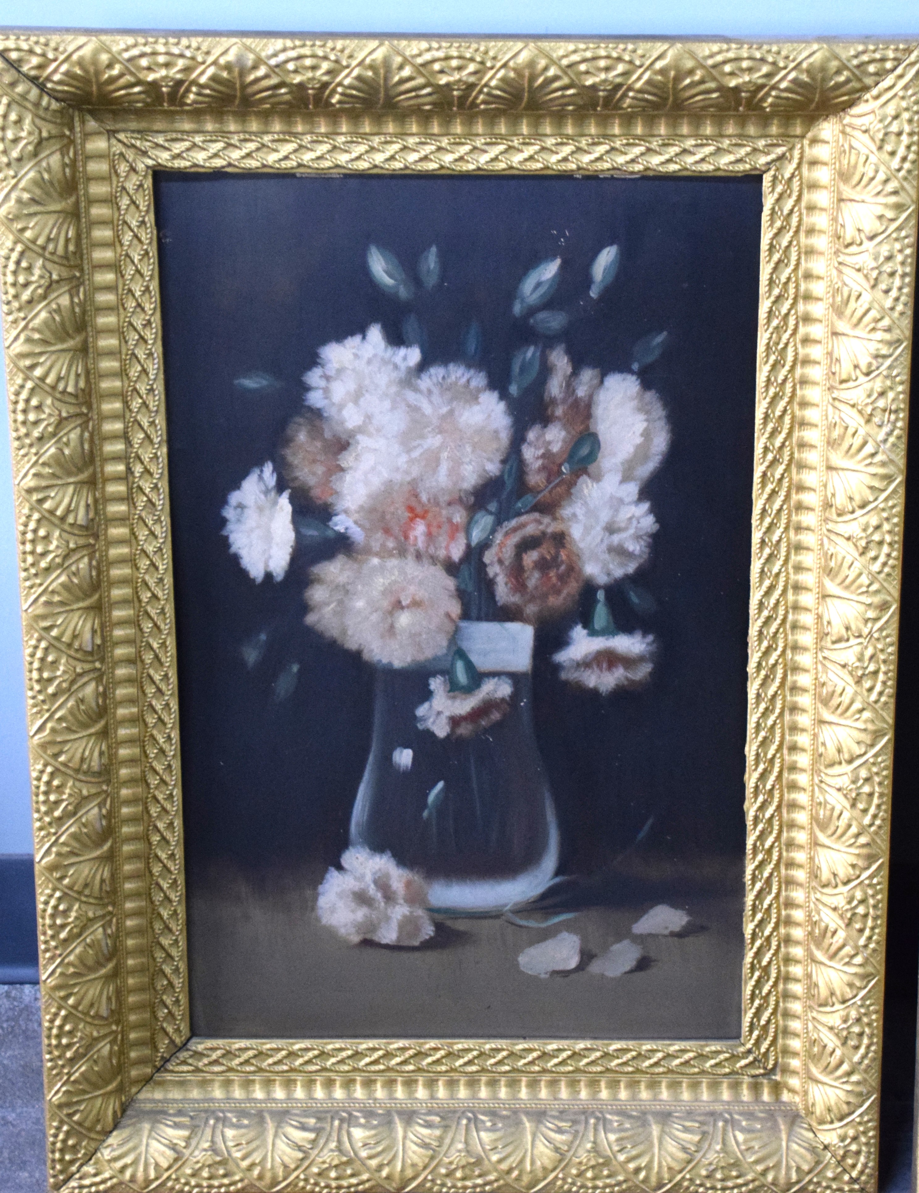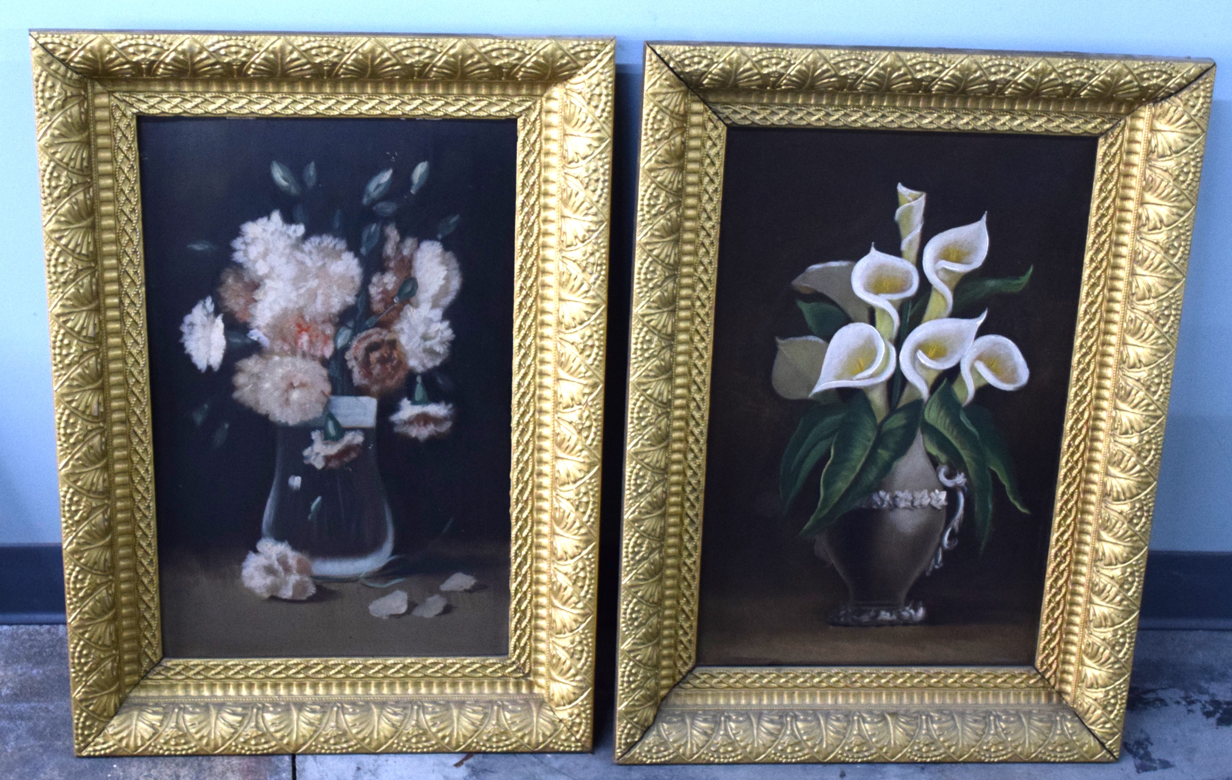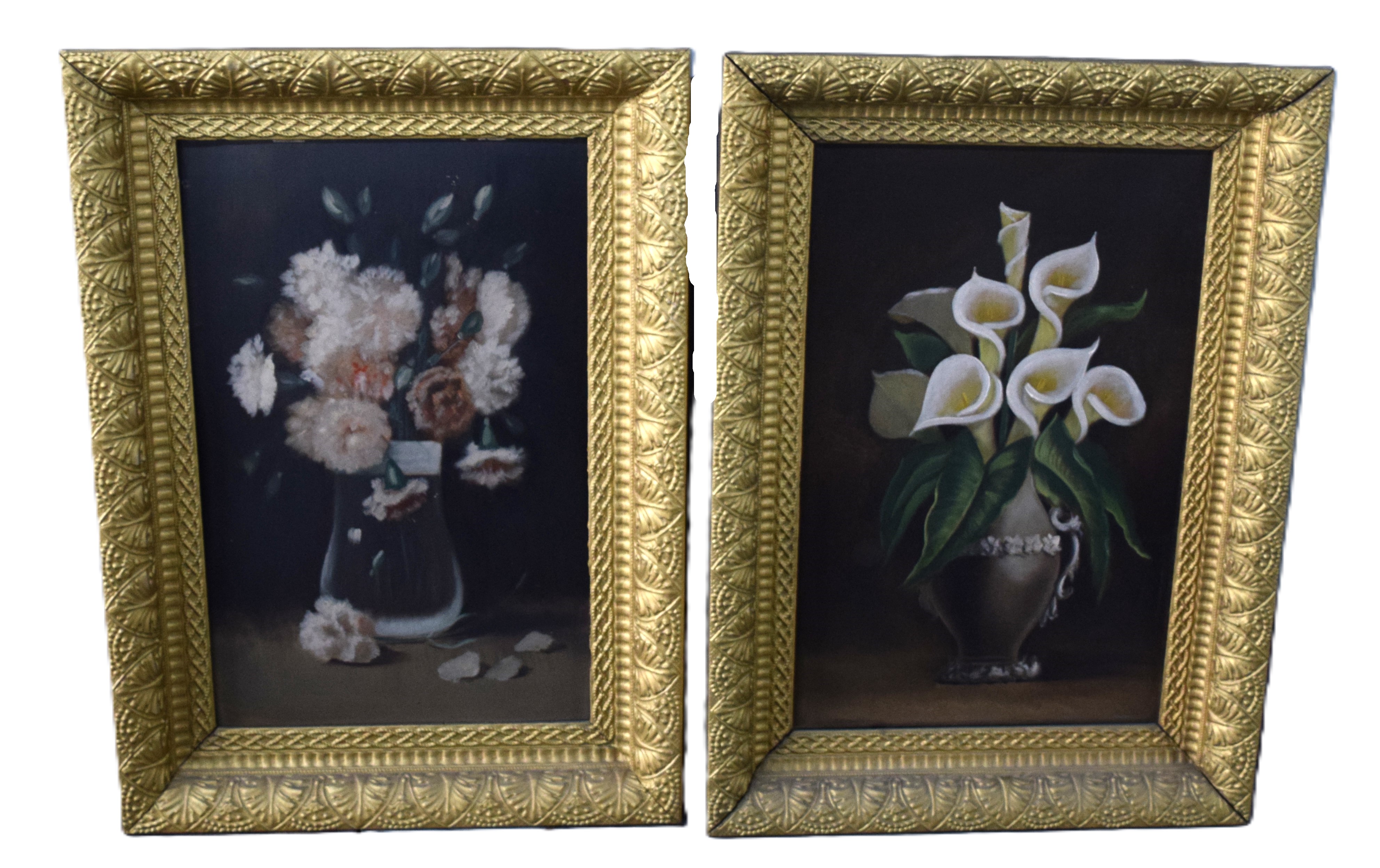 Two framed 19th Century oil still life oil paintings on tin, both with flowers in vases. Dimensions: 29.5″ x 20″ Overall