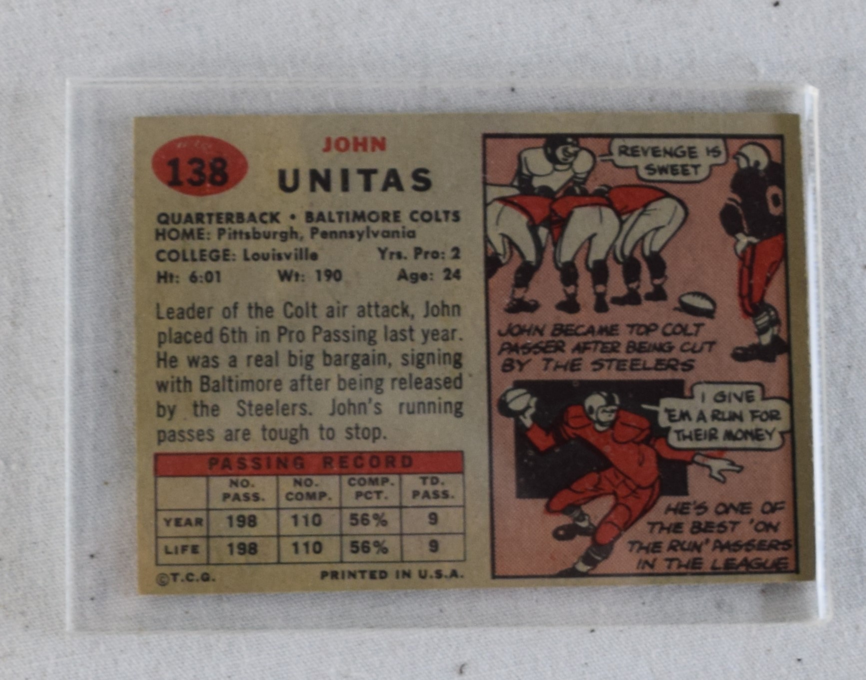 Rare 1957 Johnny Unitas football card, Topps # 138, encased but ungraded