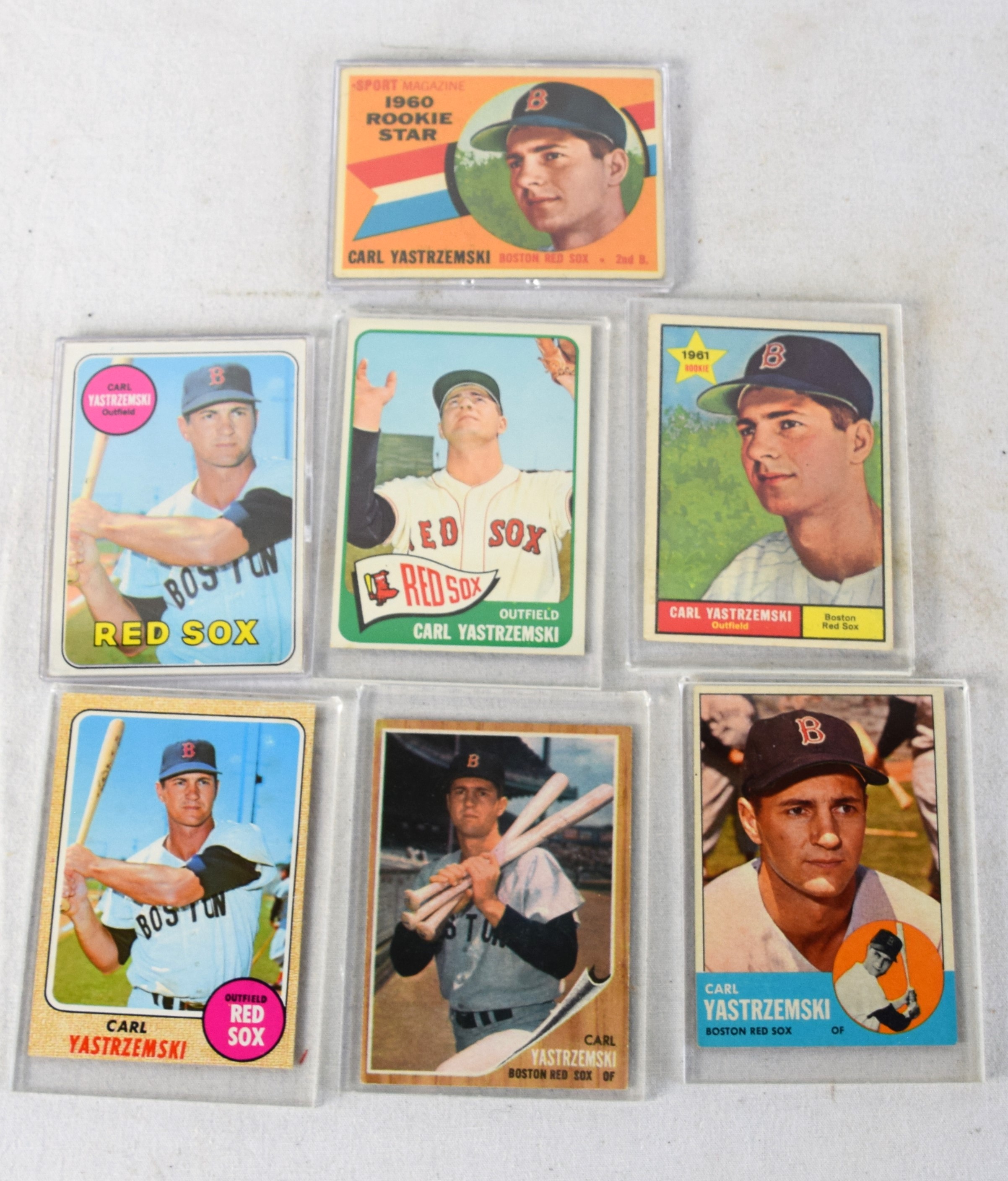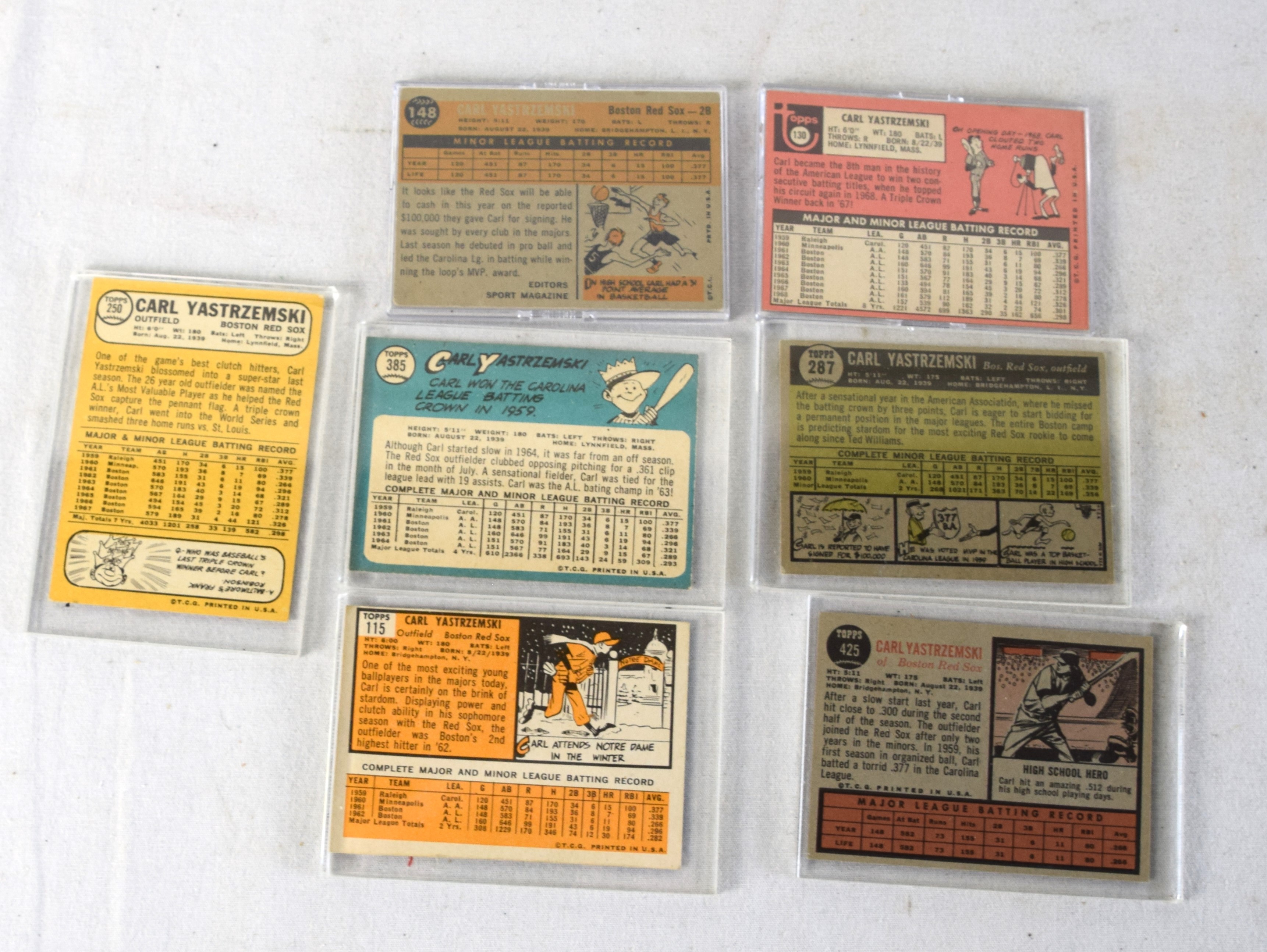 A seven card lot of Carl Yastrzemski, all encased to include his 1960 Rookie card, Topps #148, 1961 Topps # 287, 1962 Topps #425, 1963 Topps # 115, 1965 Topps # 385, 1968 Topps #250 and a 1969 Topps #130
