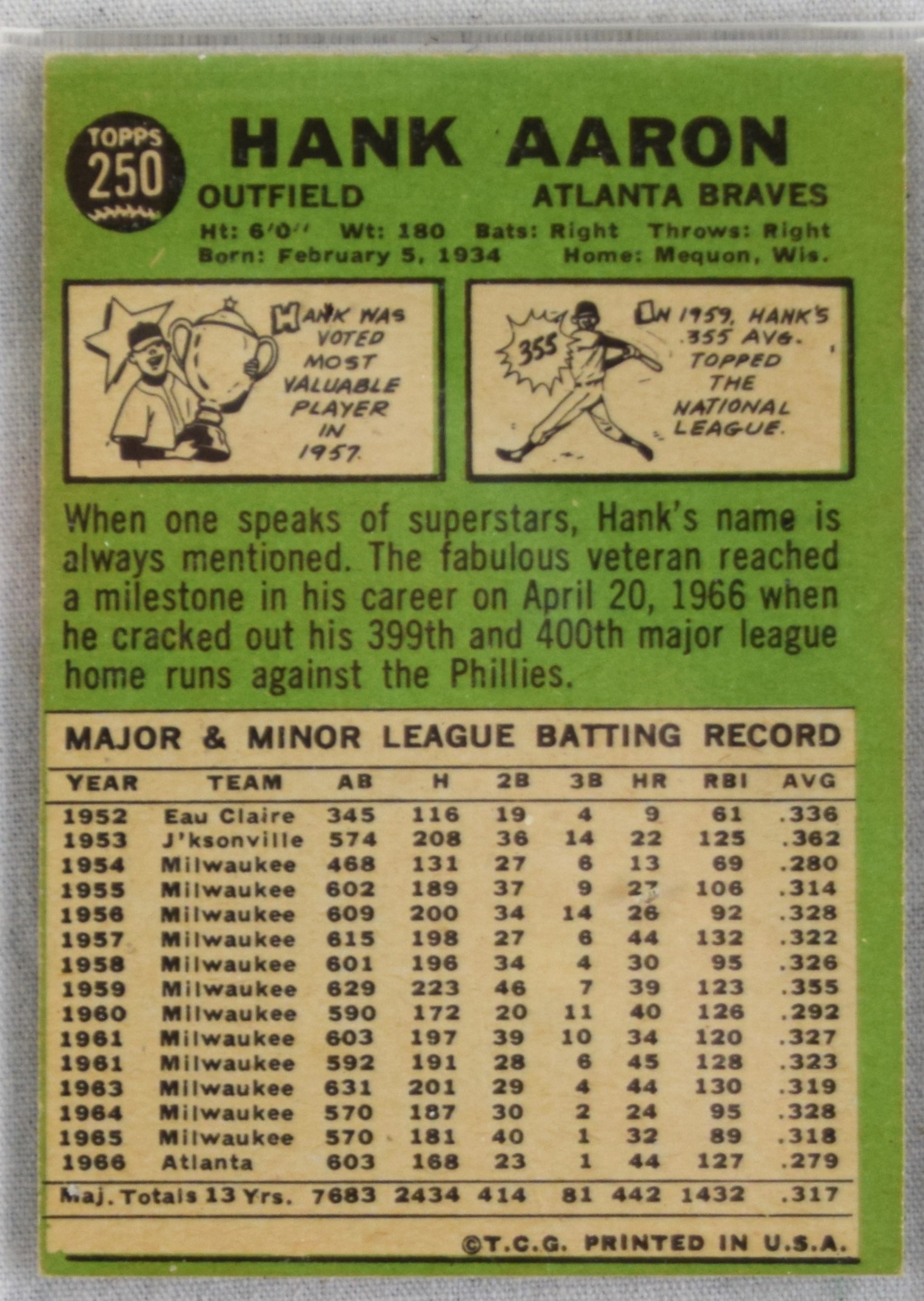 1967 Hank Aaron baseball card, Topps #250, encased but not graded