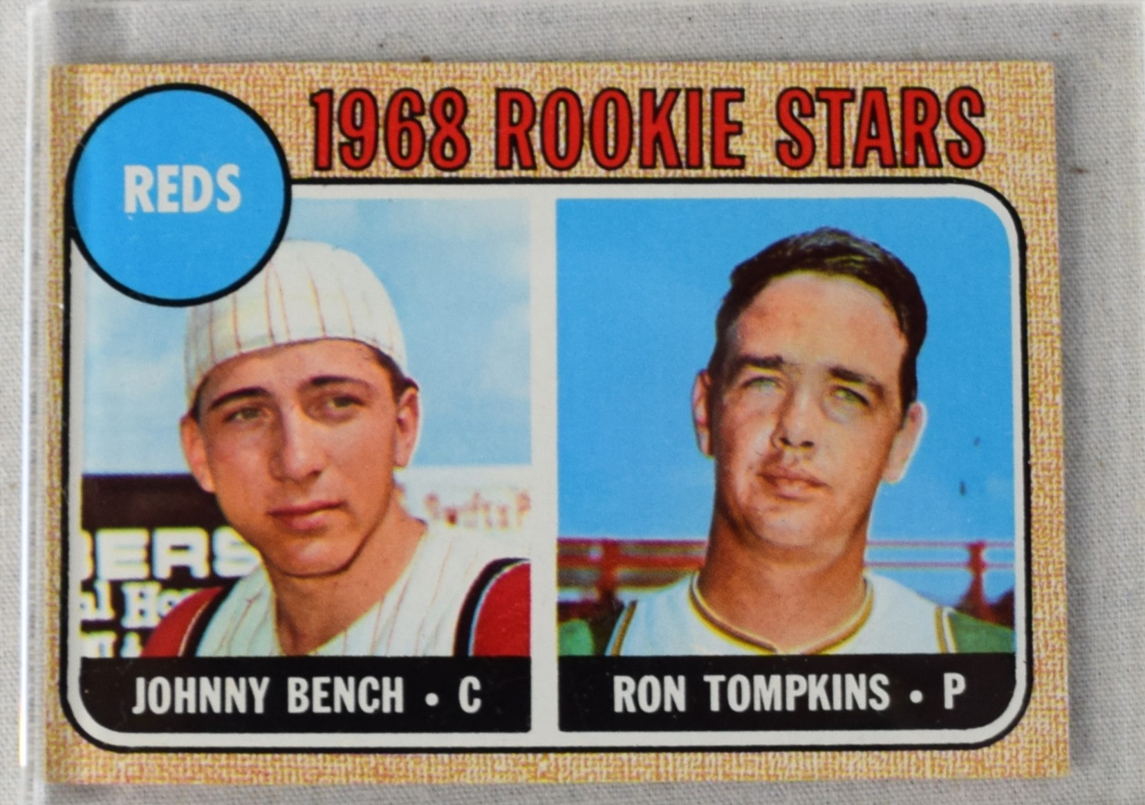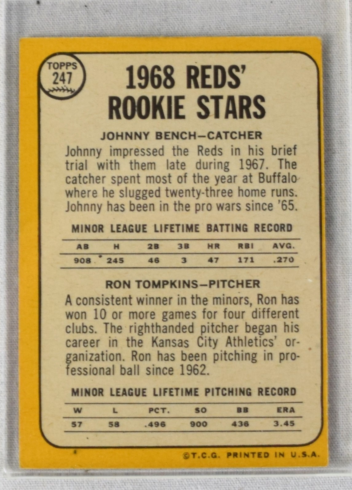 1968 Johnny Bench Rookie Card Topps # 247 with Ron Tompkins pictured as well.