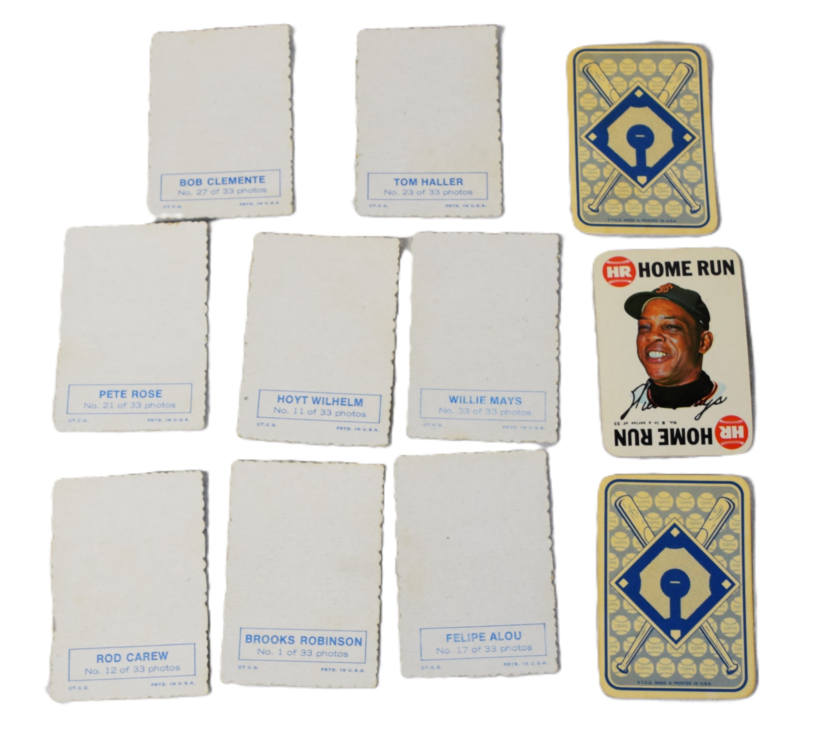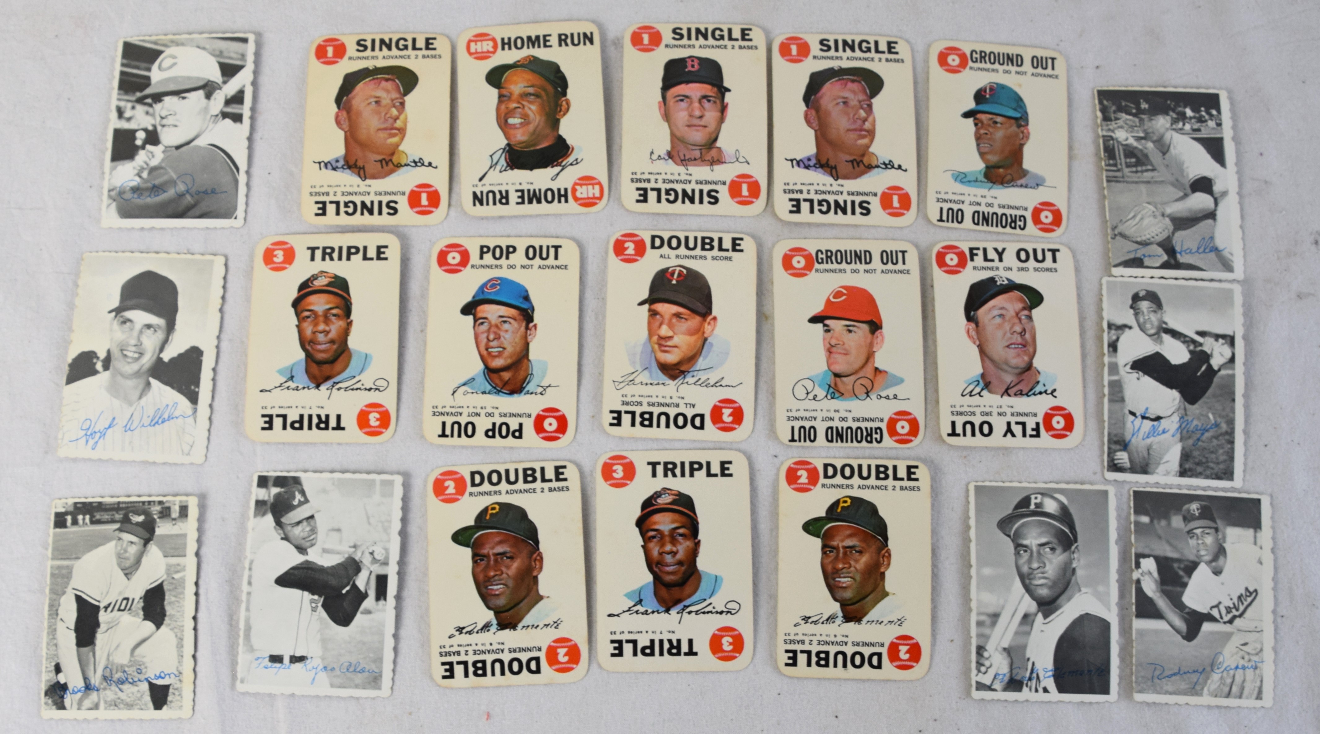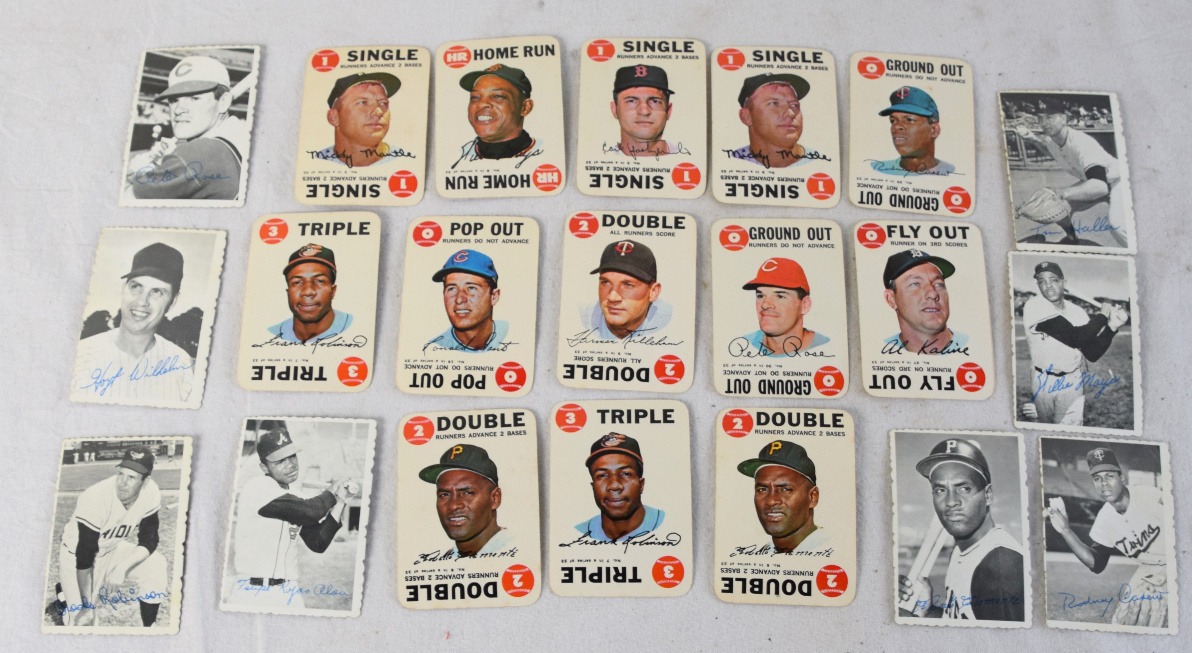 13 Topps 1968 baseball game cards to include Mickey Mantle, Roberto Clemente, Wille Mays and others. 8 Topps 1969 Deckle Edge Cards to include Roberto Clemente, Brooks Robinson, Wille Mays and others