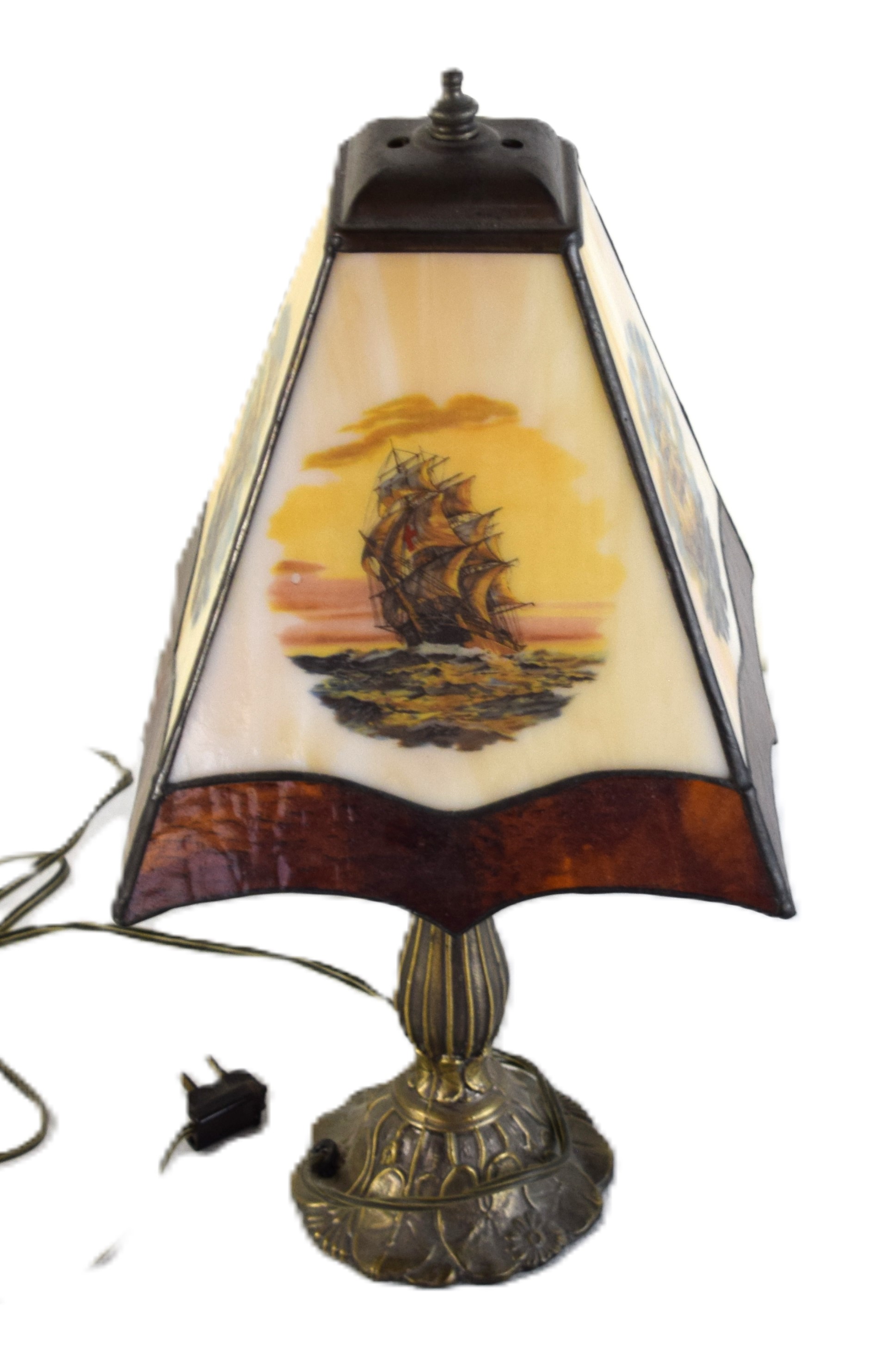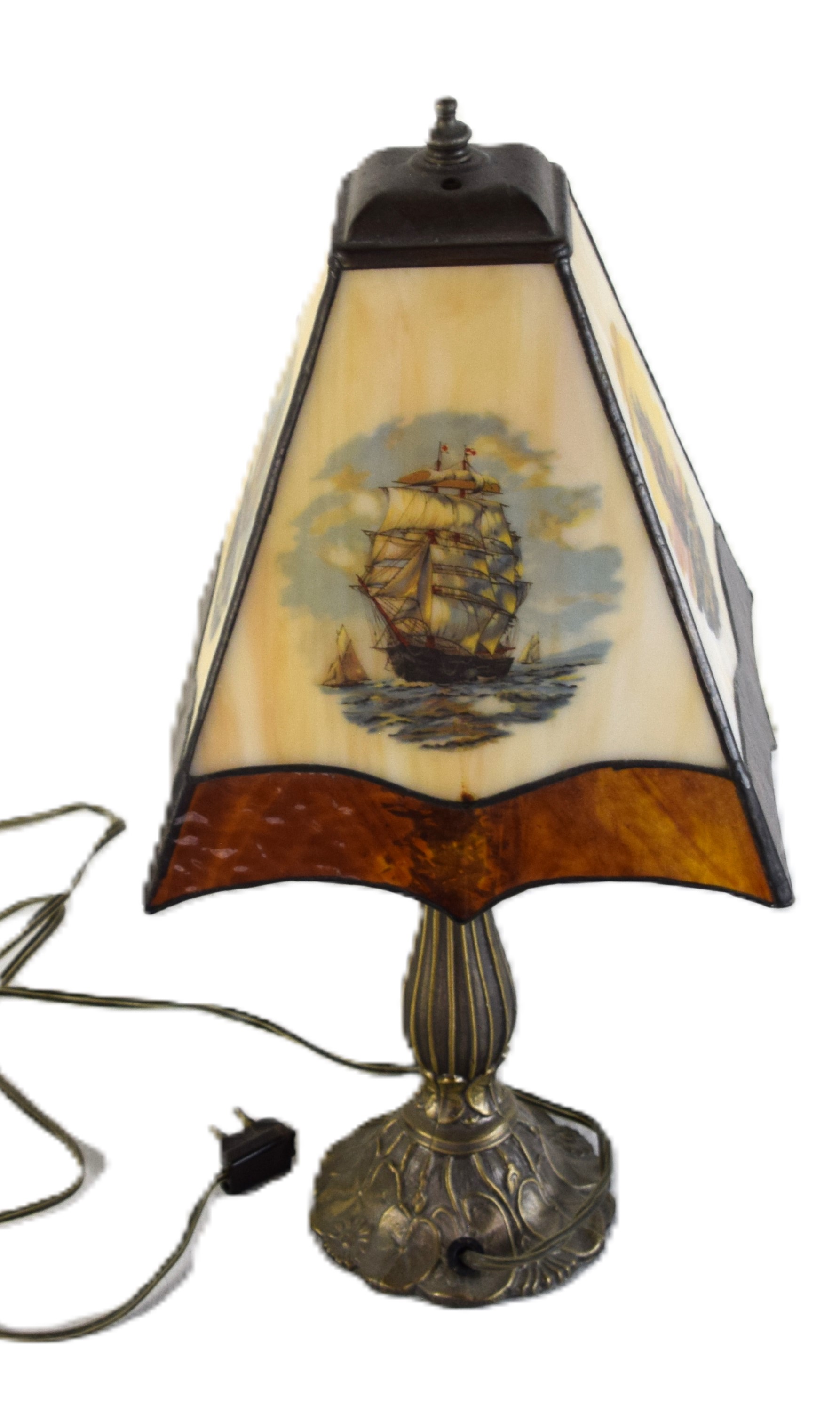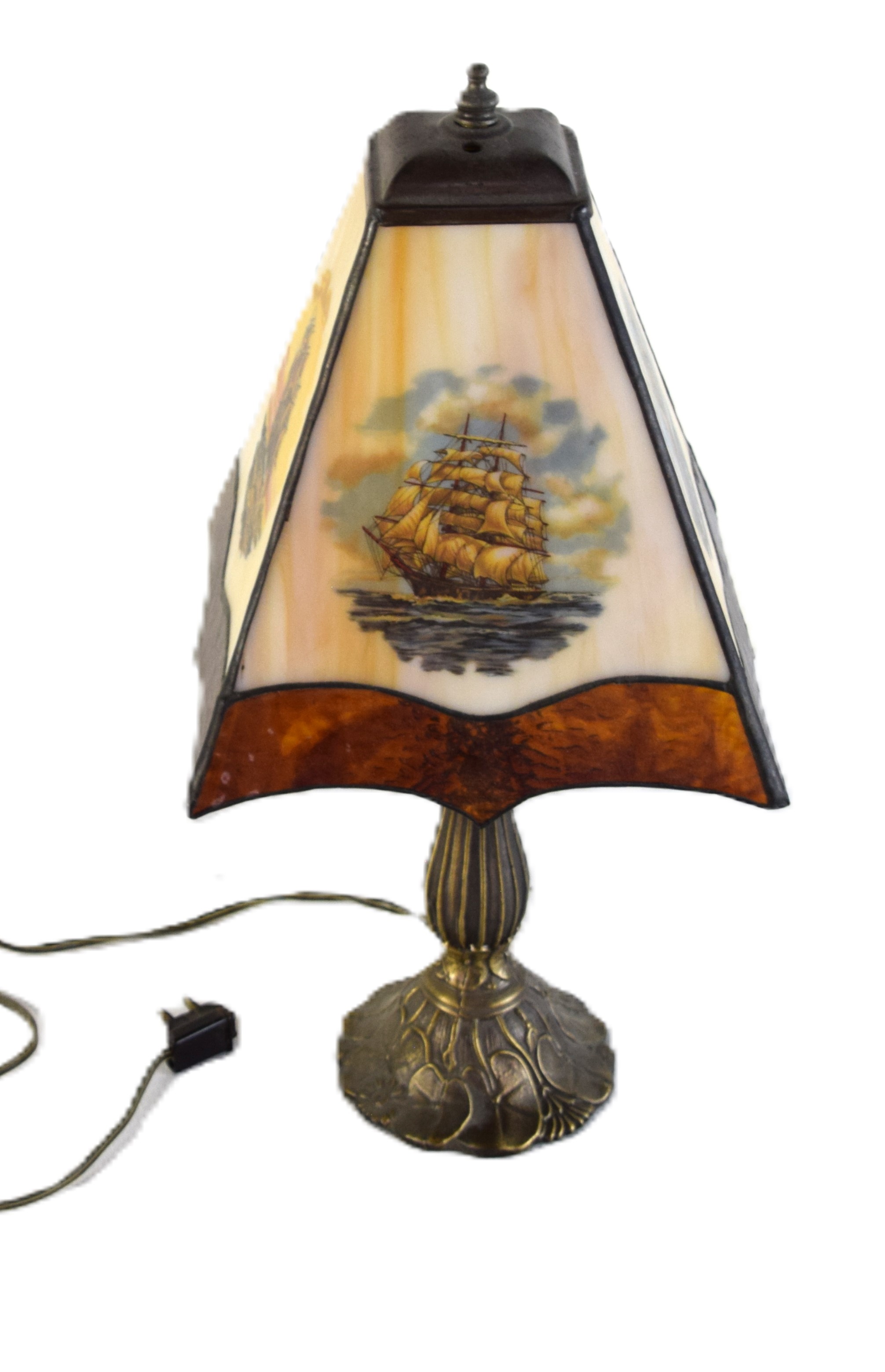 20th Century Victorian style boudoir table lamp with slag panel shade with sailing ships. Dimensions: 17″ H