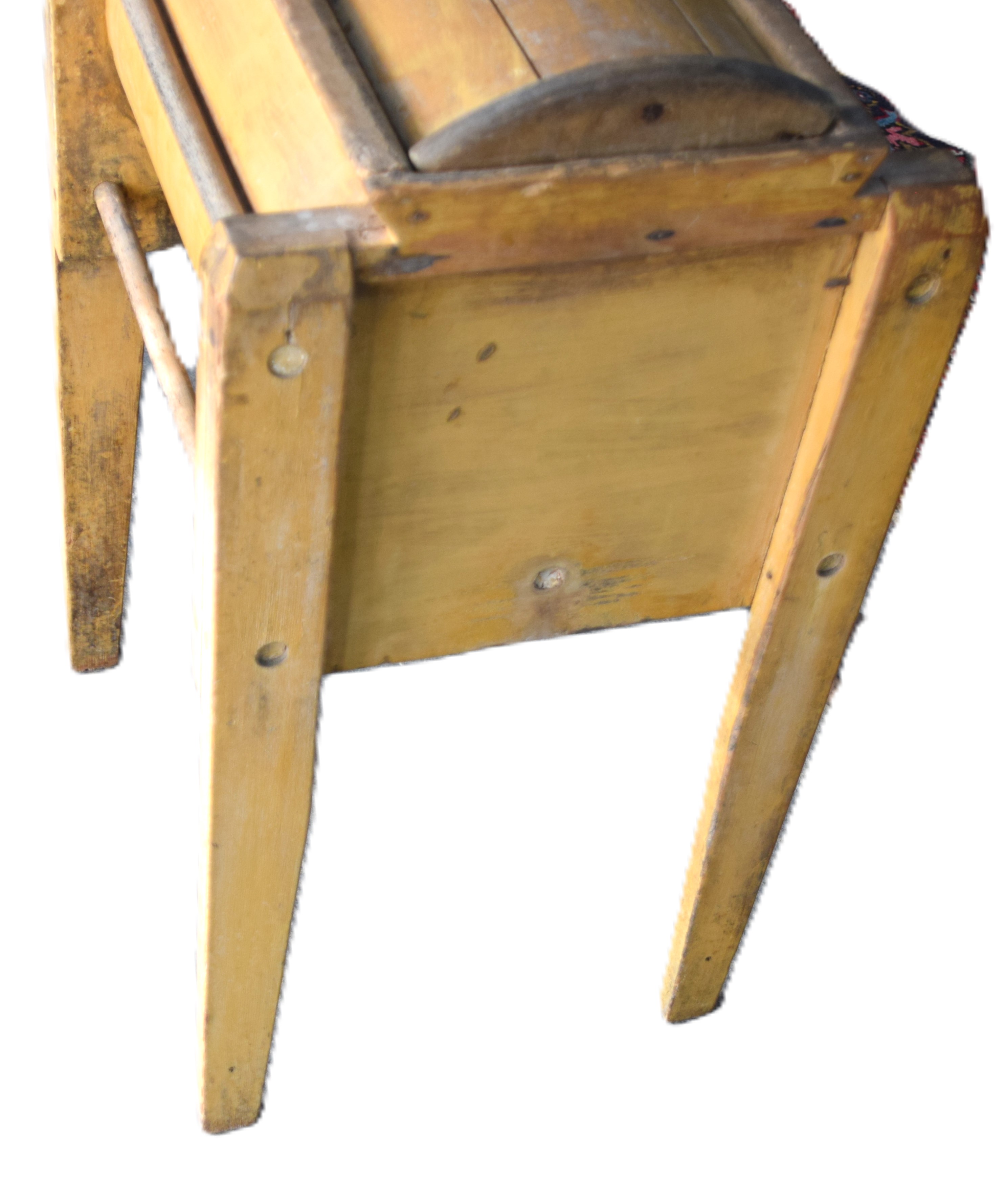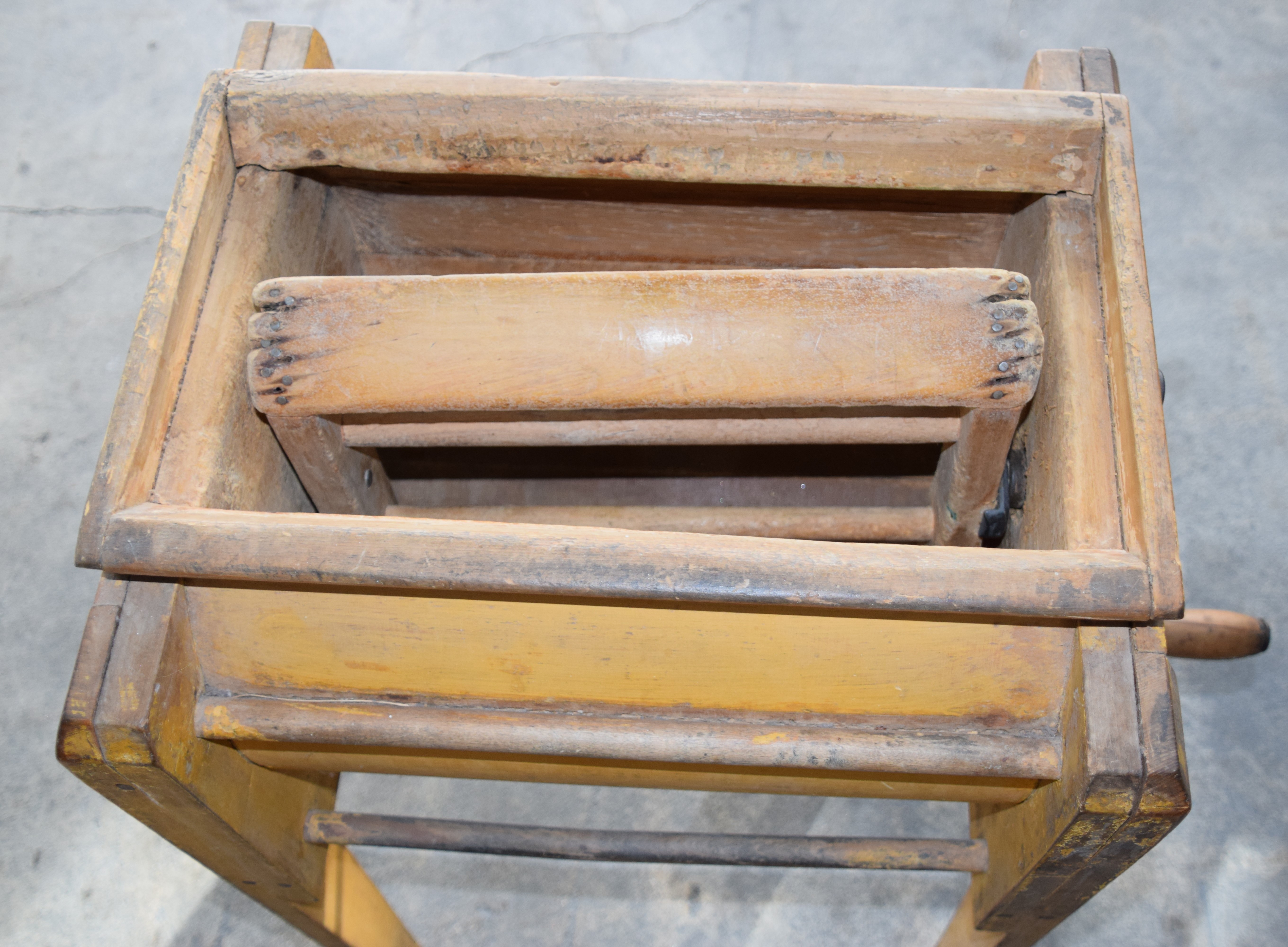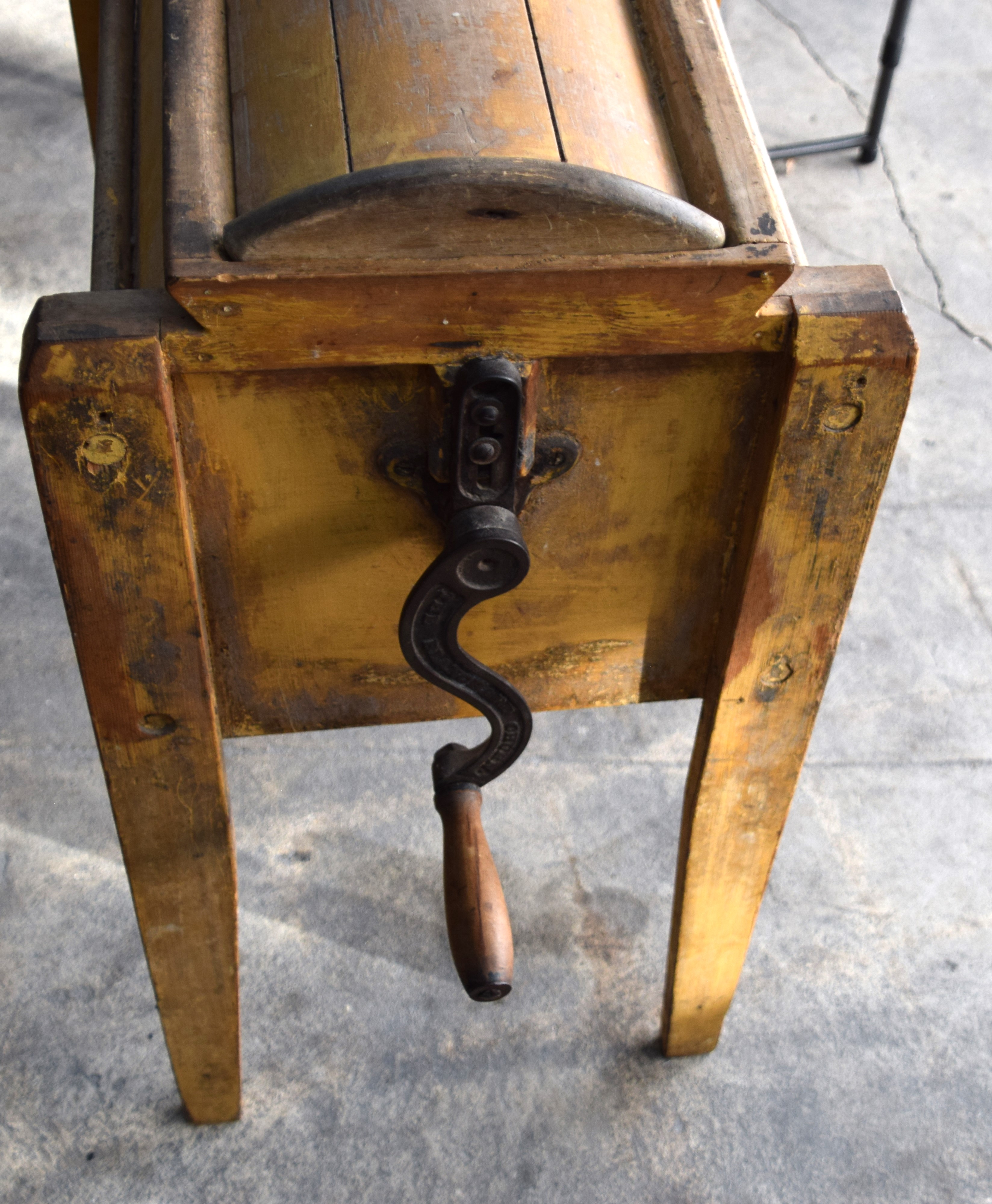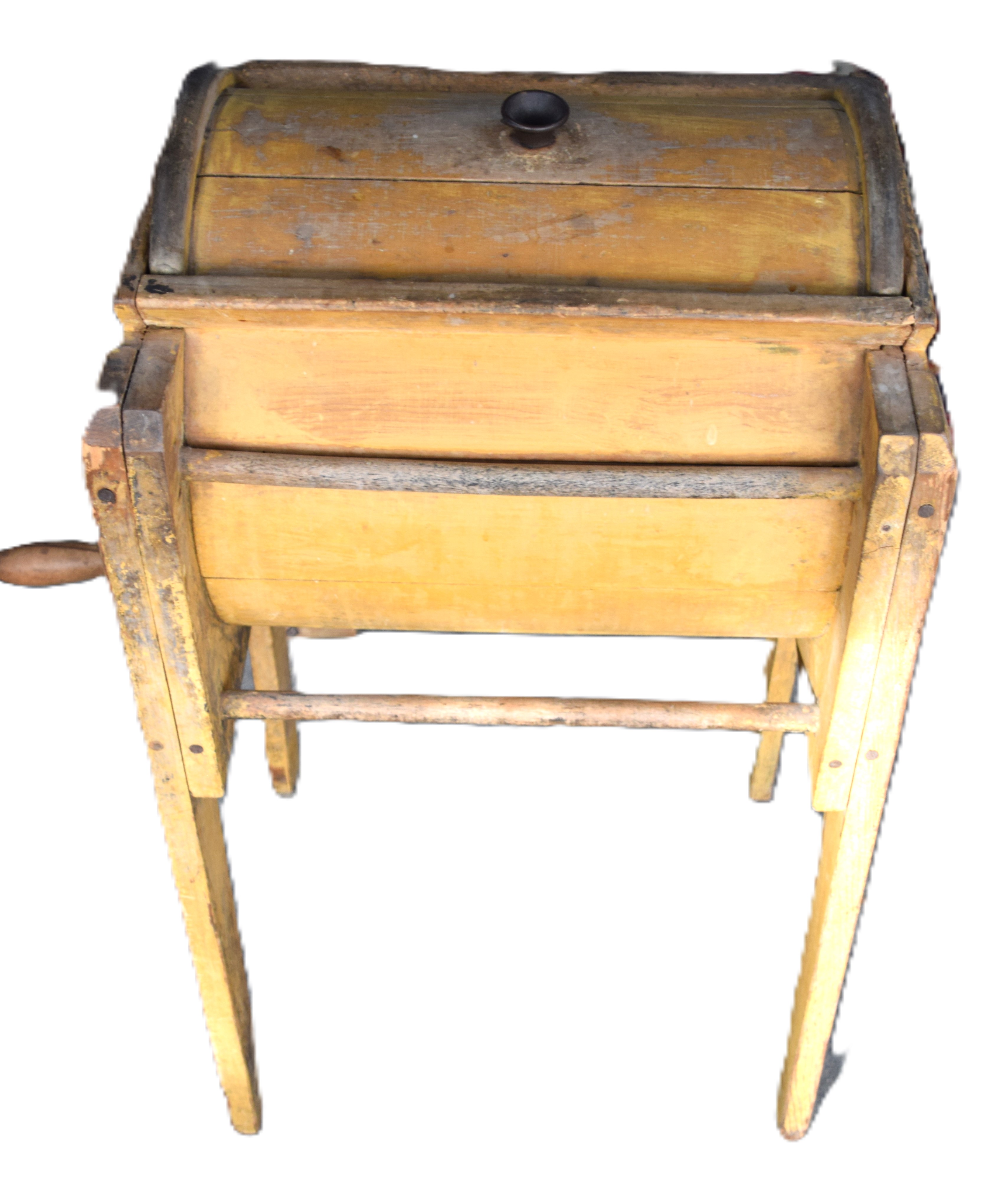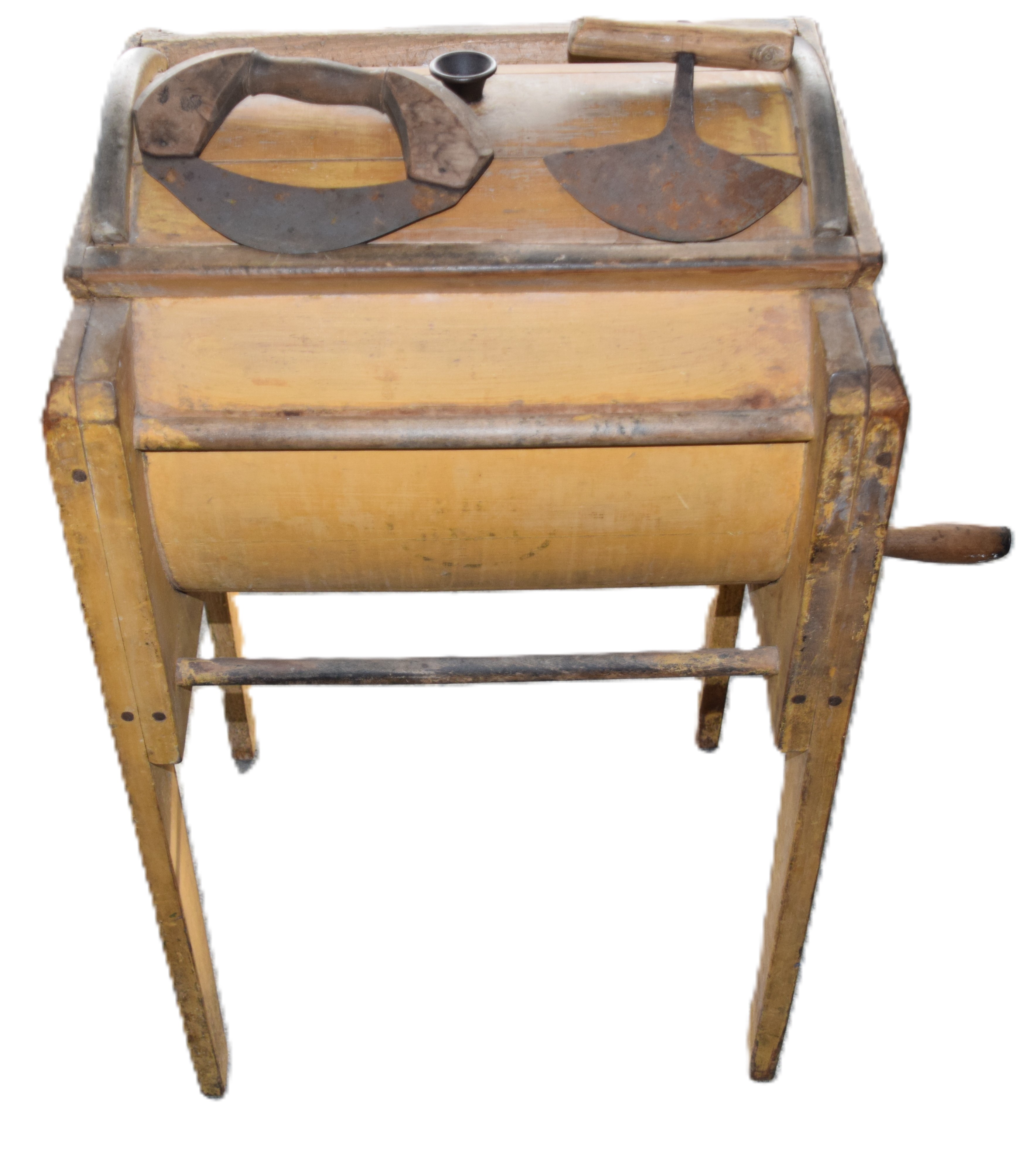 A standing floor model butter churn in mustard paint with lid, innards and side crank. Also included two kitchen choppers. Dimensions: 33″ H x 19″ W x 16″ D