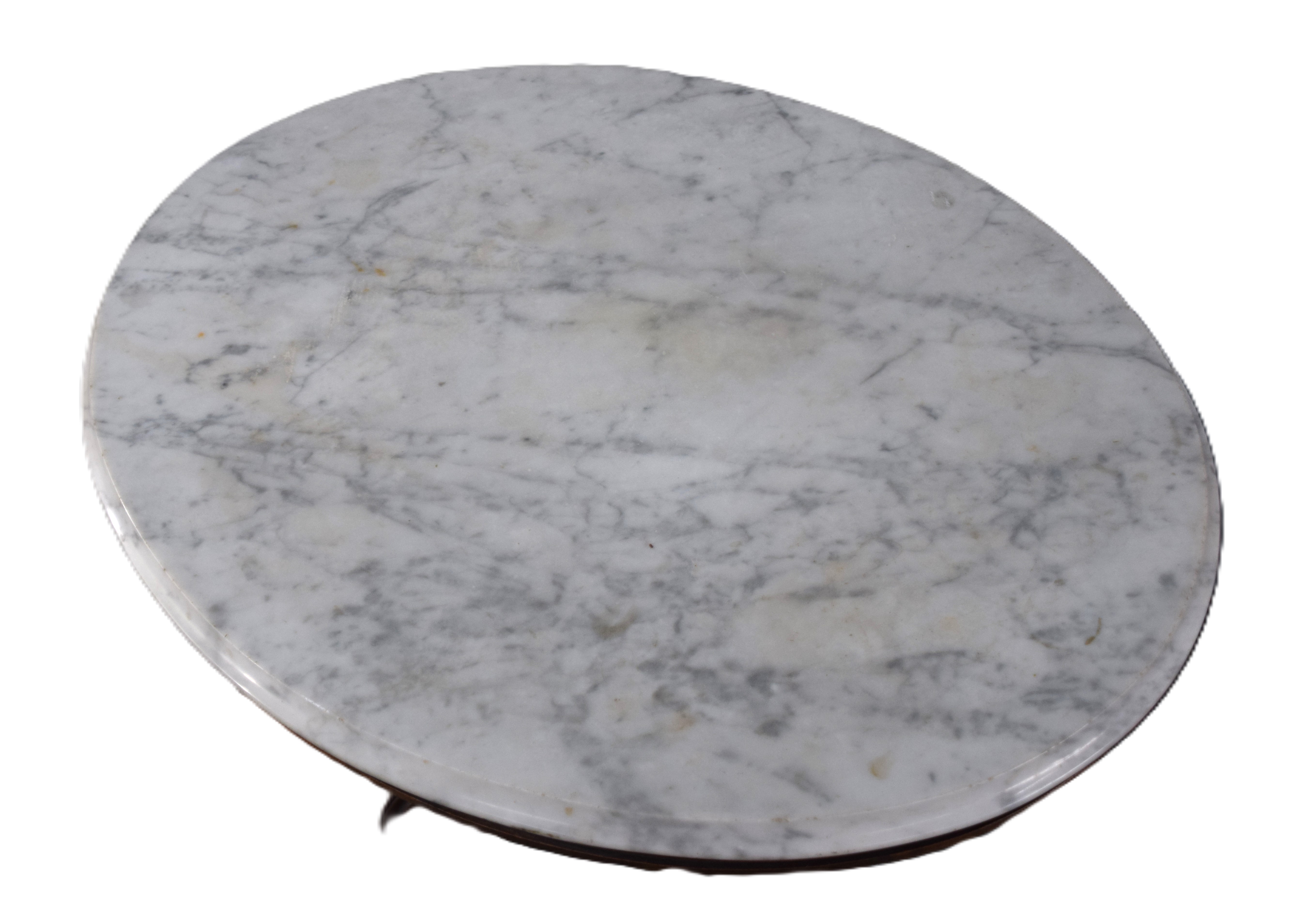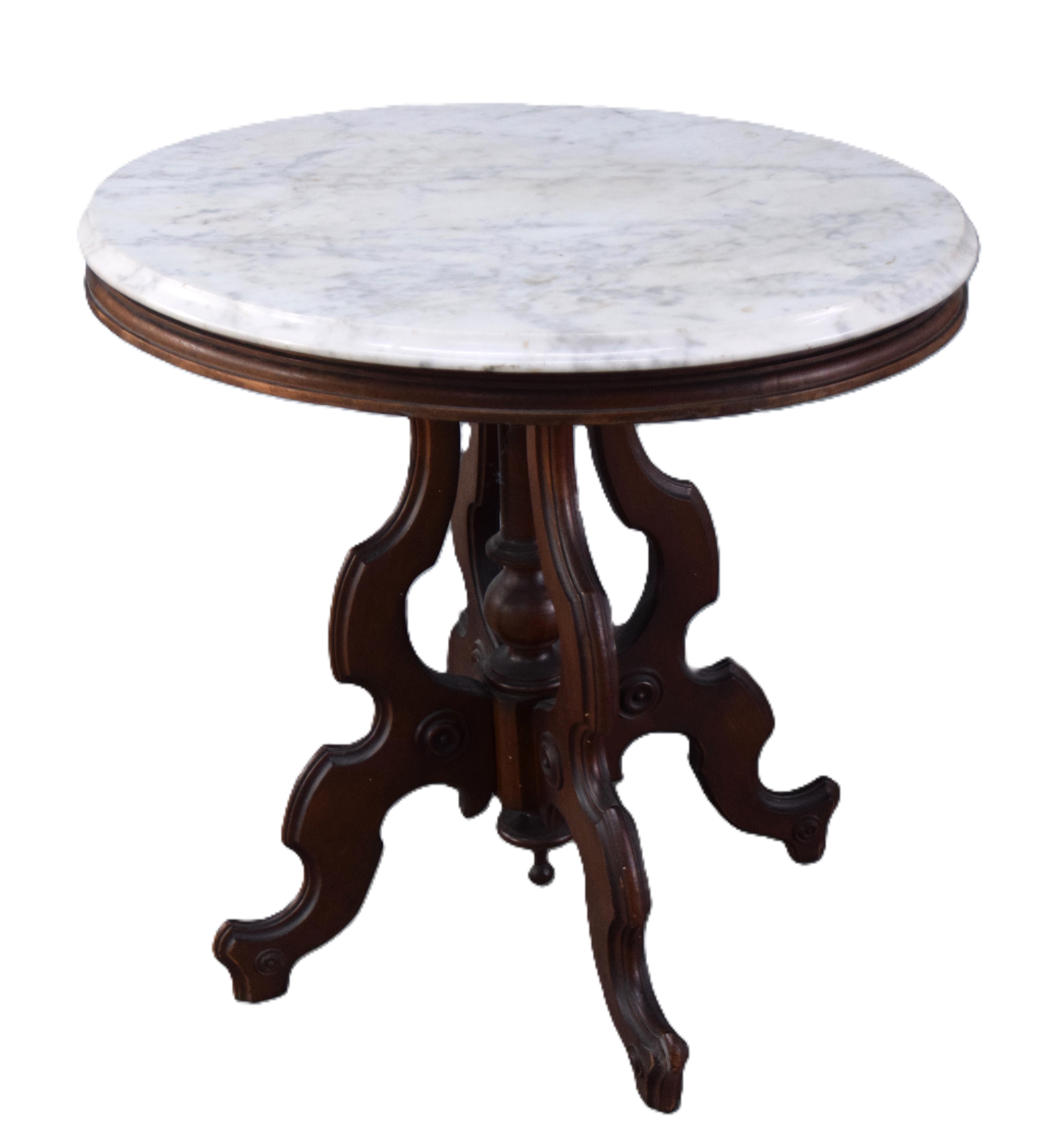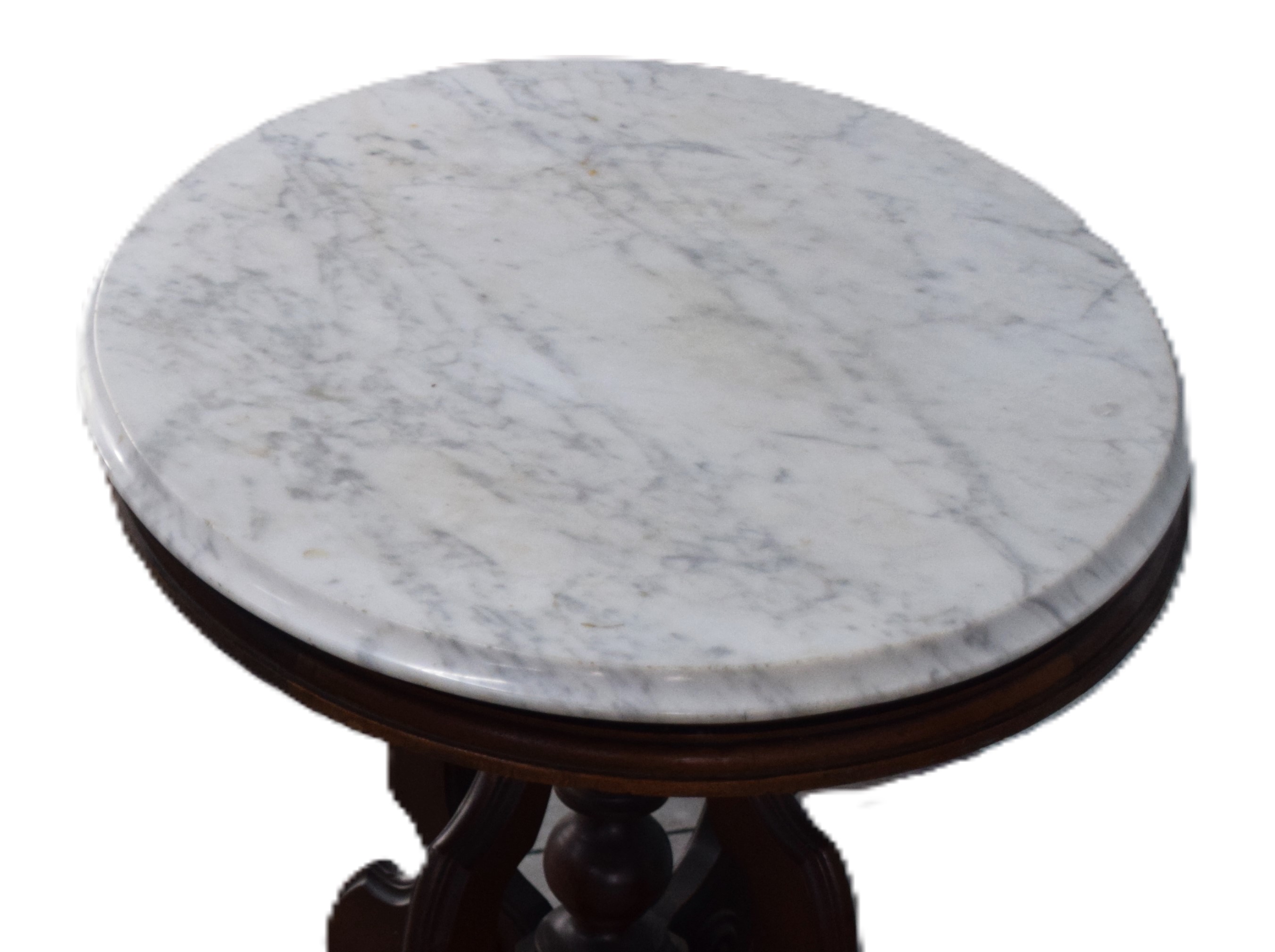 Victorian black walnut oval marble top table on four splayed carved legs and center drop finial. Dimensions: 28″ H, 28″ x 22″ Marble top