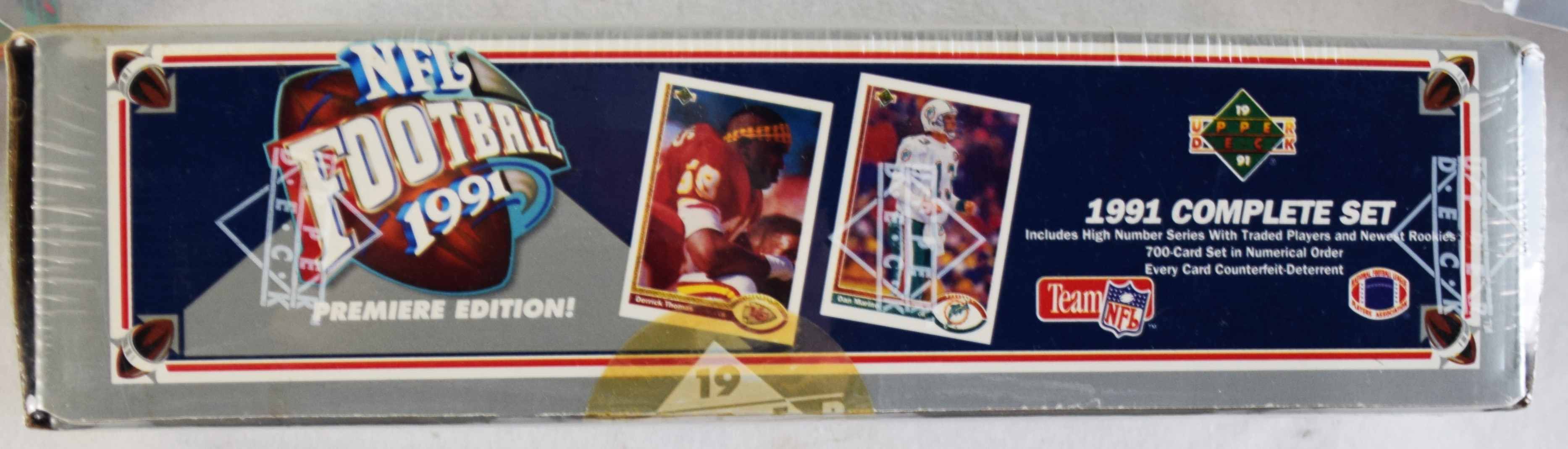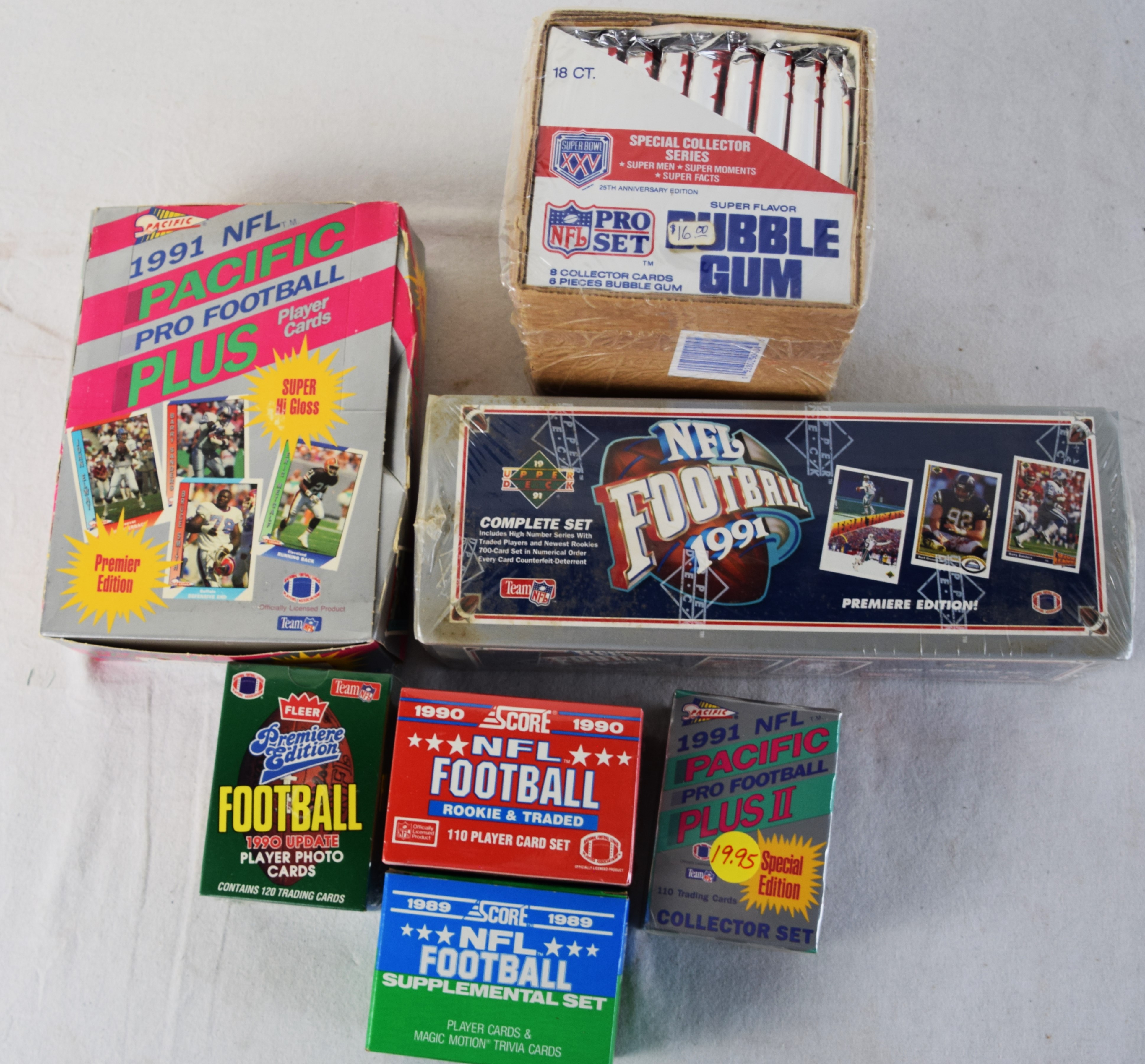 Factory sealed sets of football cards to include 1991 Pacific Plus Player cards of 36 packets, 1991 NFL Upper Deck Premium edition or 700 cards, Super Bowl XXV collector set of 18 packets, 1991 Pacific Plus II collector set of 110 cards, 1990 Fleer Premium edition set of 120 cards, and Score 1989 and 1990 Rookie and Traded card set of 110 cards each
