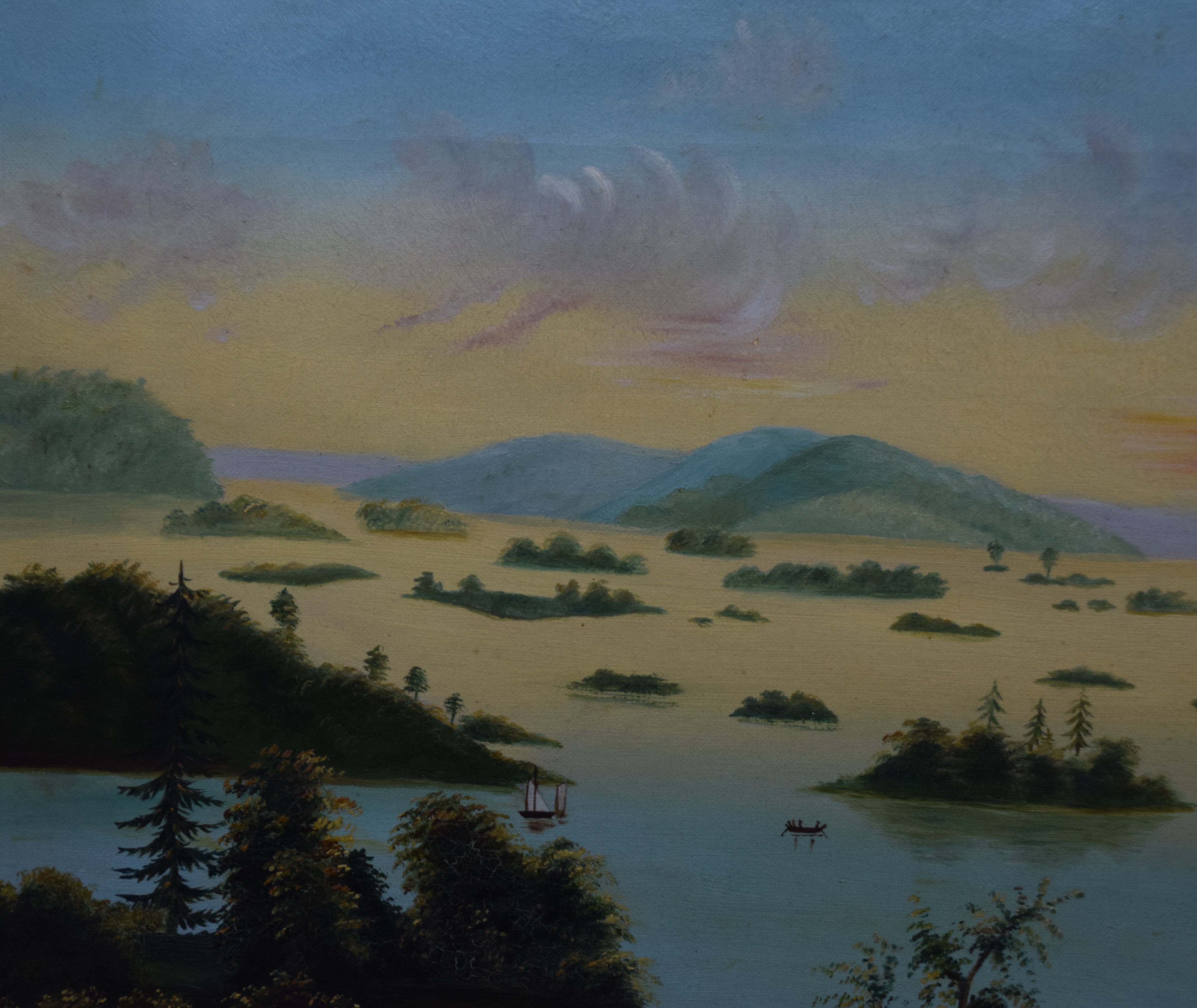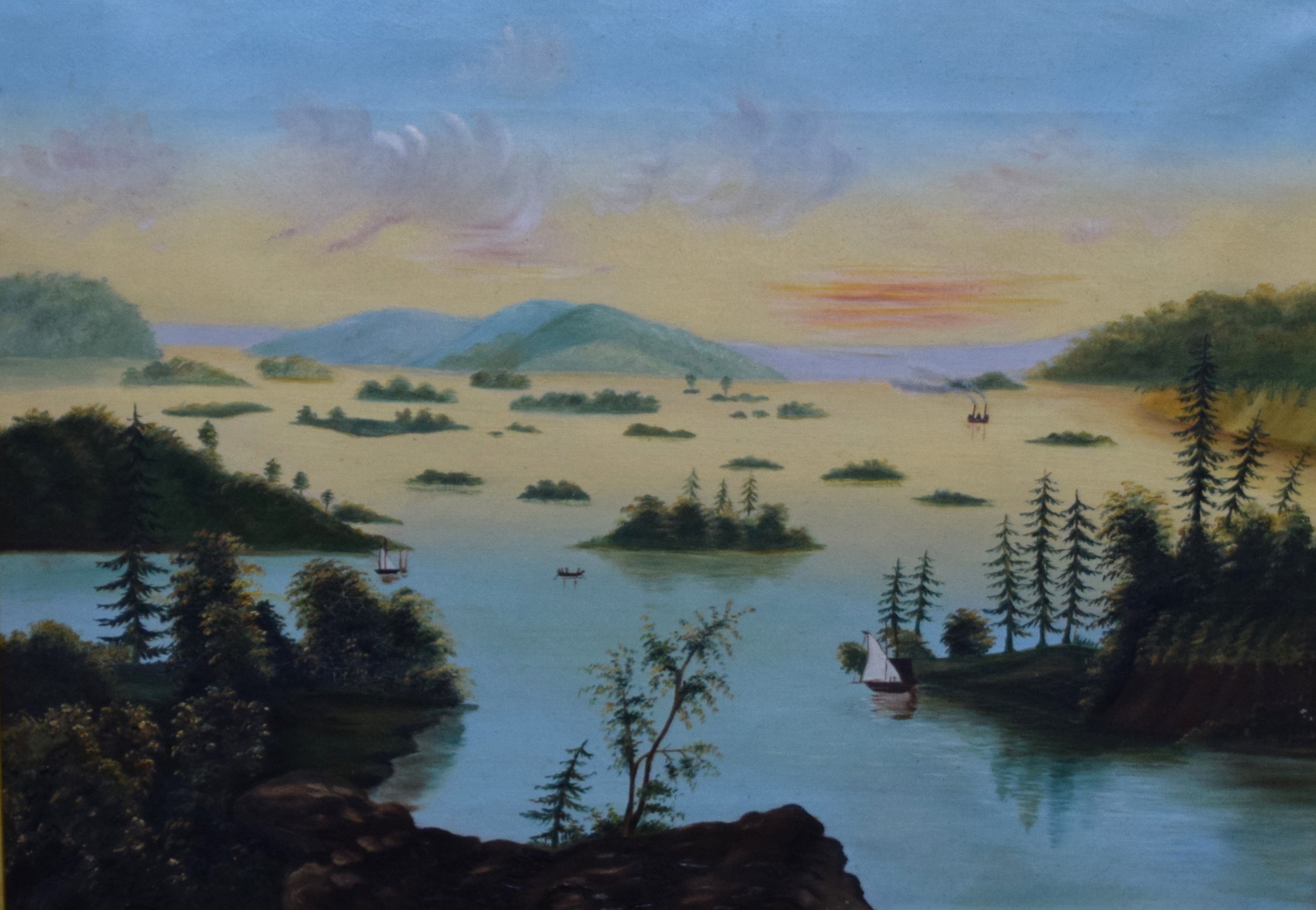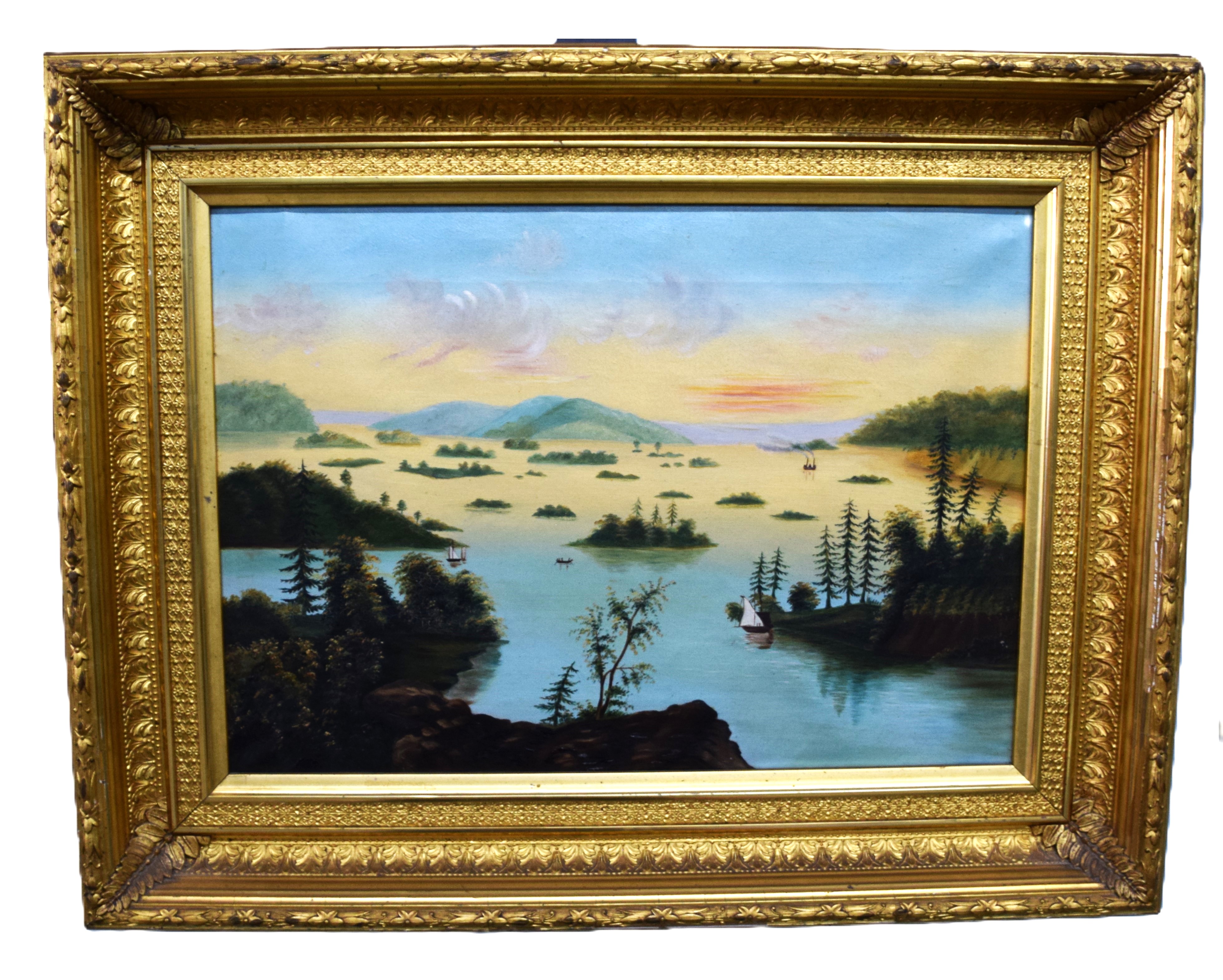 Framed 19th century oil painting on canvas of a lake scene with small islands, sail boats and evening sky. Original and superb frame. In the style of Thomas Chambers. Dimensions: 14″ x 19.5″ Image; 21″ x 26.5″ Overall