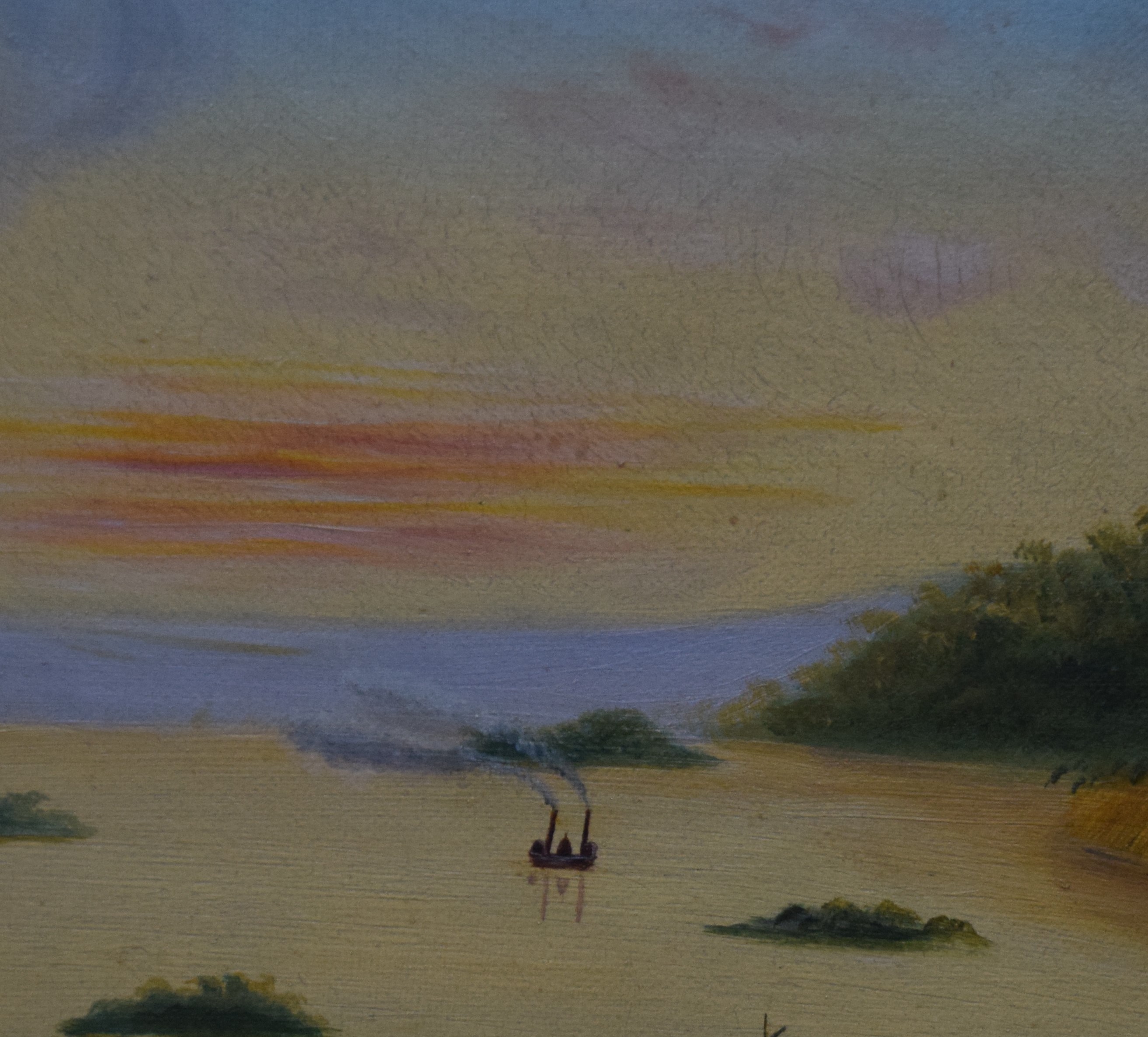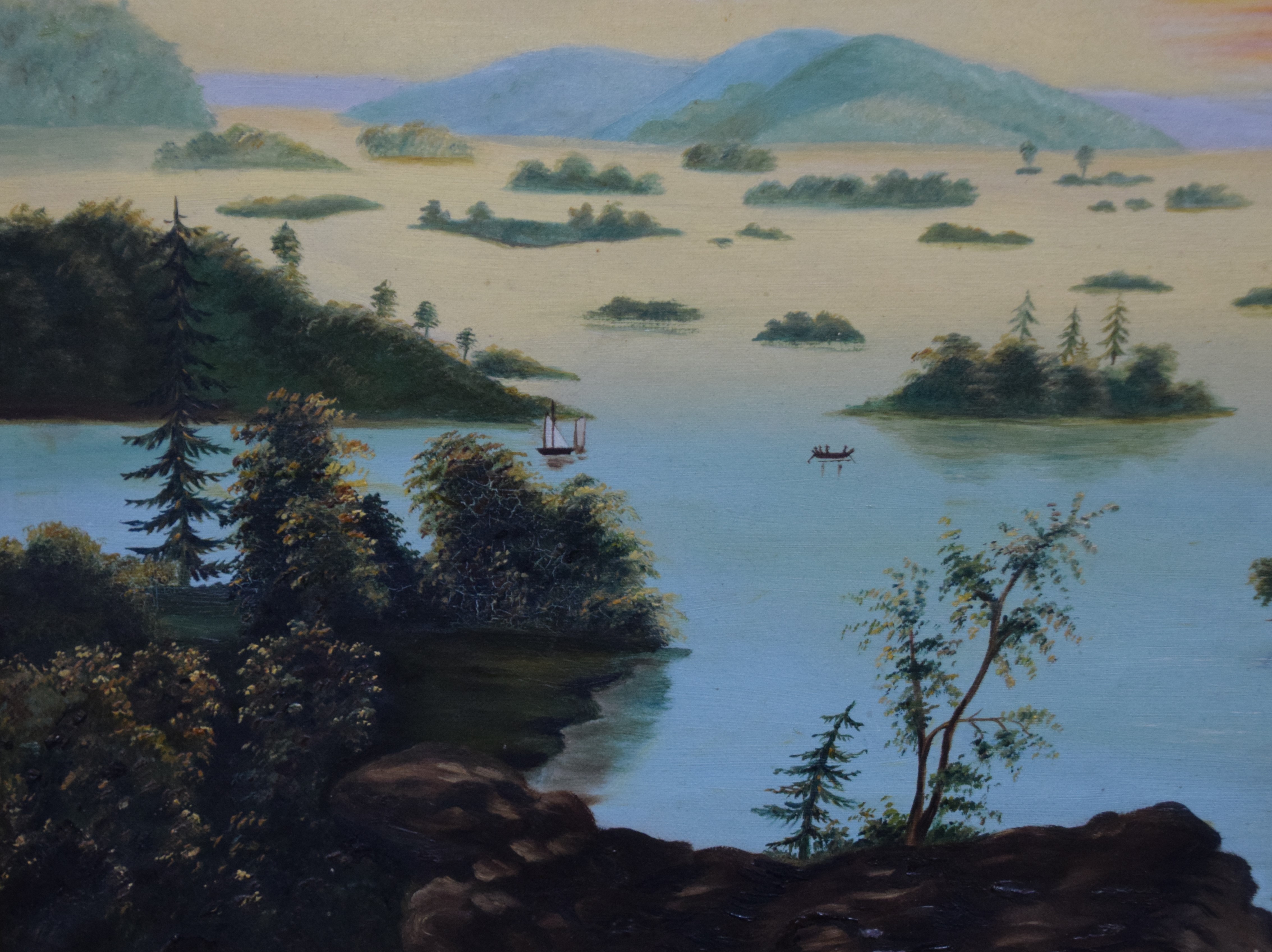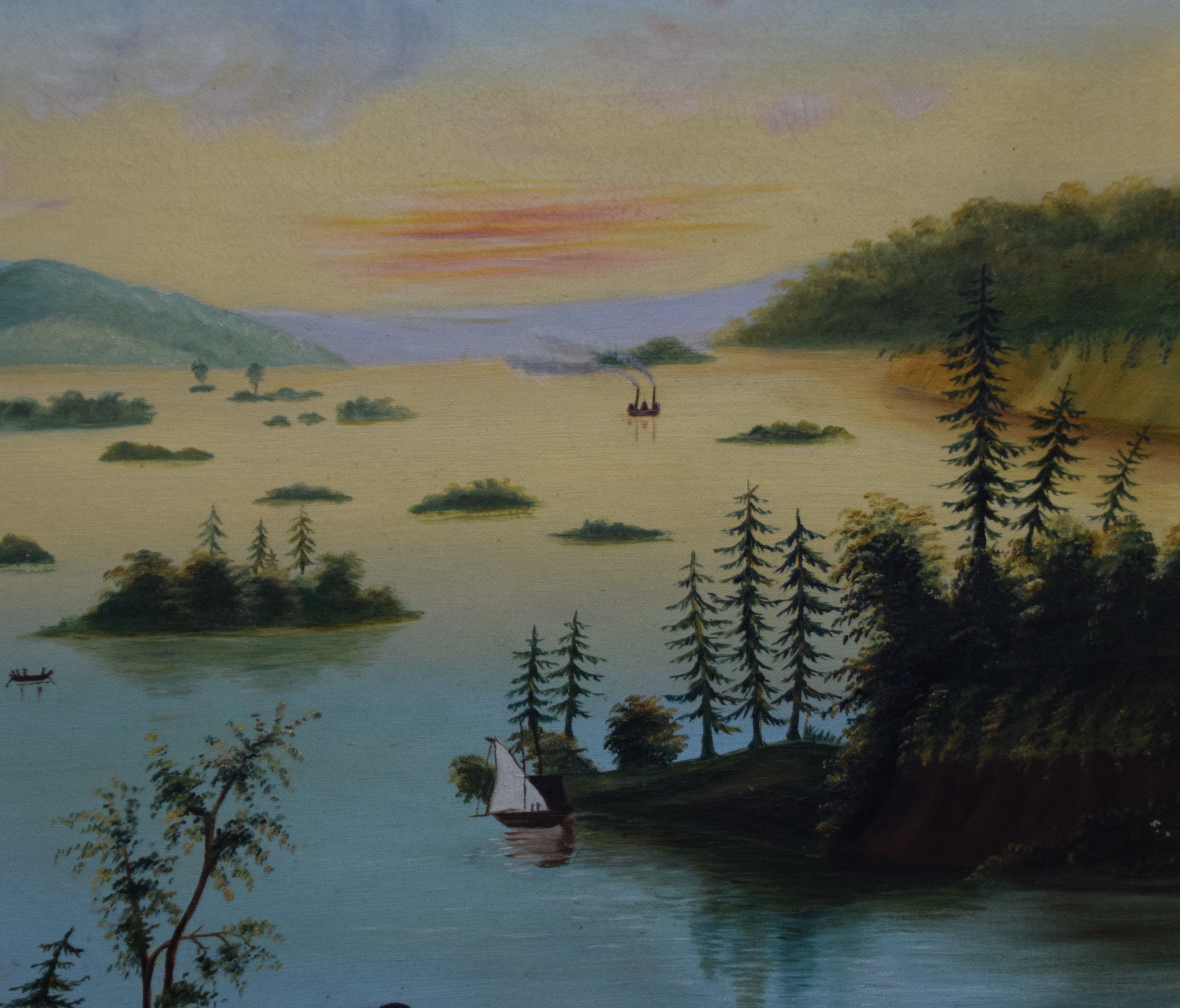 Framed 19th century oil painting on canvas of a lake scene with small islands, sail boats and evening sky. Original and superb frame. In the style of Thomas Chambers. Dimensions: 14″ x 19.5″ Image; 21″ x 26.5″ Overall