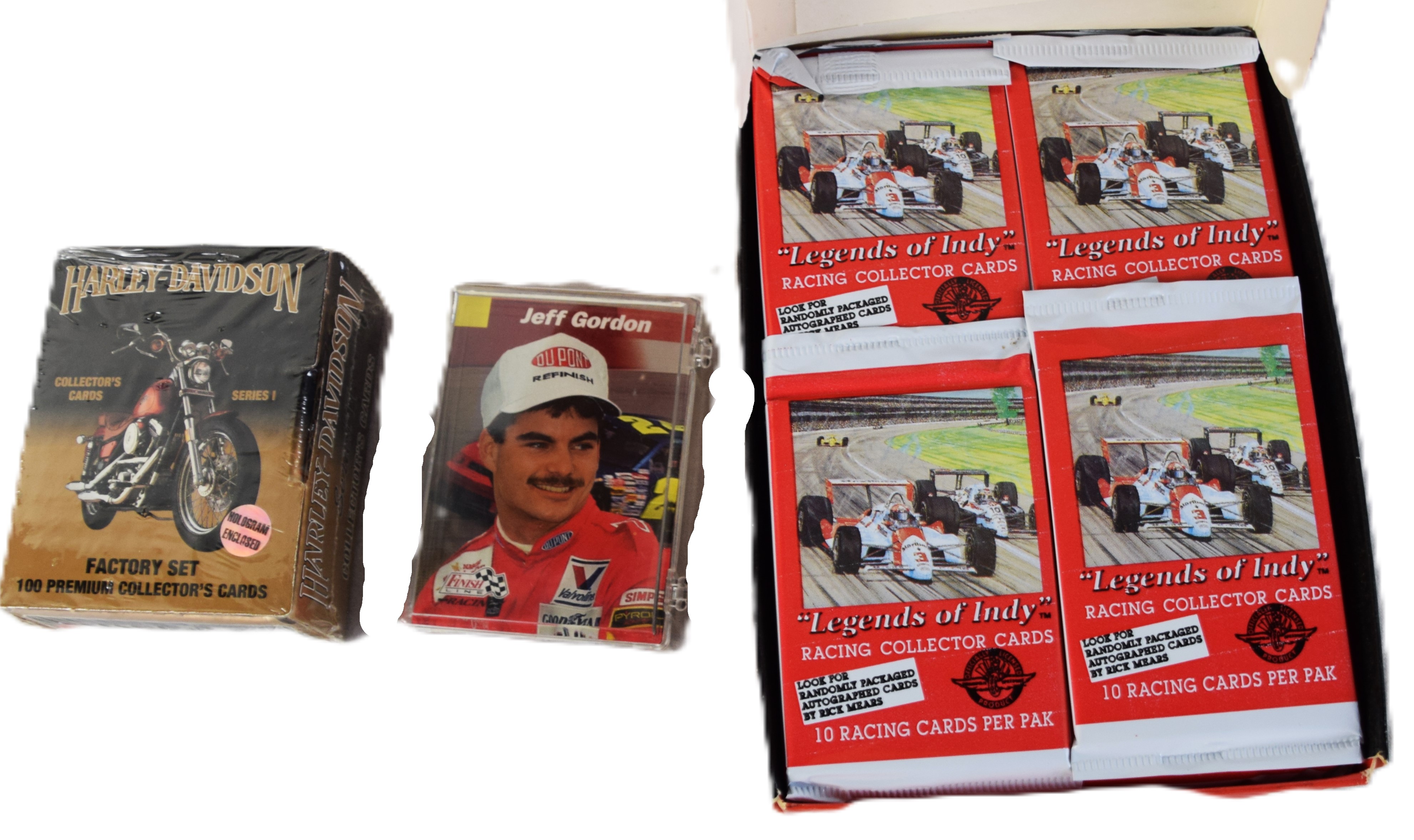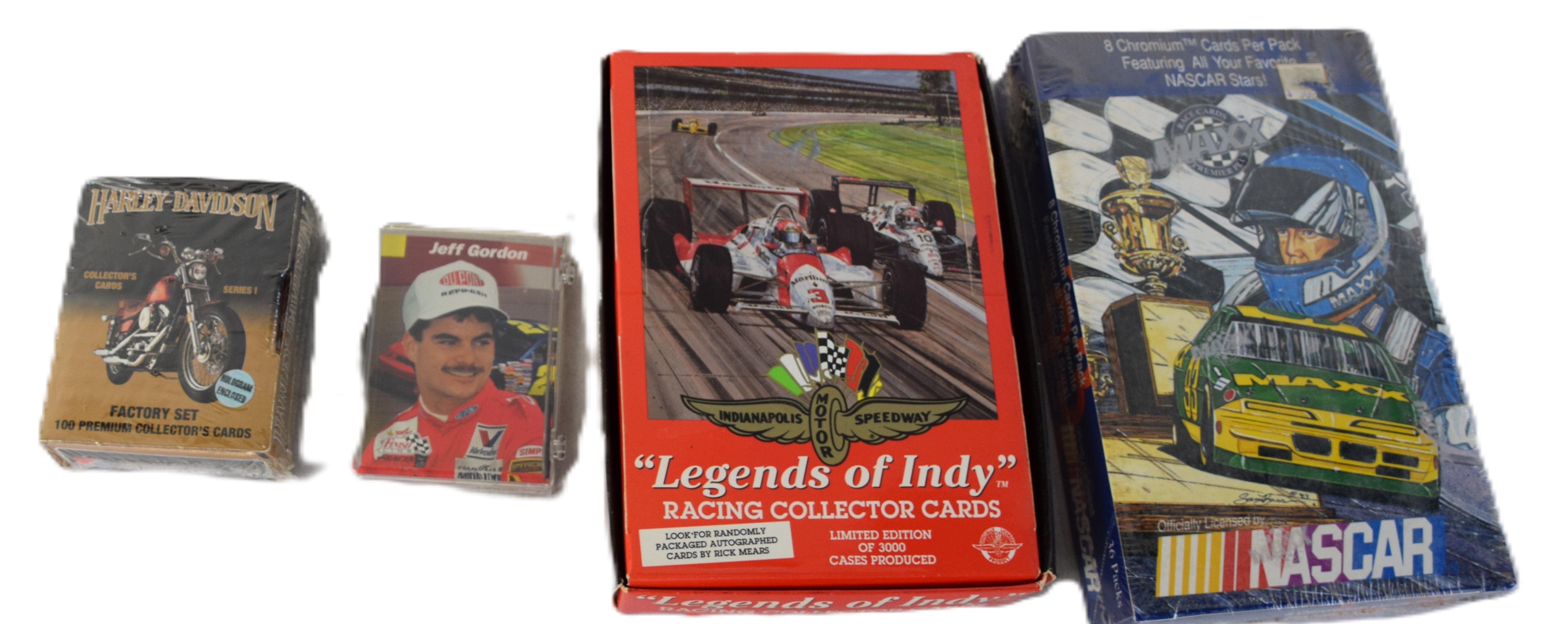 Factory sealed 1993 NASCAR Stars set of 212 cards plus Legends of Indy racing collector cards of 36 packets, factory sealed 1992 Harley Davidson collector set of 100 cards plus a few individual racing cards