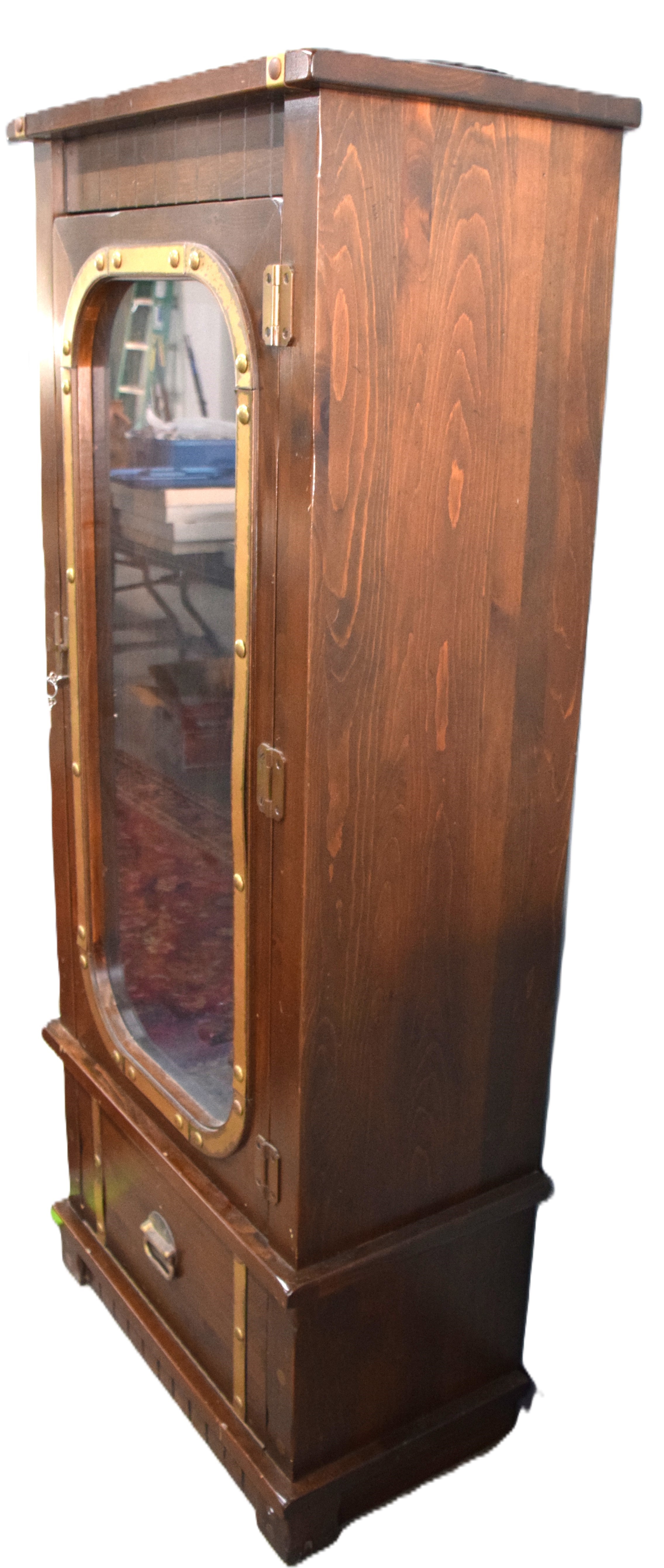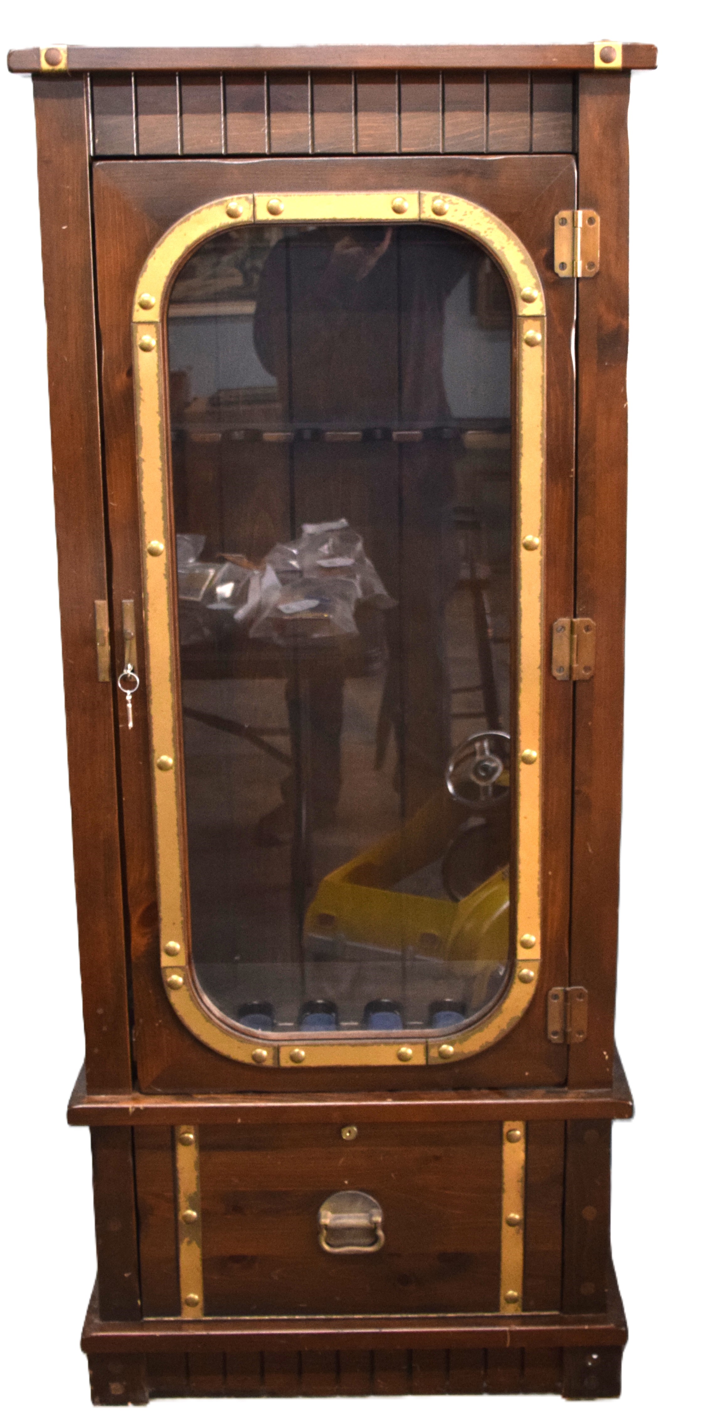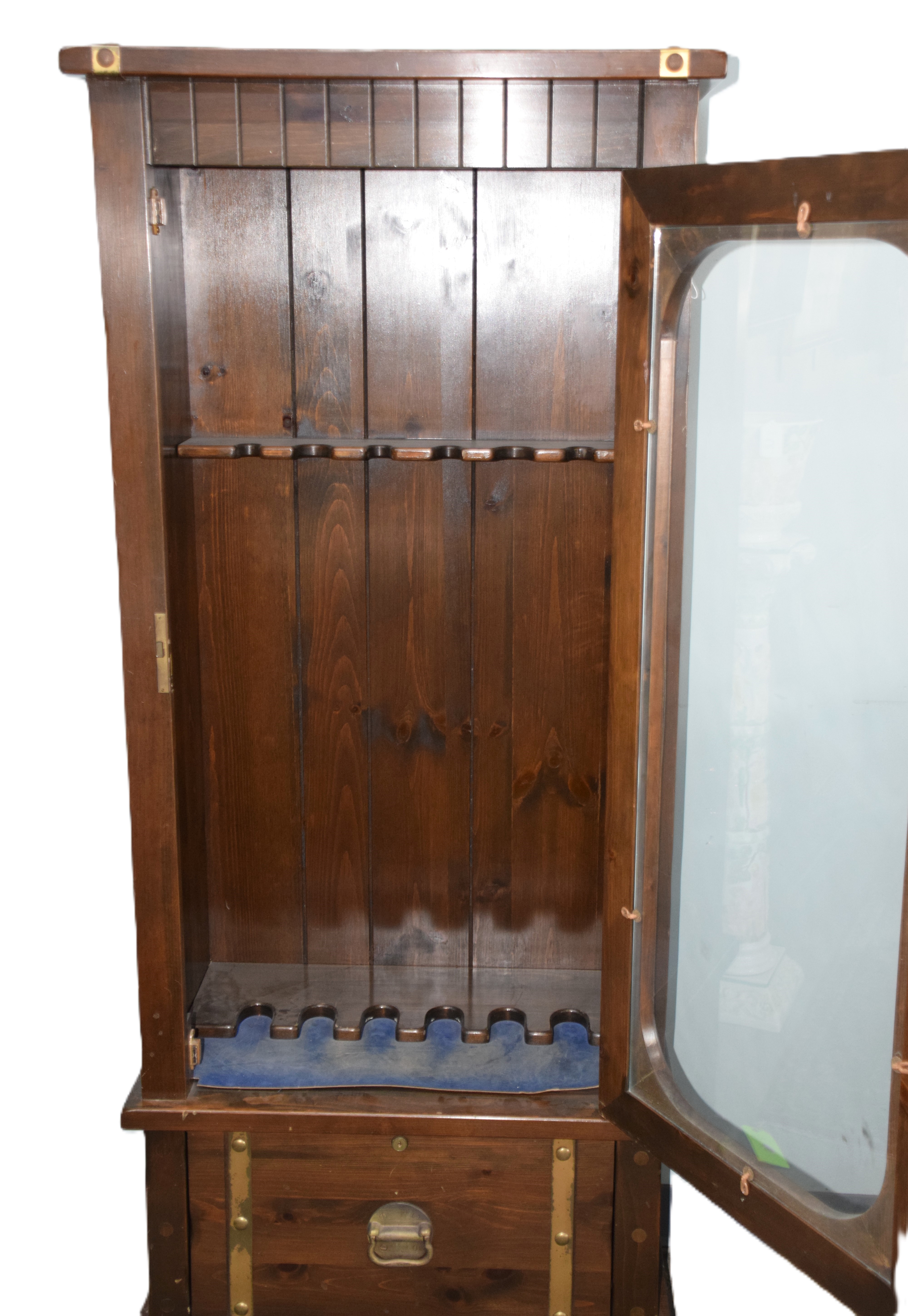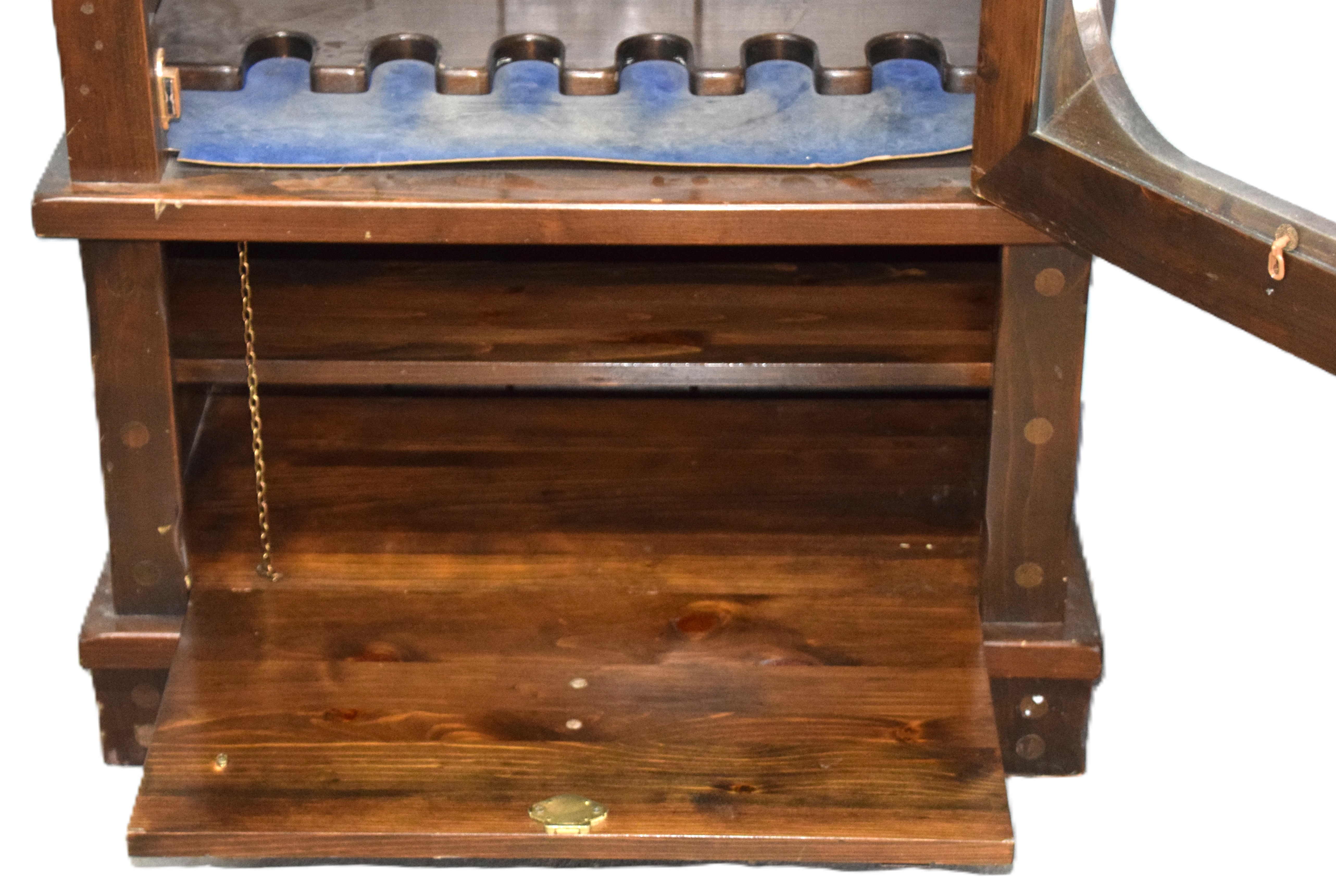 20th Century pine arts and crafts design gun cabinet, illuminated, with single glass door, lower fall front lid for handgun compartment. Dimensions: 69.5″ H x 29″ W x 16″ D