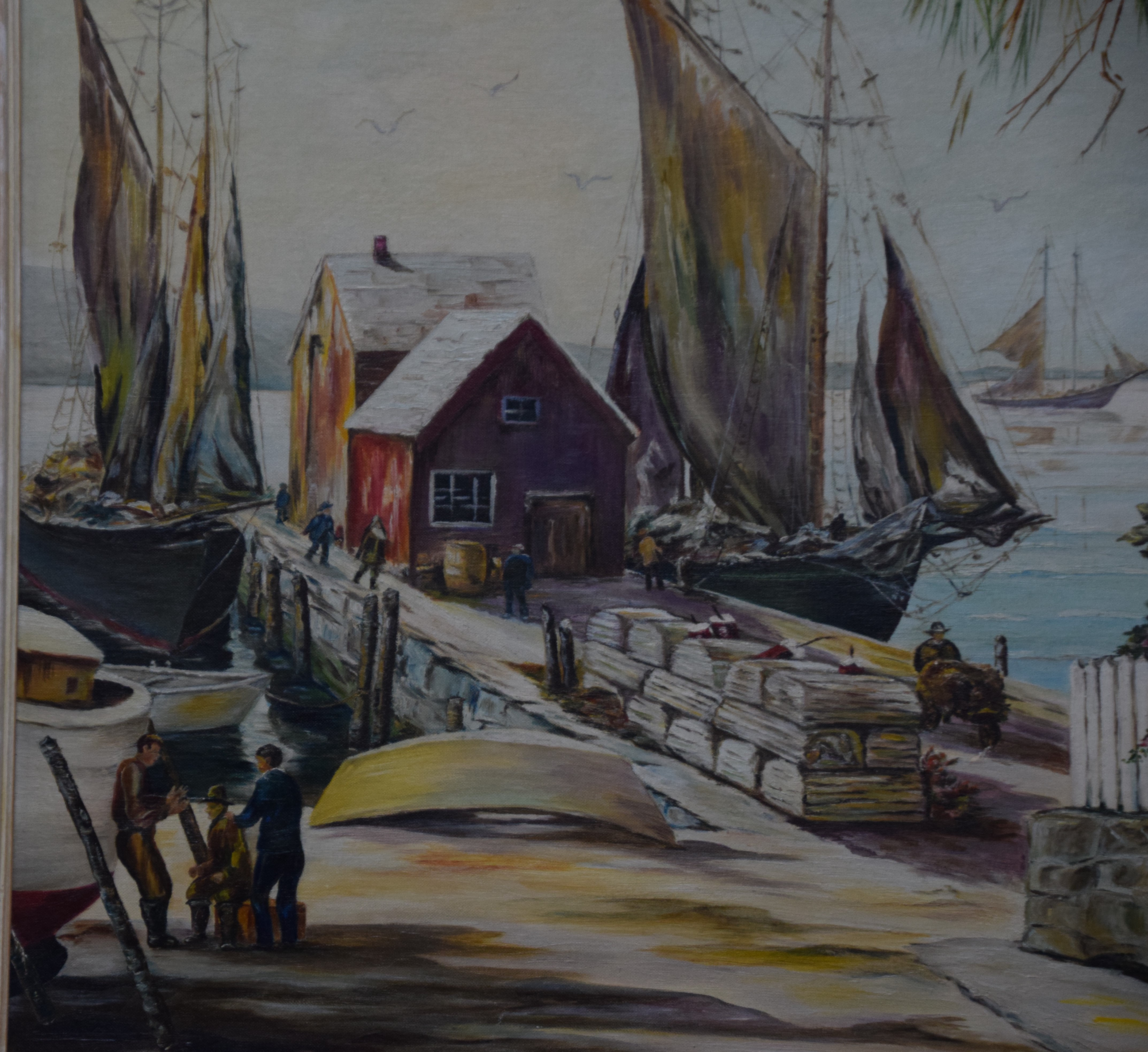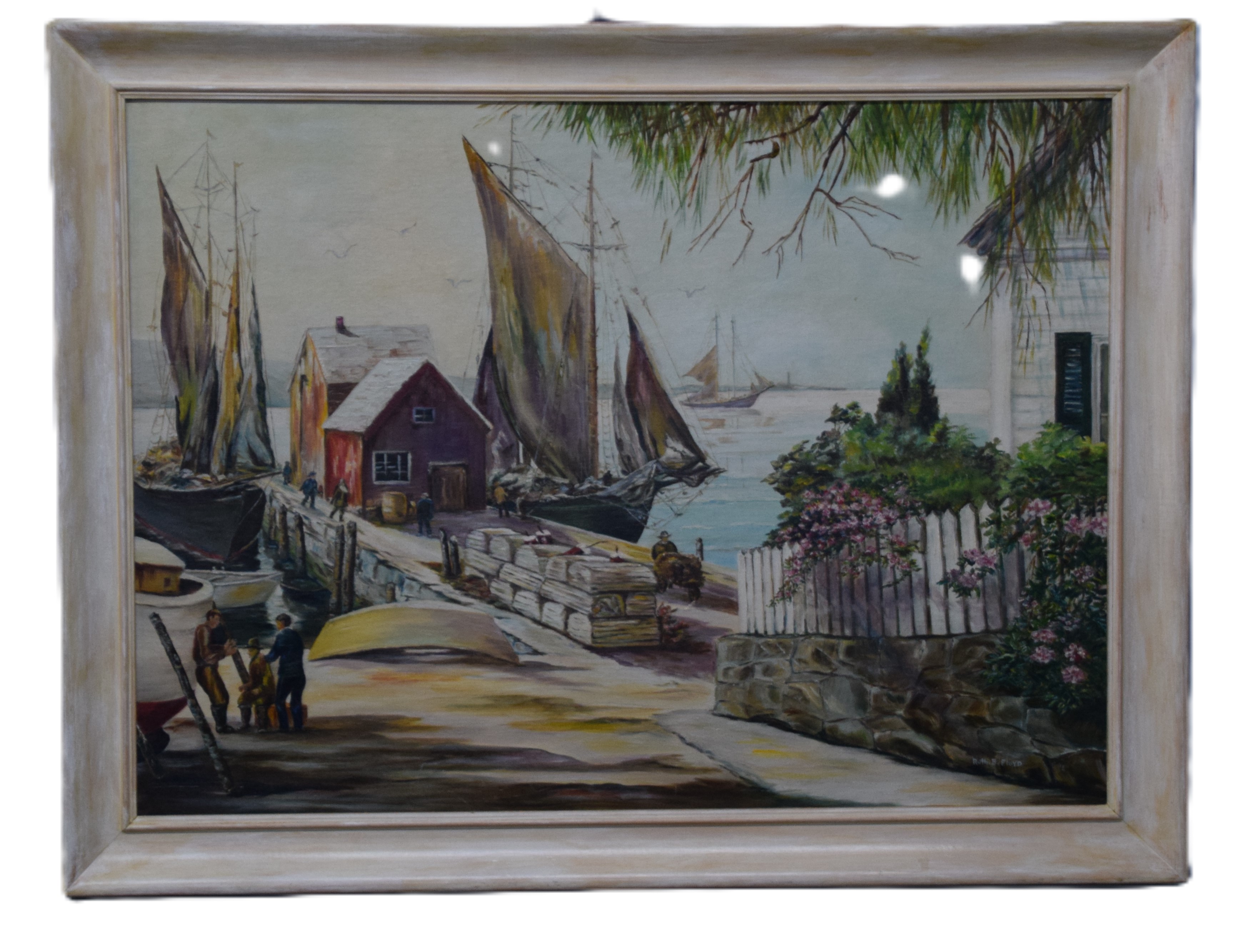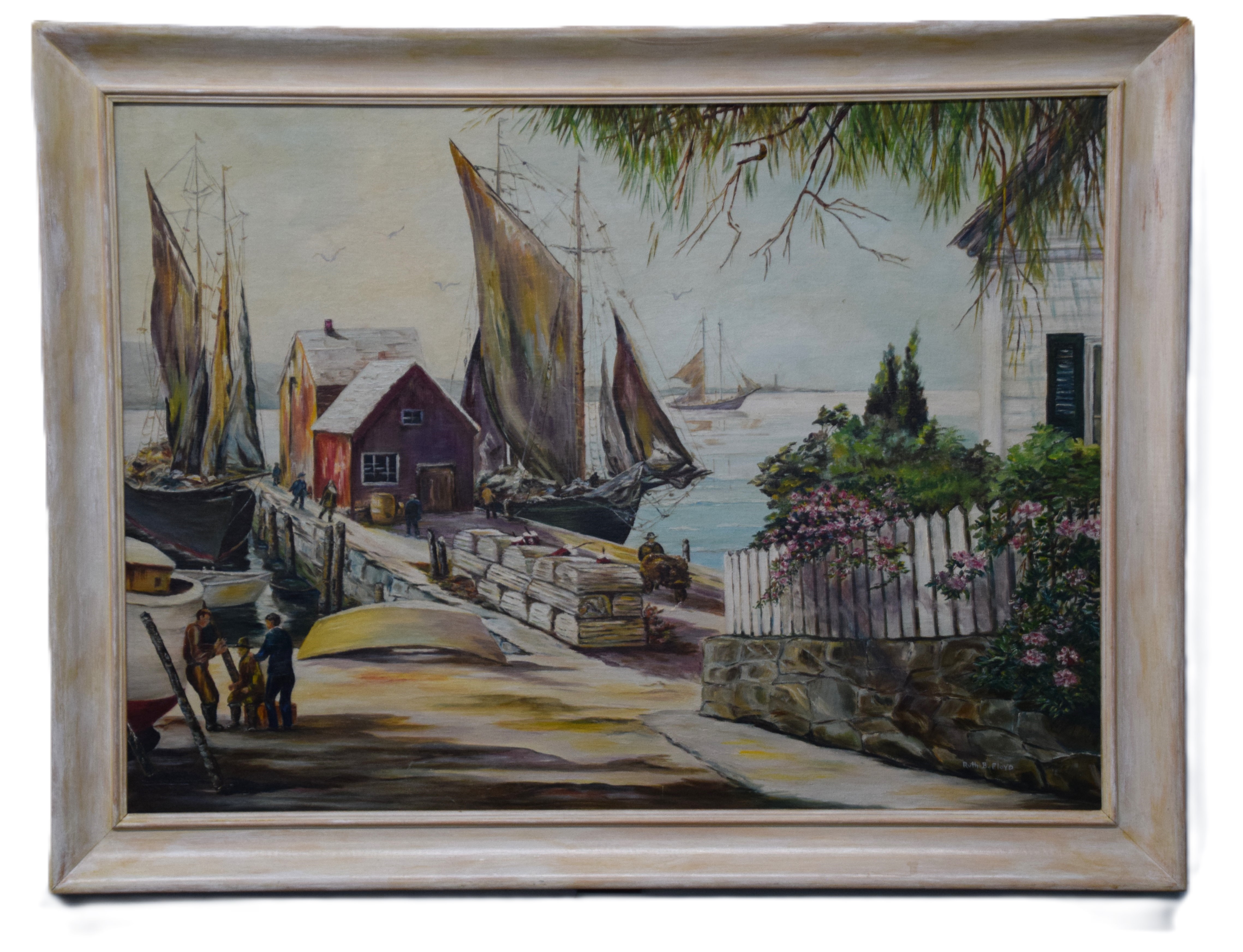 20th Century oil on artist board port scene with three sailboats, wharf, lobster traps and fishermen. Seaside home, buildings on the wharf and lighthouse in the distance. Well done Rockport MA scene. Signed Lower Right, Ruth B. Floyd. Dimensions: 21″ x 29.5″ Image size; 26″ x 34″ Overall