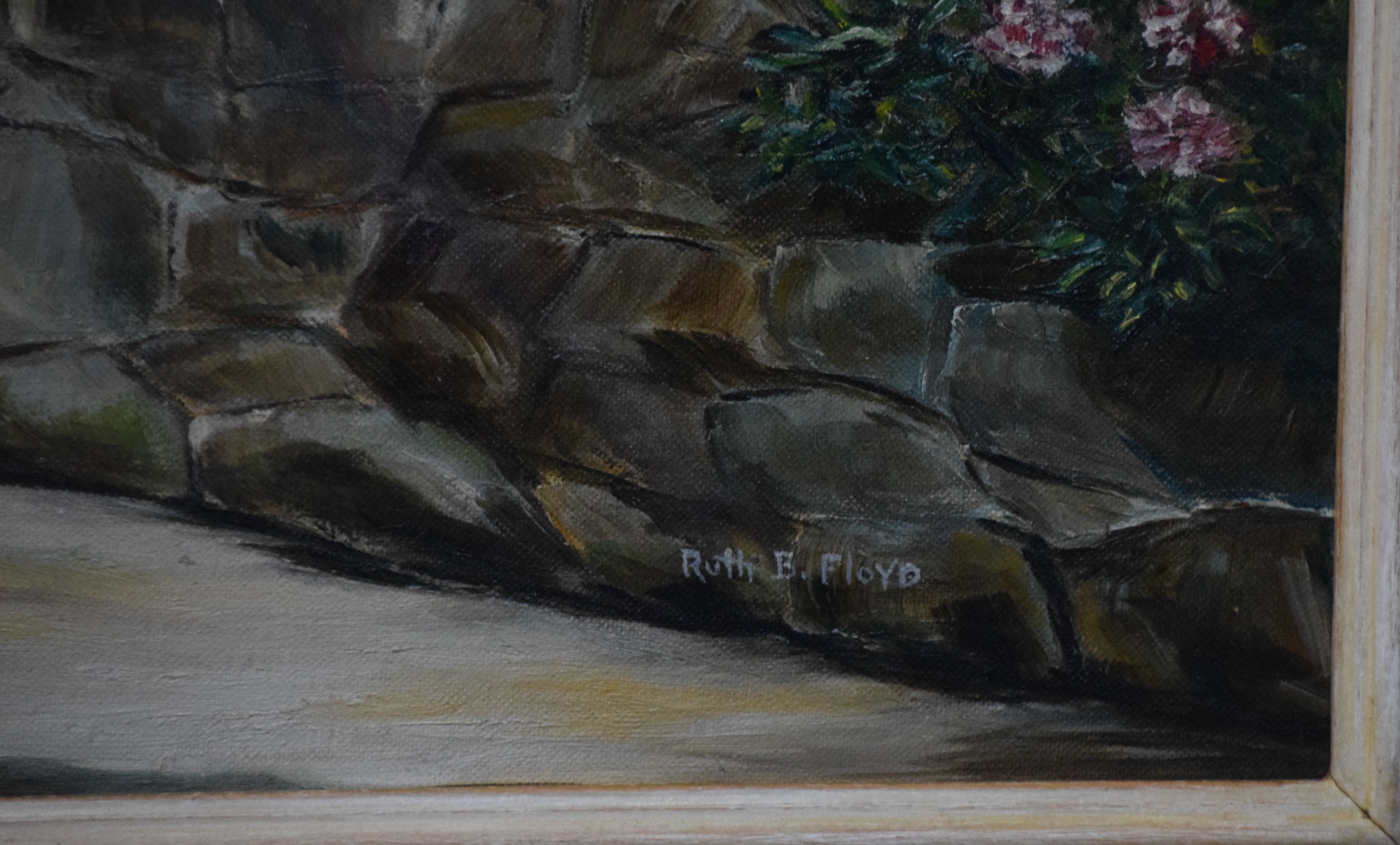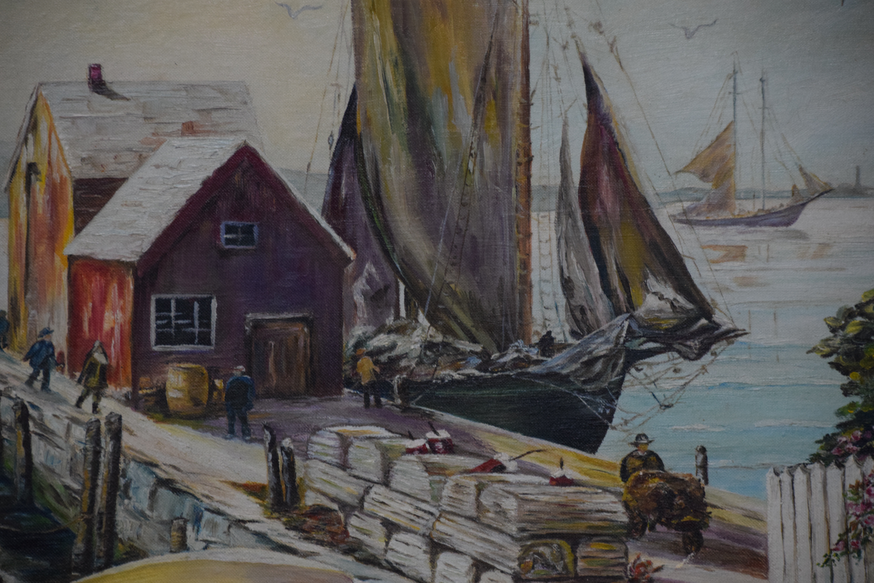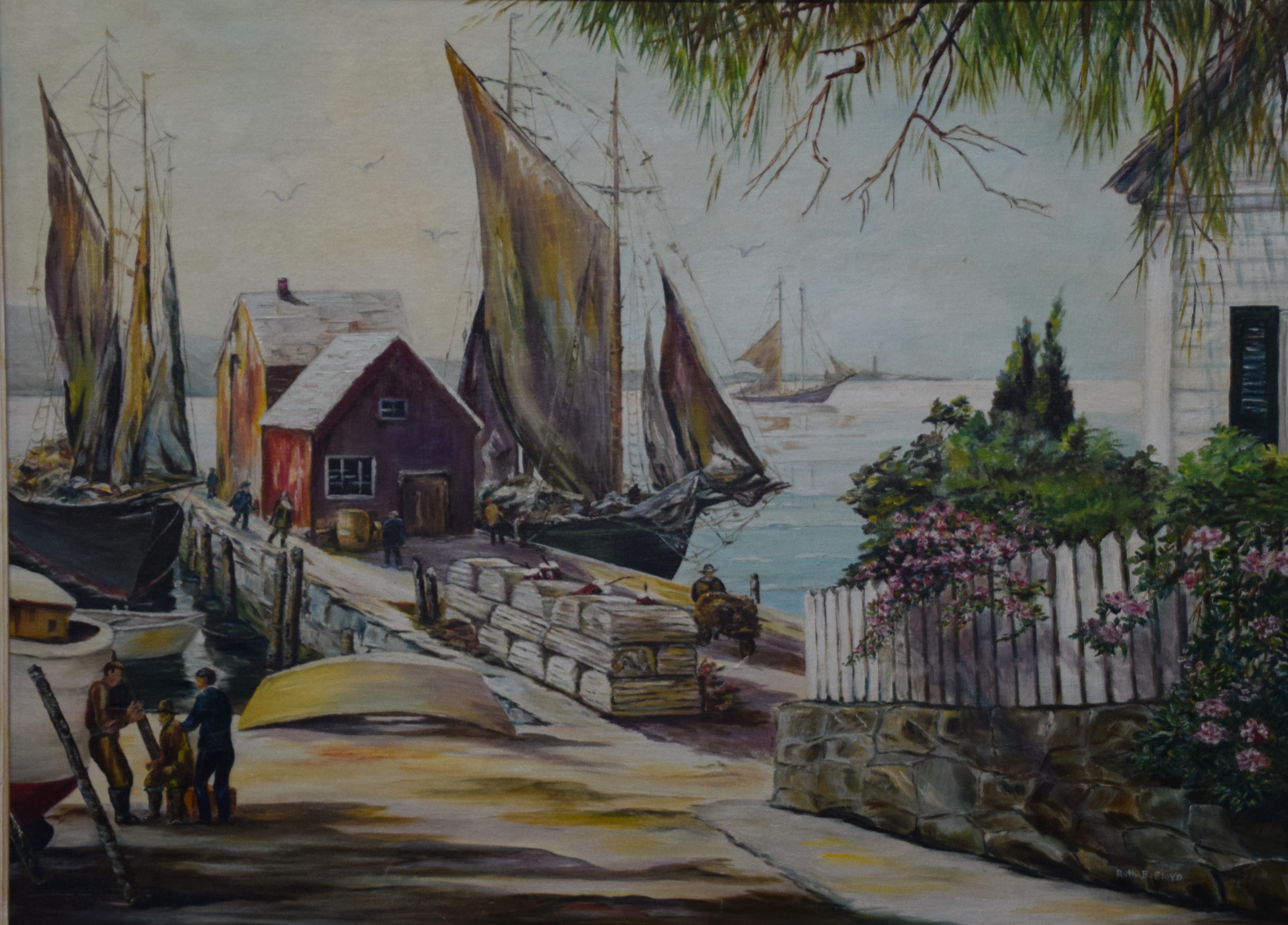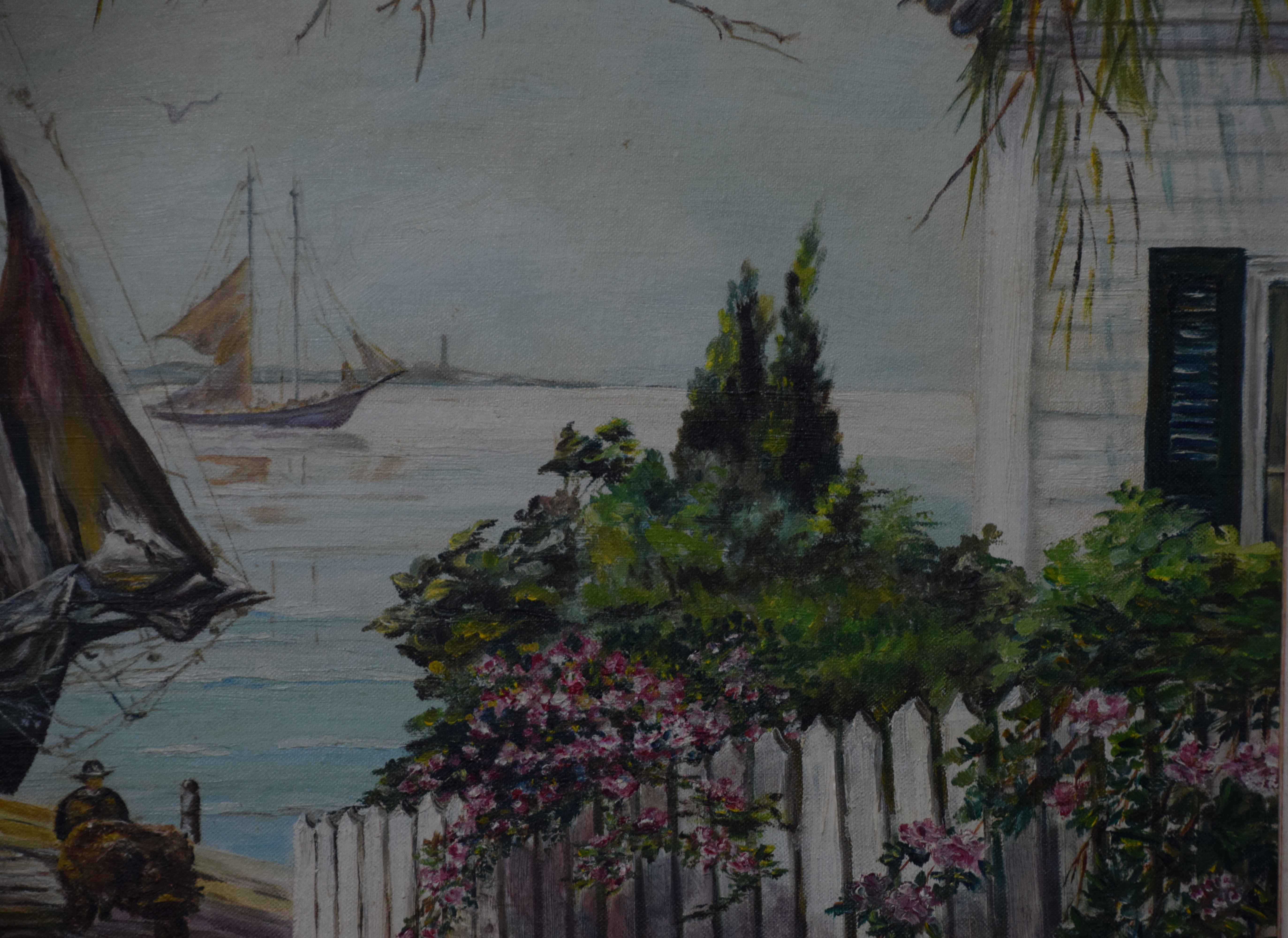 20th Century oil on artist board port scene with three sailboats, wharf, lobster traps and fishermen. Seaside home, buildings on the wharf and lighthouse in the distance. Well done Rockport MA scene. Signed Lower Right, Ruth B. Floyd. Dimensions: 21″ x 29.5″ Image size; 26″ x 34″ Overall