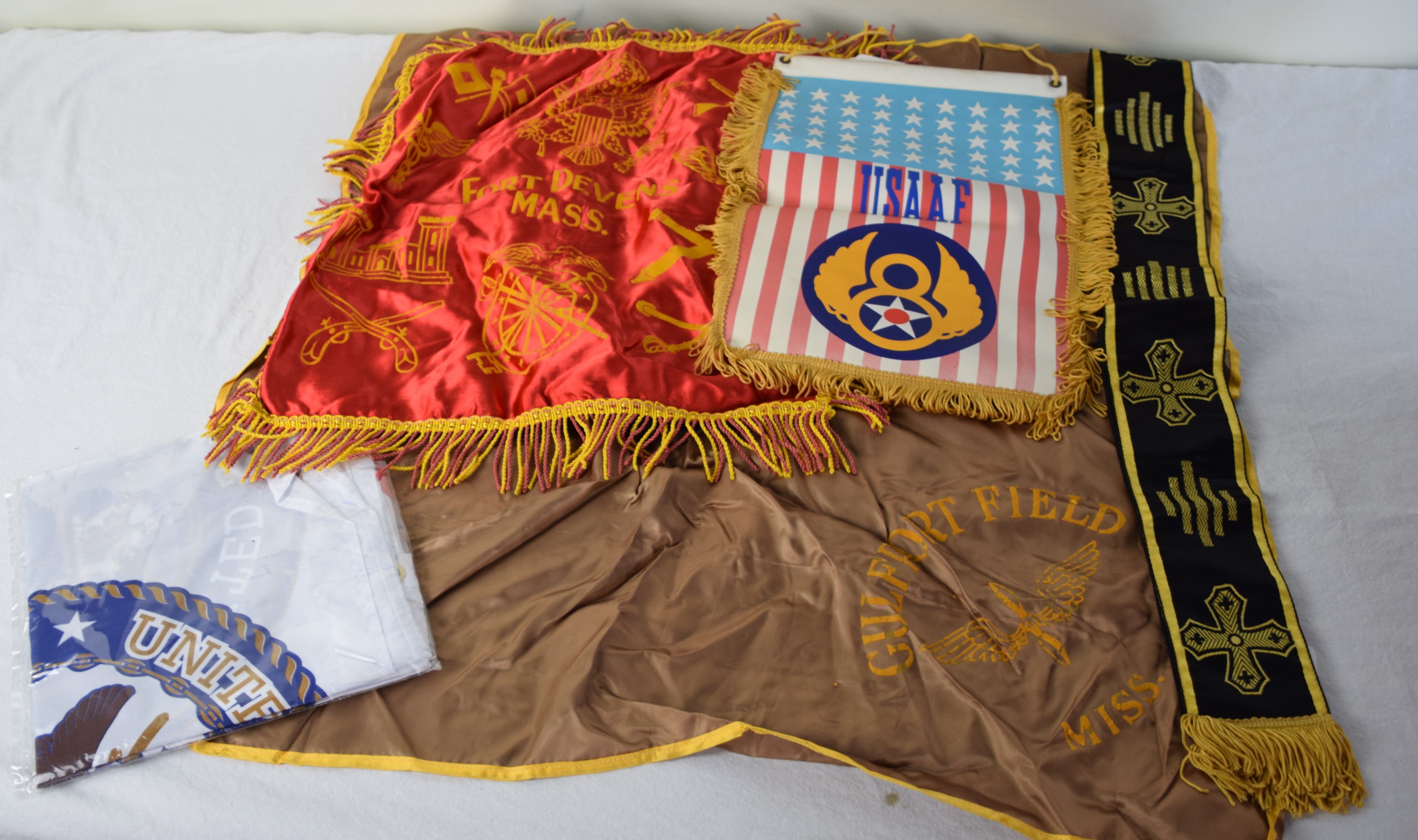 Collection of several military banners to include the 8th Air Force, Ft Devins MA, Gulfport Field Miss., Reserve Officer’s Banner and more. Various sizes