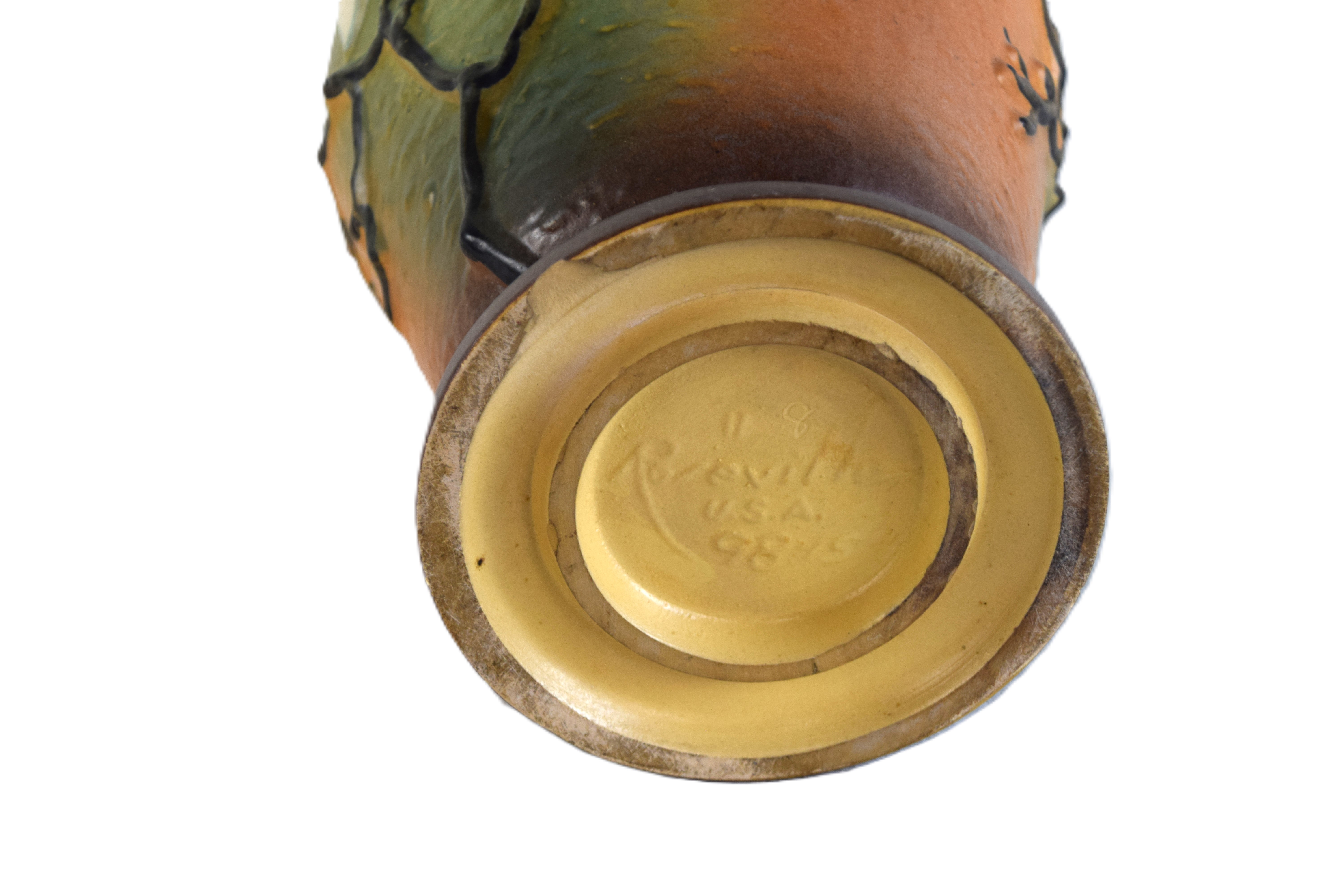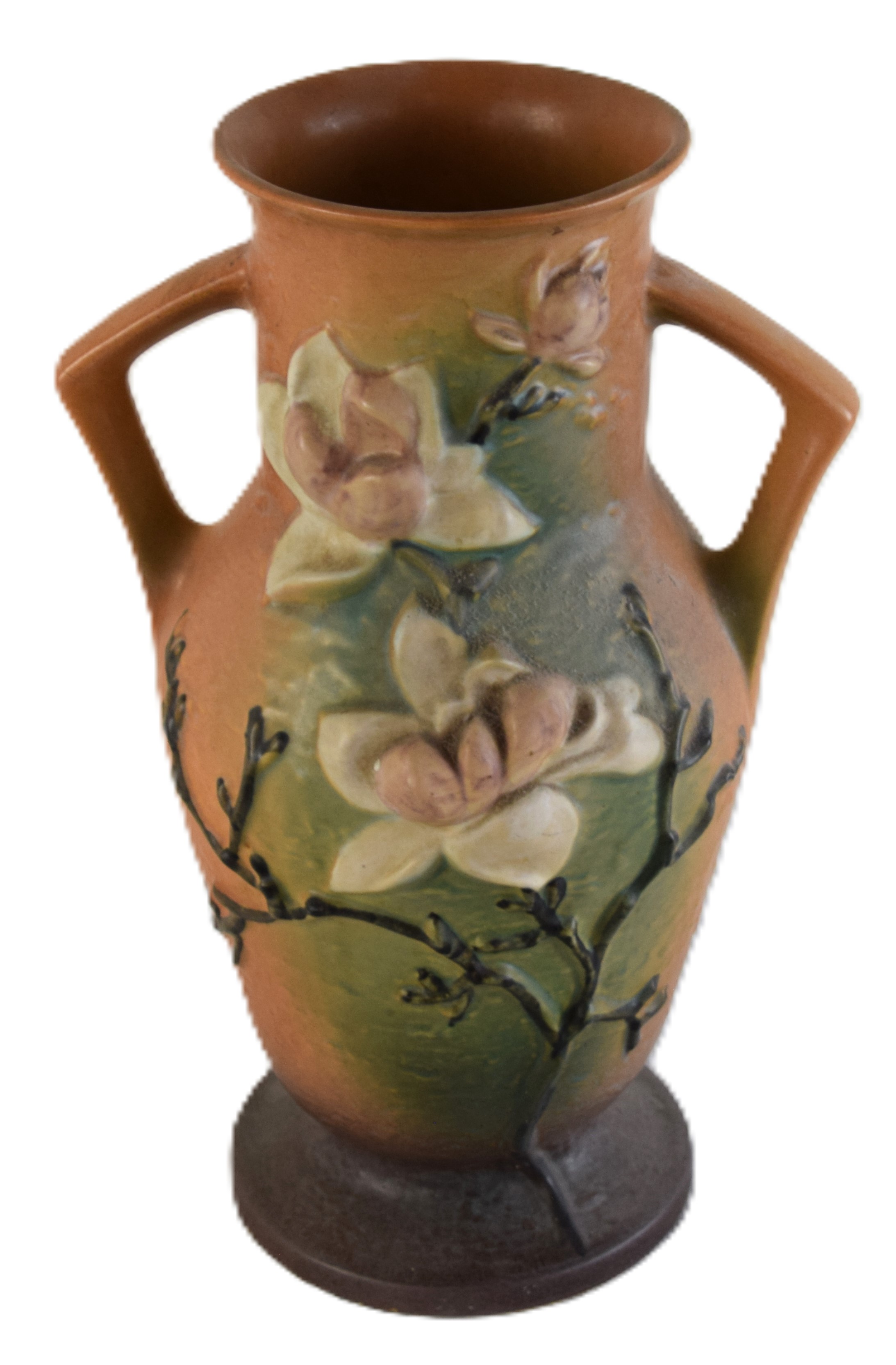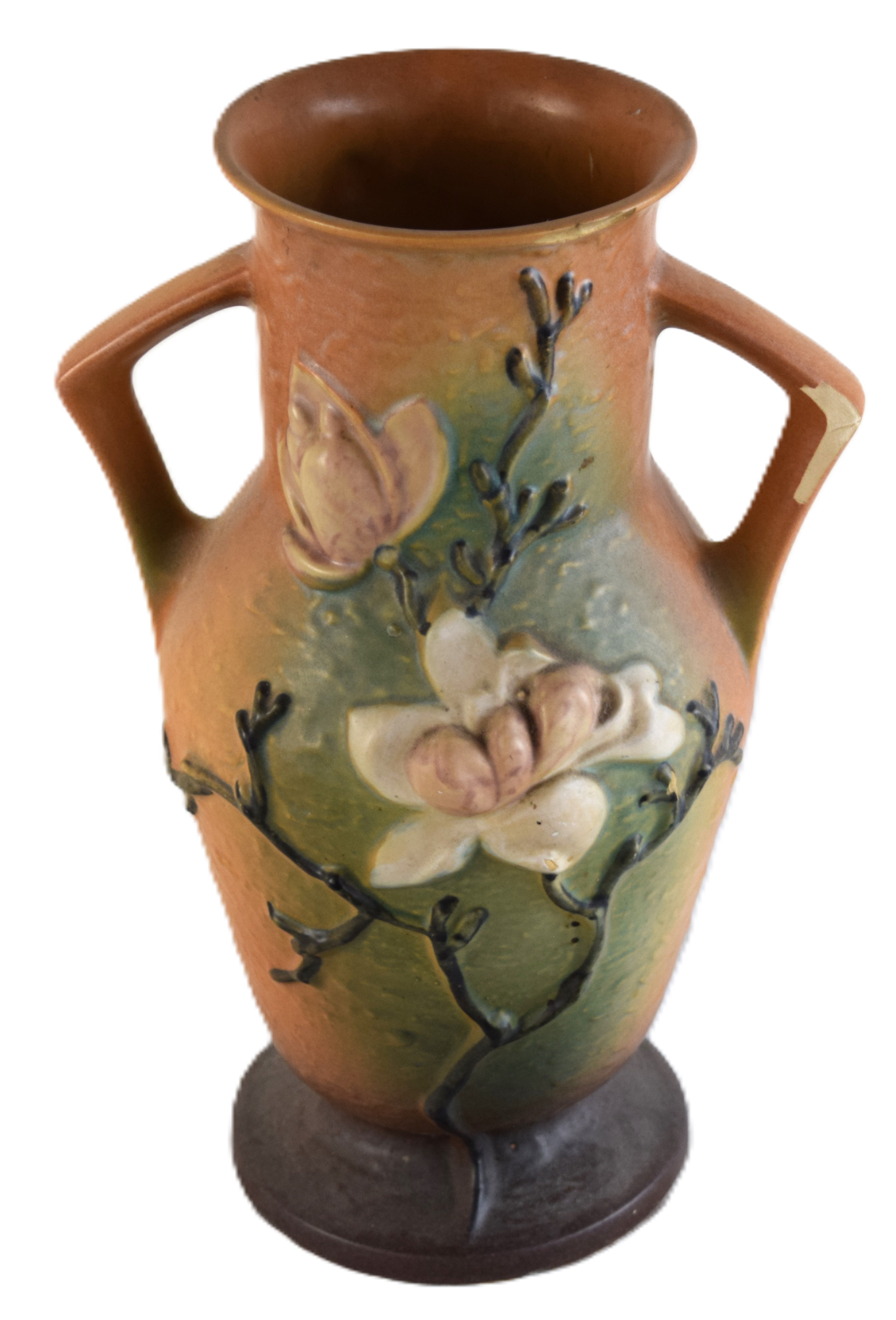 Large Roseville vase with two handles marked Roseville. Dimensions: 15.5″ H
