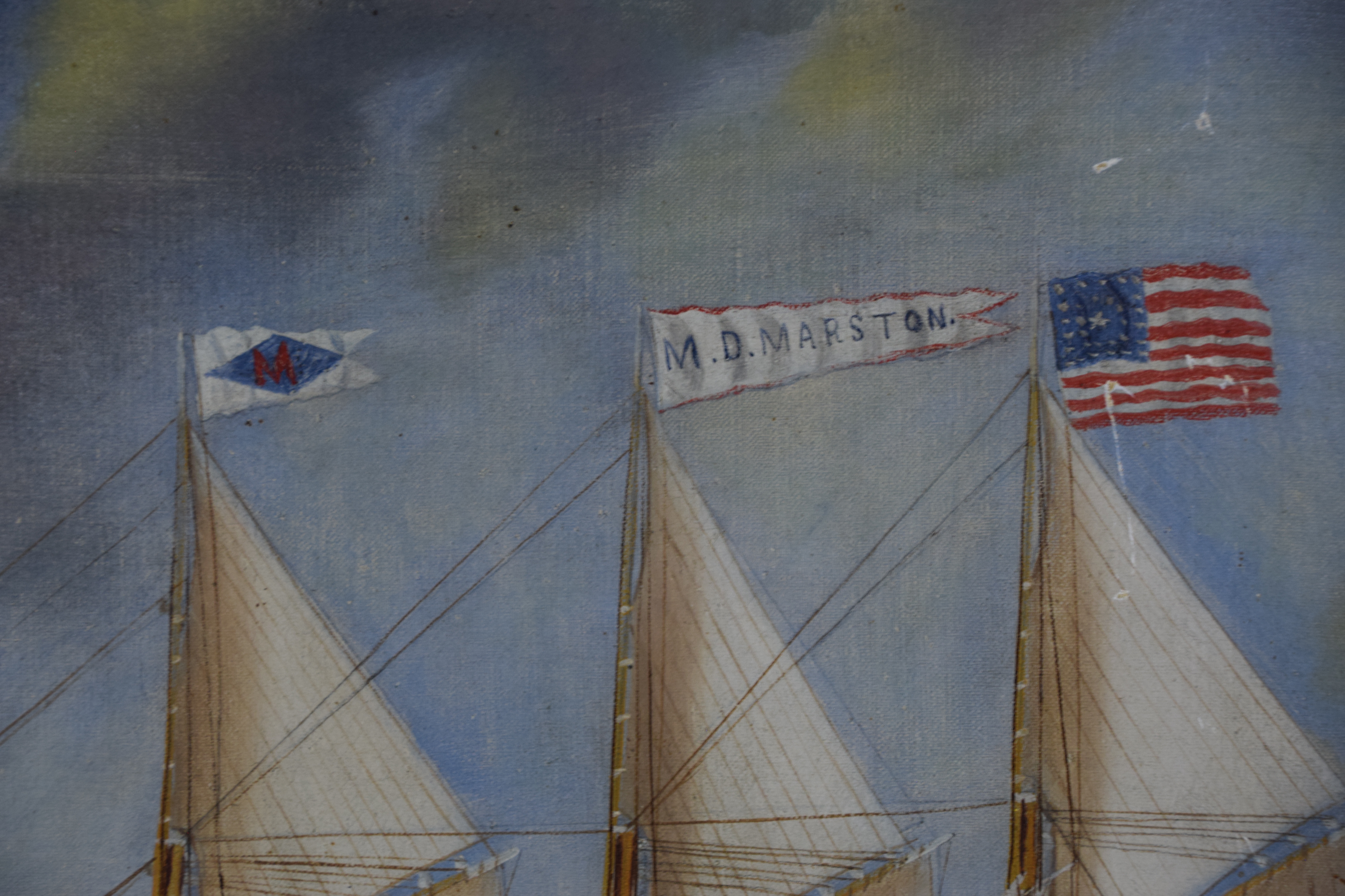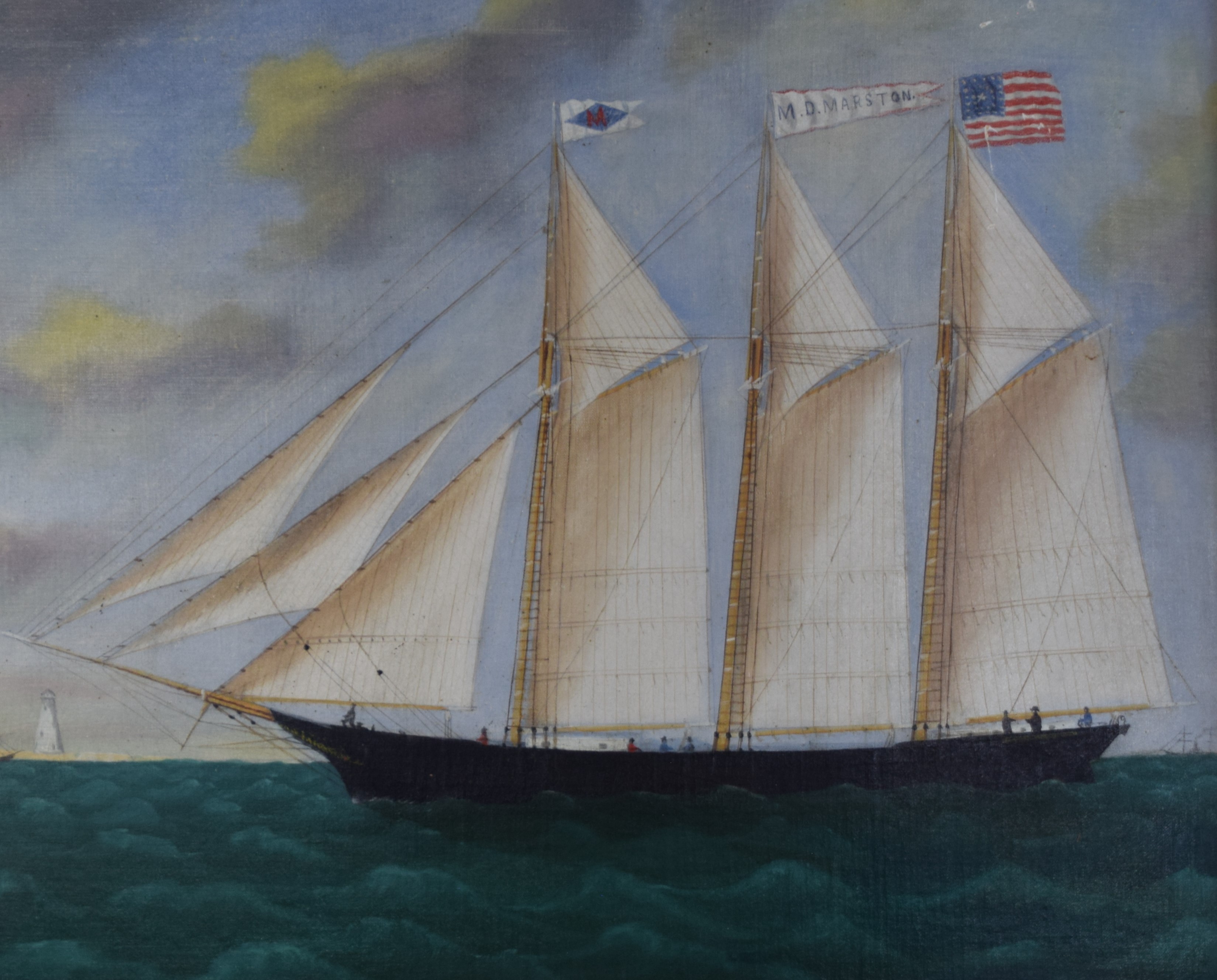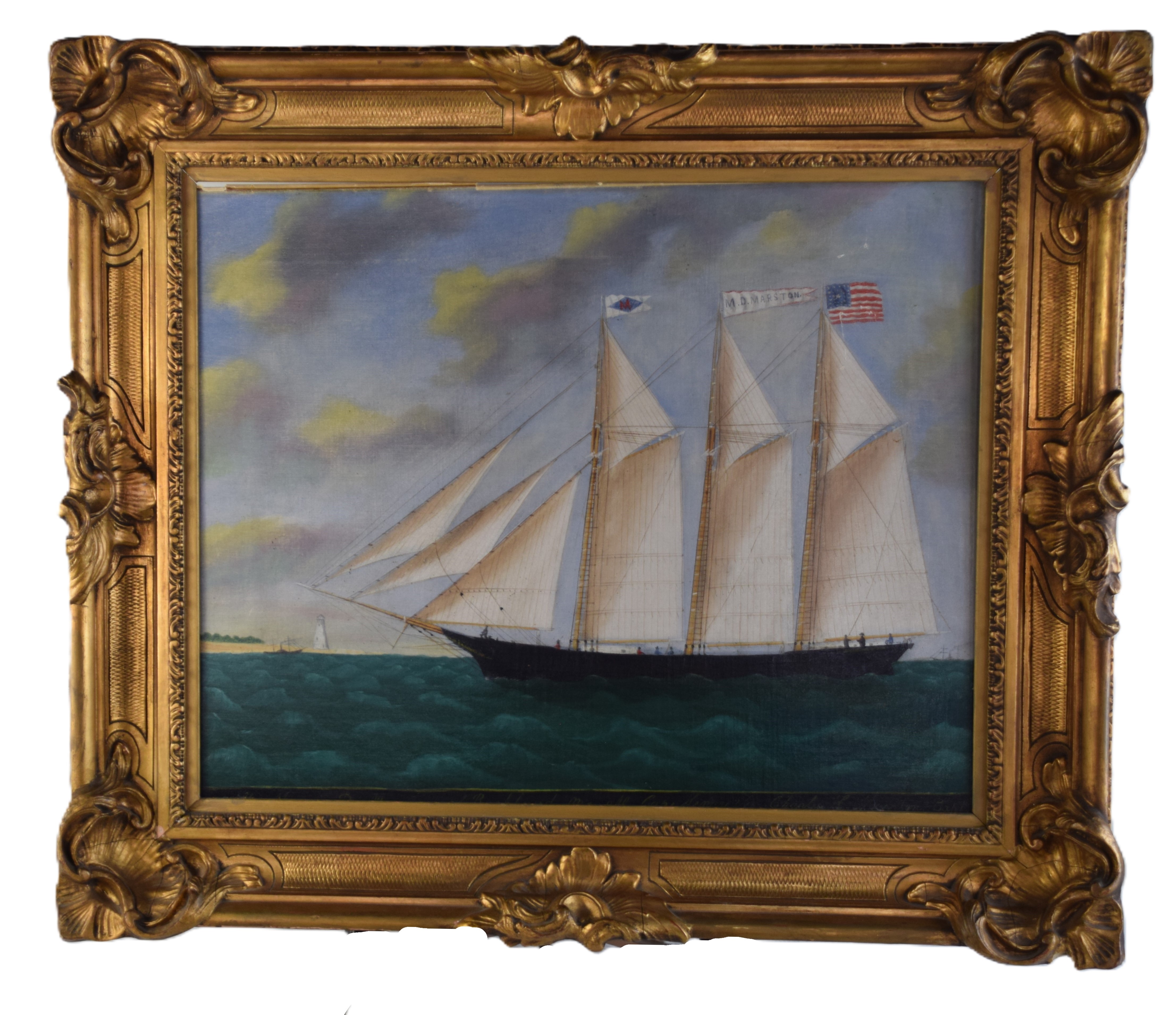 Framed 3 masted ship, Schooner M.D. Marston, oil on board attributed to William Hare, circa 1860. William Hare (1815-1865) was born in England and immigrated to America in 1842 where he established his studio in Baltimore. He would live in Baltimore and paint marine views and ship portraits such as this for the remainder of his life. Dimensions: 21.5″ x 26.5″ Image size, 30″ x 34″ Overall