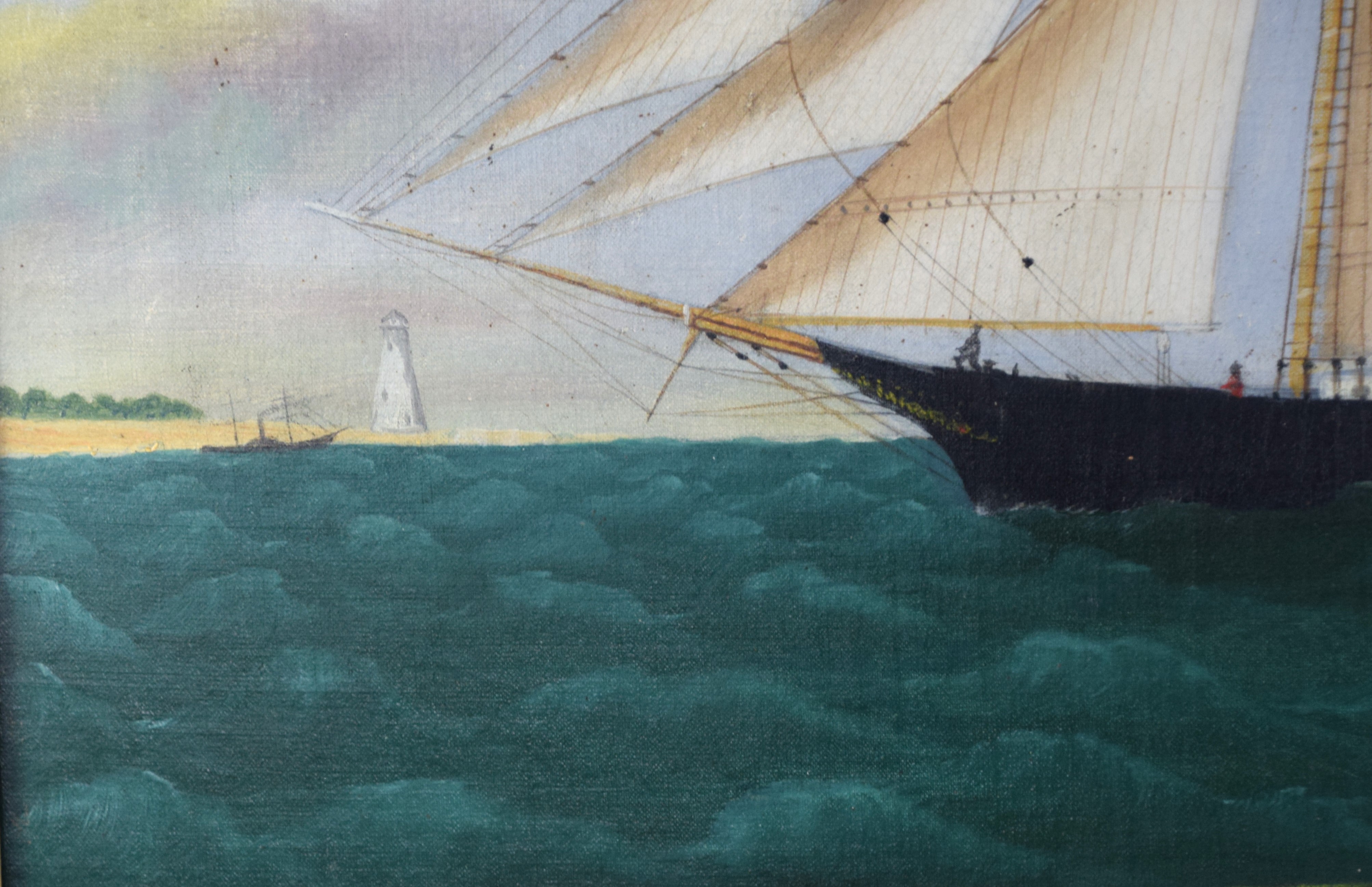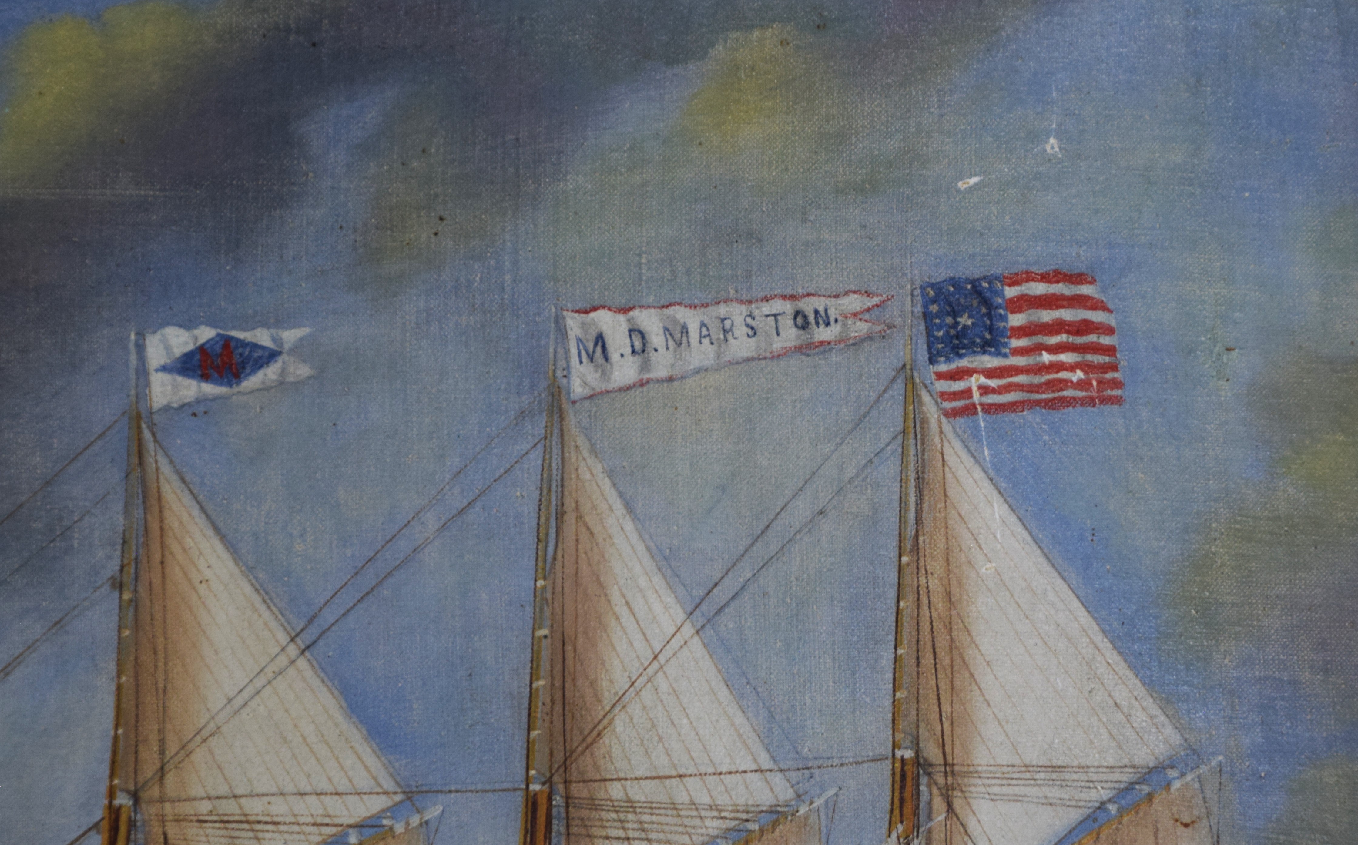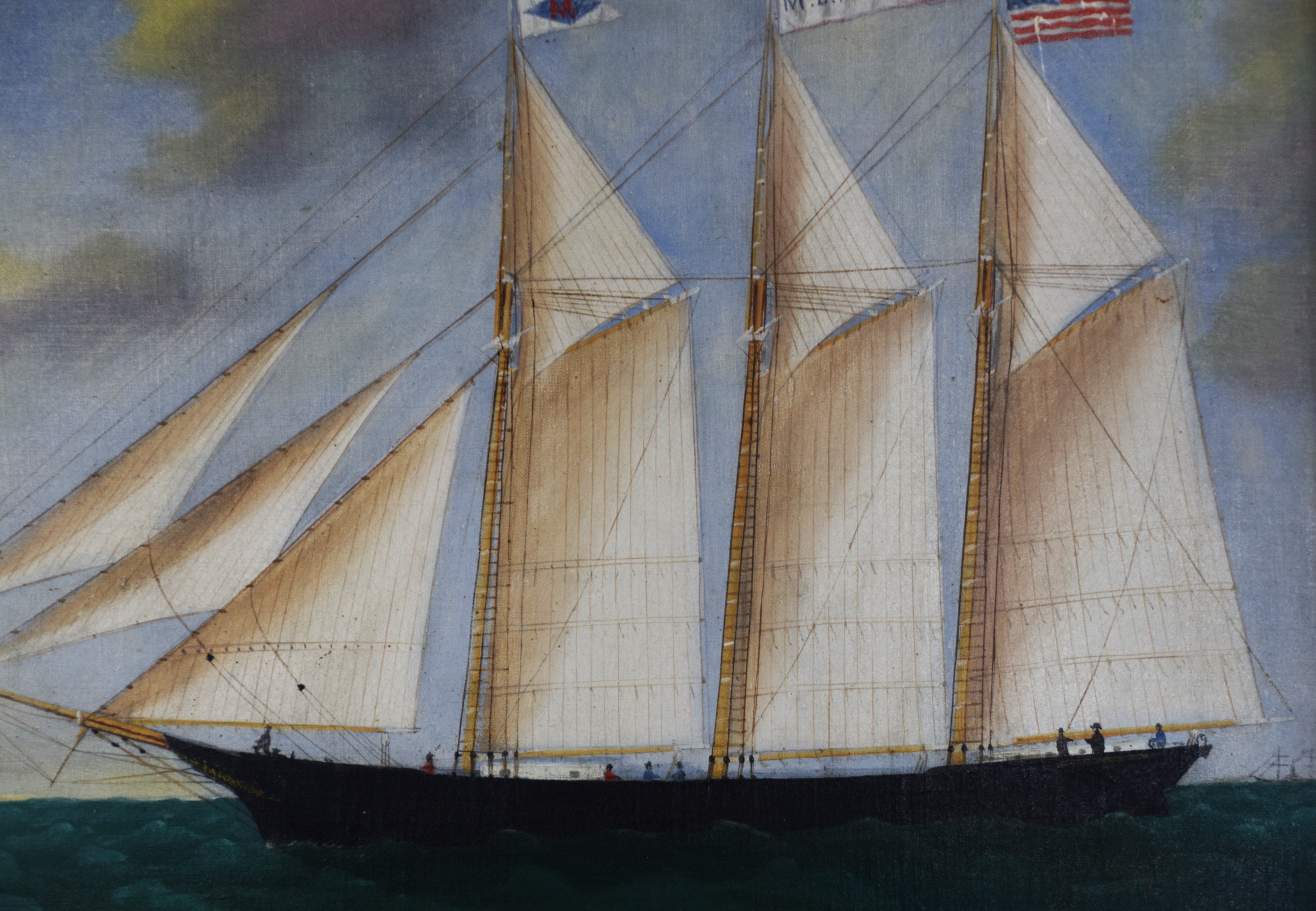 Framed 3 masted ship, Schooner M.D. Marston, oil on board attributed to William Hare, circa 1860. William Hare (1815-1865) was born in England and immigrated to America in 1842 where he established his studio in Baltimore. He would live in Baltimore and paint marine views and ship portraits such as this for the remainder of his life. Dimensions: 21.5″ x 26.5″ Image size, 30″ x 34″ Overall