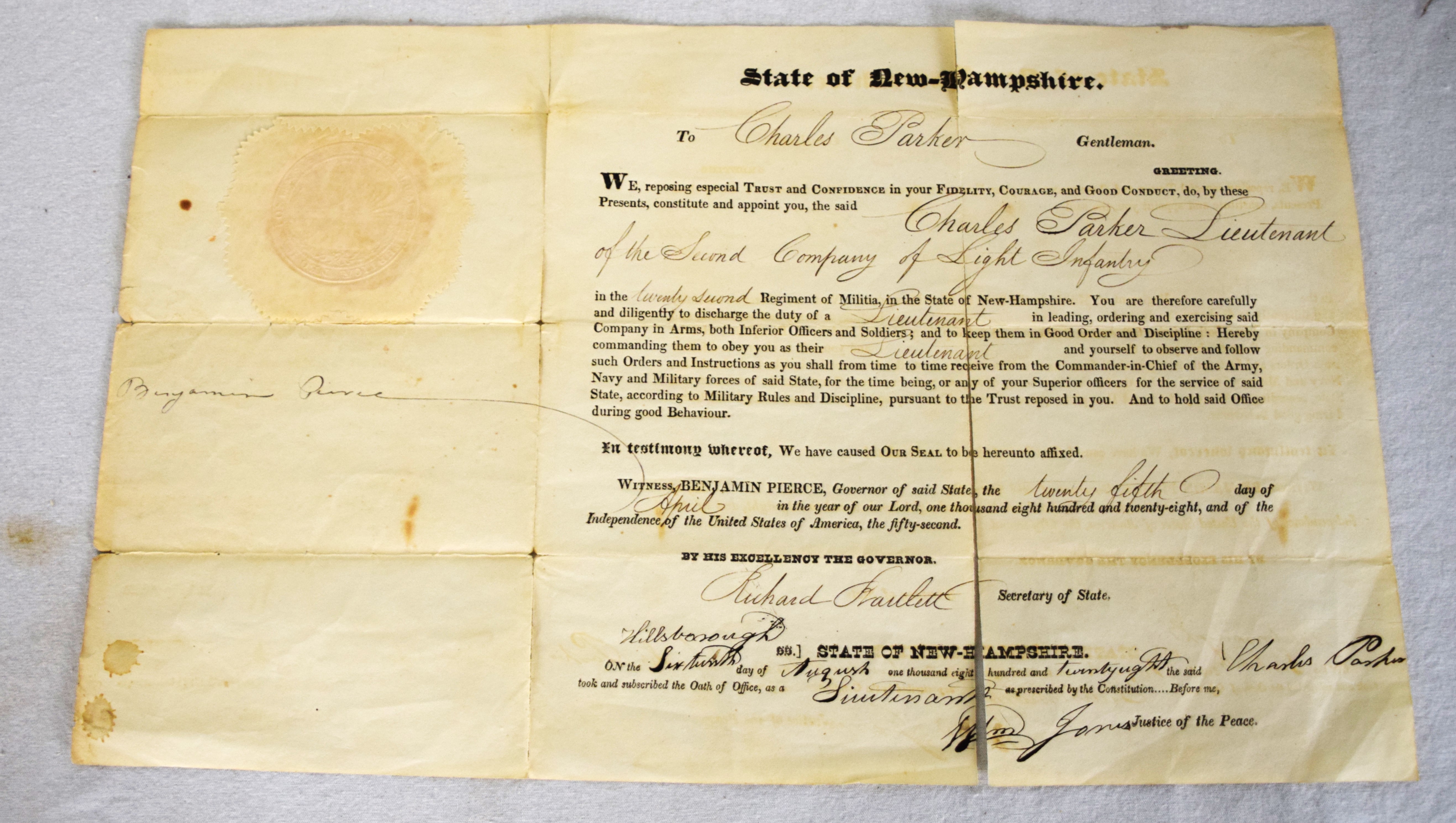 Appointment to Lieutenant of the 2nd New Hampshire Light Infantry Company for Charles Parker, 1828. Signed by Governor Benjamin Pierce with seal.