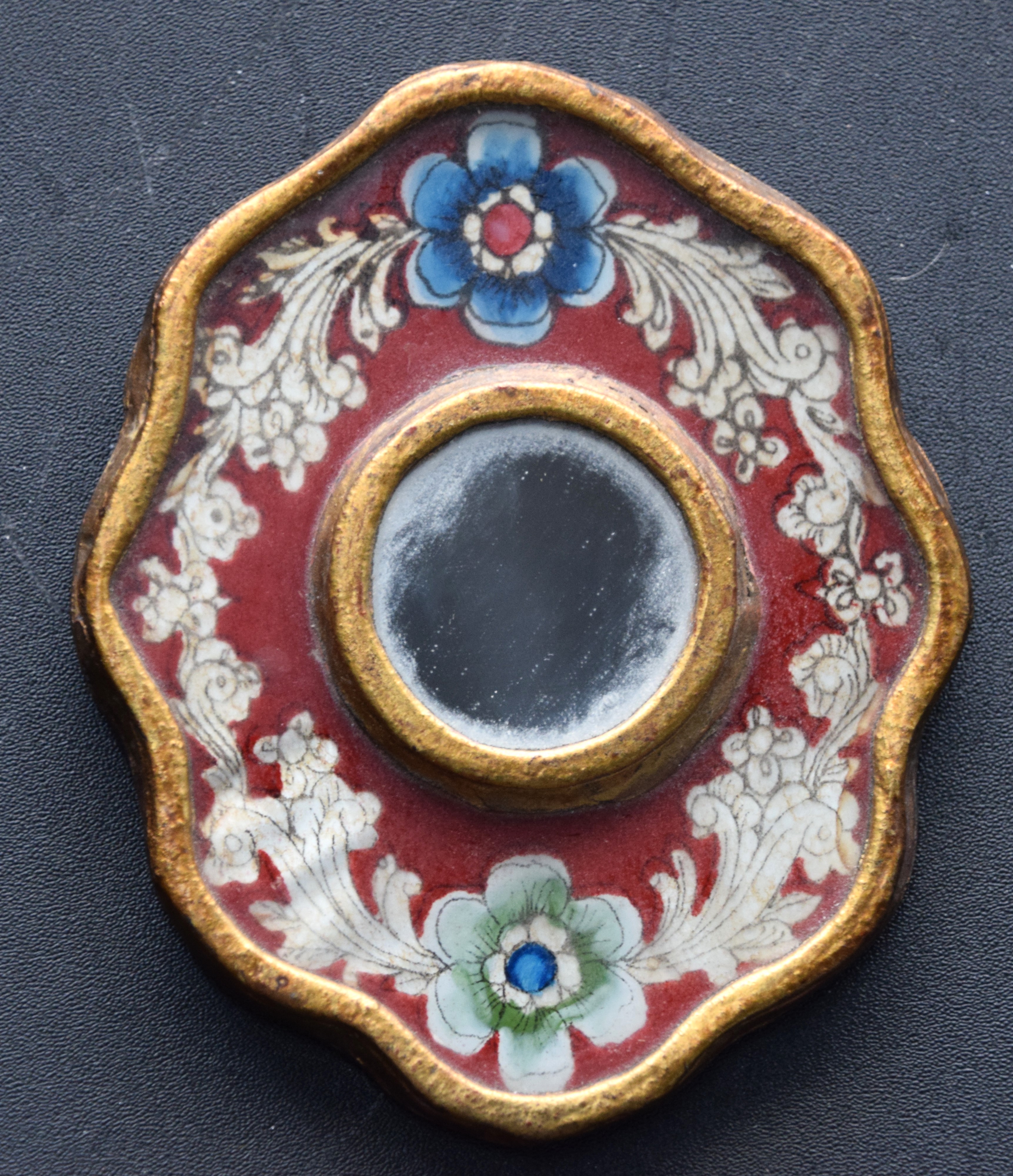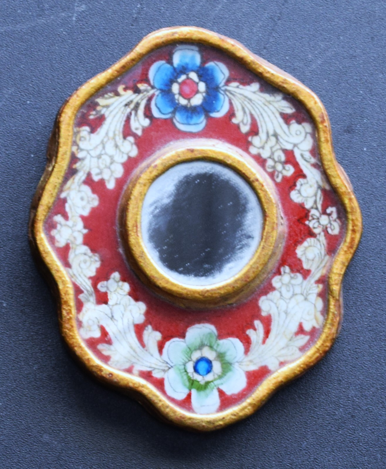 Victorian miniature mirror on wood with blue and silver floral decorations on a red background. Dimensions: 4″ x 3″