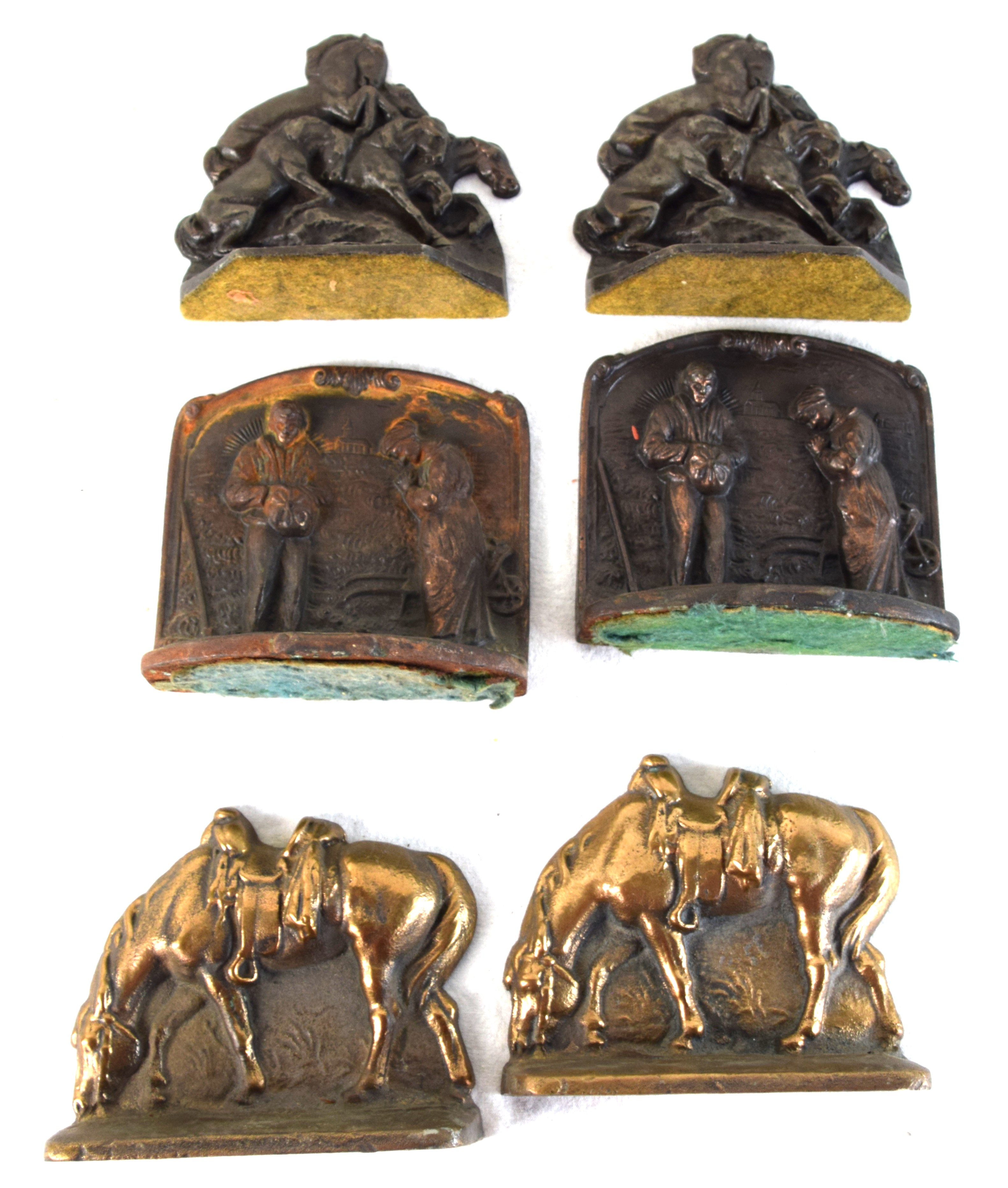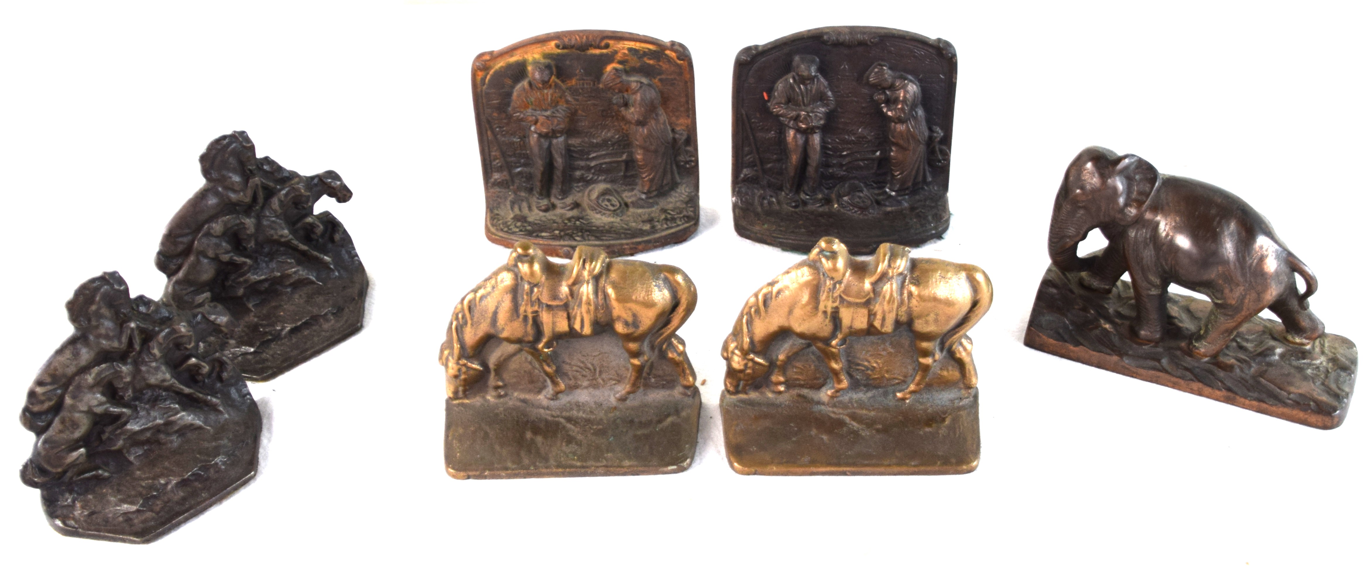 Three pair of bookends, one of a settler prying, two pair of horses and one brass elephant sculpture , 1927 by Gifthouse, NY NY(6.5″ L).