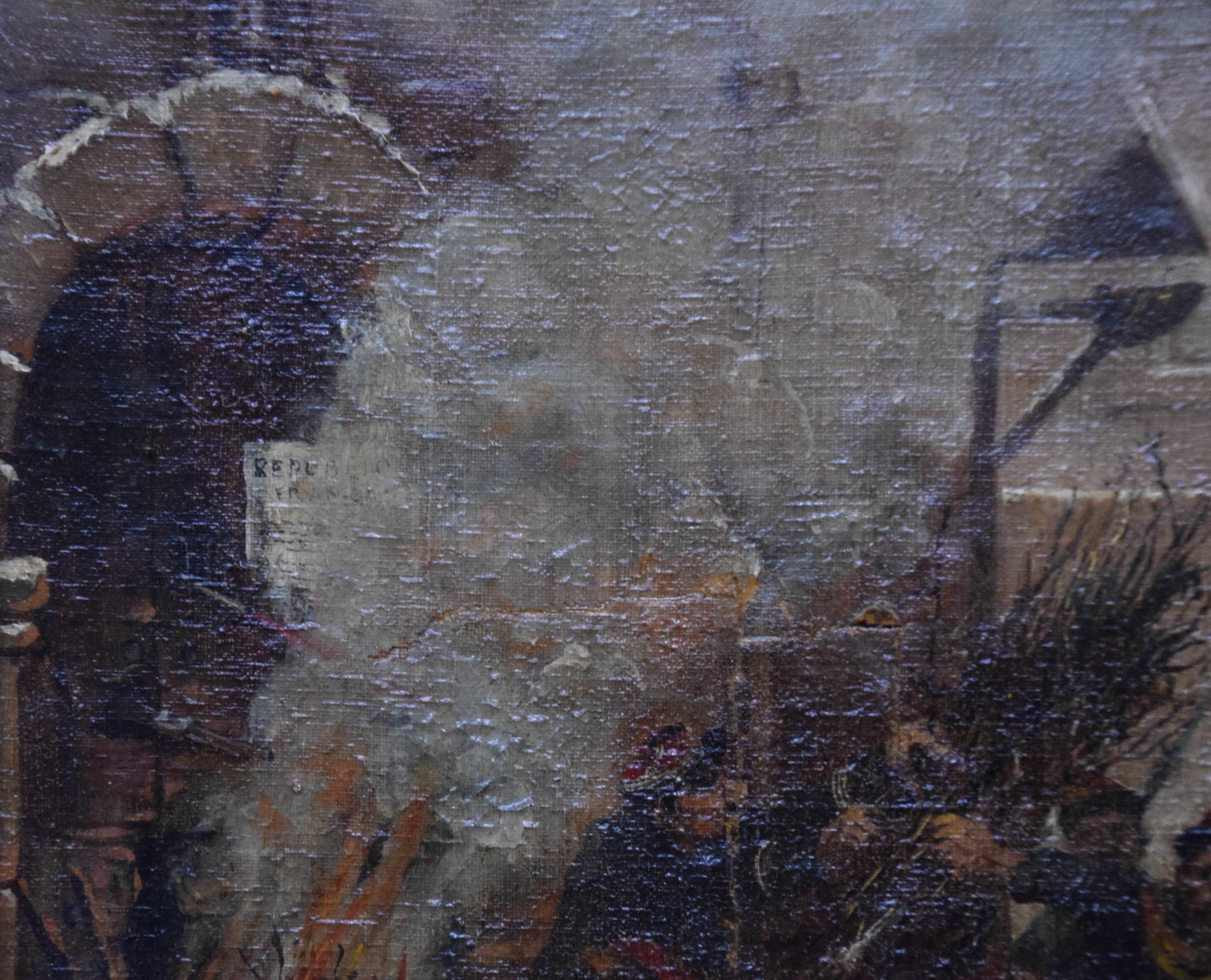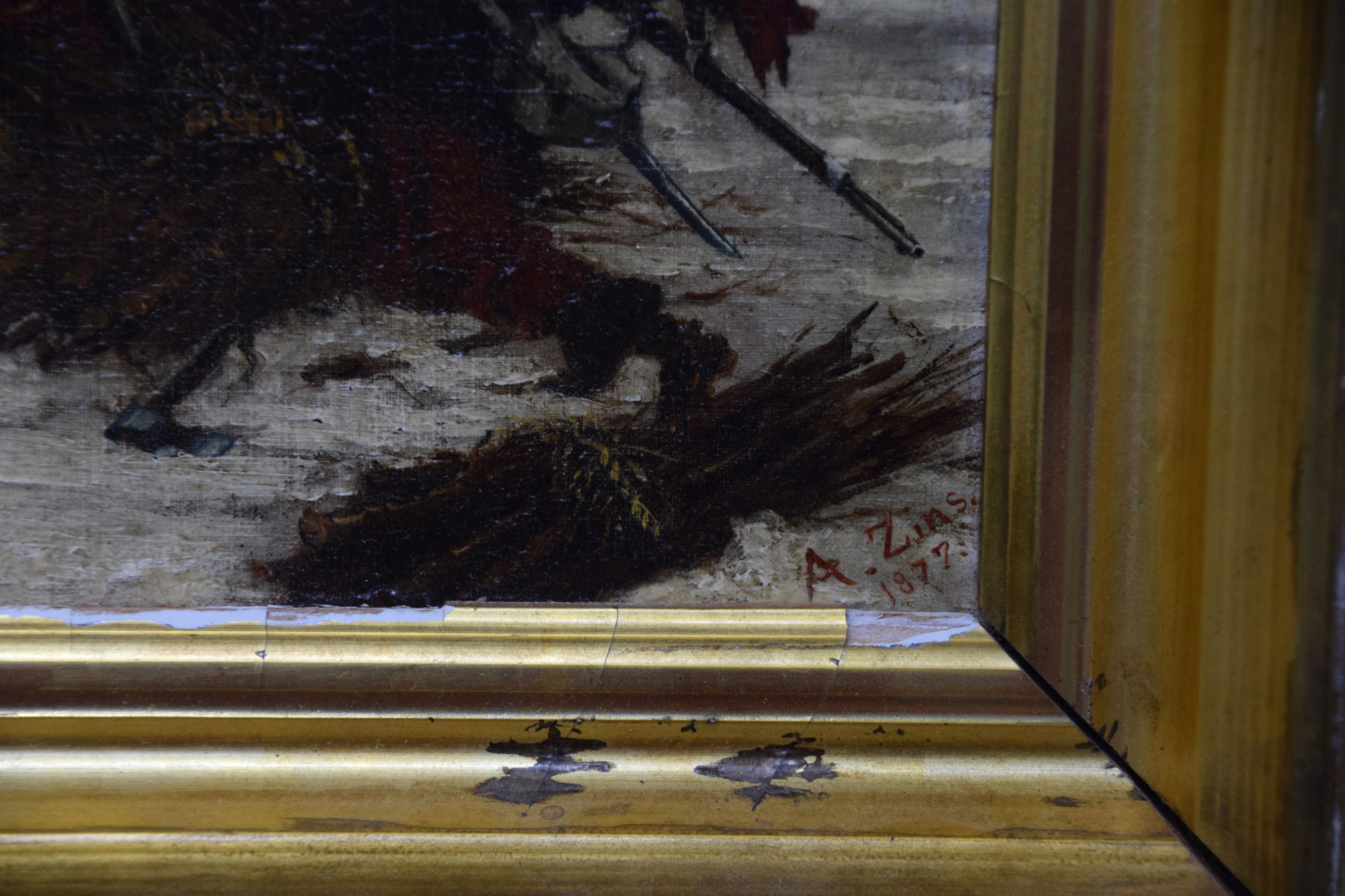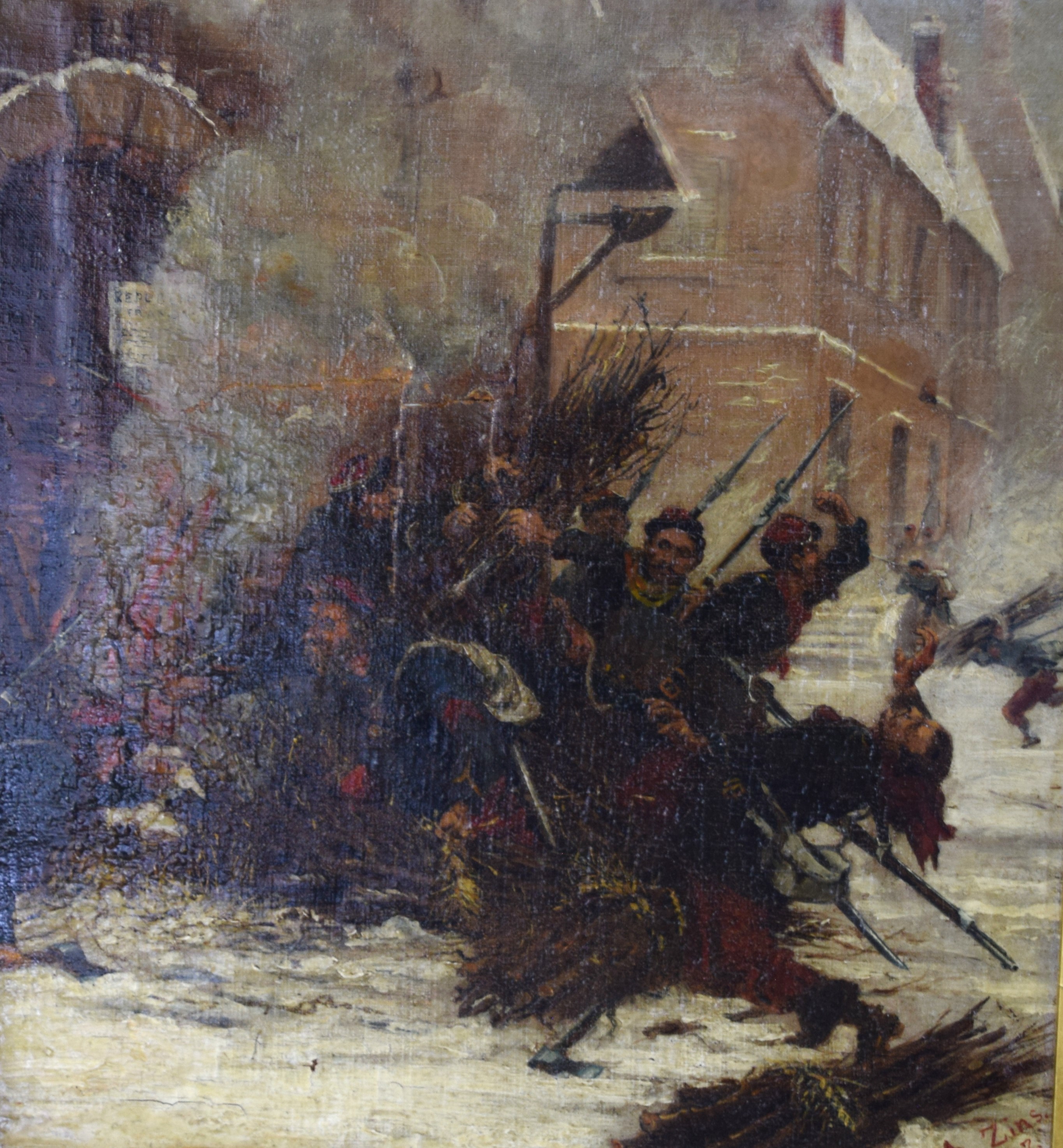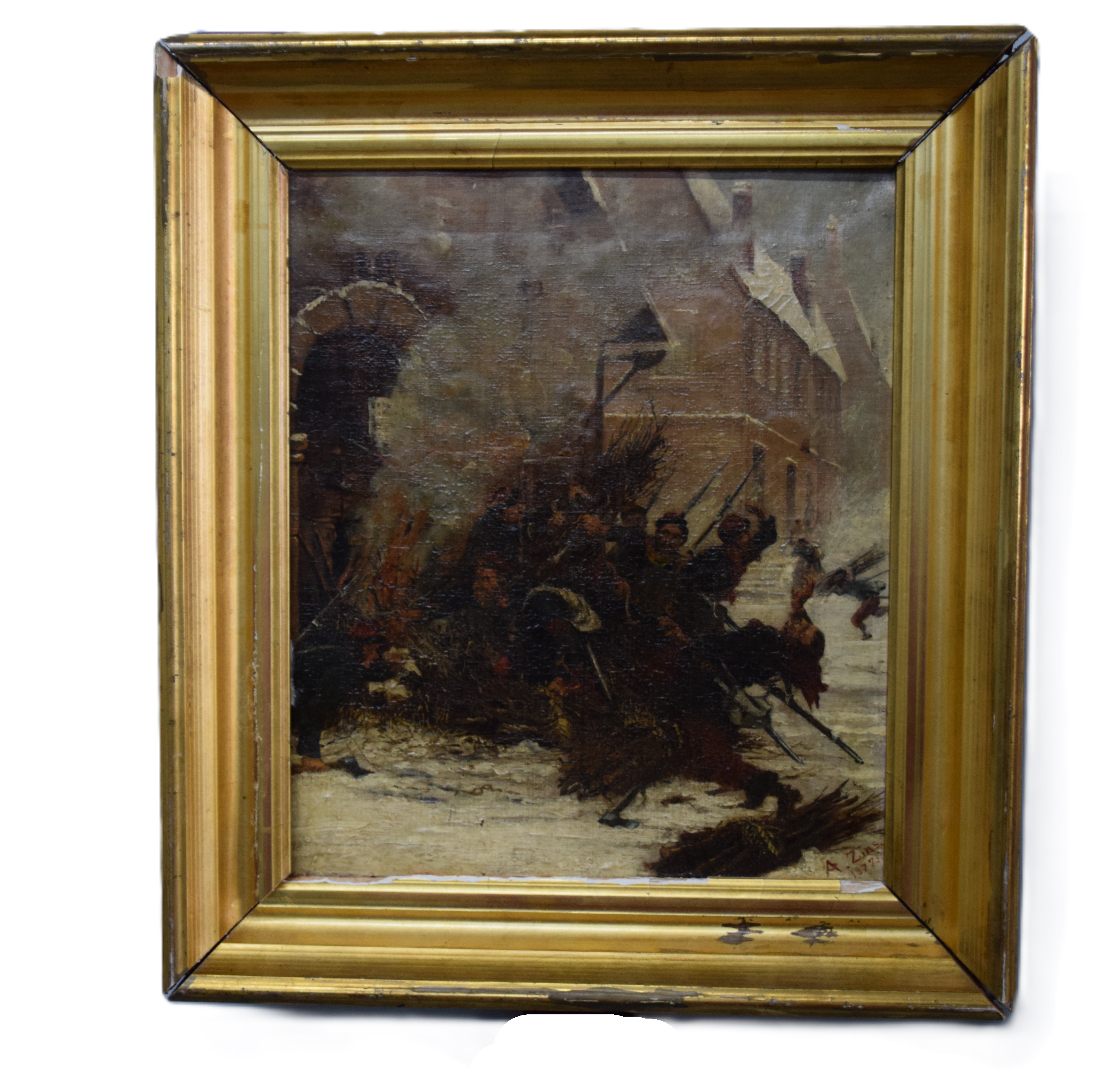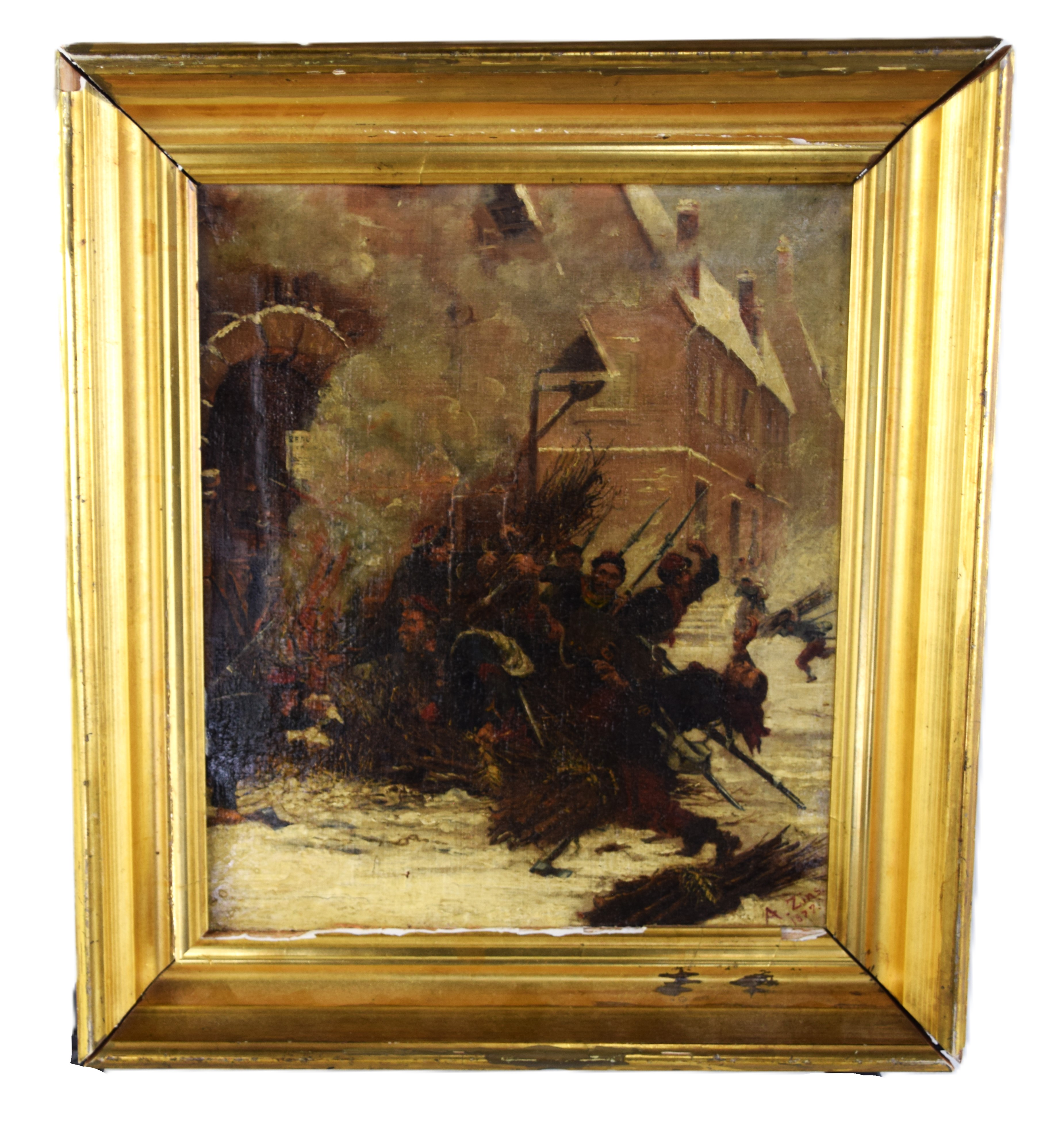 Framed and signed lower right and dated 1877, oil on canvas on board depicting French soldiers attacking a well defended Republic home using fire. Alexander Zins was born in France and became an active painter in California known for painting murals in the Catholic Cathedral in Los Angeles and was a colleague of Leon Trousset. Dimensions: 12″ x 10″ Image size, 16″ x 14.5″ Overall