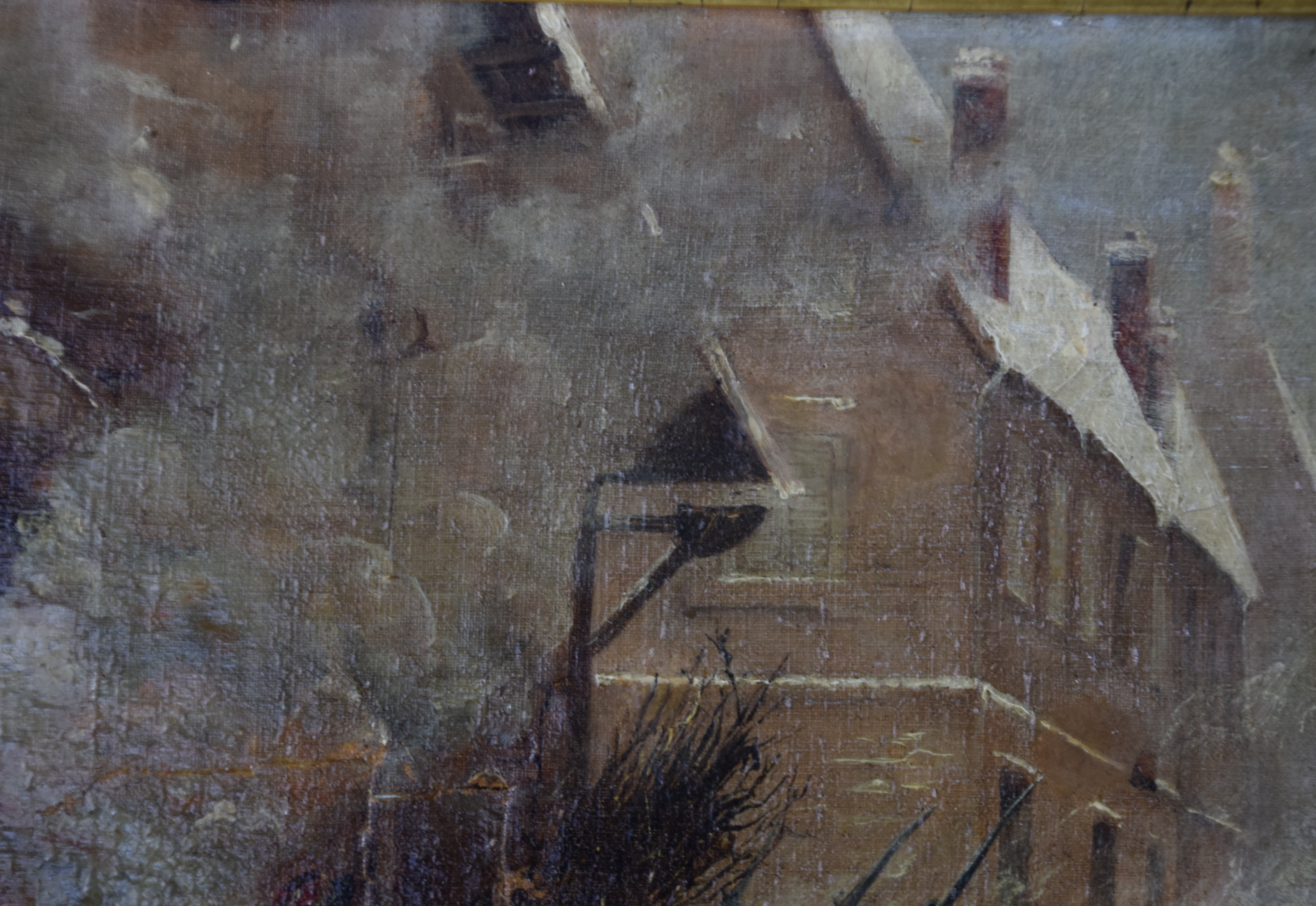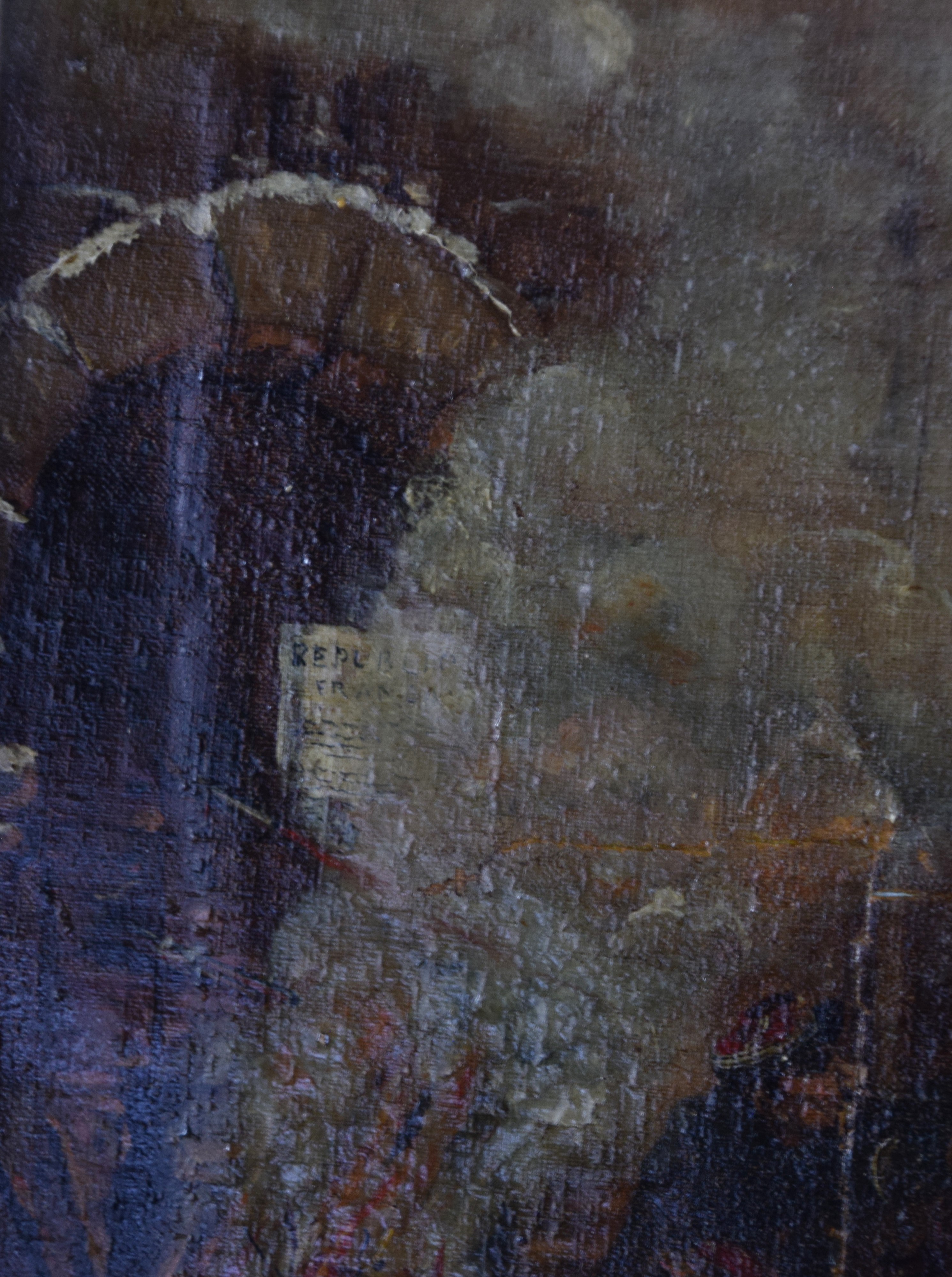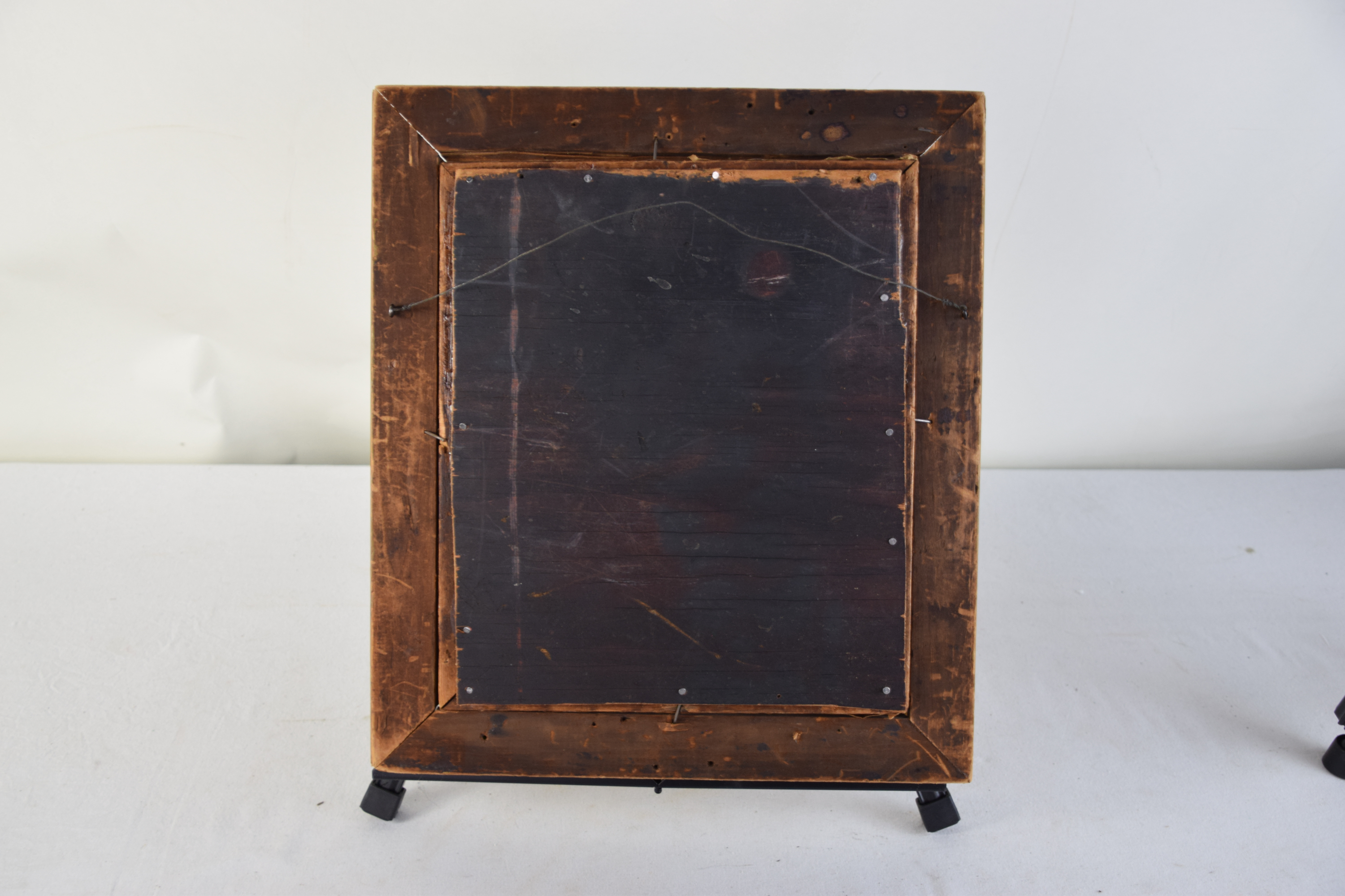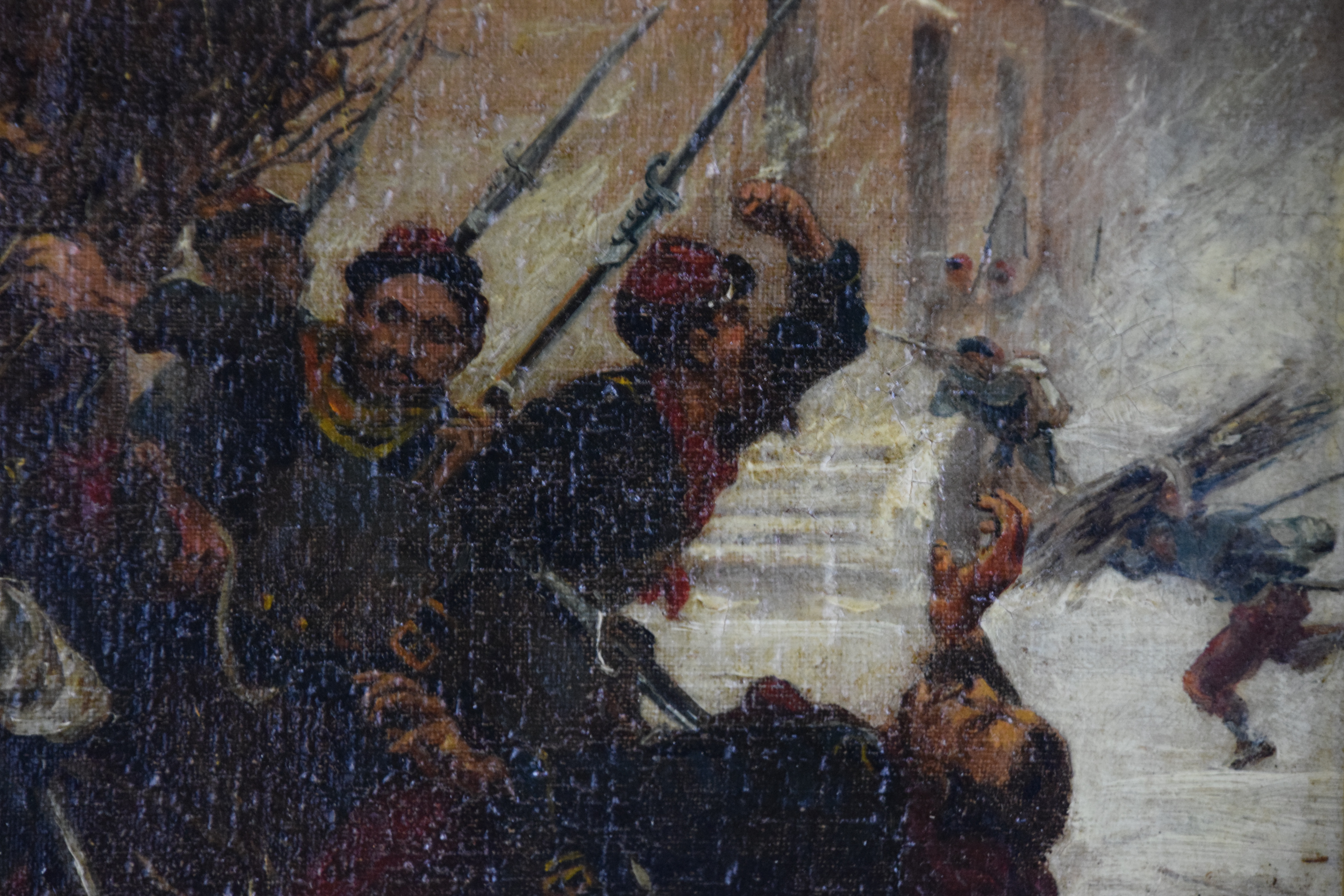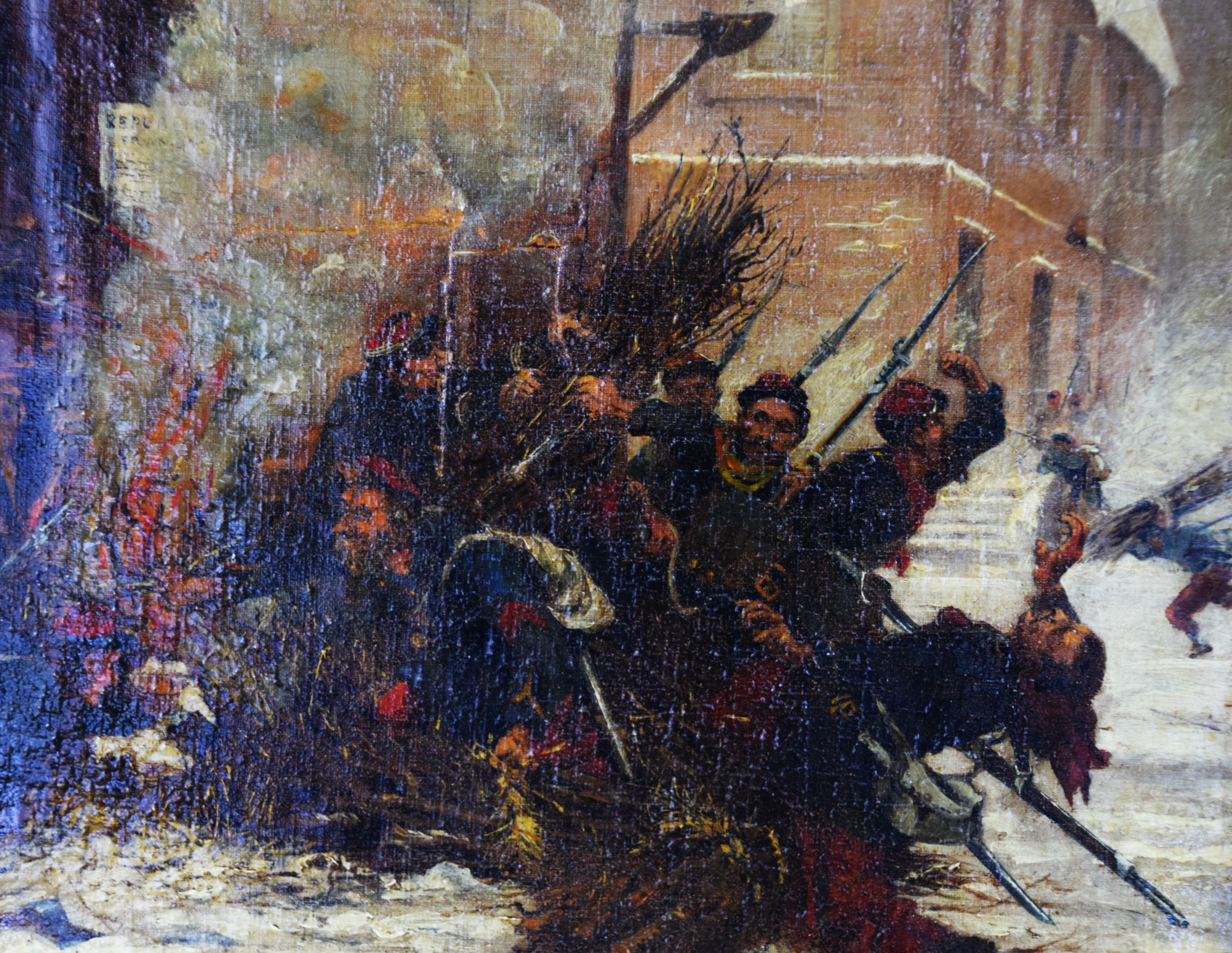 Framed and signed lower right and dated 1877, oil on canvas on board depicting French soldiers attacking a well defended Republic home using fire. Alexander Zins was born in France and became an active painter in California known for painting murals in the Catholic Cathedral in Los Angeles and was a colleague of Leon Trousset. Dimensions: 12″ x 10″ Image size, 16″ x 14.5″ Overall