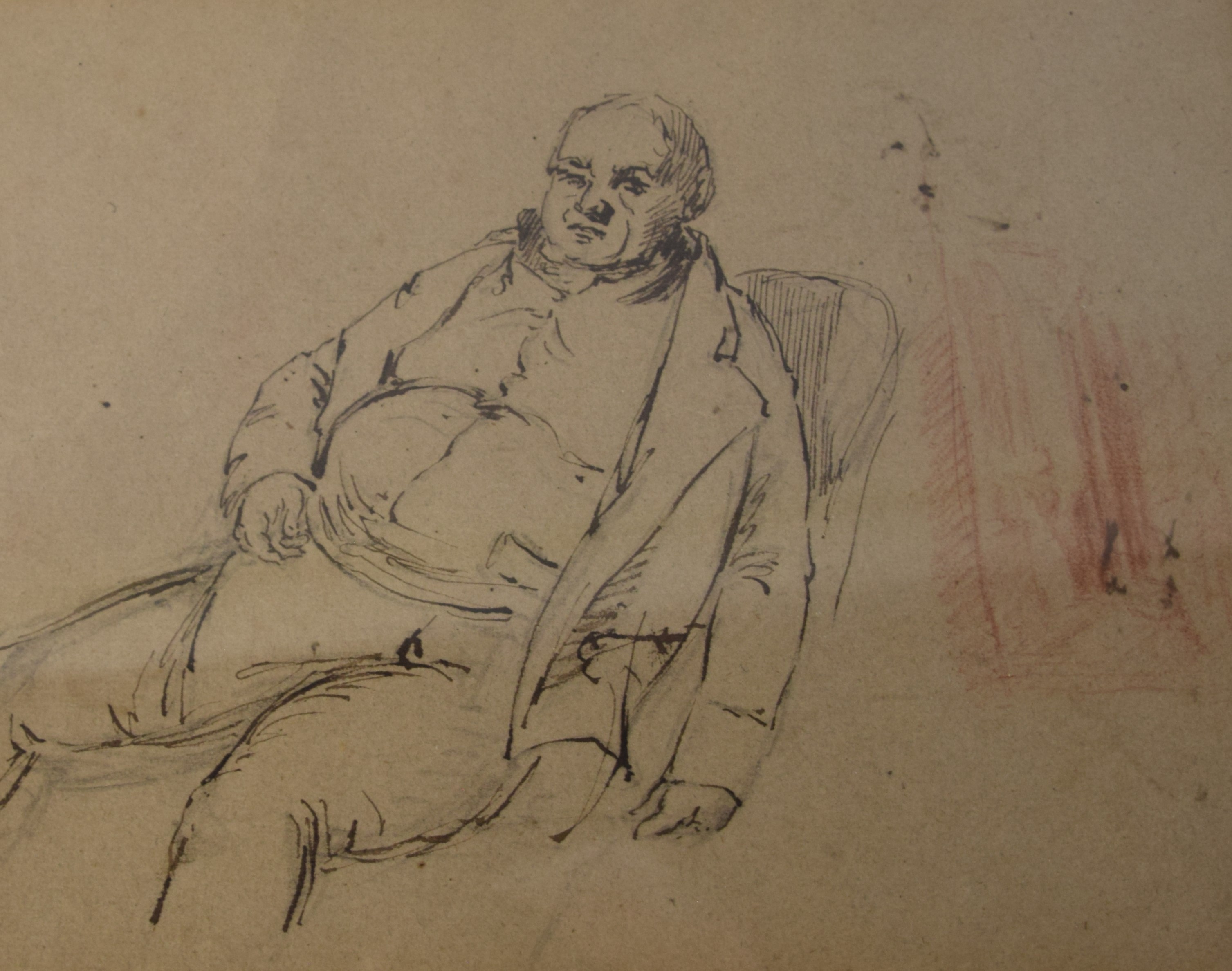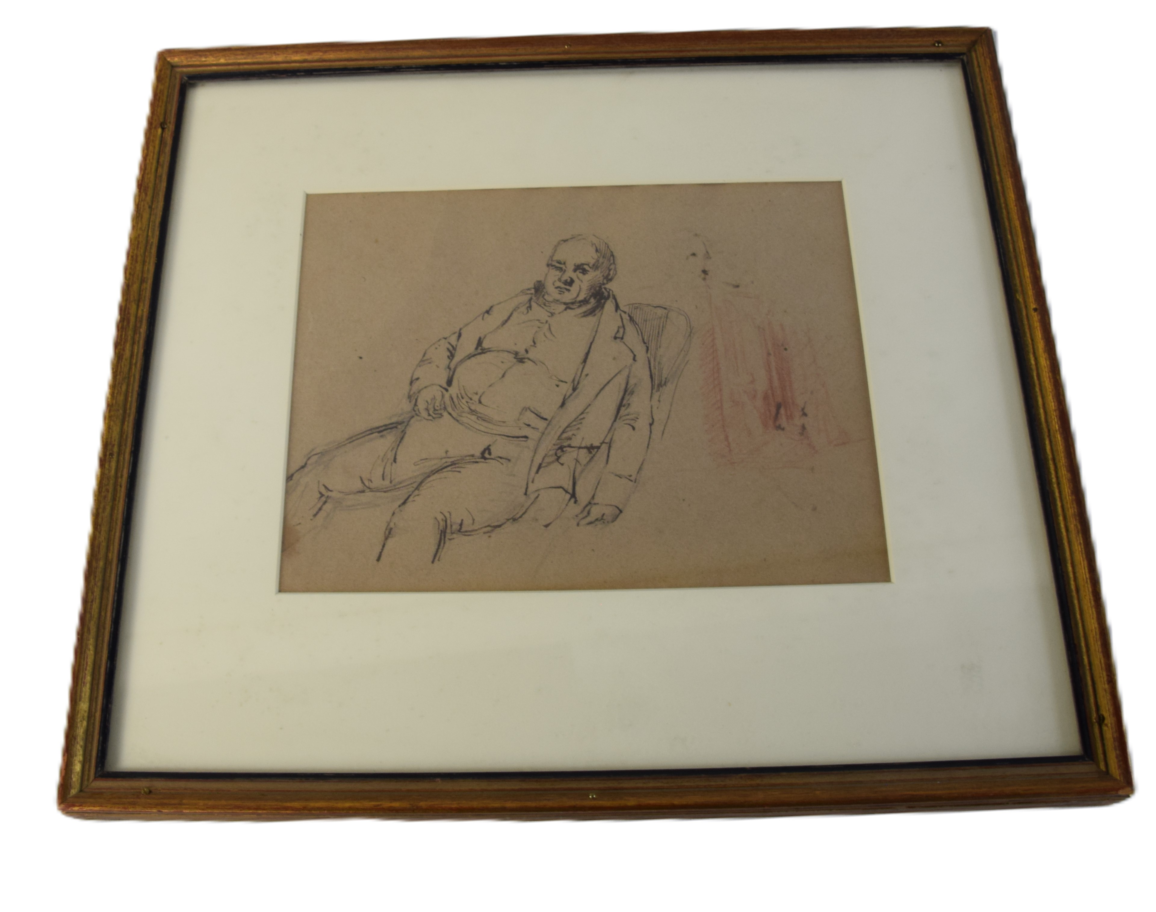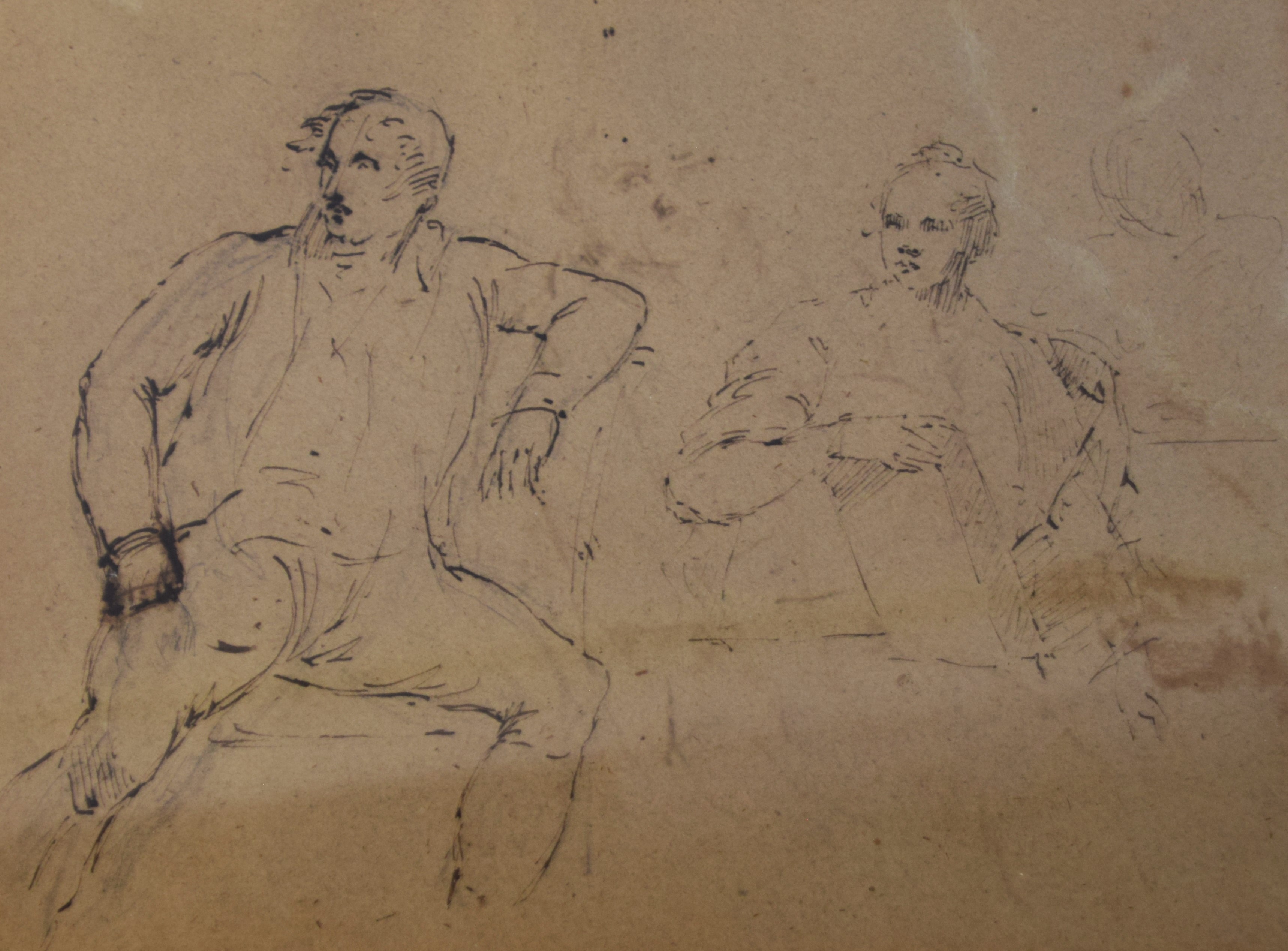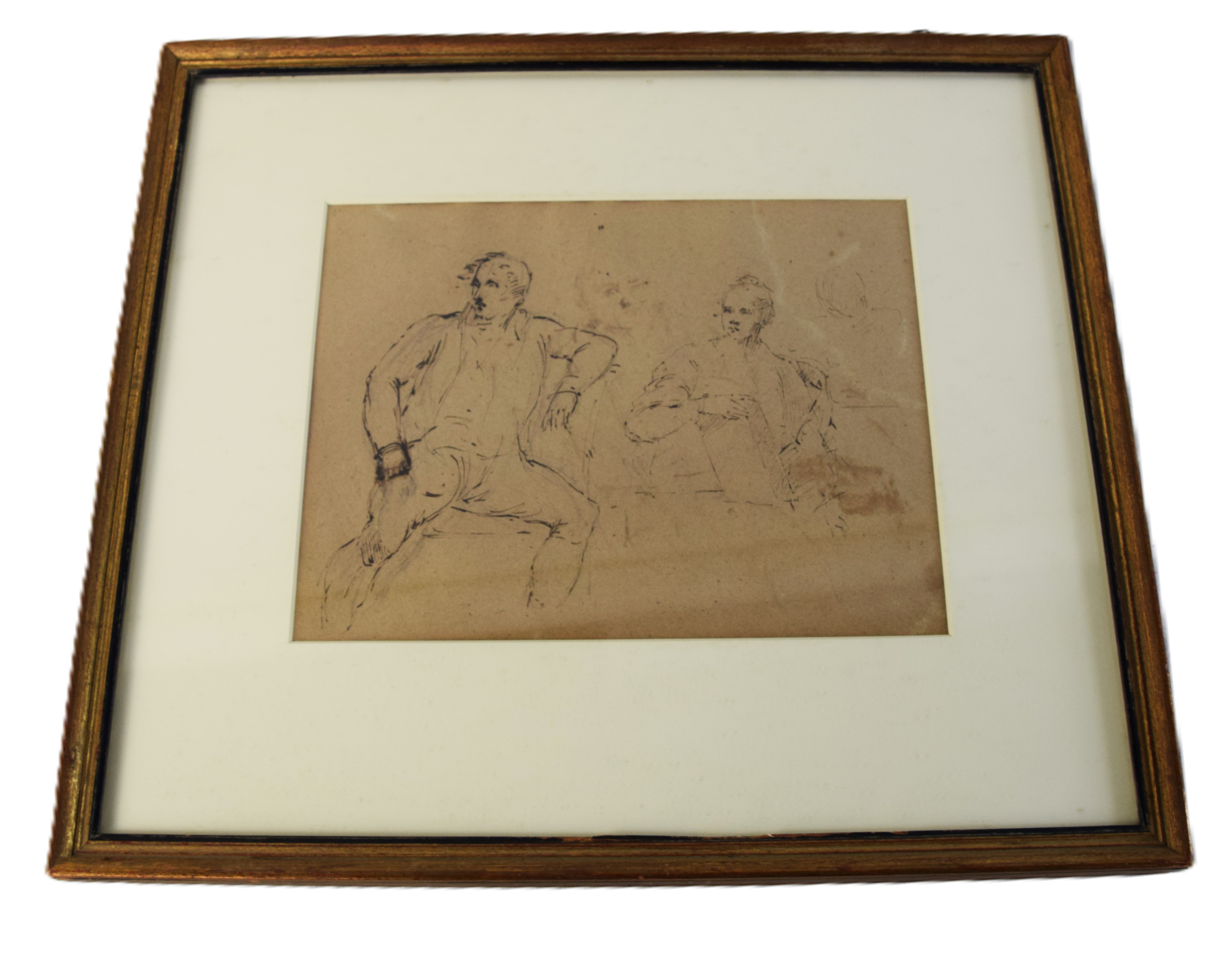 Framed ink on paper drawings of two gentlemen and a single gentleman on reverse by Thomas Sully. Thomas Sully was a teacher at the Pennsylvania Academy of the Fine Arts and became one of the foremost early 19th-century portrait painters. Provenance: Displayed at the Deerfield Academy (von Auersperg Art Gallery). Dimensions: 8.5″ x 11″ Image size, 16″ x 18″ Overall