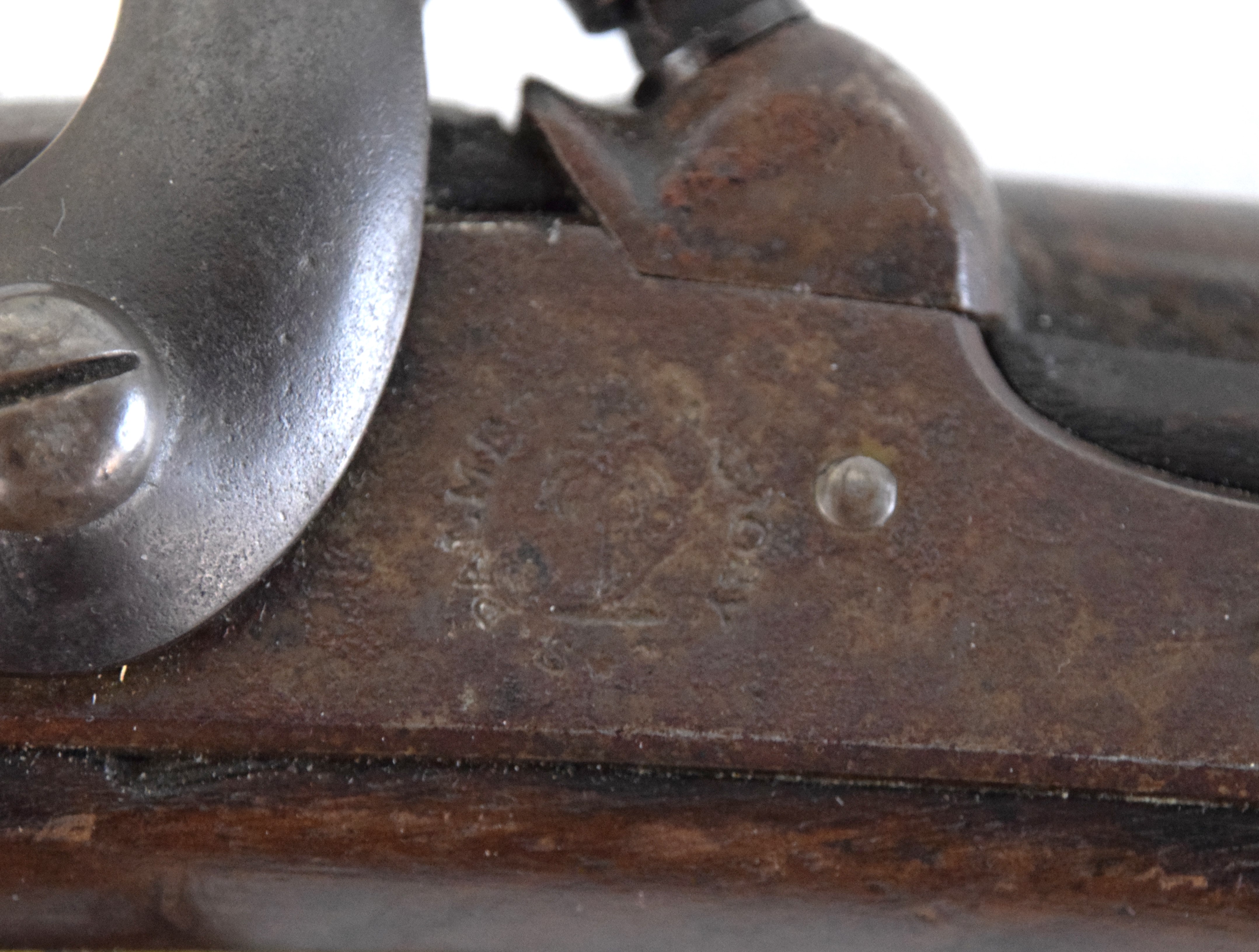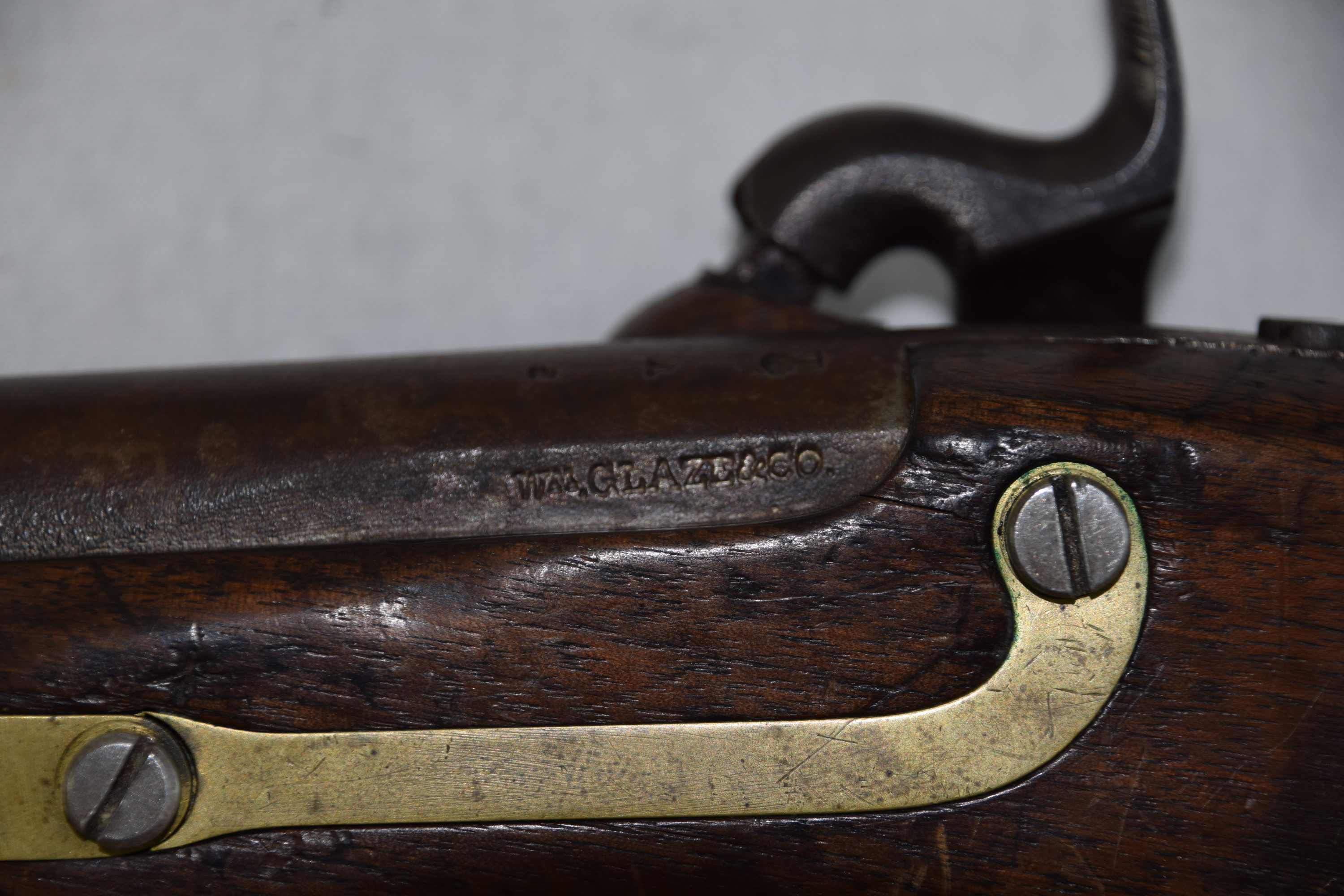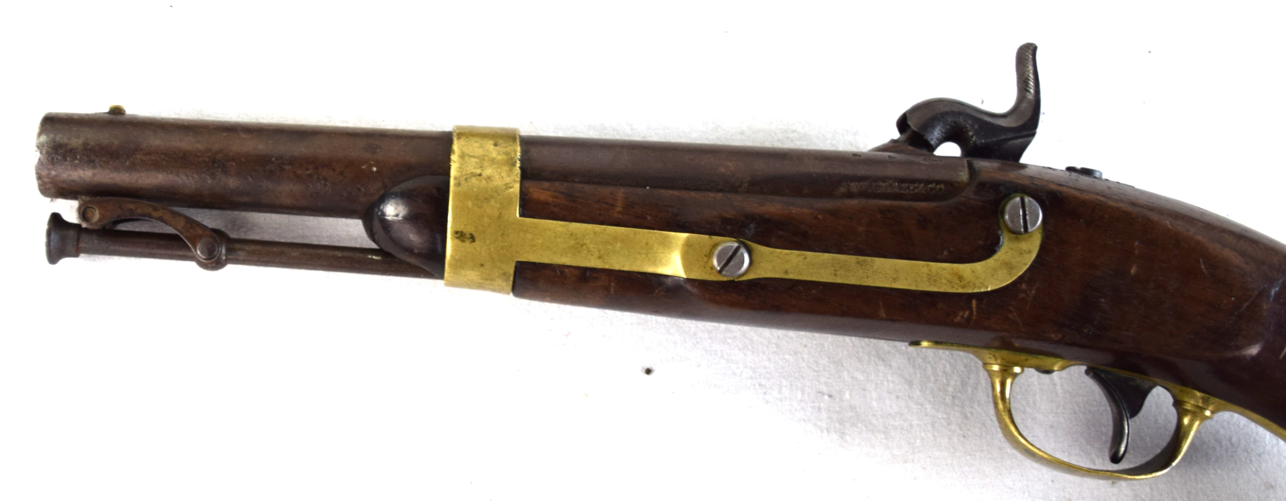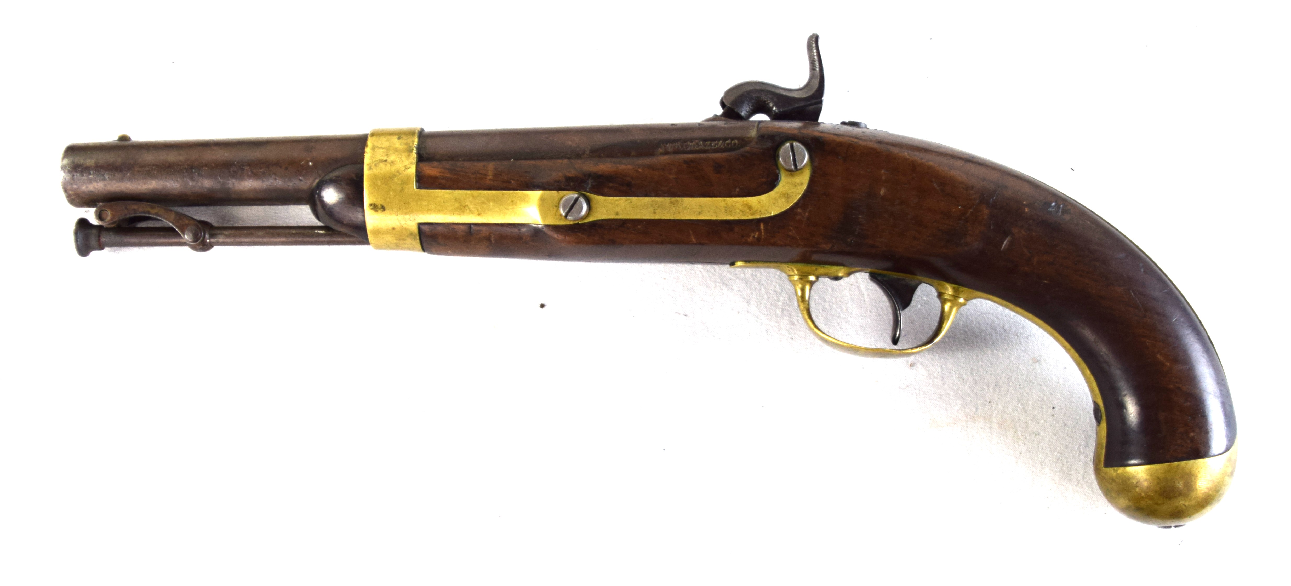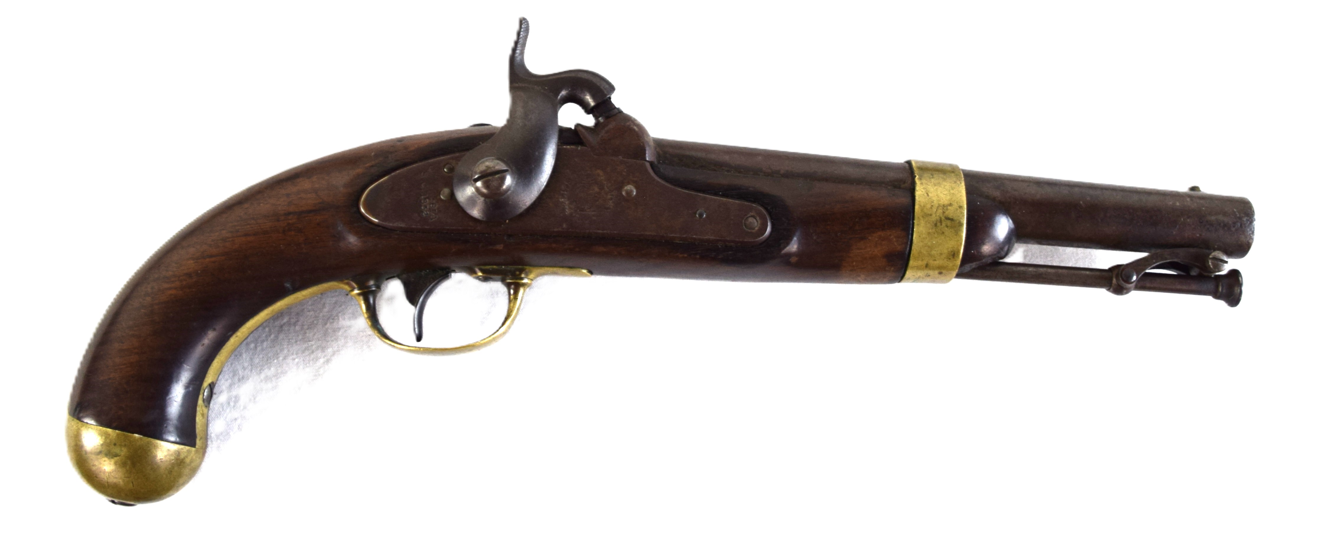 Model 1842 percussion Palmetto South Carolina pistol dated 1853. Lock plate has the usual markings-Palmetto Armory, SC surrounding the palmetto tree and “Columbia SC, 1852″ marked vertically at the rear. The barrel is marked V/P and on the side WM. GLAZE & CO. The tang is marked 1853 as typical. The Palmetto Armory was formed by William Glaze and Benjamin Flagg (former superintendent of the Asa Waters factory in MA). Only 1000 were produced. Dimensions: 8.5″ Barrel, 14” Overall