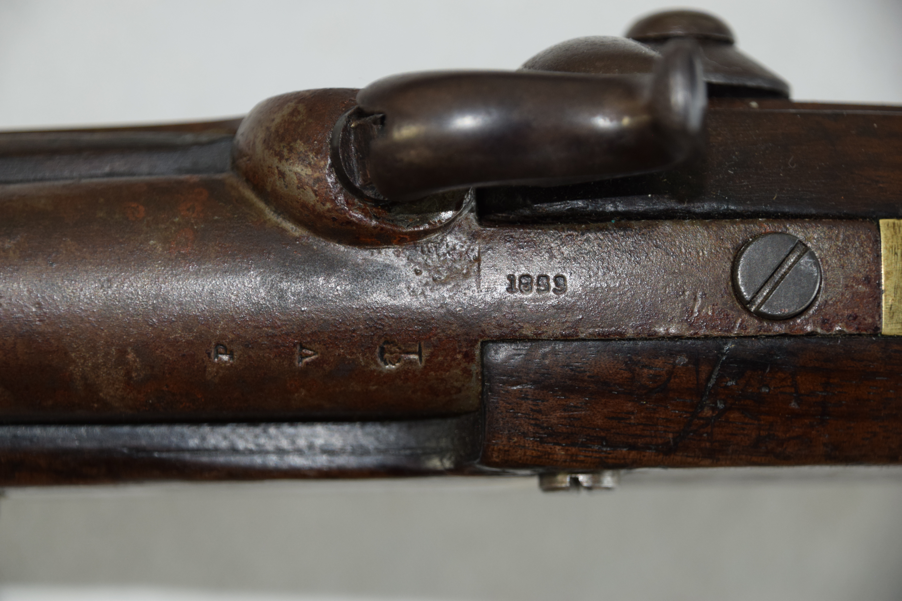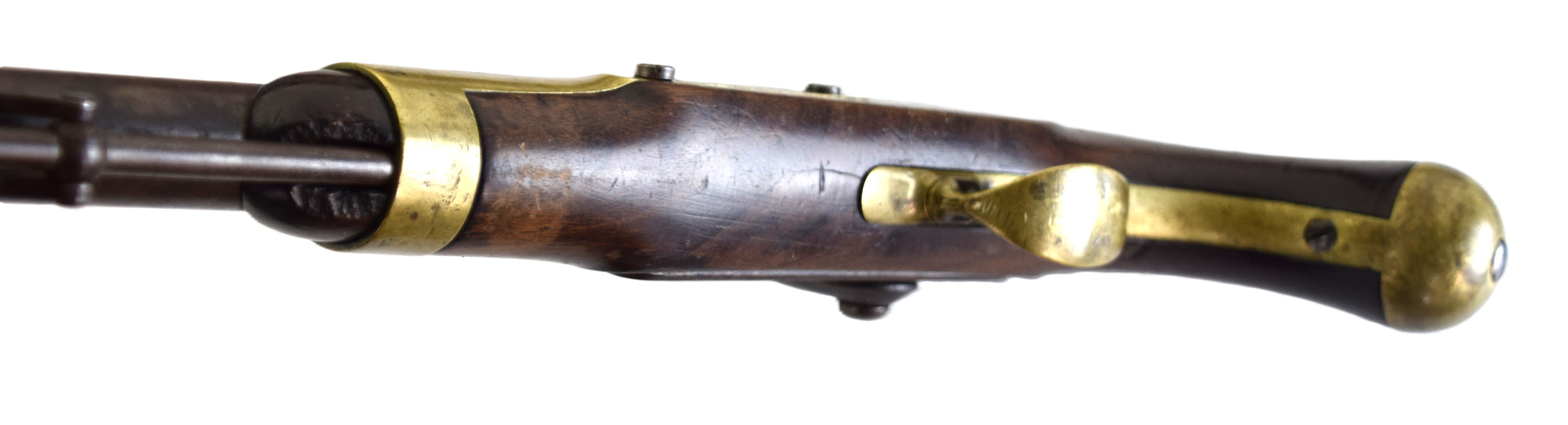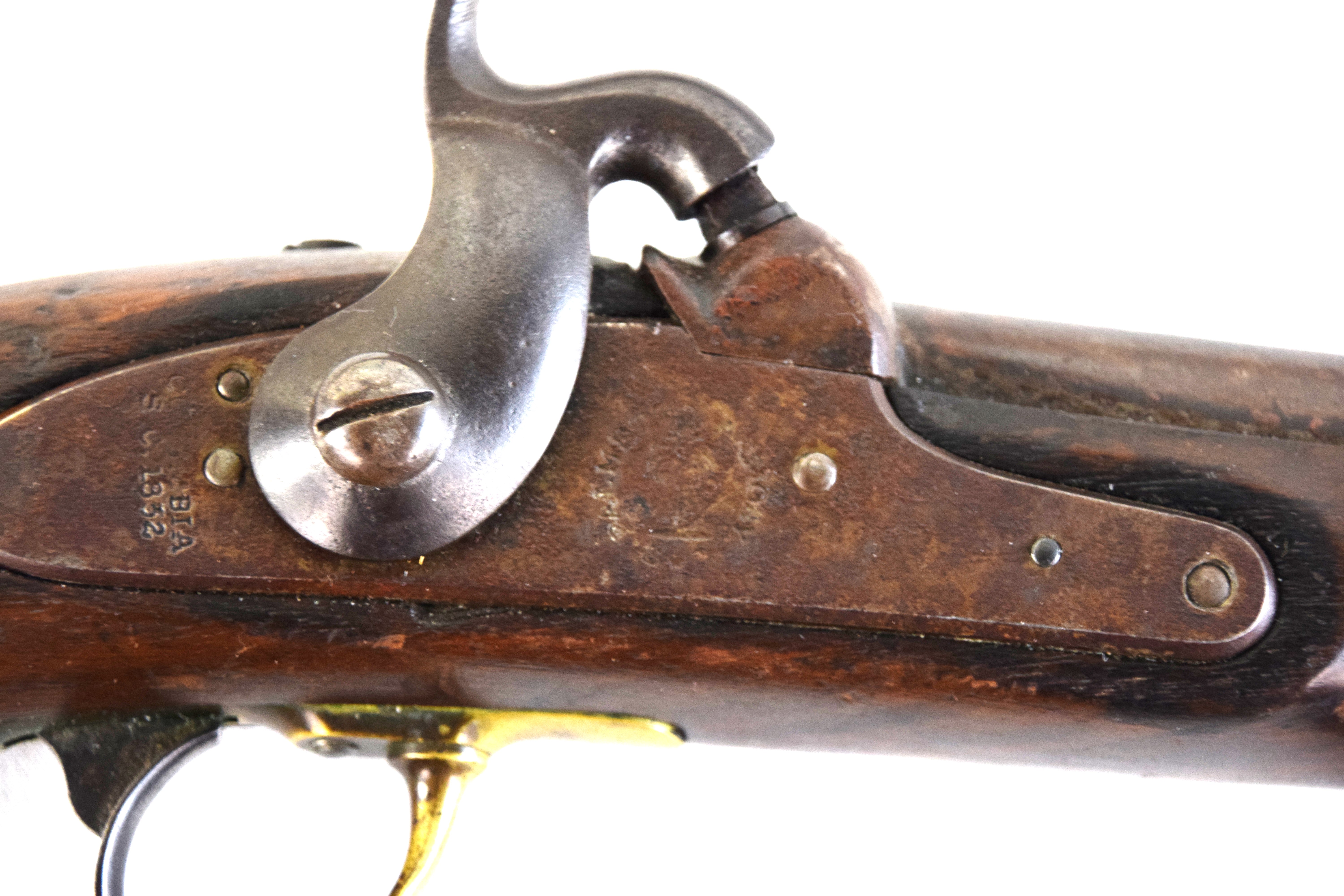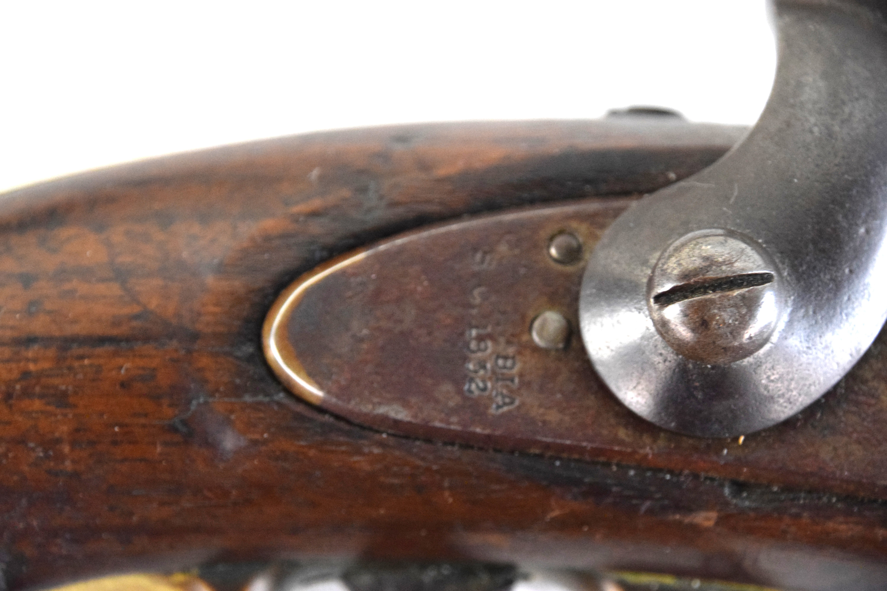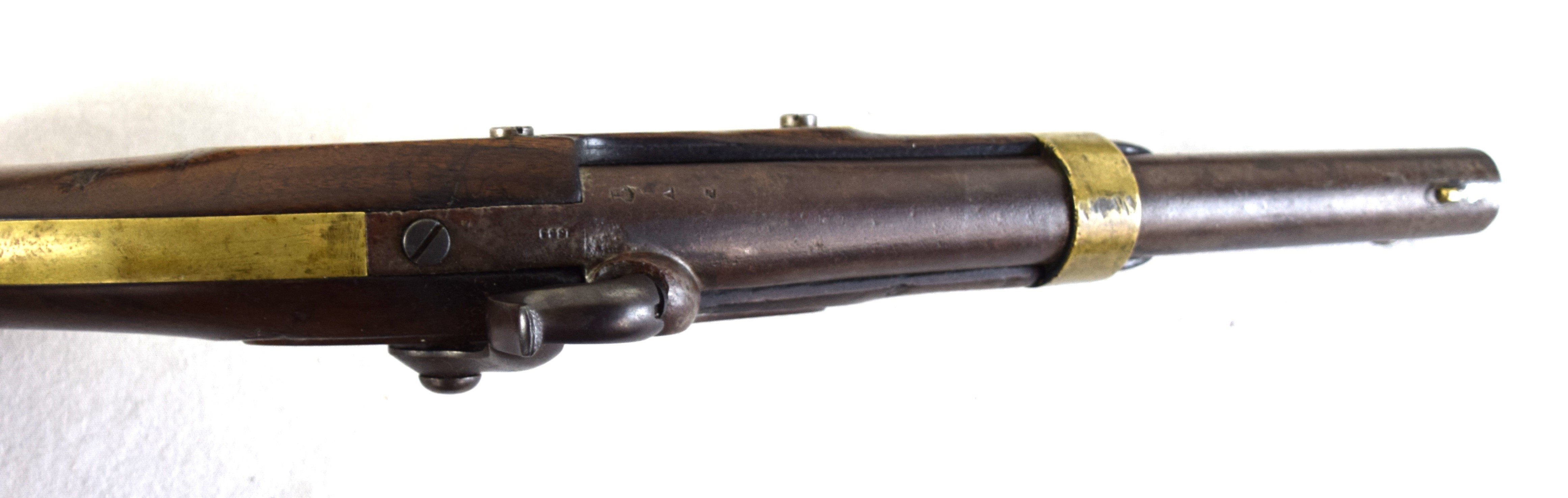 Model 1842 percussion Palmetto South Carolina pistol dated 1853. Lock plate has the usual markings-Palmetto Armory, SC surrounding the palmetto tree and “Columbia SC, 1852″ marked vertically at the rear. The barrel is marked V/P and on the side WM. GLAZE & CO. The tang is marked 1853 as typical. The Palmetto Armory was formed by William Glaze and Benjamin Flagg (former superintendent of the Asa Waters factory in MA). Only 1000 were produced. Dimensions: 8.5″ Barrel, 14” Overall
