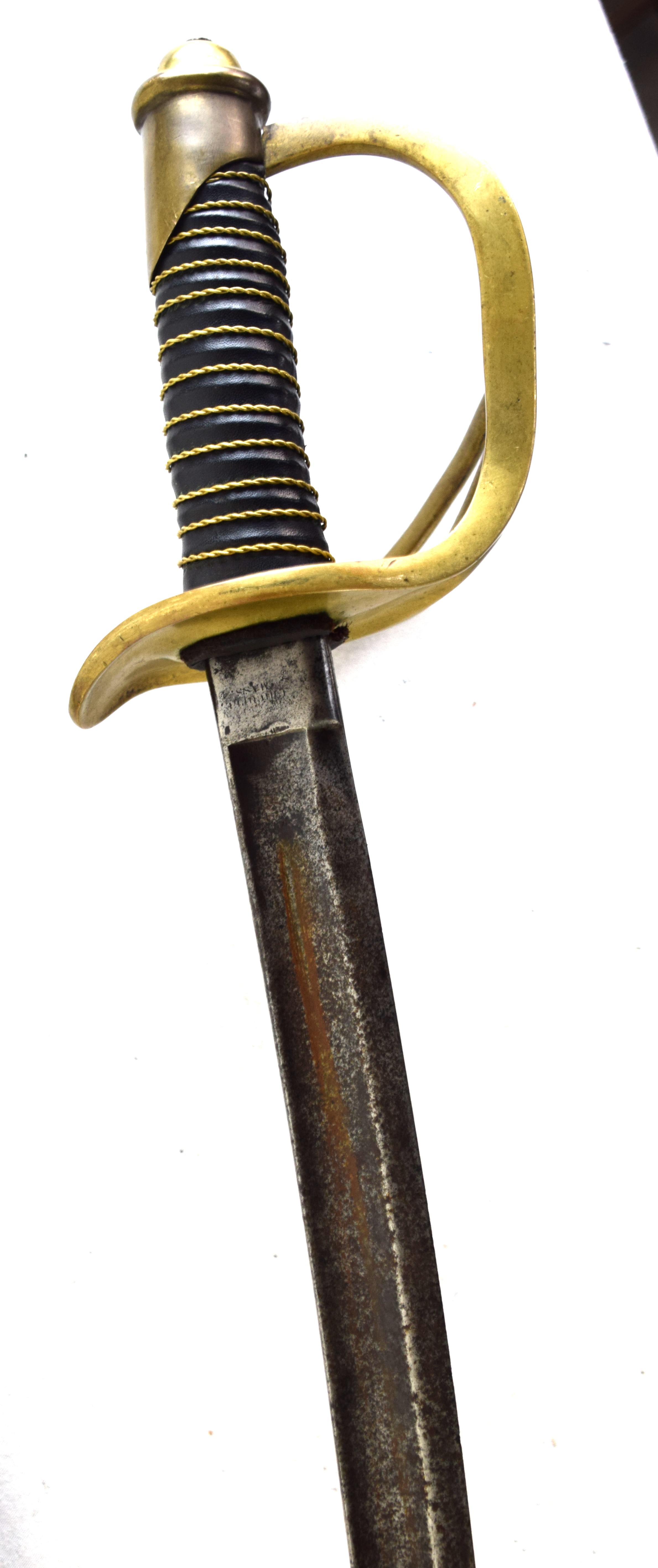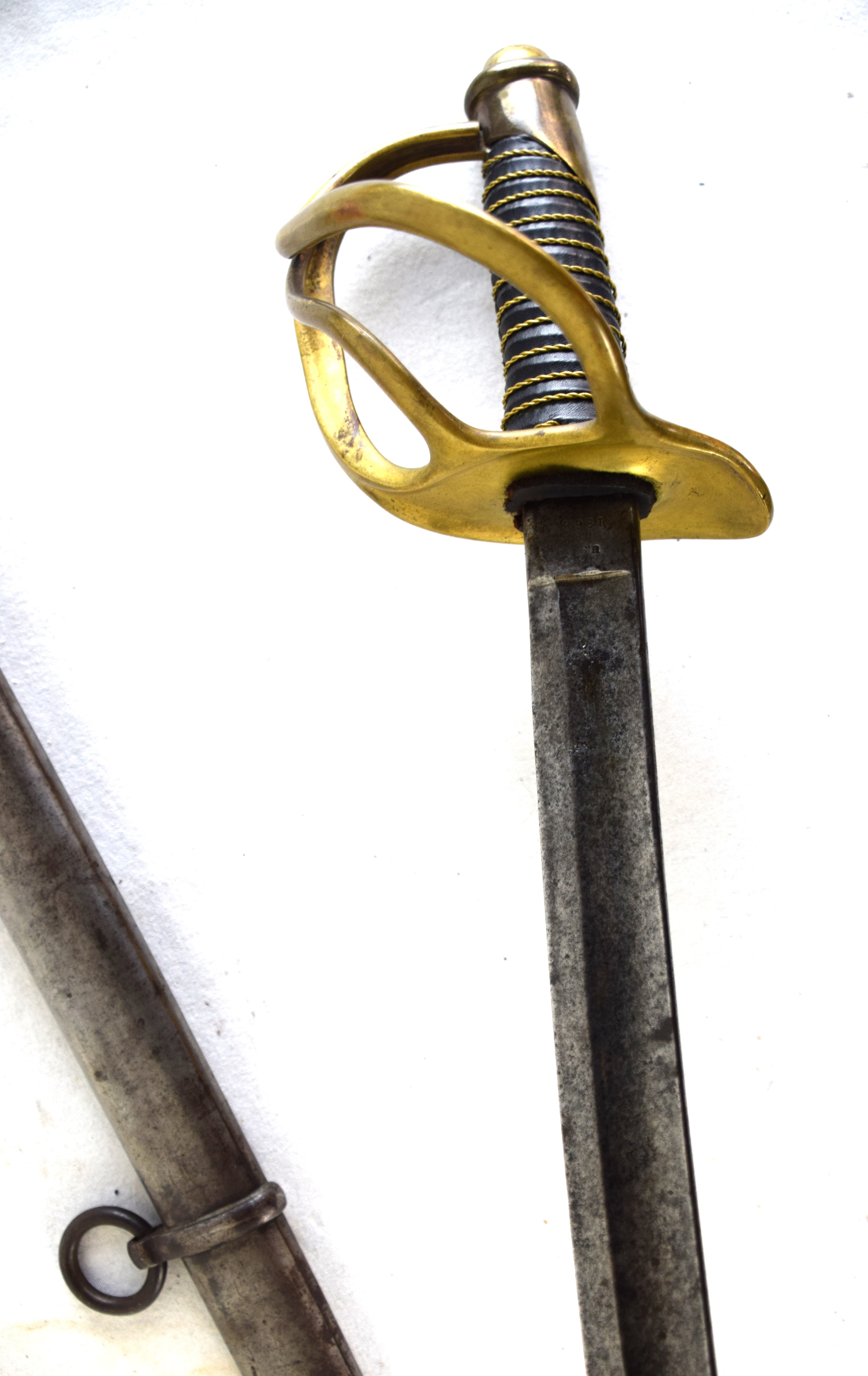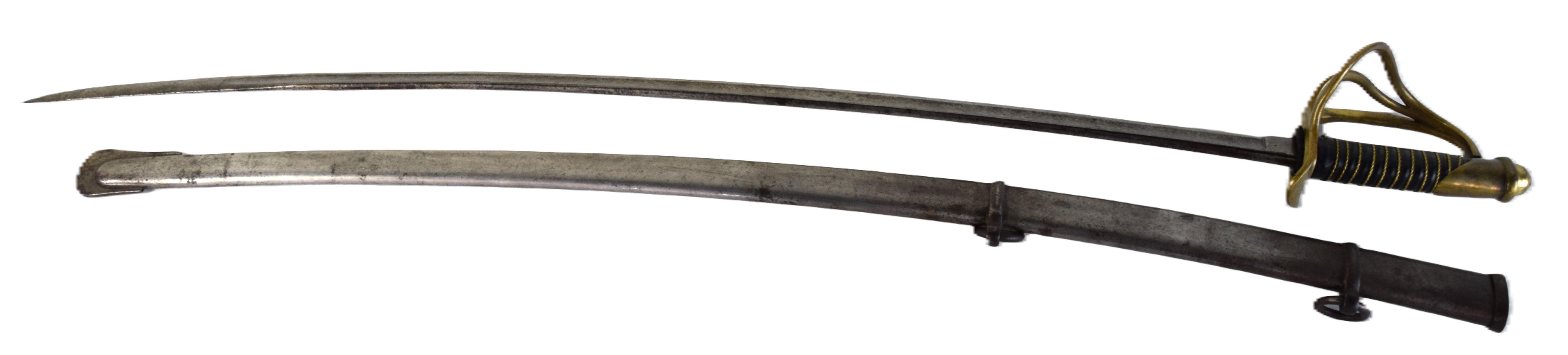Antique 1863 Civil War Ames Sword Company Light Cavalry Saber and Scabbard. The Model 1860 Light Cavalry Saber (also known as the M1862) is a long sword made of steel and brass, used by US cavalry from the American Civil War until the end of the Indian Wars. The M1860 saber received its name to distinguish it from the larger and heavier Model 1840 Heavy Cavalry Saber that it replaced. Like its predecessor it had a brass guard, leather-wrapped grip and steel scabbard but unlike the M1840 it was smaller and easier to handle. Marked Ames, Chicopee MA and US, DR, 1863. Dimensions: 34.5 Blade, 40.5 Overall