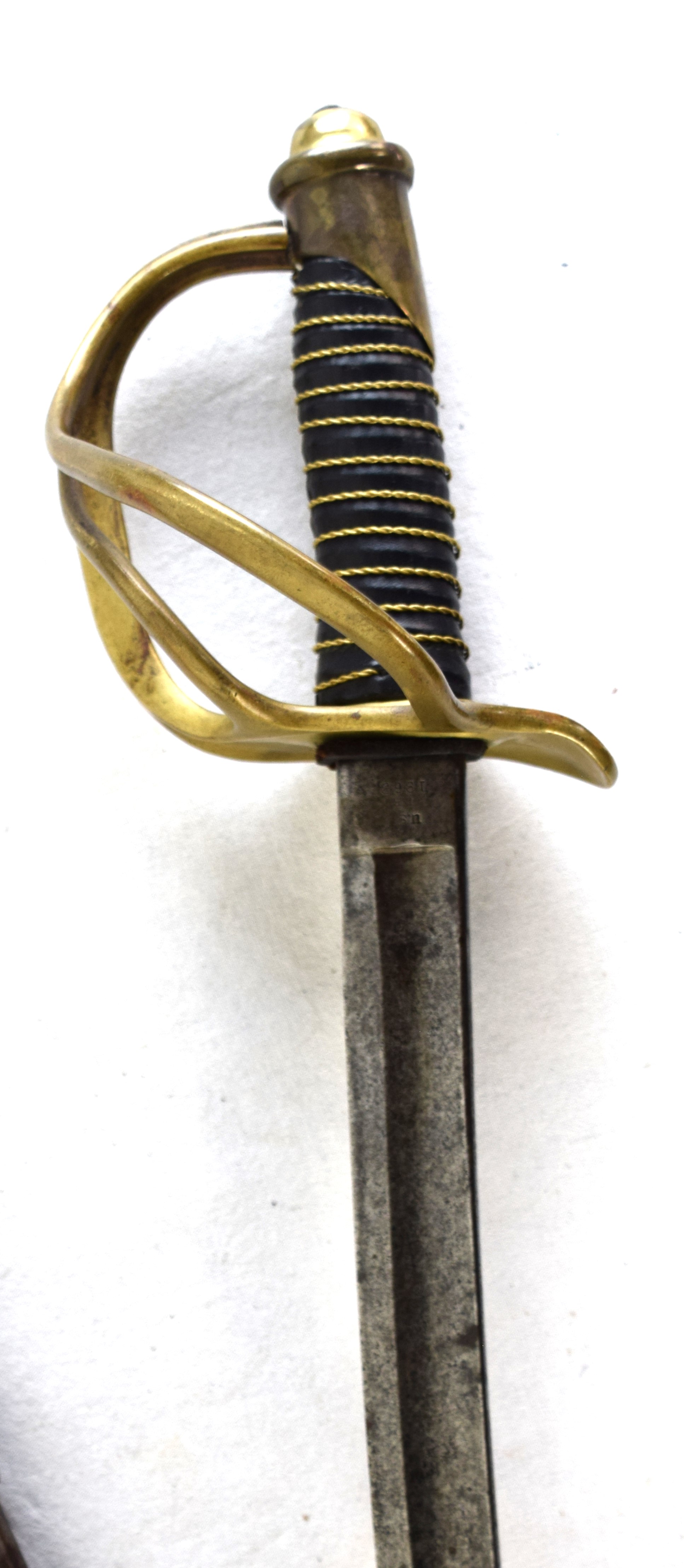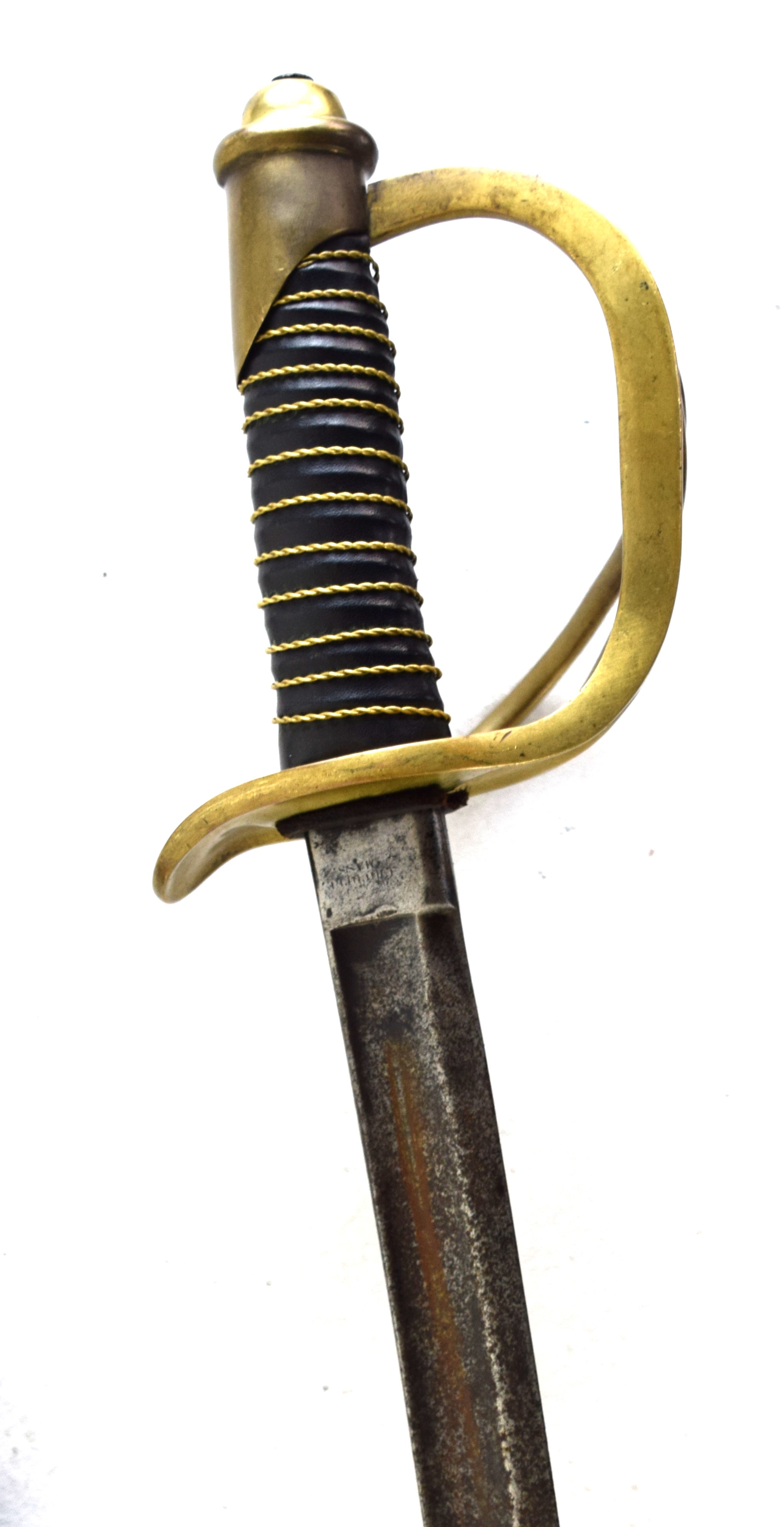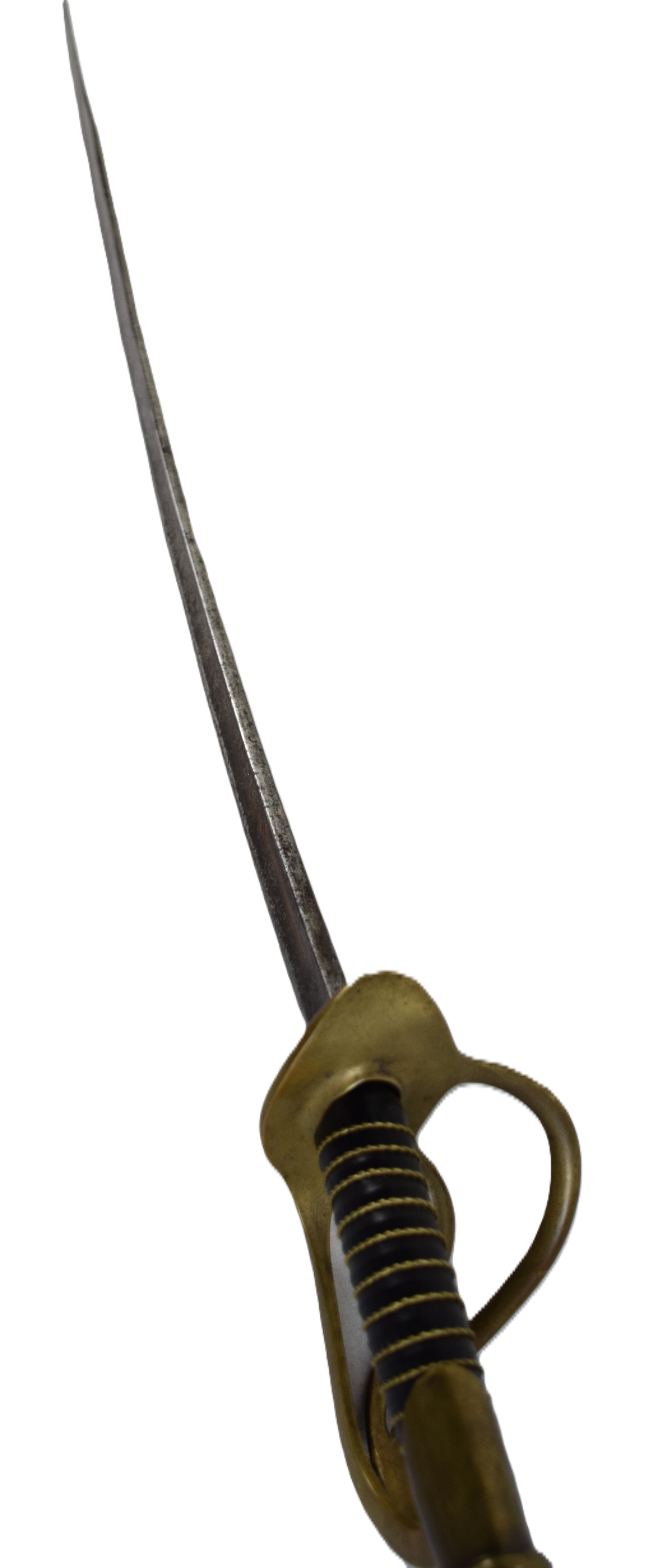 Antique 1863 Civil War Ames Sword Company Light Cavalry Saber and Scabbard. The Model 1860 Light Cavalry Saber (also known as the M1862) is a long sword made of steel and brass, used by US cavalry from the American Civil War until the end of the Indian Wars. The M1860 saber received its name to distinguish it from the larger and heavier Model 1840 Heavy Cavalry Saber that it replaced. Like its predecessor it had a brass guard, leather-wrapped grip and steel scabbard but unlike the M1840 it was smaller and easier to handle. Marked Ames, Chicopee MA and US, DR, 1863. Dimensions: 34.5 Blade, 40.5 Overall