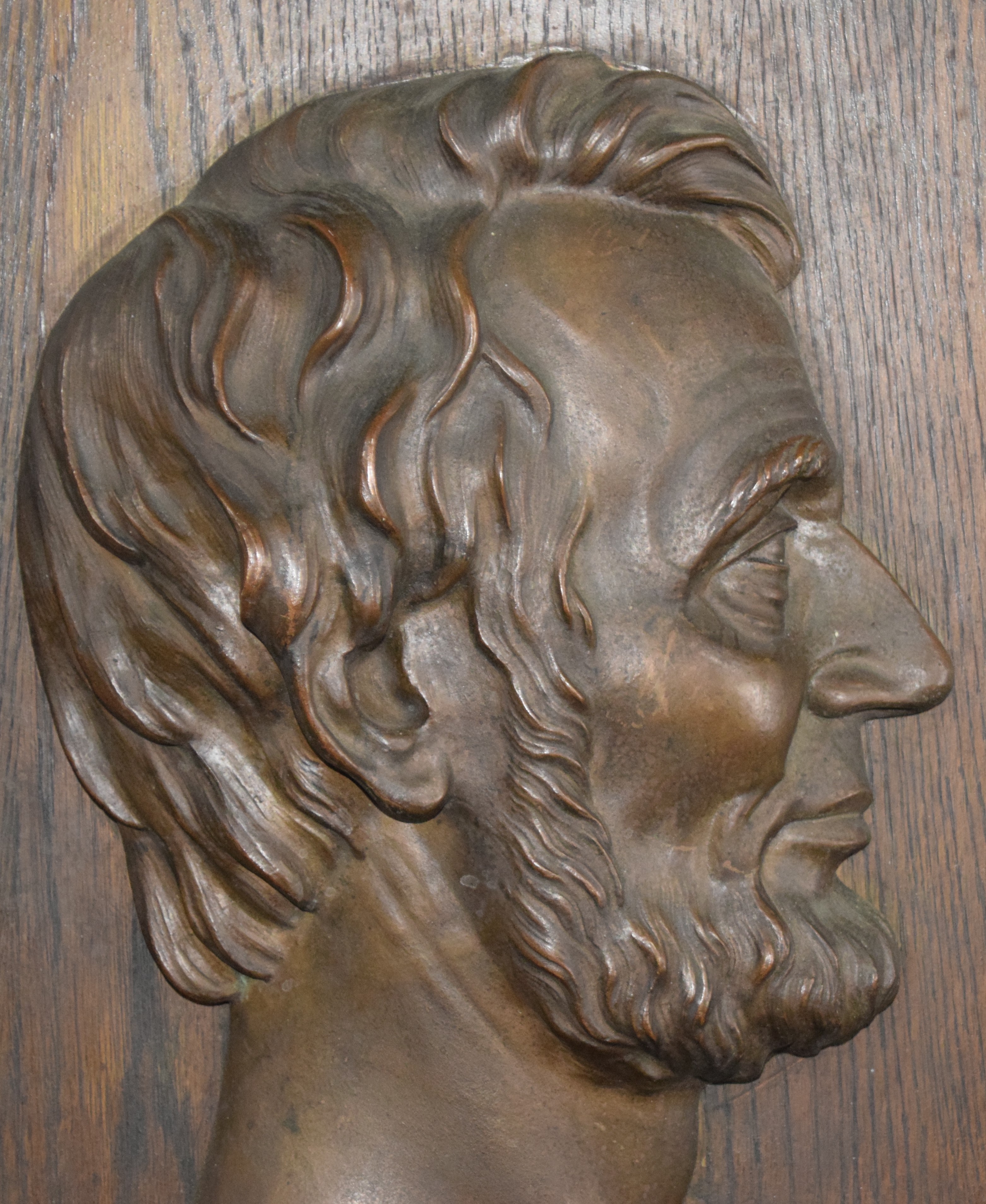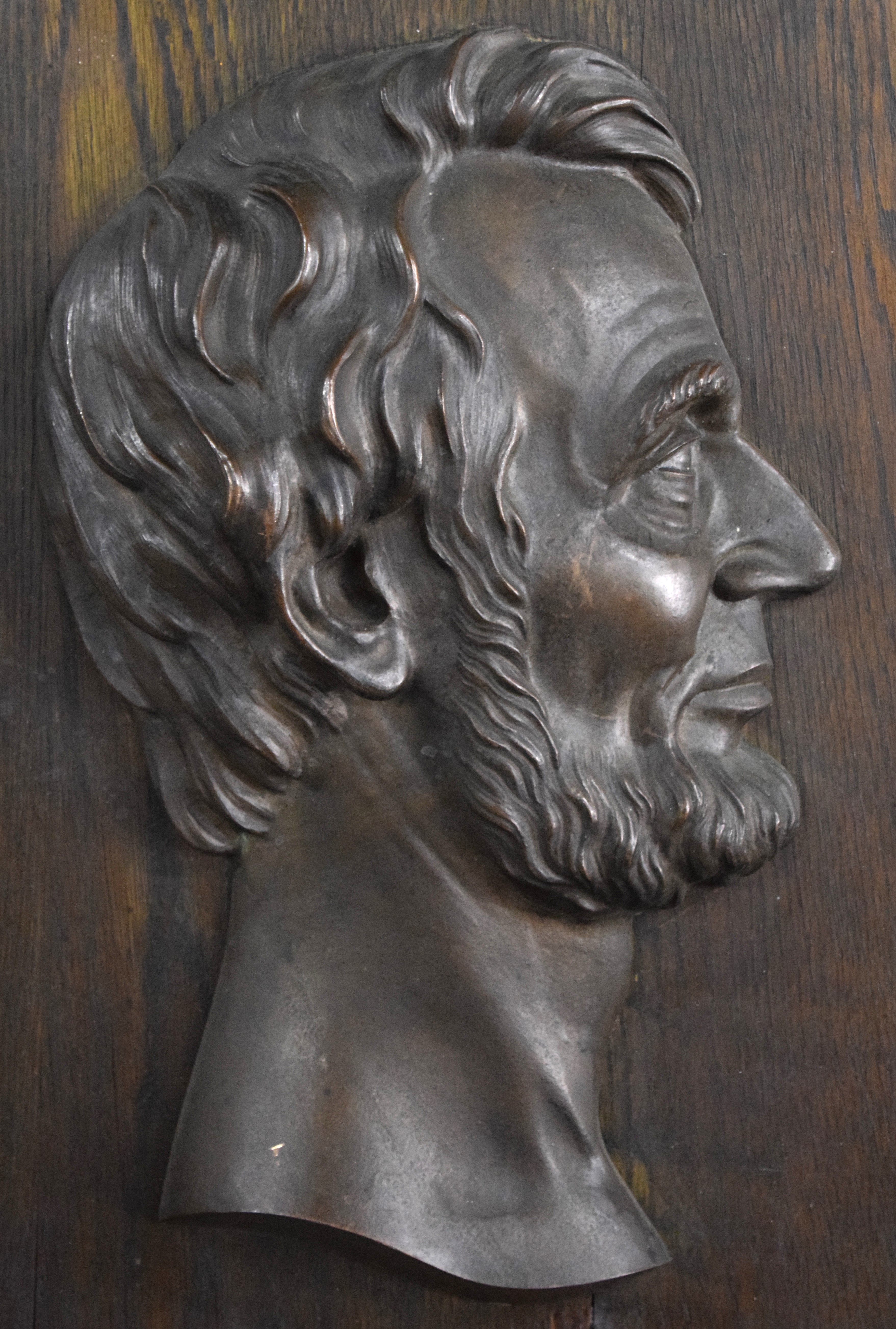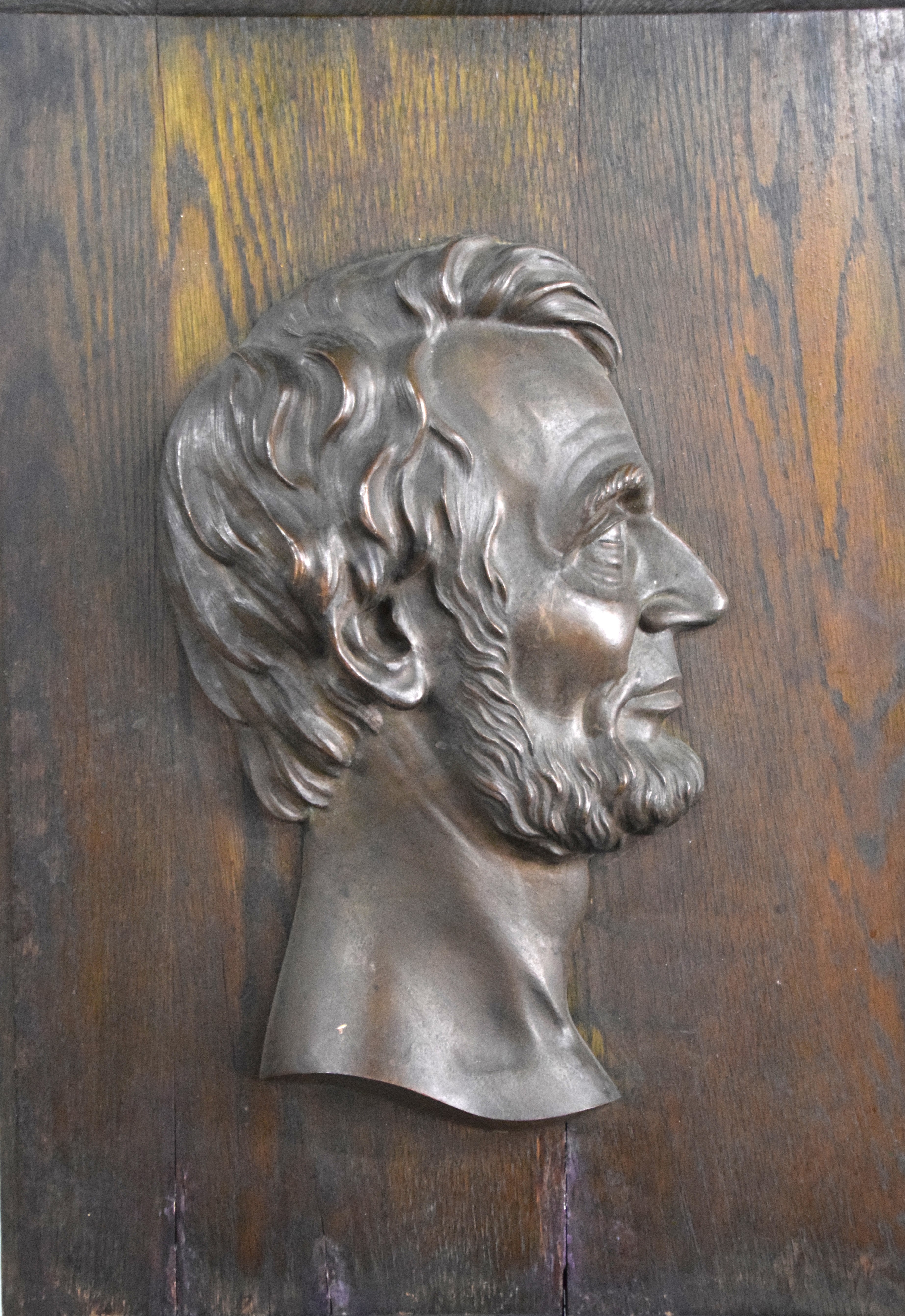 A bronze profile of Abraham Lincoln plaque mounted on a walnut board by Victor David Brenner. From Lithuania, Victor Brenner (1871-1924) became a noted medallion and coin sculptor, and was the designer of the 1909 Lincoln head penny, which commemorated the centennial birth date of Abraham Lincoln. Dimensions: 14″ x 9″ Sculpture size, 22″ x 16″ Overall