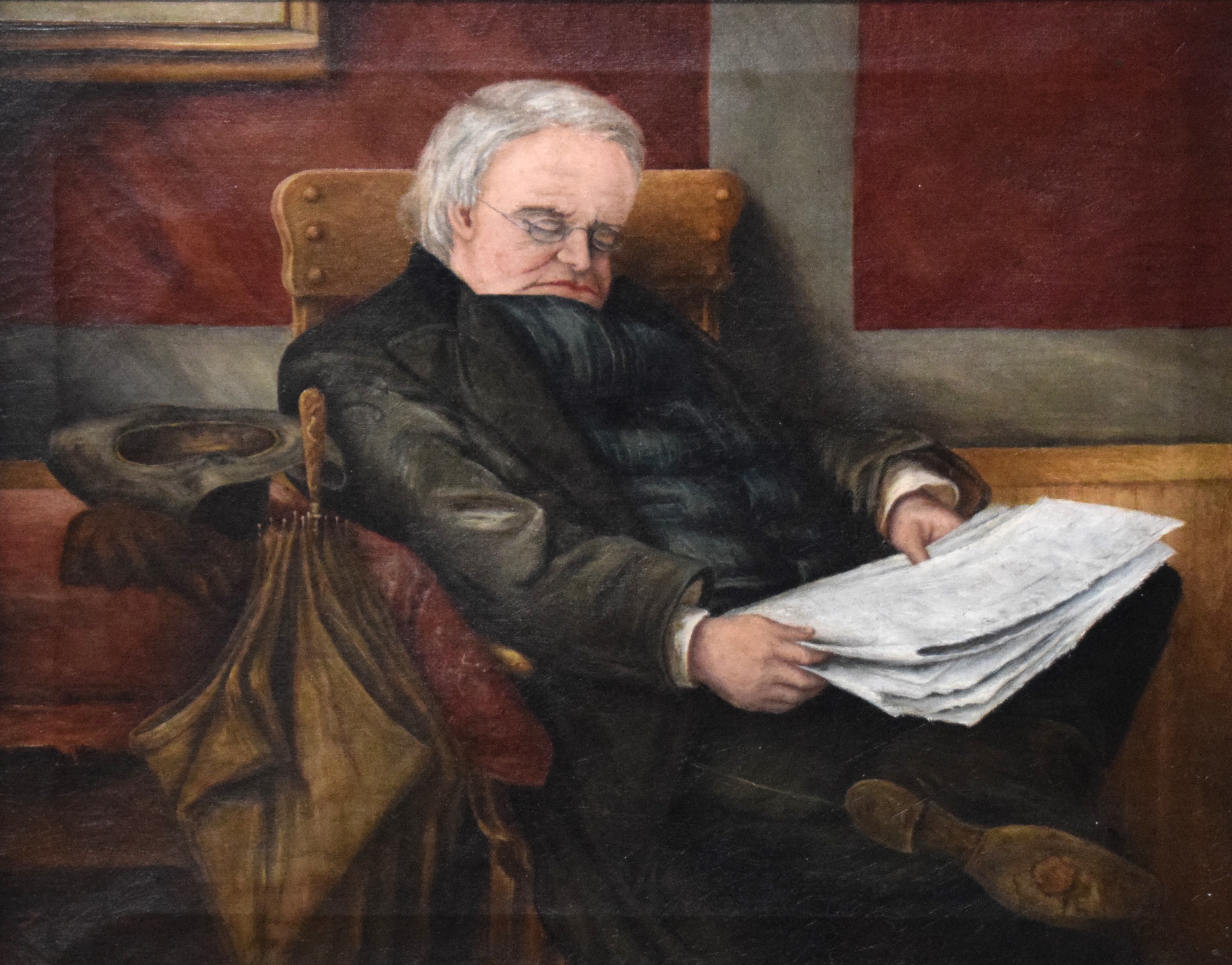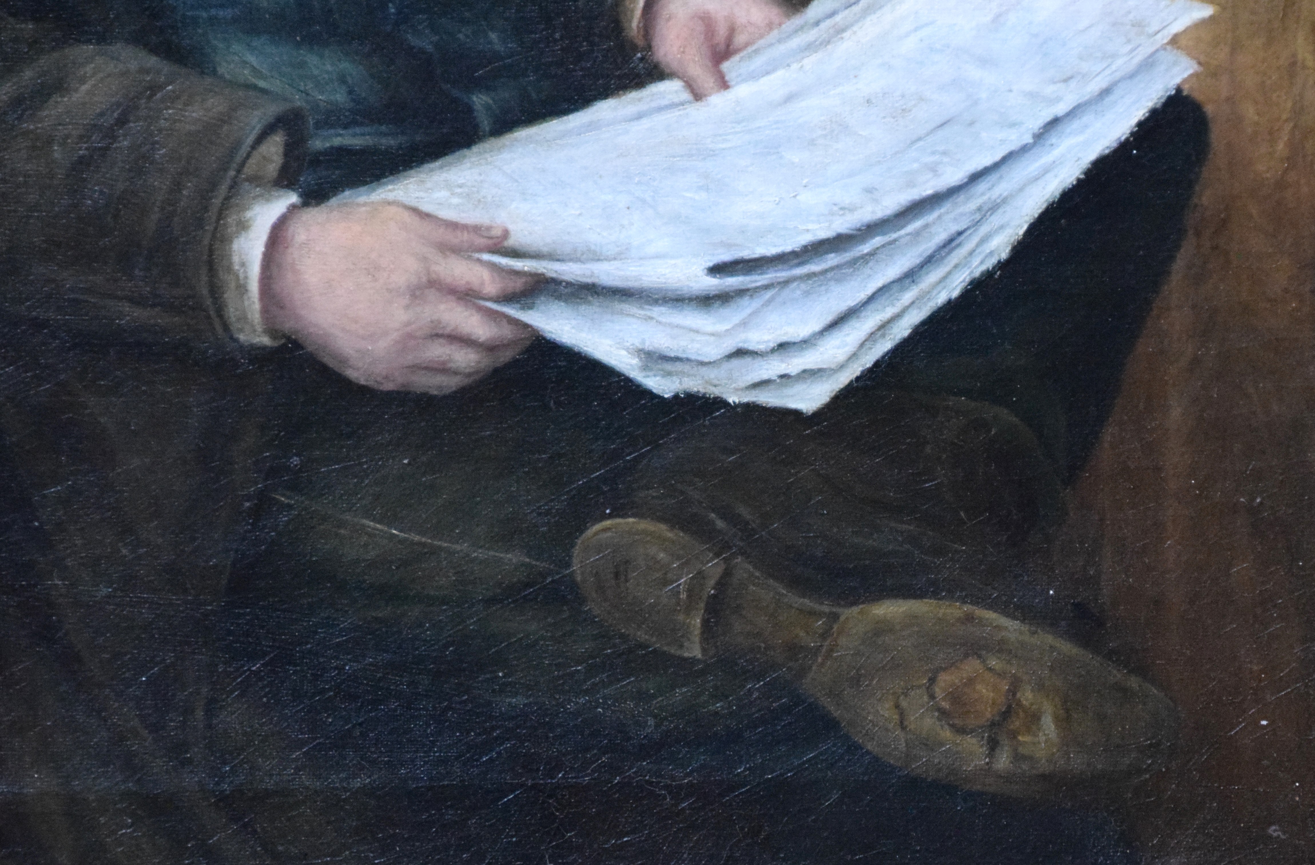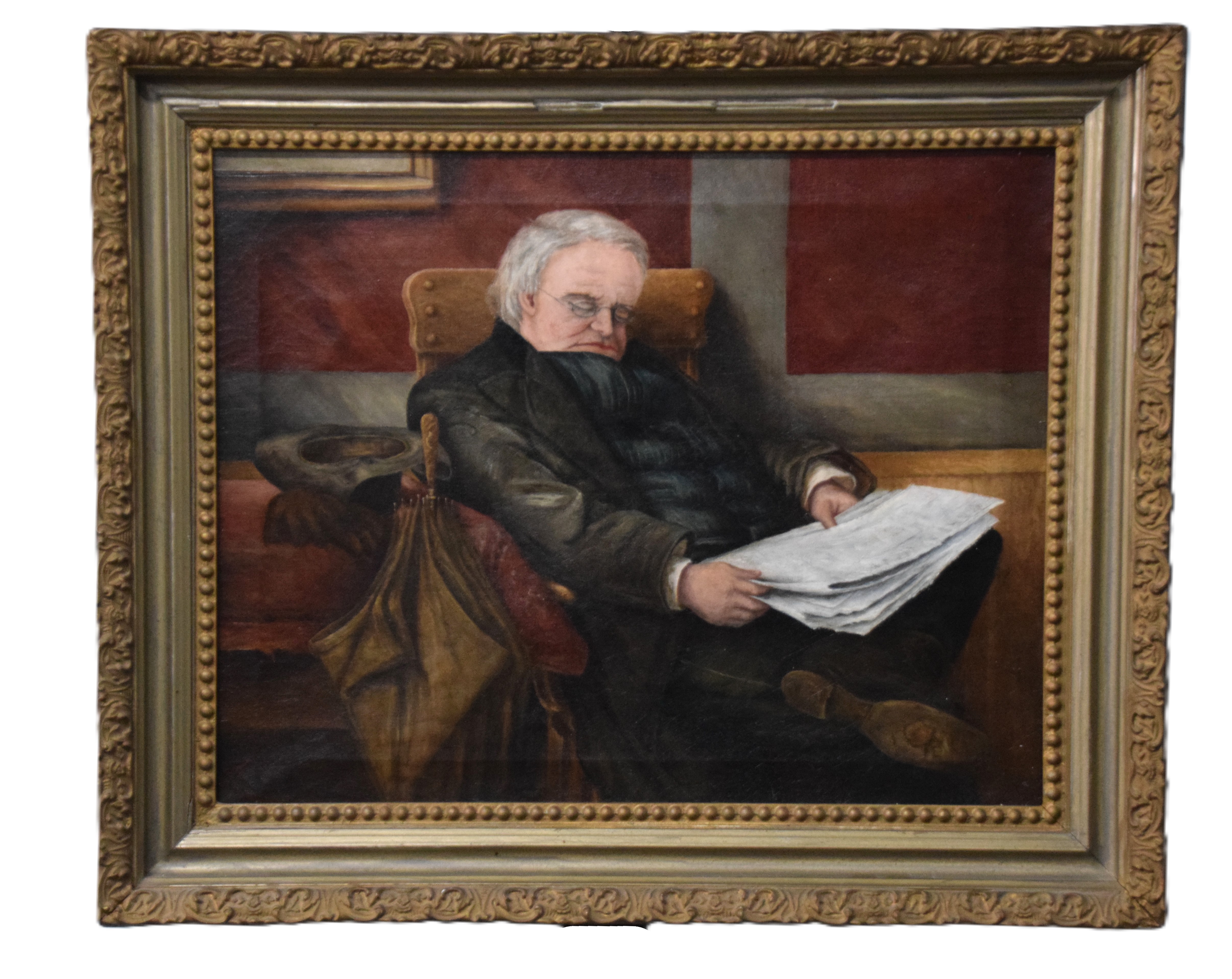 Framed 19th Century oil on canvas portrait of a seated gentleman with newspaper in hand, snoozing, wearing worn shoes. Signed on back S.G. Salla. Dimensions: 15.5″ x 19.5″ Image size; 20.5′ x 25″ Overall